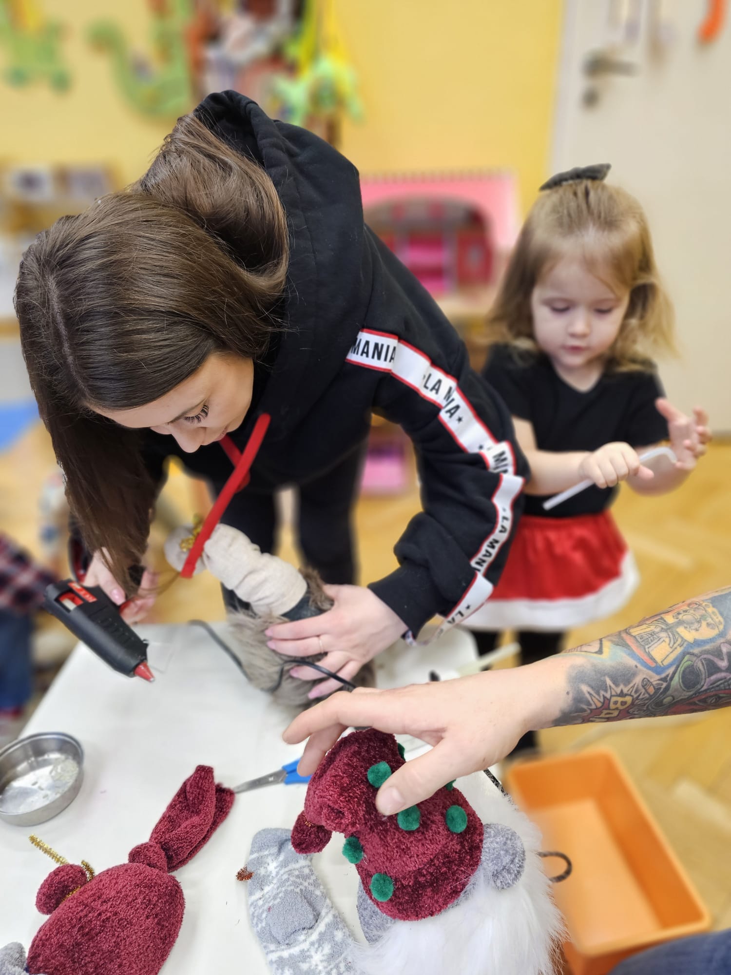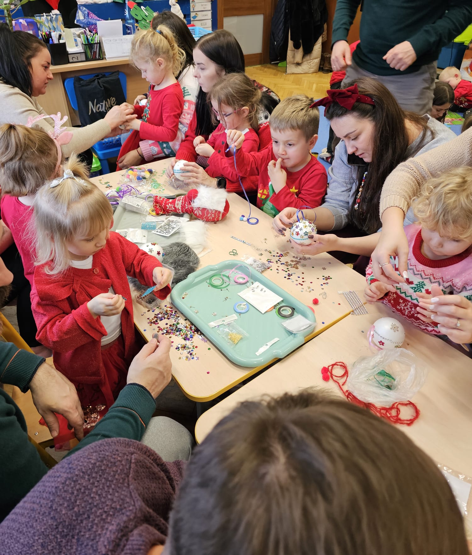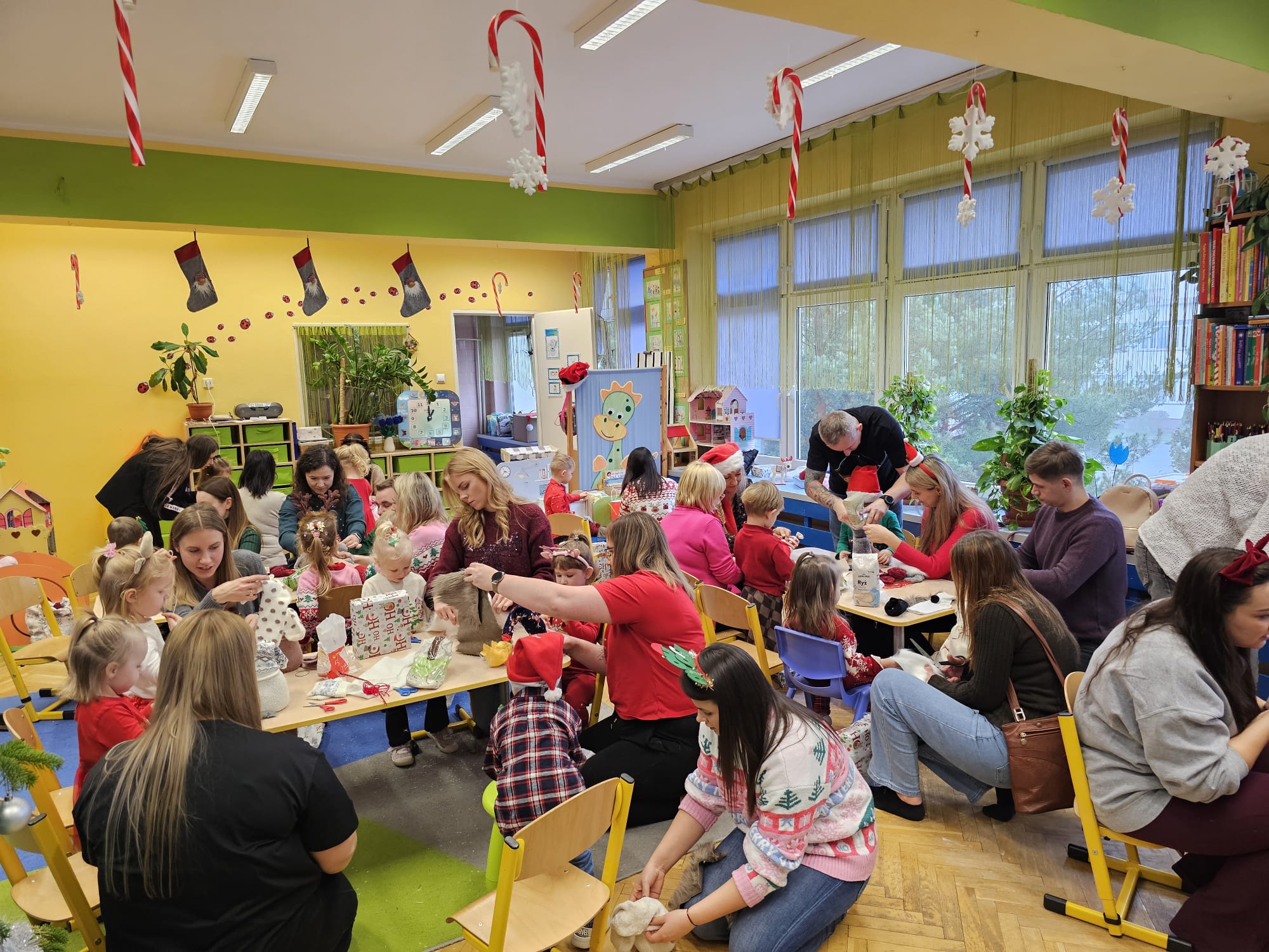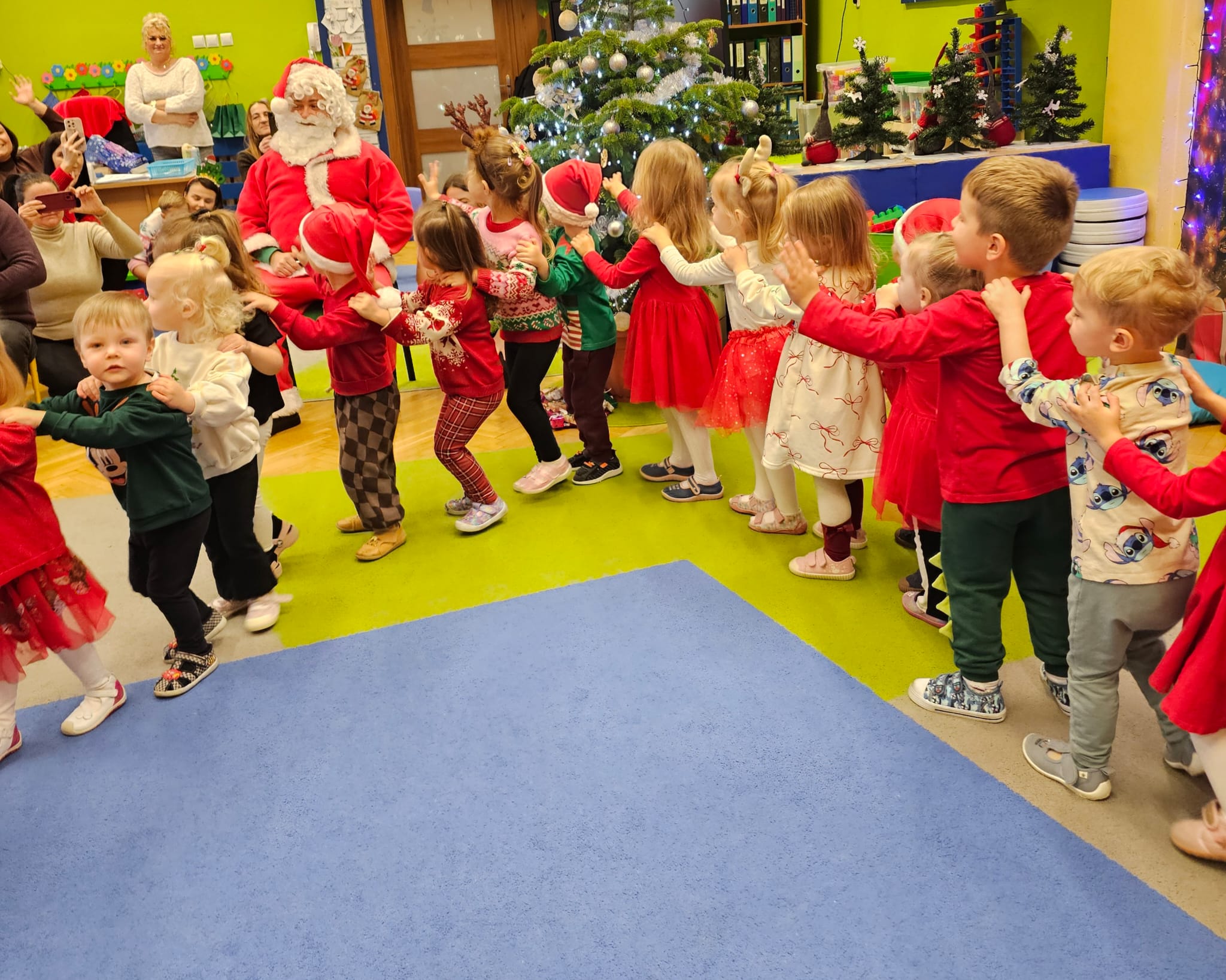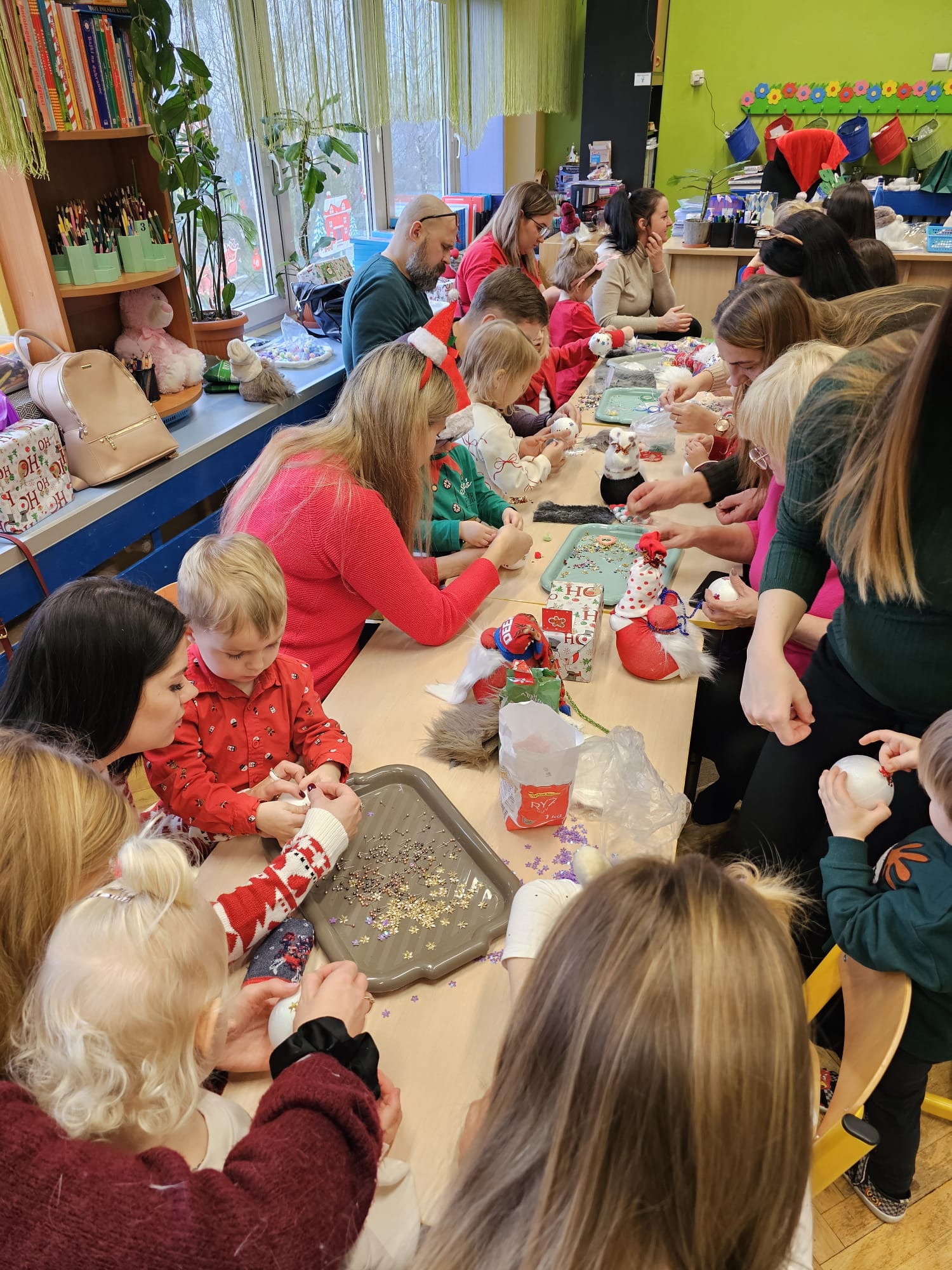 W magicznej, świątecznej atmosferze odbyły się warsztaty bożonarodzeniowe z udziałem dzieci  i ich rodziców. Spotkanie rozpoczęło się od wyjątkowej wizyty Świętego Mikołaja, który sprawił  dzieciom ogromną radość, wywołując uśmiechy i zachwyt na małych twarzach. Następnie dzieci zaprezentowały krótki występ artystyczny, przygotowany specjalnie na tę okazję. Był to wzruszający moment, pełen radości, świątecznych piosenek i wspólnego kolędowania.  Kolejnym punktem spotkania były warsztaty plastyczne, podczas których dzieci wspólnie z rodzicami wykonały świątecznego skrzata oraz bombkę na choinkę. Wspólna praca sprzyjała integracji , rozwijała kreatywność i pozwoliła spędzić czas w ciepłej, rodzinnej atmosferze.  Warsztaty były piękną okazją  do budowania więzi, dzielenia się radością i wprowadzenia wszystkich w wyjątkowy klimat Świąt Bożego Narodzenia. Dziękujemy dzieciom i rodzicom za obecność oraz wspólnie spędzony czas.