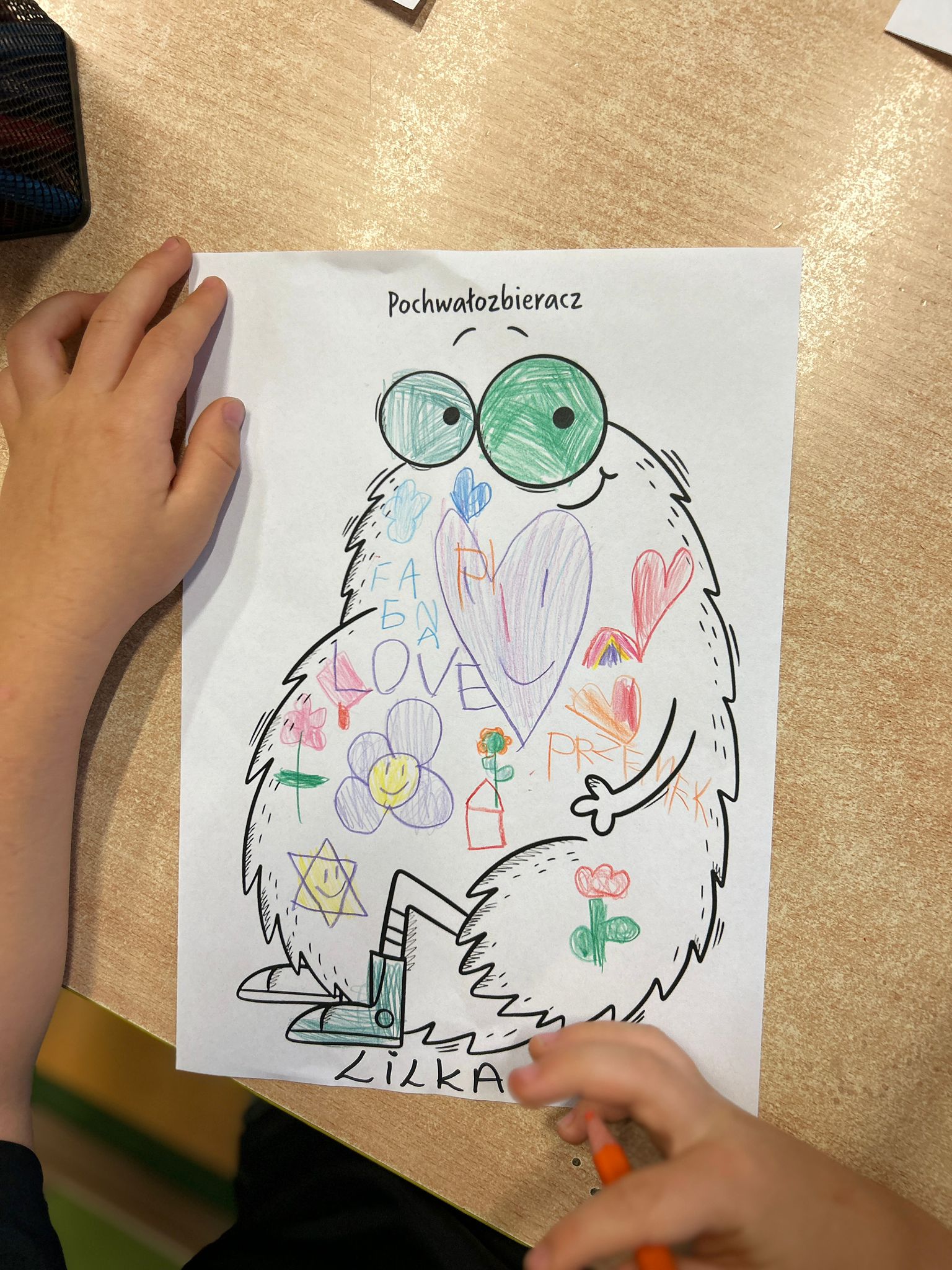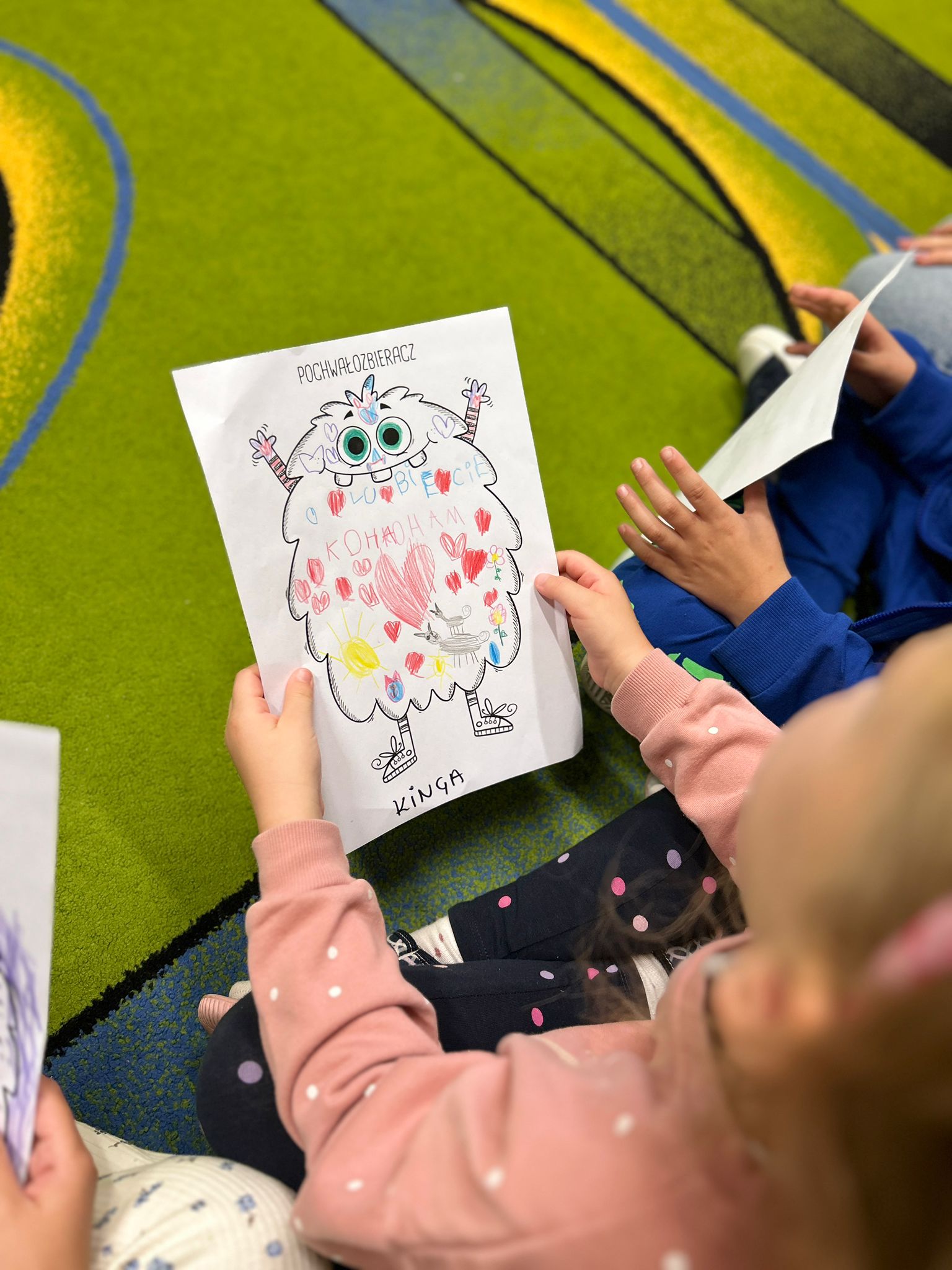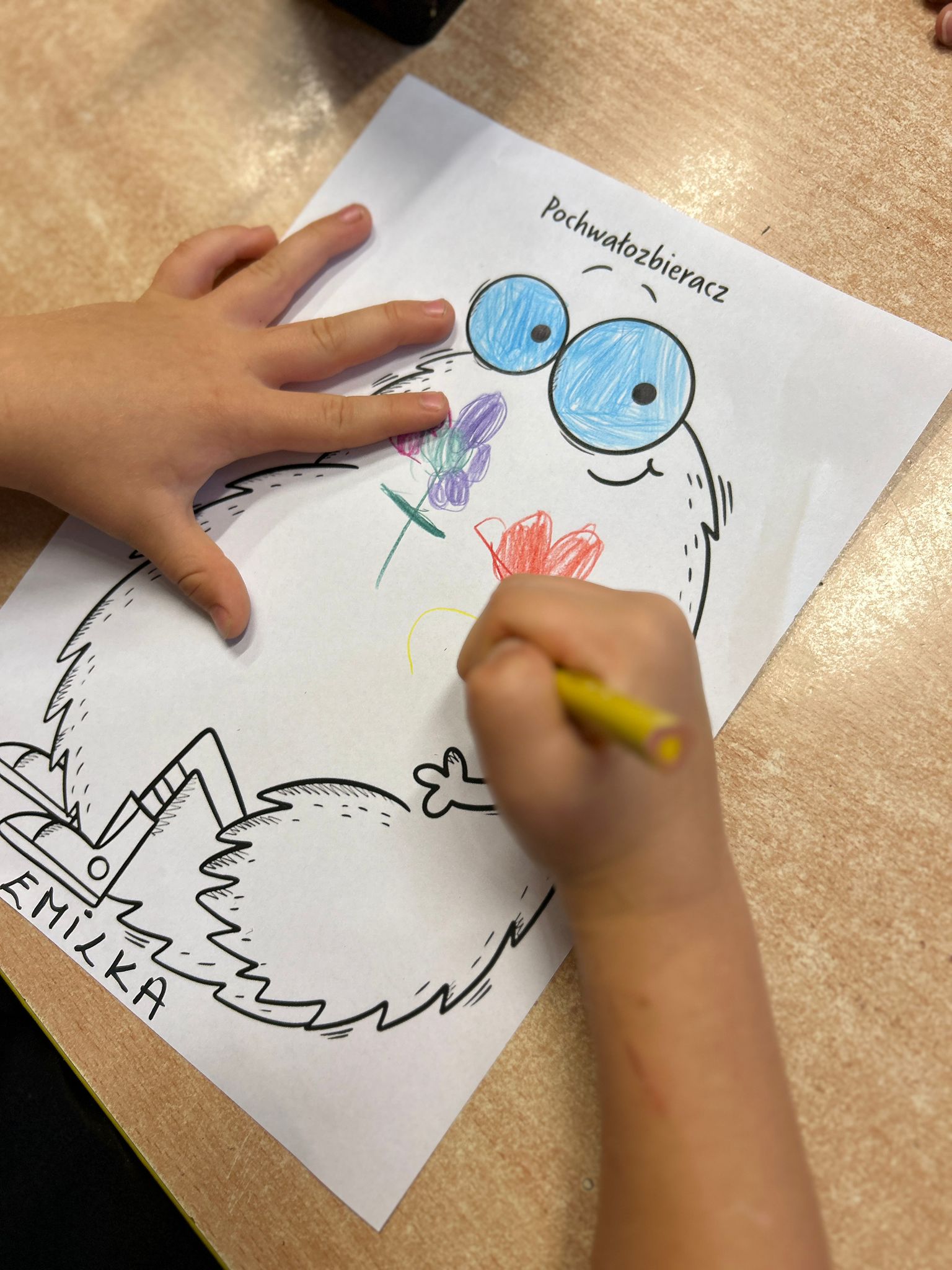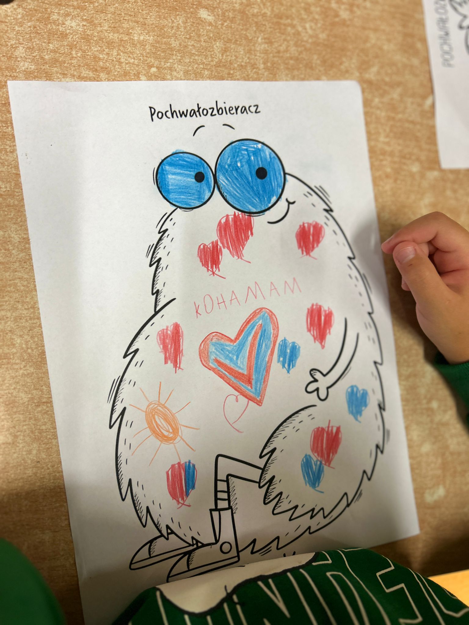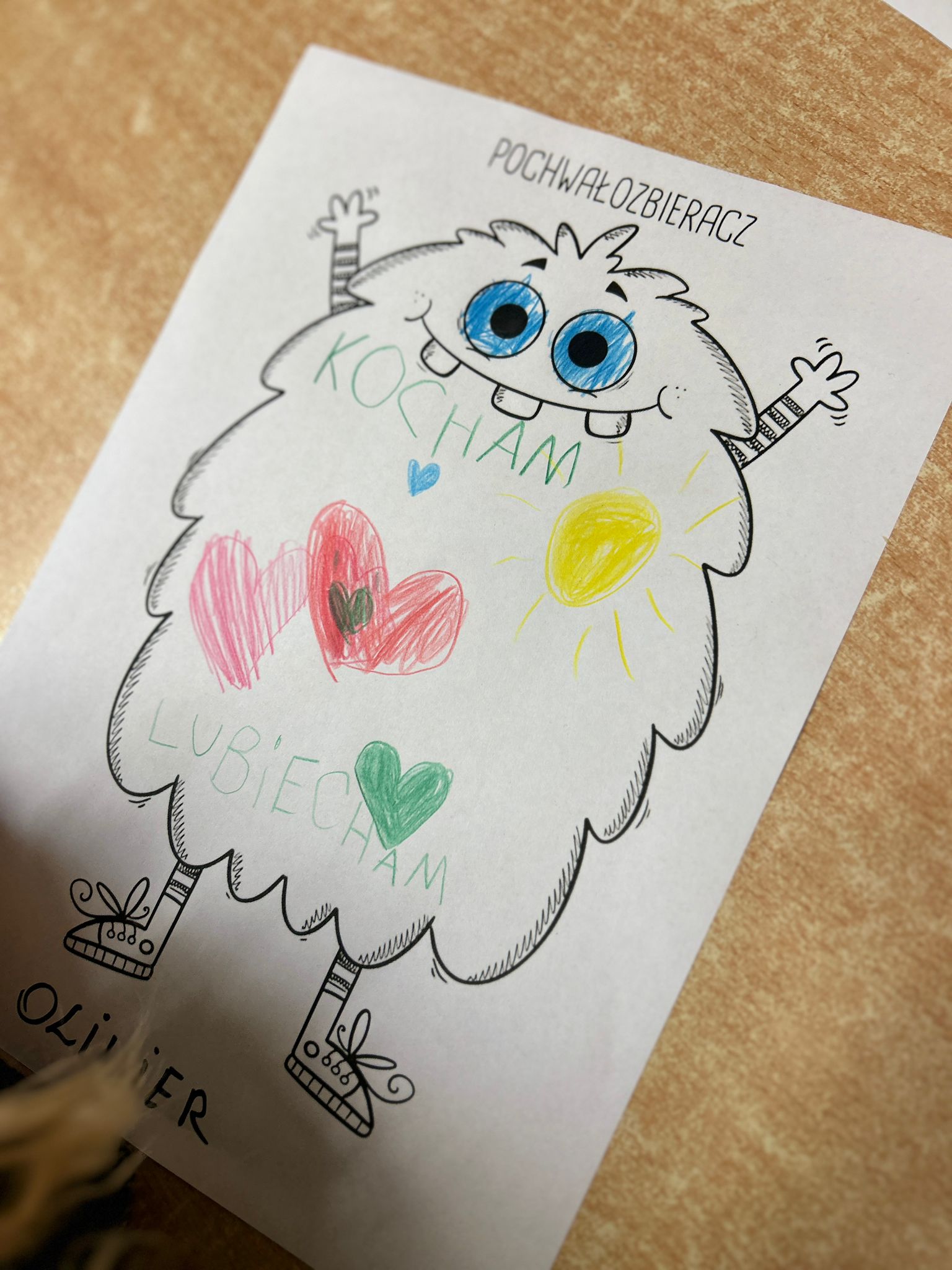 - wymieniały się "pochwałozbieraczami", na których malowały coś miłego dla innych. Celem było nauczenie się, czym są miłe gesty i jak przyjemnie jest je otrzymywać.