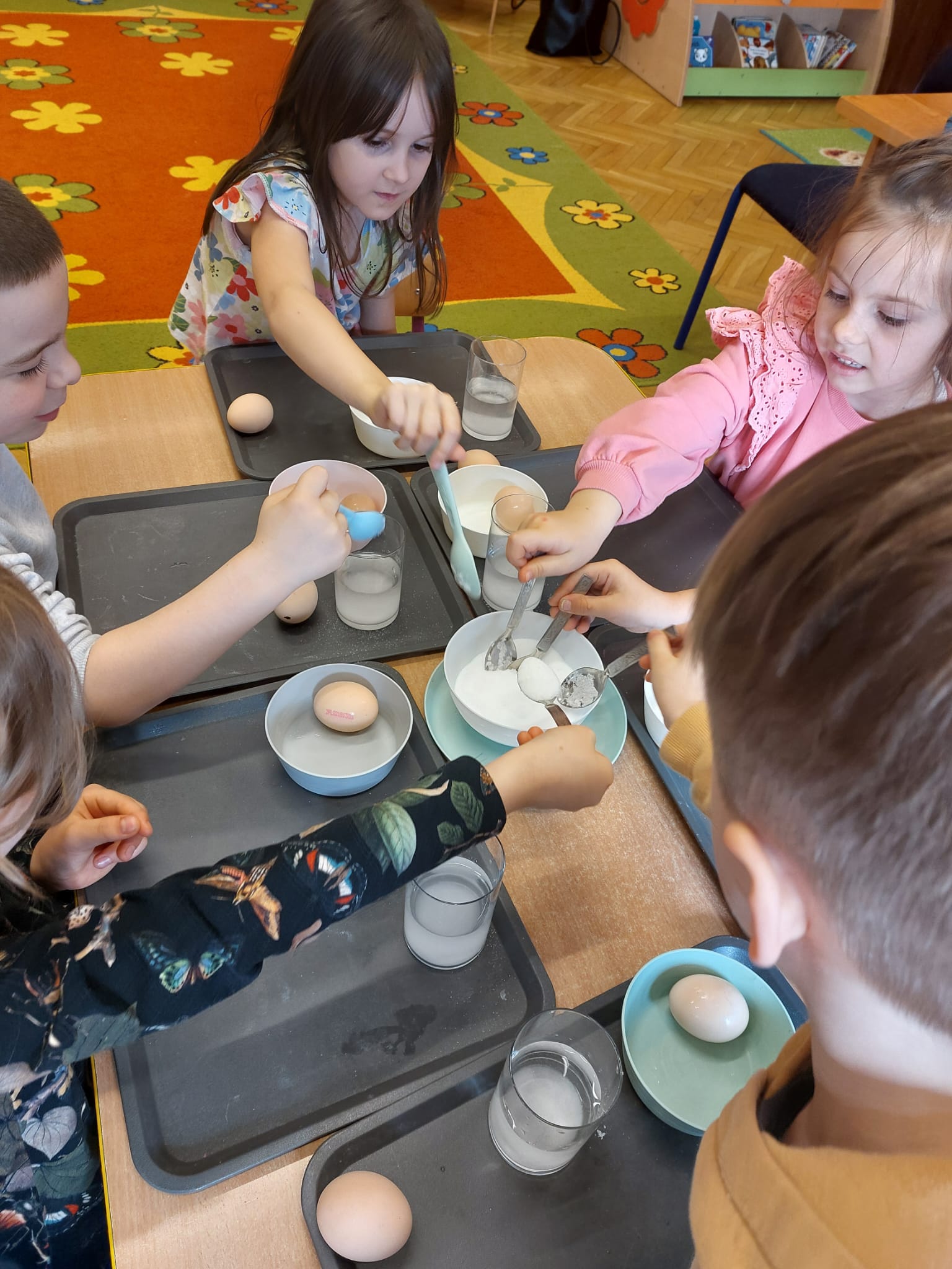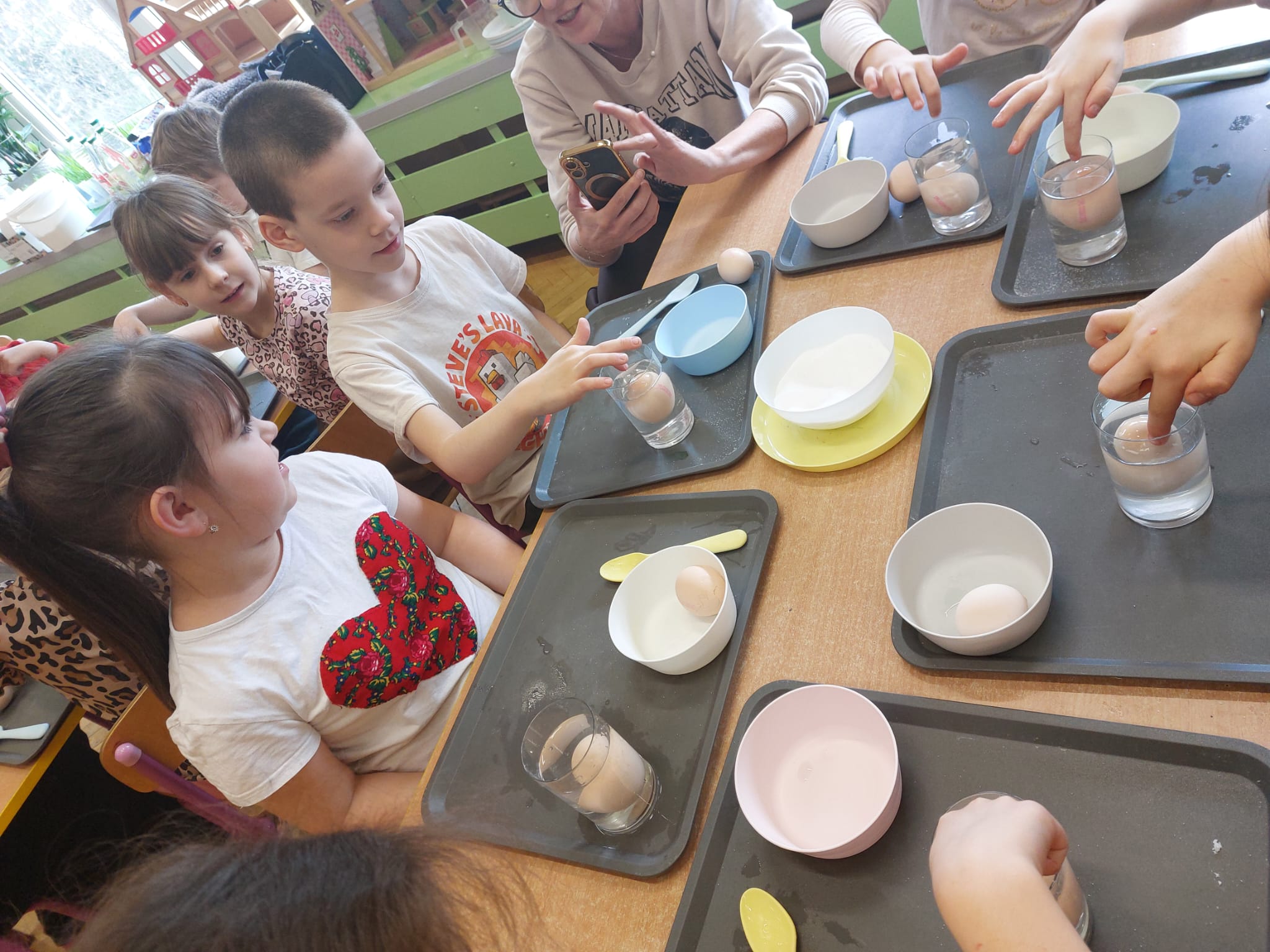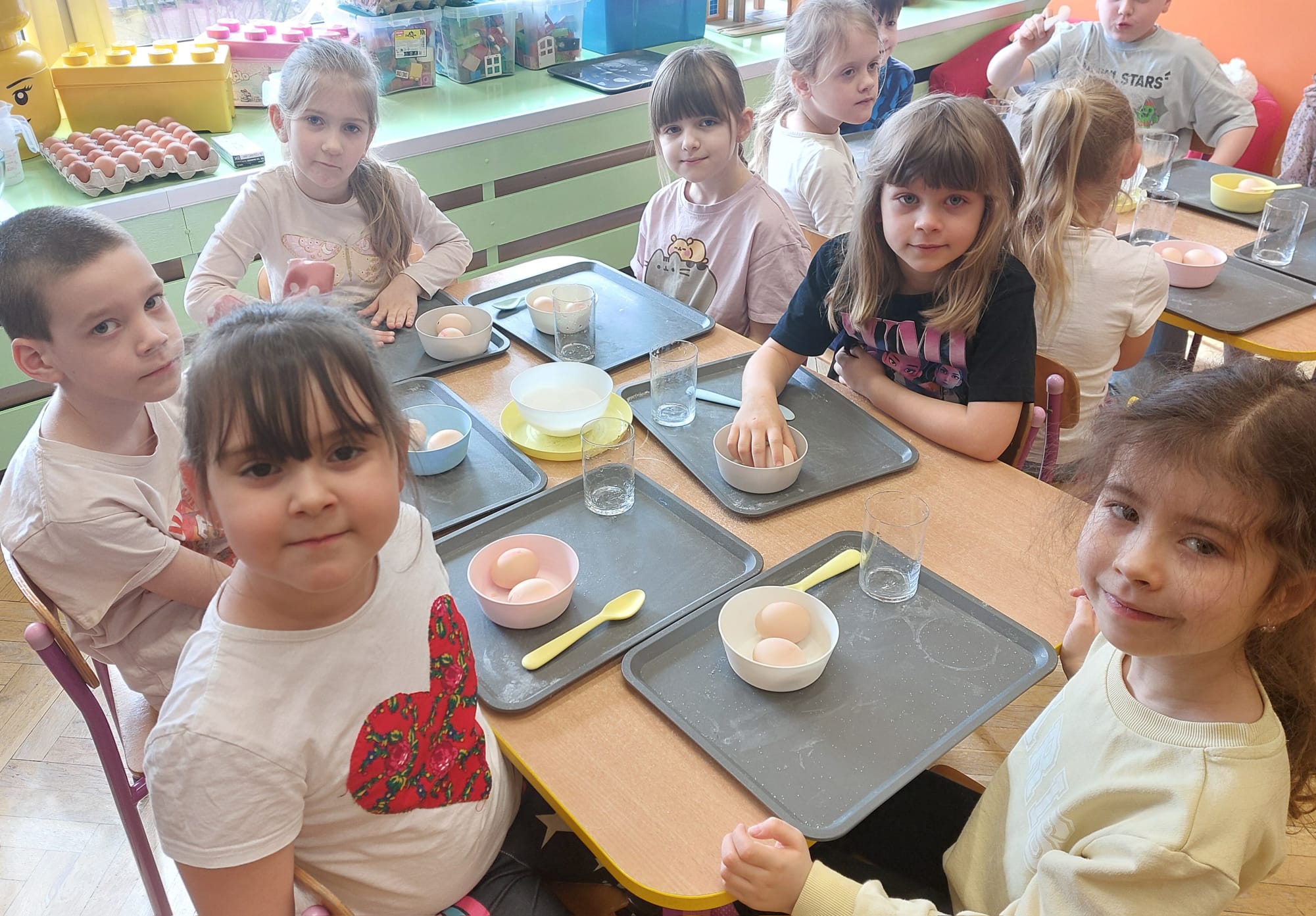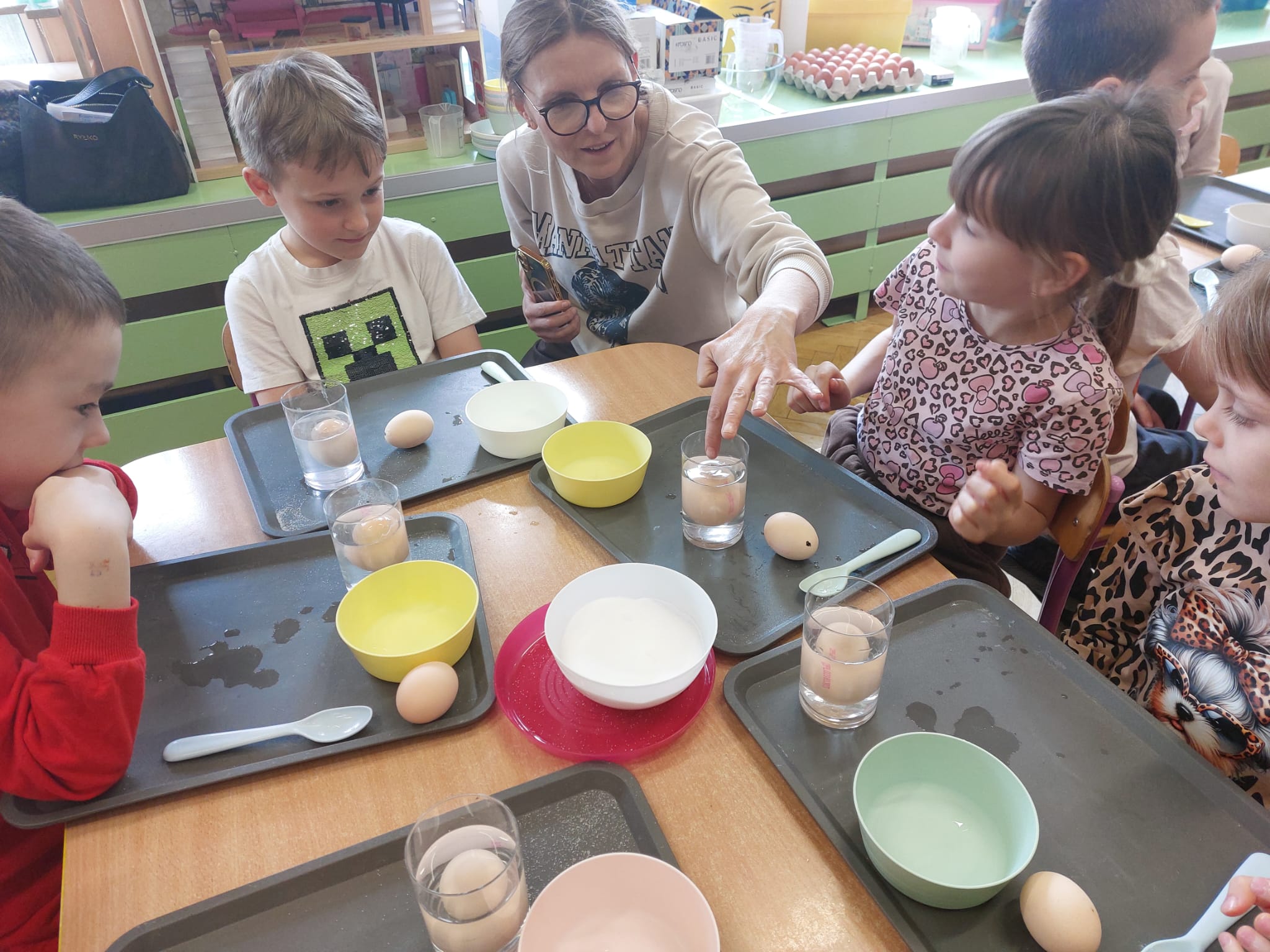 W grupie starszaków zapachniało nauką… i jajkiem!...Podczas warsztatów pt. „Eksperymenty z jajem” mali odkrywcy zamienili się w prawdziwych naukowców. Na pierwszy ogień poszło wielkie wyzwanie: czy jajko da się postawić na stole? Okazało się, że z odrobiną cierpliwości i sprytu – jak najbardziej! Radości było co niemiara, gdy pierwszym śmiałkom się udało. Potem zajrzeliśmy do wnętrza jajka… no, prawie! Zastanawialiśmy się, czy w środku jest powietrze – i szybko odkryliśmy, że tak! Mała komora powietrzna stała się wielką tajemnicą, którą dzieci rozwikłały z błyskiem w oku. Kolejna zagadka: jak odróżnić jajko surowe od ugotowanego? Kręciliśmy, obserwowaliśmy, testowaliśmy – i już każdy wiedział, że jajko potrafi zdradzić swoją tajemnicę… wystarczy je dobrze „rozkręcić”! A potem magia! Zwykła woda zamieniła się w… trampolinę dla jajka! Dzięki soli jajko zaczęło unosić się jak prawdziwy pływak. Dzieci patrzyły z zachwytem, jak nauka potrafi czarować. Na wielki finał – wulkan z białka jajka! Było pianowo, było efektownie i było… trochę śmiesznie. Eksperyment wywołał prawdziwą erupcję śmiechu! I nie mogło zabraknąć najważniejszego pytania: Co było pierwsze – jajko czy kura? Odpowiedzi było tyle, ile dzieci – a każda równie genialna. Bo w końcu w nauce nie chodzi tylko o odpowiedzi, ale o ciekawość, odwagę i radość odkrywania. To był dzień pełen eksperymentów, zdziwień i małych wielkich odkryć. A jedno wiemy na pewno – jajko to nie tylko śniadanie… to prawdziwa kopalnia naukowych przygód!. Po naukowych warsztatach dzieci zabrały się za dekorowanie „wielkanocnego zajączka” z wysianego wcześniej owsa do którego włożyły czekoladowe kolorowe jajeczka… WESOŁYCH ŚWIĄT !!!