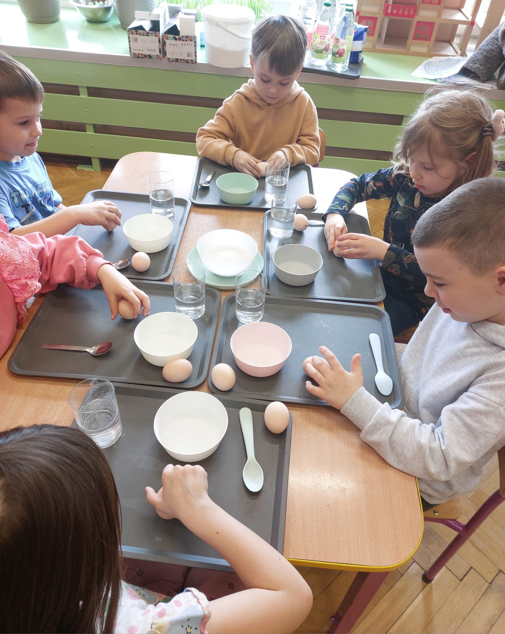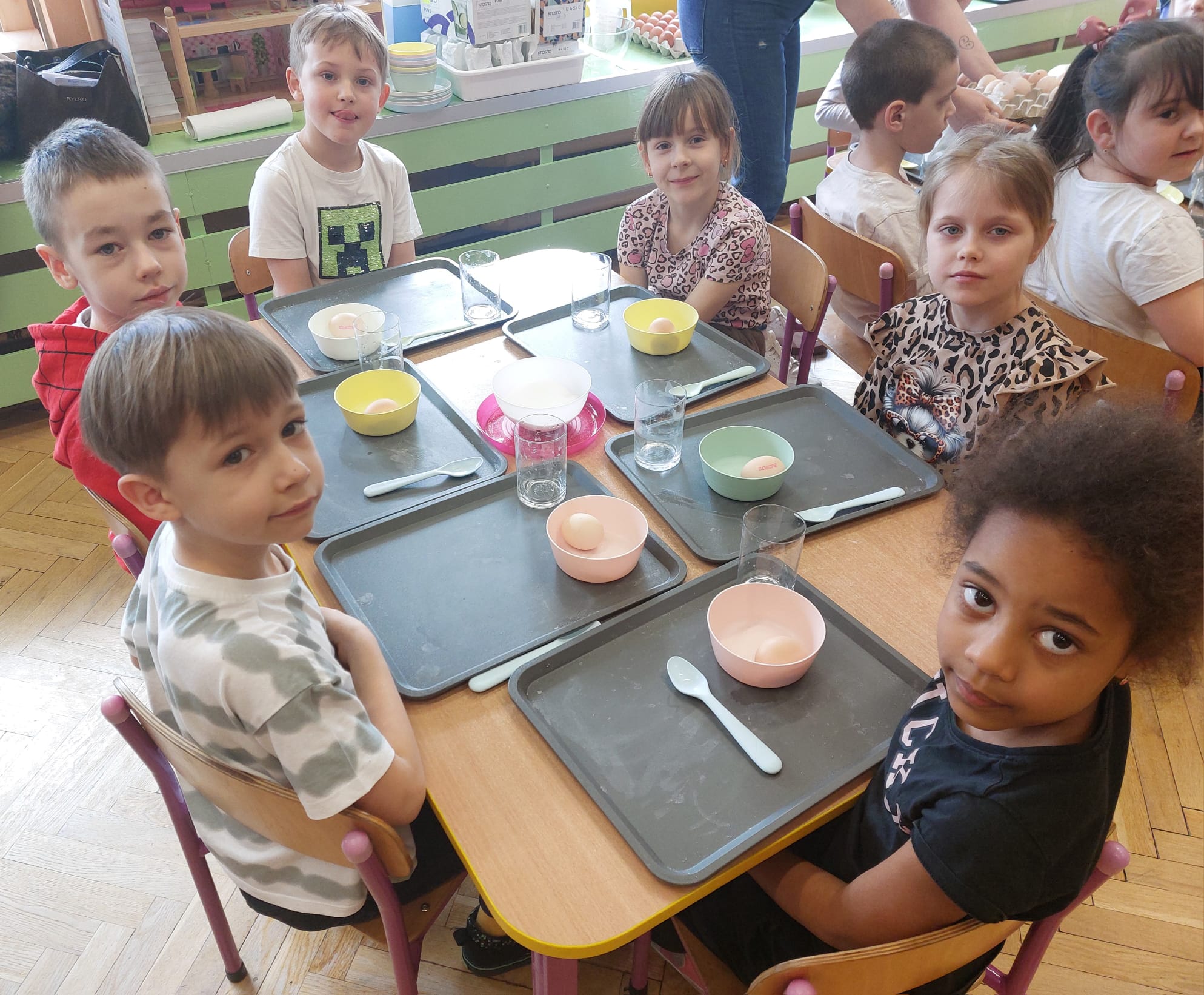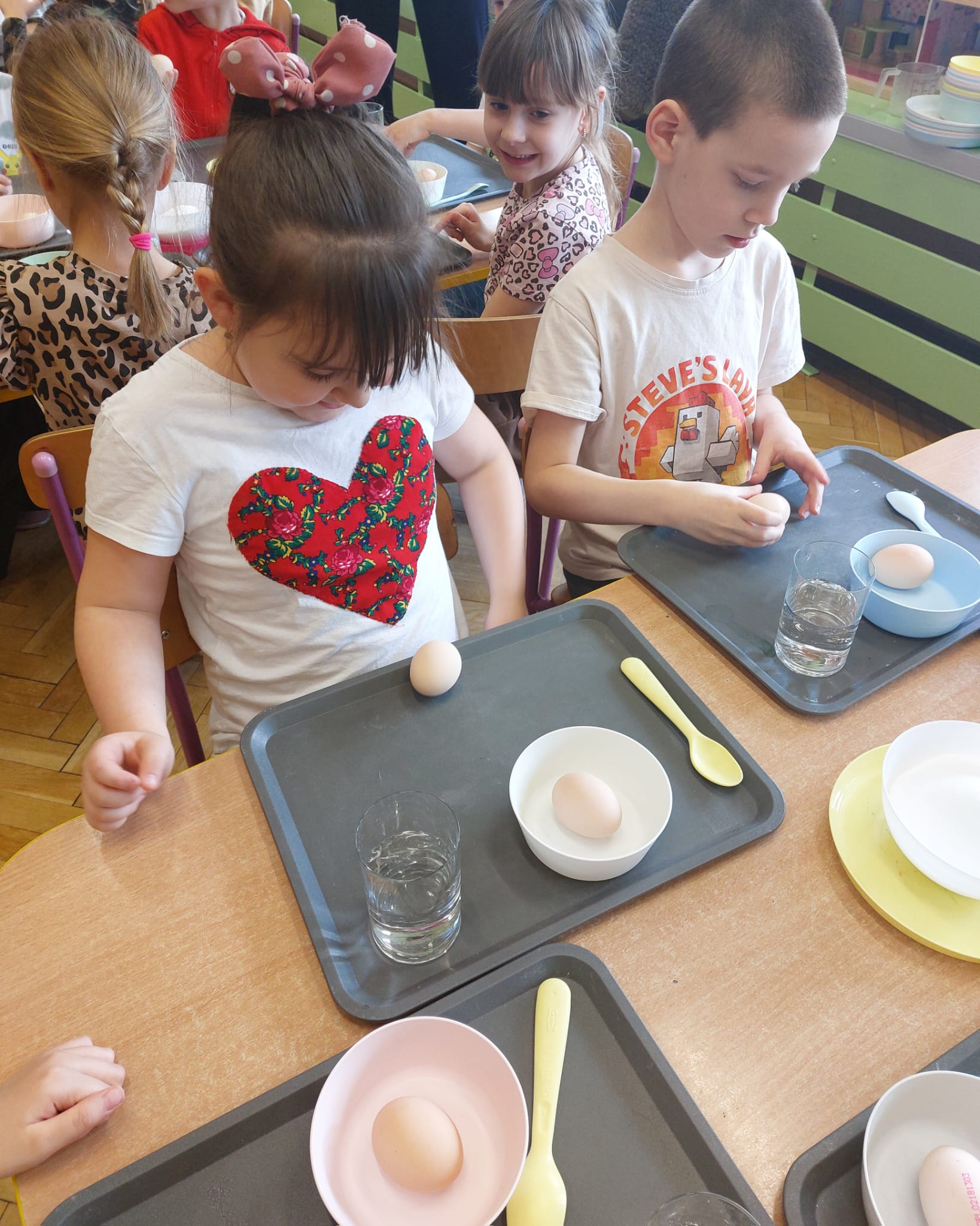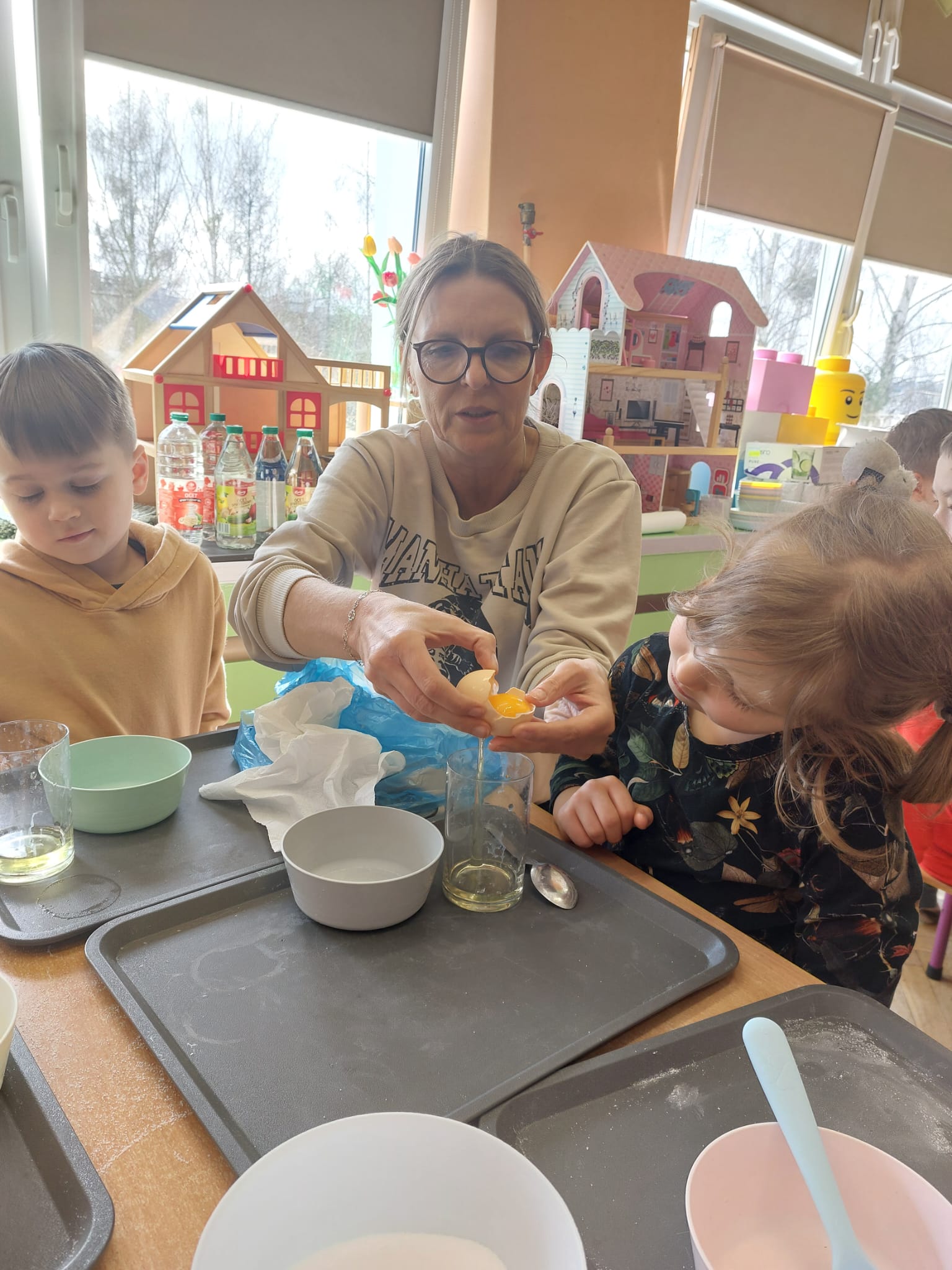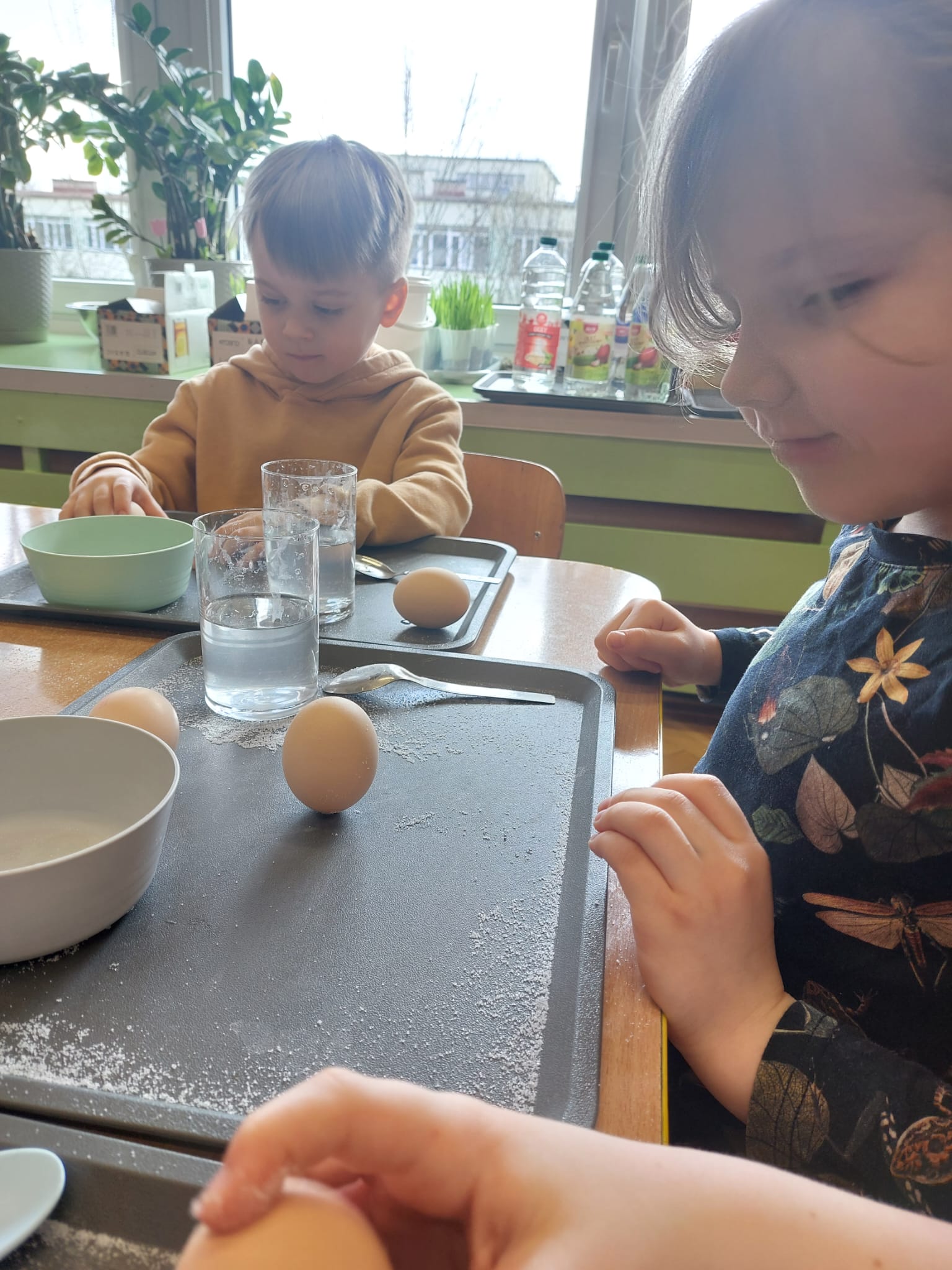 W grupie starszaków zapachniało nauką… i jajkiem!...Podczas warsztatów pt. „Eksperymenty z jajem” mali odkrywcy zamienili się w prawdziwych naukowców. Na pierwszy ogień poszło wielkie wyzwanie: czy jajko da się postawić na stole? Okazało się, że z odrobiną cierpliwości i sprytu – jak najbardziej! Radości było co niemiara, gdy pierwszym śmiałkom się udało. Potem zajrzeliśmy do wnętrza jajka… no, prawie! Zastanawialiśmy się, czy w środku jest powietrze – i szybko odkryliśmy, że tak! Mała komora powietrzna stała się wielką tajemnicą, którą dzieci rozwikłały z błyskiem w oku. Kolejna zagadka: jak odróżnić jajko surowe od ugotowanego? Kręciliśmy, obserwowaliśmy, testowaliśmy – i już każdy wiedział, że jajko potrafi zdradzić swoją tajemnicę… wystarczy je dobrze „rozkręcić”! A potem magia! Zwykła woda zamieniła się w… trampolinę dla jajka! Dzięki soli jajko zaczęło unosić się jak prawdziwy pływak. Dzieci patrzyły z zachwytem, jak nauka potrafi czarować. Na wielki finał – wulkan z białka jajka! Było pianowo, było efektownie i było… trochę śmiesznie. Eksperyment wywołał prawdziwą erupcję śmiechu! I nie mogło zabraknąć najważniejszego pytania: Co było pierwsze – jajko czy kura? Odpowiedzi było tyle, ile dzieci – a każda równie genialna. Bo w końcu w nauce nie chodzi tylko o odpowiedzi, ale o ciekawość, odwagę i radość odkrywania. To był dzień pełen eksperymentów, zdziwień i małych wielkich odkryć. A jedno wiemy na pewno – jajko to nie tylko śniadanie… to prawdziwa kopalnia naukowych przygód!. Po naukowych warsztatach dzieci zabrały się za dekorowanie „wielkanocnego zajączka” z wysianego wcześniej owsa do którego włożyły czekoladowe kolorowe jajeczka… WESOŁYCH ŚWIĄT !!!