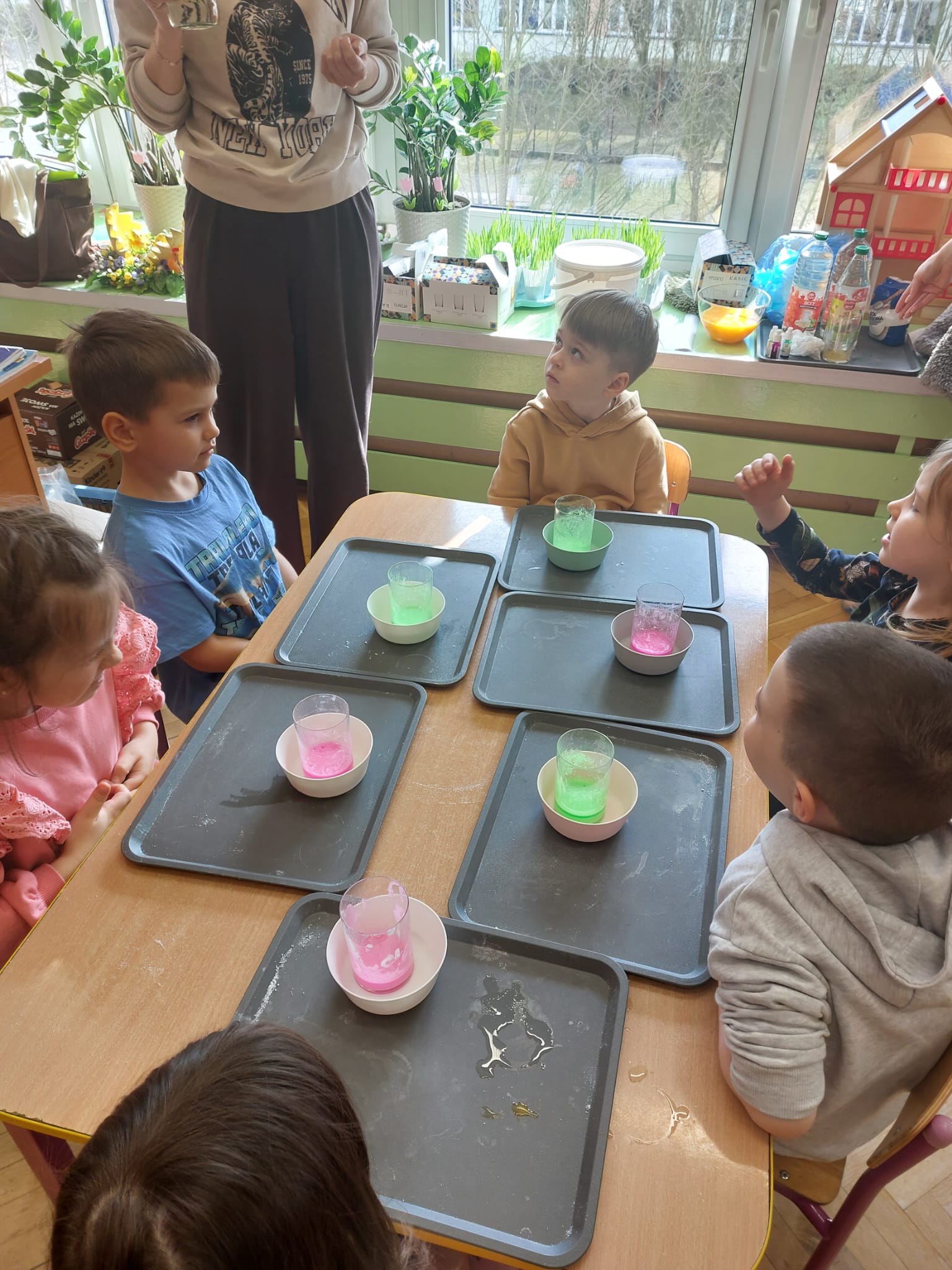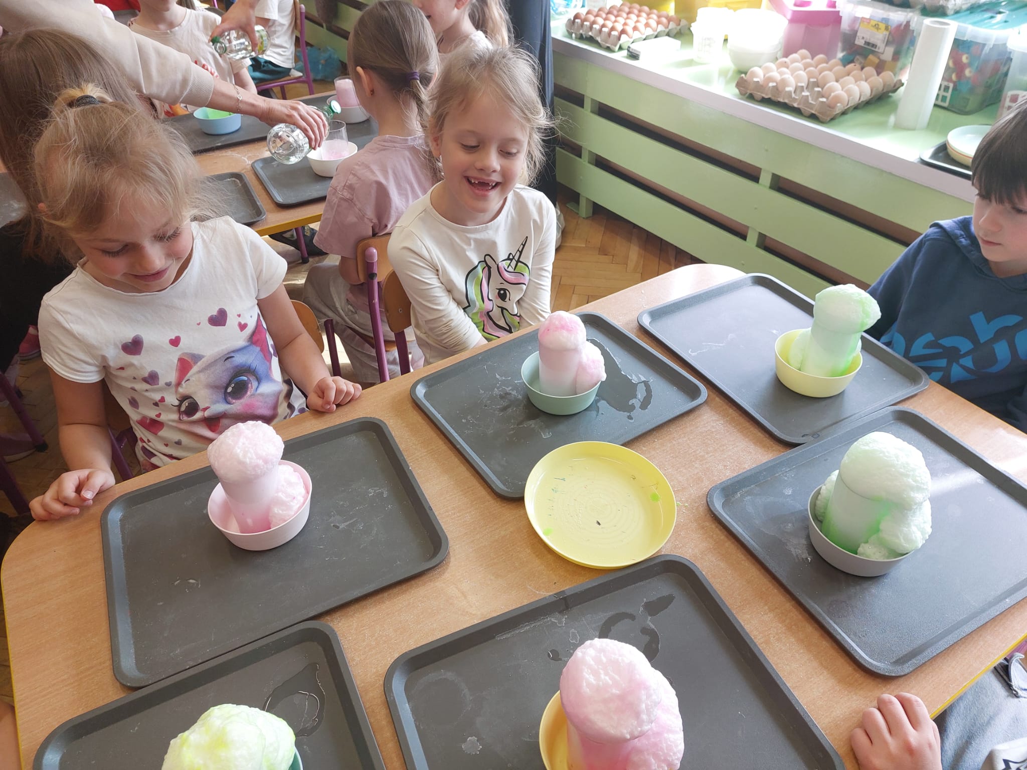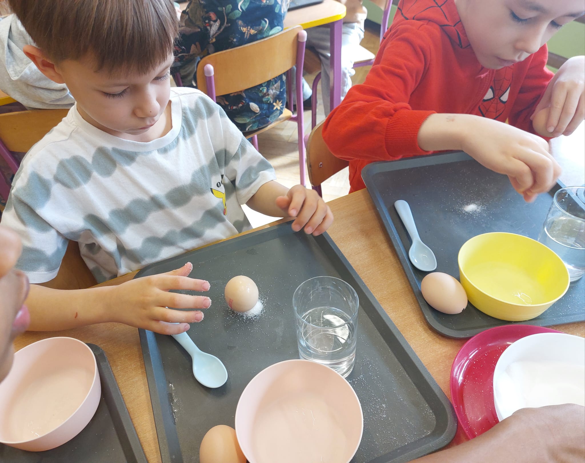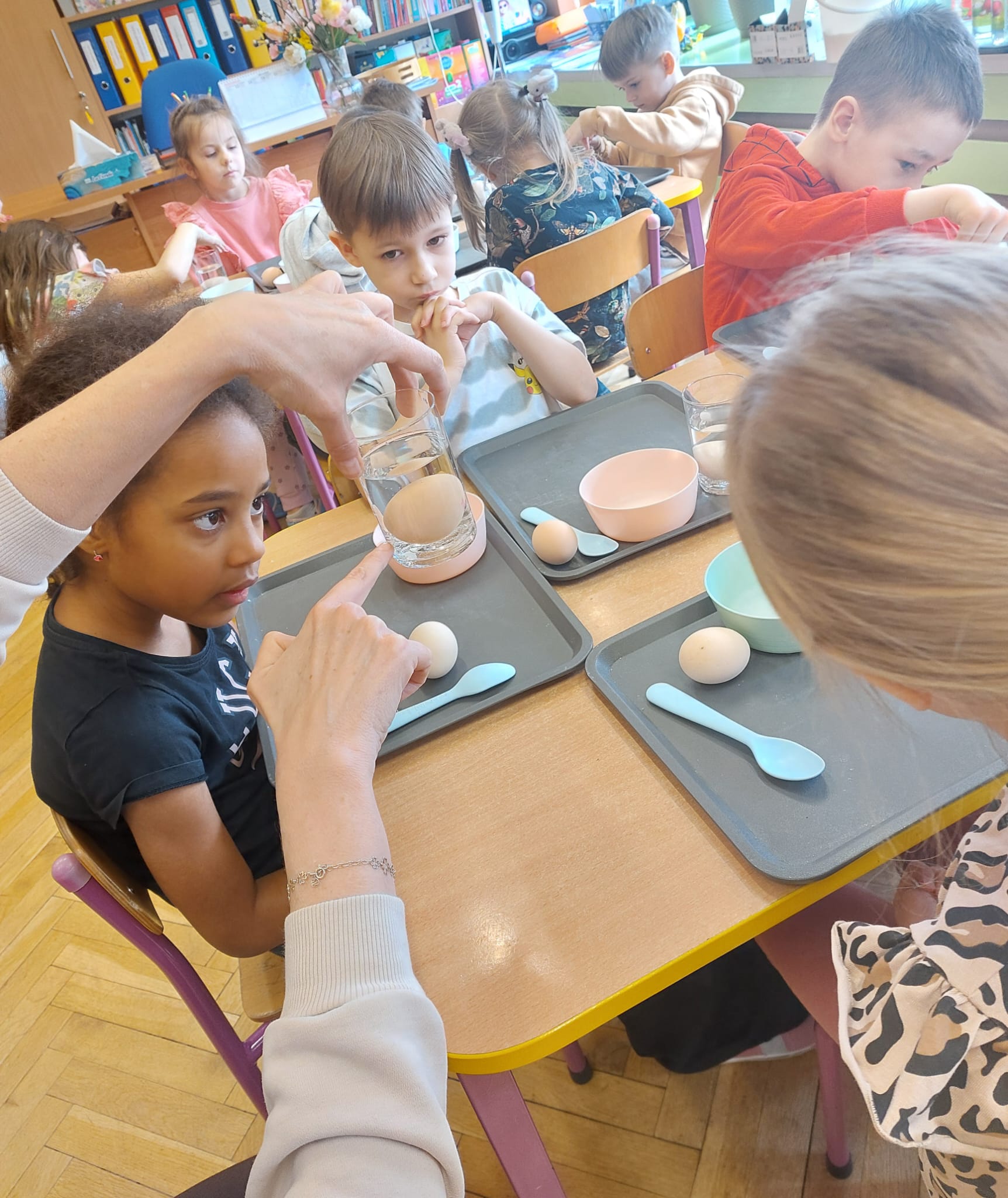 W grupie starszaków zapachniało nauką… i jajkiem!...Podczas warsztatów pt. „Eksperymenty z jajem” mali odkrywcy zamienili się w prawdziwych naukowców. Na pierwszy ogień poszło wielkie wyzwanie: czy jajko da się postawić na stole? Okazało się, że z odrobiną cierpliwości i sprytu – jak najbardziej! Radości było co niemiara, gdy pierwszym śmiałkom się udało. Potem zajrzeliśmy do wnętrza jajka… no, prawie! Zastanawialiśmy się, czy w środku jest powietrze – i szybko odkryliśmy, że tak! Mała komora powietrzna stała się wielką tajemnicą, którą dzieci rozwikłały z błyskiem w oku. Kolejna zagadka: jak odróżnić jajko surowe od ugotowanego? Kręciliśmy, obserwowaliśmy, testowaliśmy – i już każdy wiedział, że jajko potrafi zdradzić swoją tajemnicę… wystarczy je dobrze „rozkręcić”! A potem magia! Zwykła woda zamieniła się w… trampolinę dla jajka! Dzięki soli jajko zaczęło unosić się jak prawdziwy pływak. Dzieci patrzyły z zachwytem, jak nauka potrafi czarować. Na wielki finał – wulkan z białka jajka! Było pianowo, było efektownie i było… trochę śmiesznie. Eksperyment wywołał prawdziwą erupcję śmiechu! I nie mogło zabraknąć najważniejszego pytania: Co było pierwsze – jajko czy kura? Odpowiedzi było tyle, ile dzieci – a każda równie genialna. Bo w końcu w nauce nie chodzi tylko o odpowiedzi, ale o ciekawość, odwagę i radość odkrywania. To był dzień pełen eksperymentów, zdziwień i małych wielkich odkryć. A jedno wiemy na pewno – jajko to nie tylko śniadanie… to prawdziwa kopalnia naukowych przygód!. Po naukowych warsztatach dzieci zabrały się za dekorowanie „wielkanocnego zajączka” z wysianego wcześniej owsa do którego włożyły czekoladowe kolorowe jajeczka… WESOŁYCH ŚWIĄT !!!
