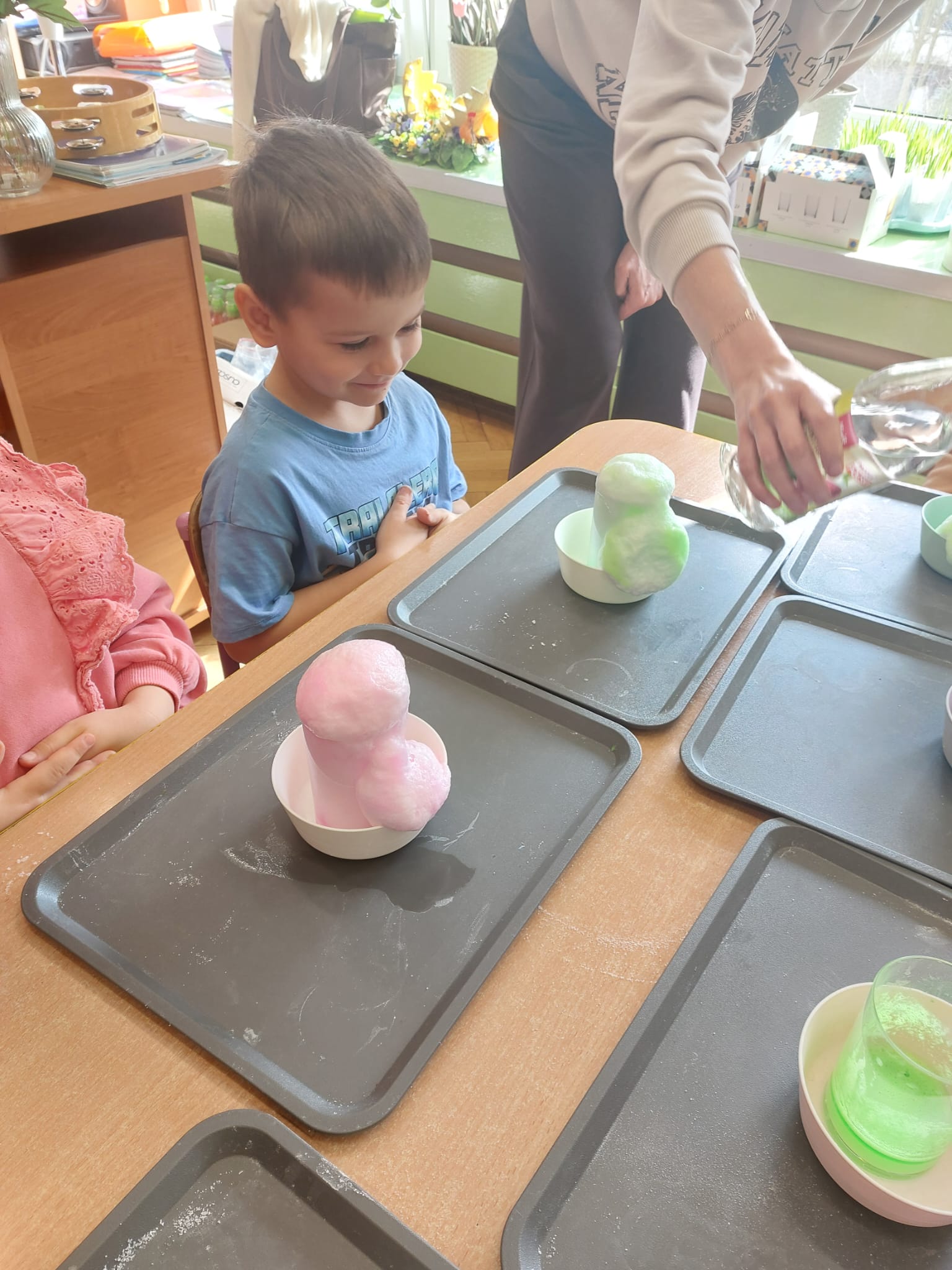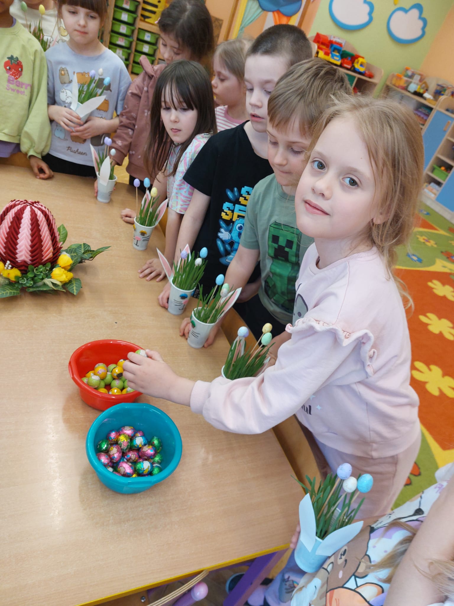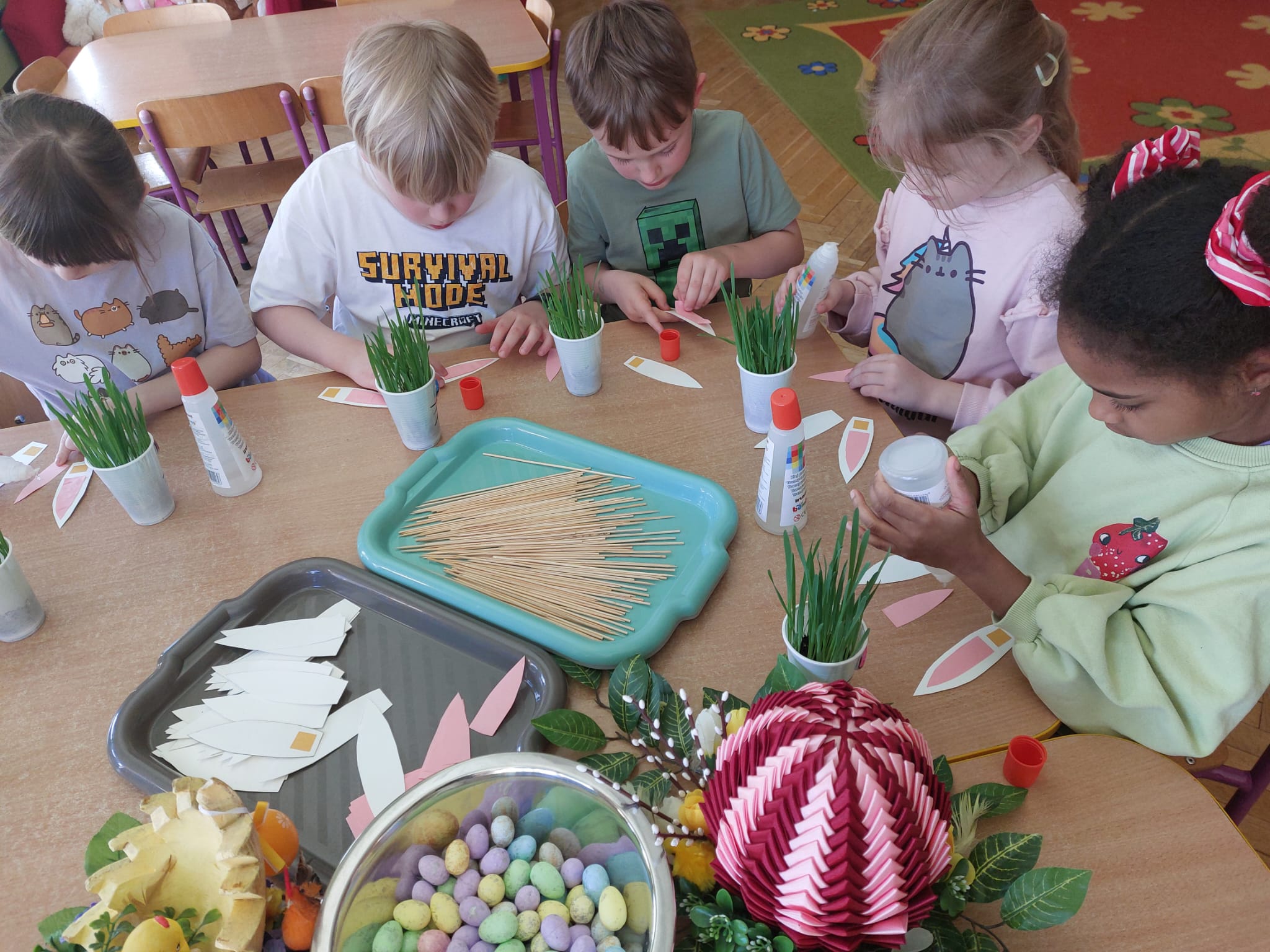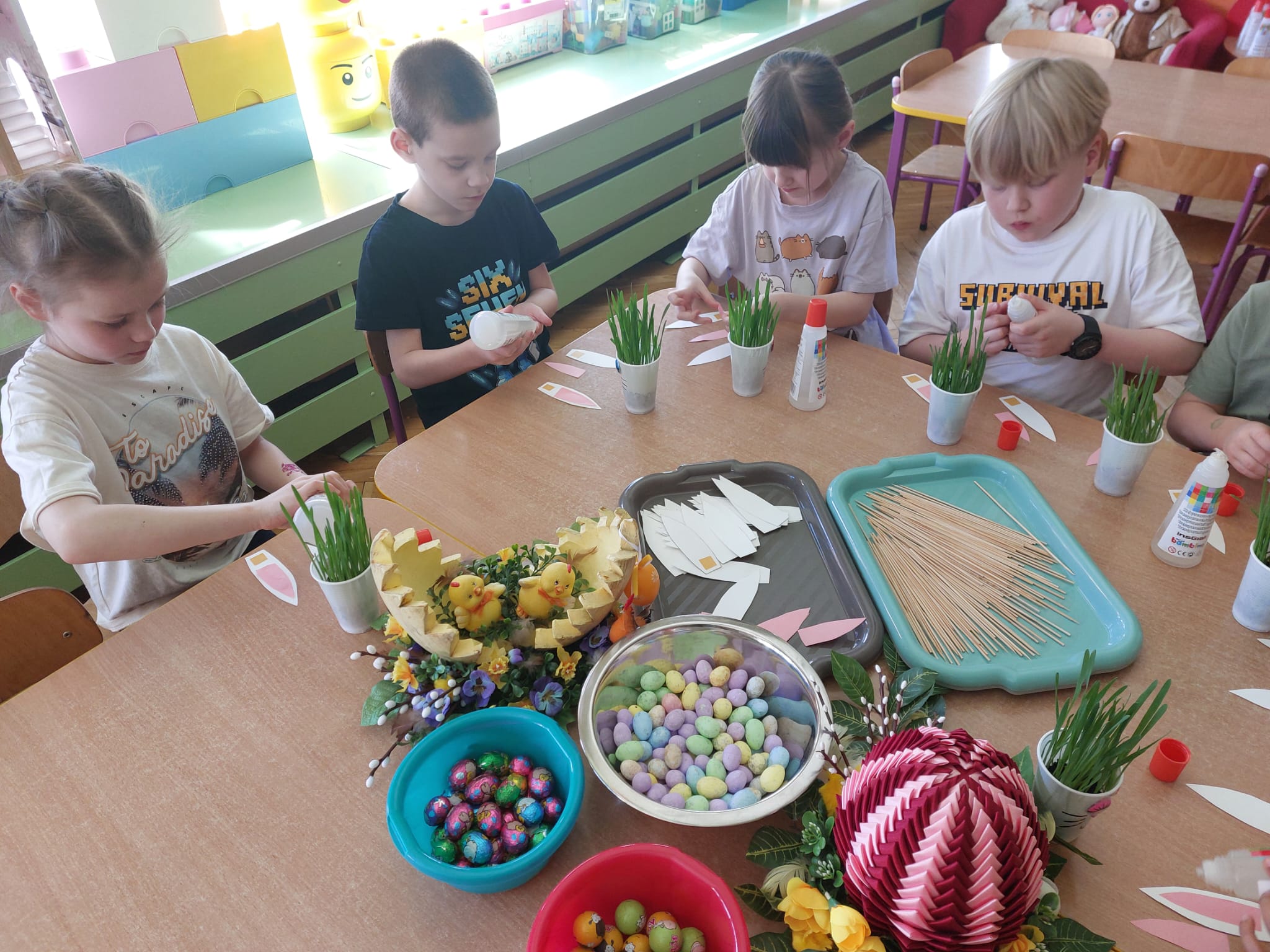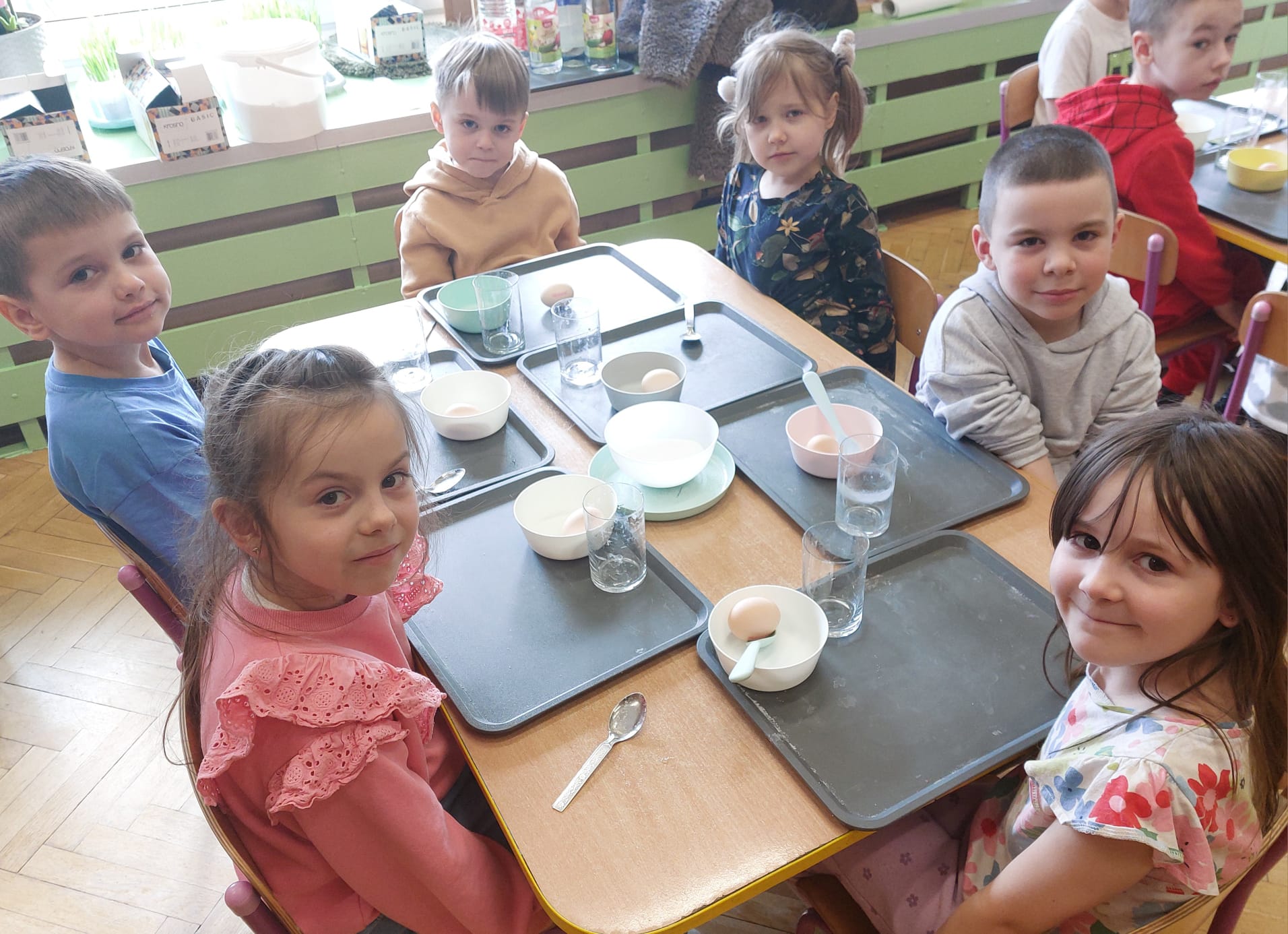 W grupie starszaków zapachniało nauką… i jajkiem!...Podczas warsztatów pt. „Eksperymenty z jajem” mali odkrywcy zamienili się w prawdziwych naukowców. Na pierwszy ogień poszło wielkie wyzwanie: czy jajko da się postawić na stole? Okazało się, że z odrobiną cierpliwości i sprytu – jak najbardziej! Radości było co niemiara, gdy pierwszym śmiałkom się udało. Potem zajrzeliśmy do wnętrza jajka… no, prawie! Zastanawialiśmy się, czy w środku jest powietrze – i szybko odkryliśmy, że tak! Mała komora powietrzna stała się wielką tajemnicą, którą dzieci rozwikłały z błyskiem w oku. Kolejna zagadka: jak odróżnić jajko surowe od ugotowanego? Kręciliśmy, obserwowaliśmy, testowaliśmy – i już każdy wiedział, że jajko potrafi zdradzić swoją tajemnicę… wystarczy je dobrze „rozkręcić”! A potem magia! Zwykła woda zamieniła się w… trampolinę dla jajka! Dzięki soli jajko zaczęło unosić się jak prawdziwy pływak. Dzieci patrzyły z zachwytem, jak nauka potrafi czarować. Na wielki finał – wulkan z białka jajka! Było pianowo, było efektownie i było… trochę śmiesznie. Eksperyment wywołał prawdziwą erupcję śmiechu! I nie mogło zabraknąć najważniejszego pytania: Co było pierwsze – jajko czy kura? Odpowiedzi było tyle, ile dzieci – a każda równie genialna. Bo w końcu w nauce nie chodzi tylko o odpowiedzi, ale o ciekawość, odwagę i radość odkrywania. To był dzień pełen eksperymentów, zdziwień i małych wielkich odkryć. A jedno wiemy na pewno – jajko to nie tylko śniadanie… to prawdziwa kopalnia naukowych przygód!. Po naukowych warsztatach dzieci zabrały się za dekorowanie „wielkanocnego zajączka” z wysianego wcześniej owsa do którego włożyły czekoladowe kolorowe jajeczka… WESOŁYCH ŚWIĄT !!!