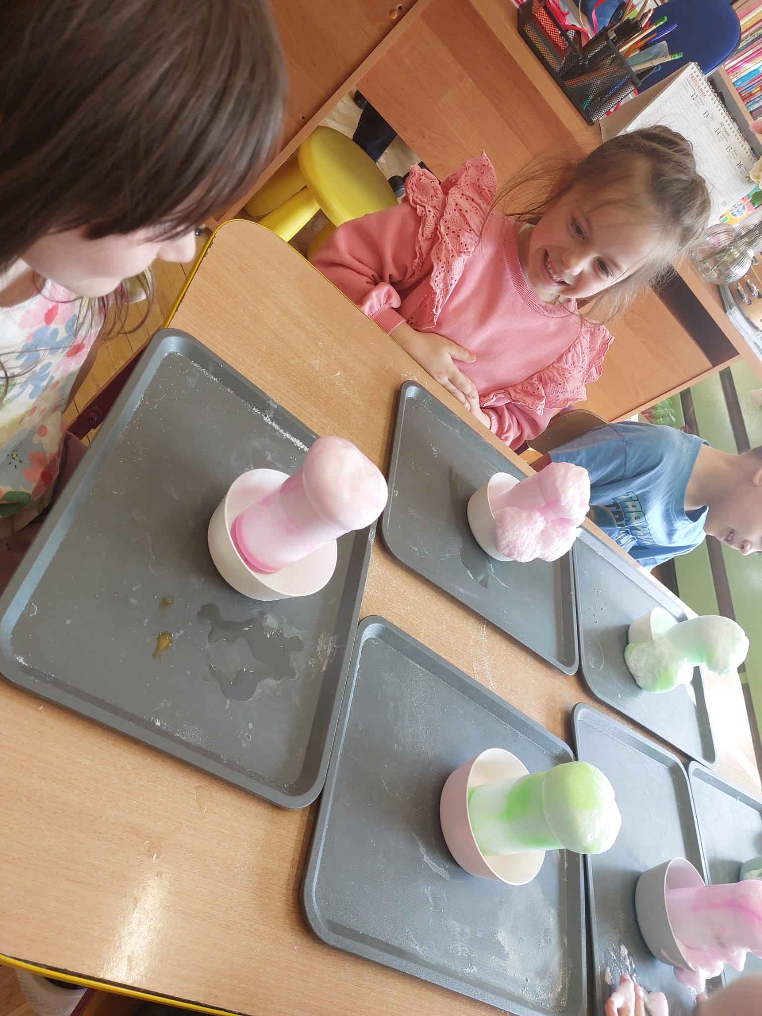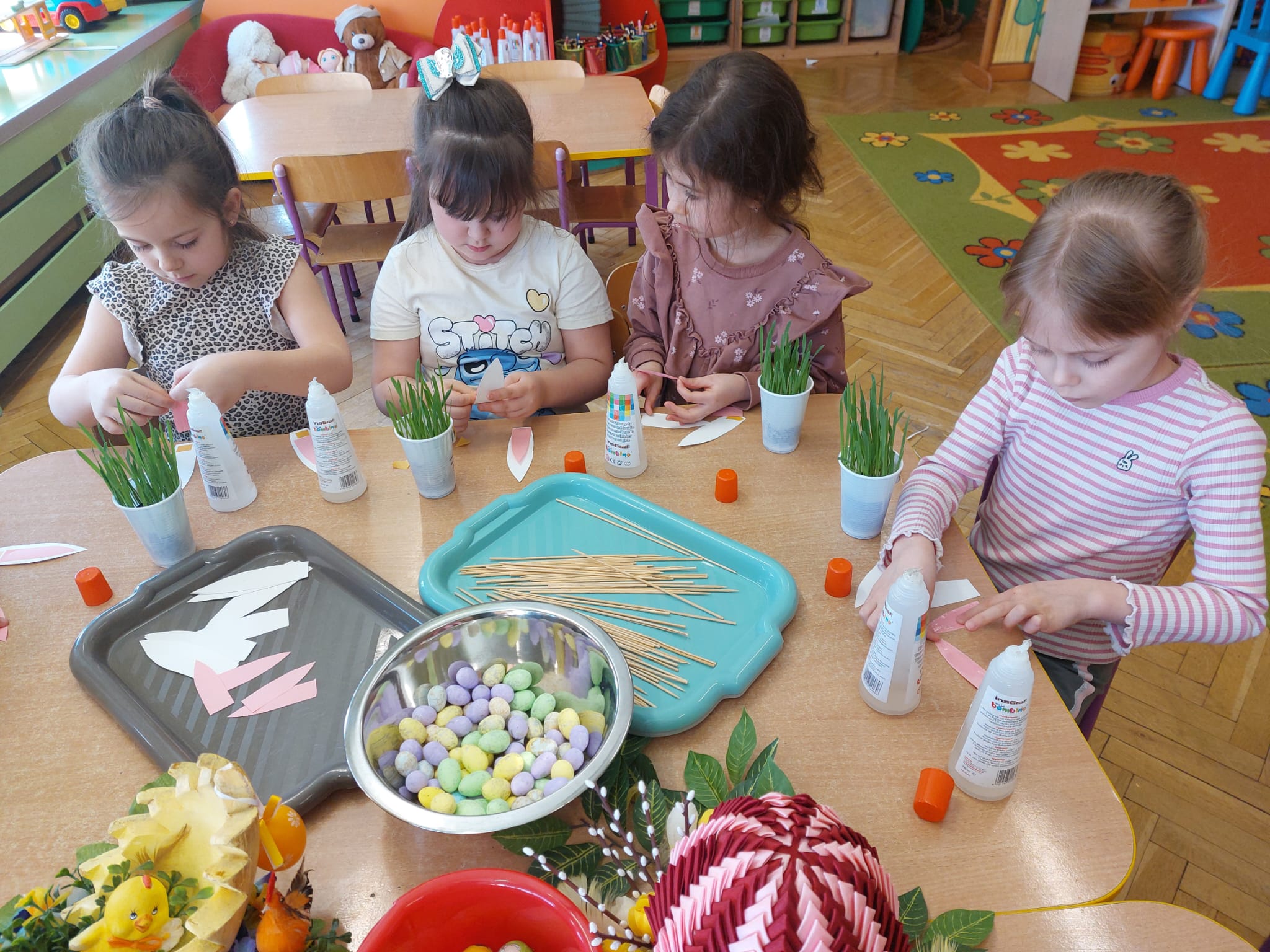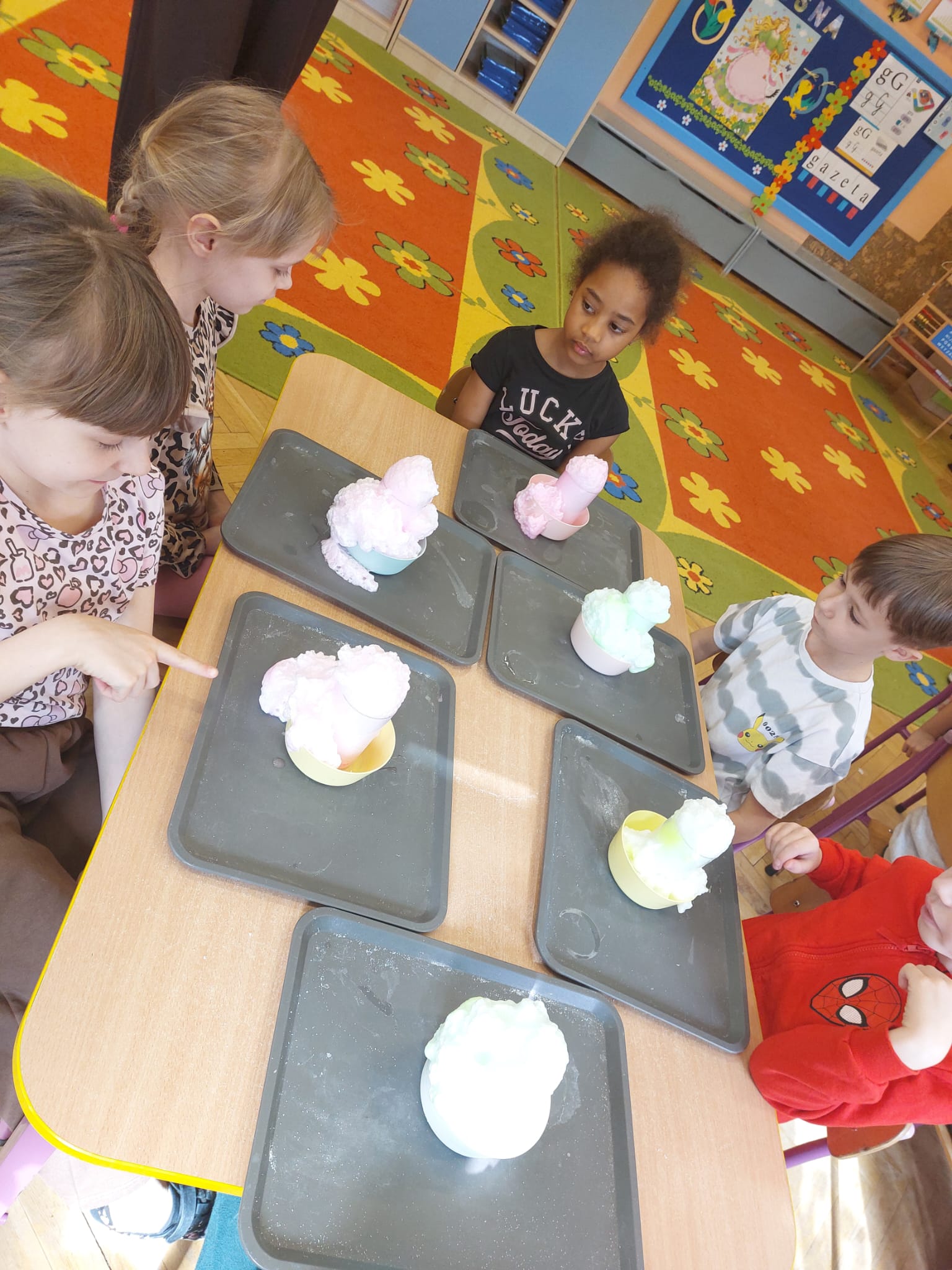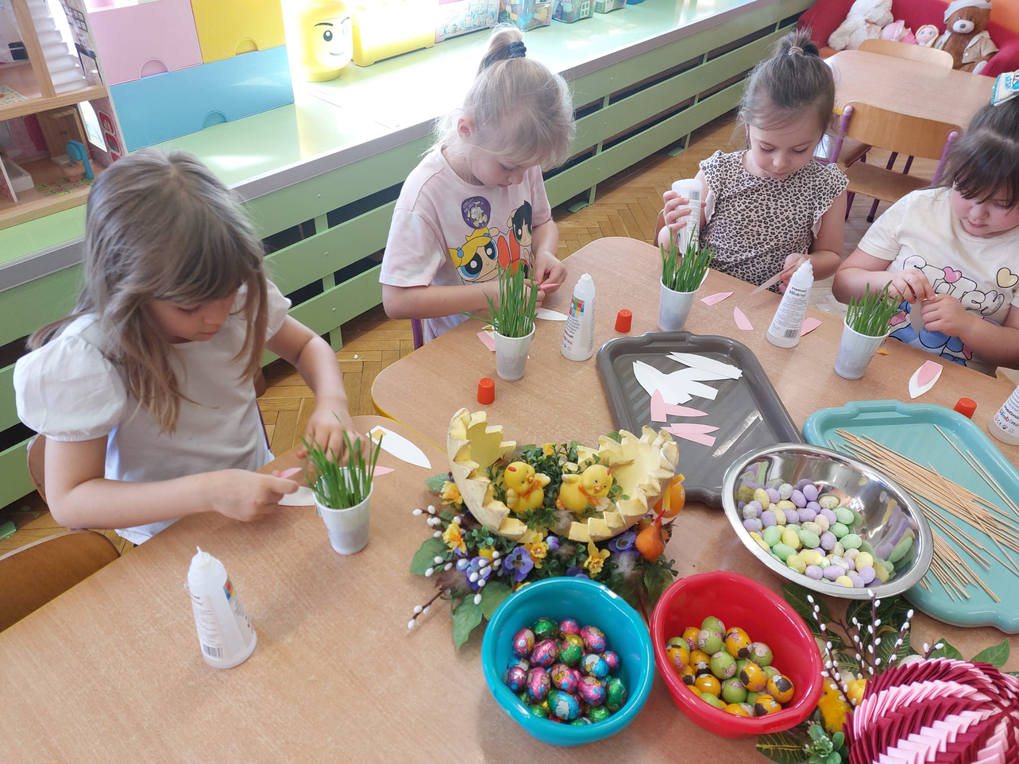 W grupie starszaków zapachniało nauką… i jajkiem!...Podczas warsztatów pt. „Eksperymenty z jajem” mali odkrywcy zamienili się w prawdziwych naukowców. Na pierwszy ogień poszło wielkie wyzwanie: czy jajko da się postawić na stole? Okazało się, że z odrobiną cierpliwości i sprytu – jak najbardziej! Radości było co niemiara, gdy pierwszym śmiałkom się udało. Potem zajrzeliśmy do wnętrza jajka… no, prawie! Zastanawialiśmy się, czy w środku jest powietrze – i szybko odkryliśmy, że tak! Mała komora powietrzna stała się wielką tajemnicą, którą dzieci rozwikłały z błyskiem w oku. Kolejna zagadka: jak odróżnić jajko surowe od ugotowanego? Kręciliśmy, obserwowaliśmy, testowaliśmy – i już każdy wiedział, że jajko potrafi zdradzić swoją tajemnicę… wystarczy je dobrze „rozkręcić”! A potem magia! Zwykła woda zamieniła się w… trampolinę dla jajka! Dzięki soli jajko zaczęło unosić się jak prawdziwy pływak. Dzieci patrzyły z zachwytem, jak nauka potrafi czarować. Na wielki finał – wulkan z białka jajka! Było pianowo, było efektownie i było… trochę śmiesznie. Eksperyment wywołał prawdziwą erupcję śmiechu! I nie mogło zabraknąć najważniejszego pytania: Co było pierwsze – jajko czy kura? Odpowiedzi było tyle, ile dzieci – a każda równie genialna. Bo w końcu w nauce nie chodzi tylko o odpowiedzi, ale o ciekawość, odwagę i radość odkrywania. To był dzień pełen eksperymentów, zdziwień i małych wielkich odkryć. A jedno wiemy na pewno – jajko to nie tylko śniadanie… to prawdziwa kopalnia naukowych przygód!. Po naukowych warsztatach dzieci zabrały się za dekorowanie „wielkanocnego zajączka” z wysianego wcześniej owsa do którego włożyły czekoladowe kolorowe jajeczka… WESOŁYCH ŚWIĄT !!!