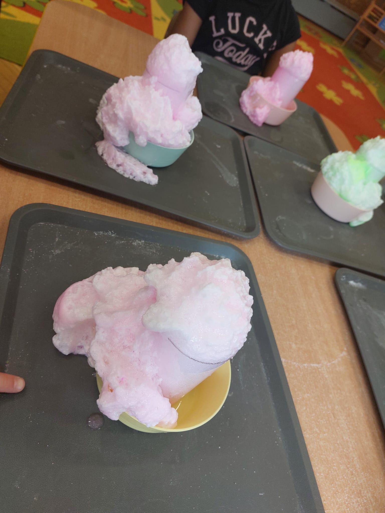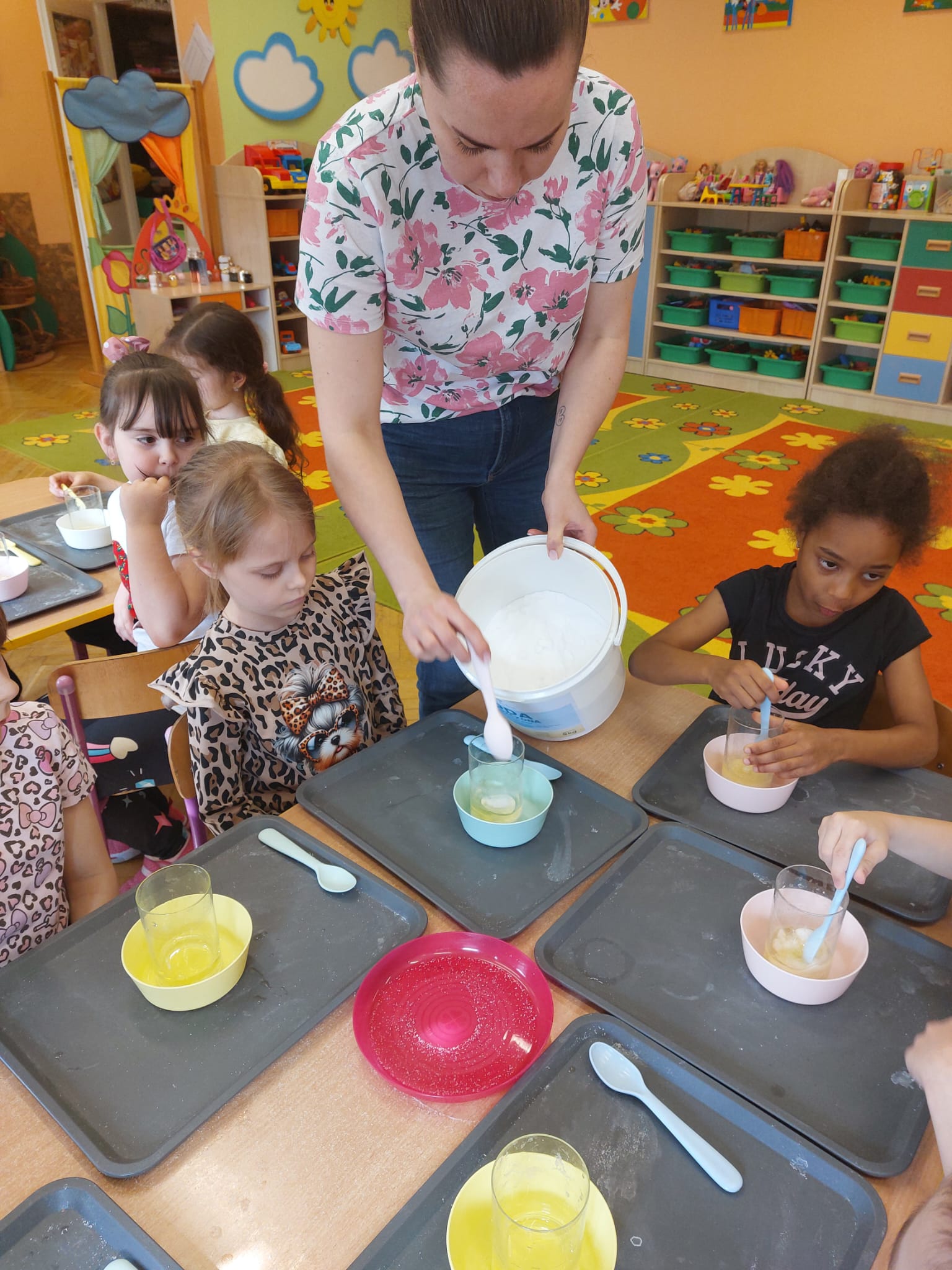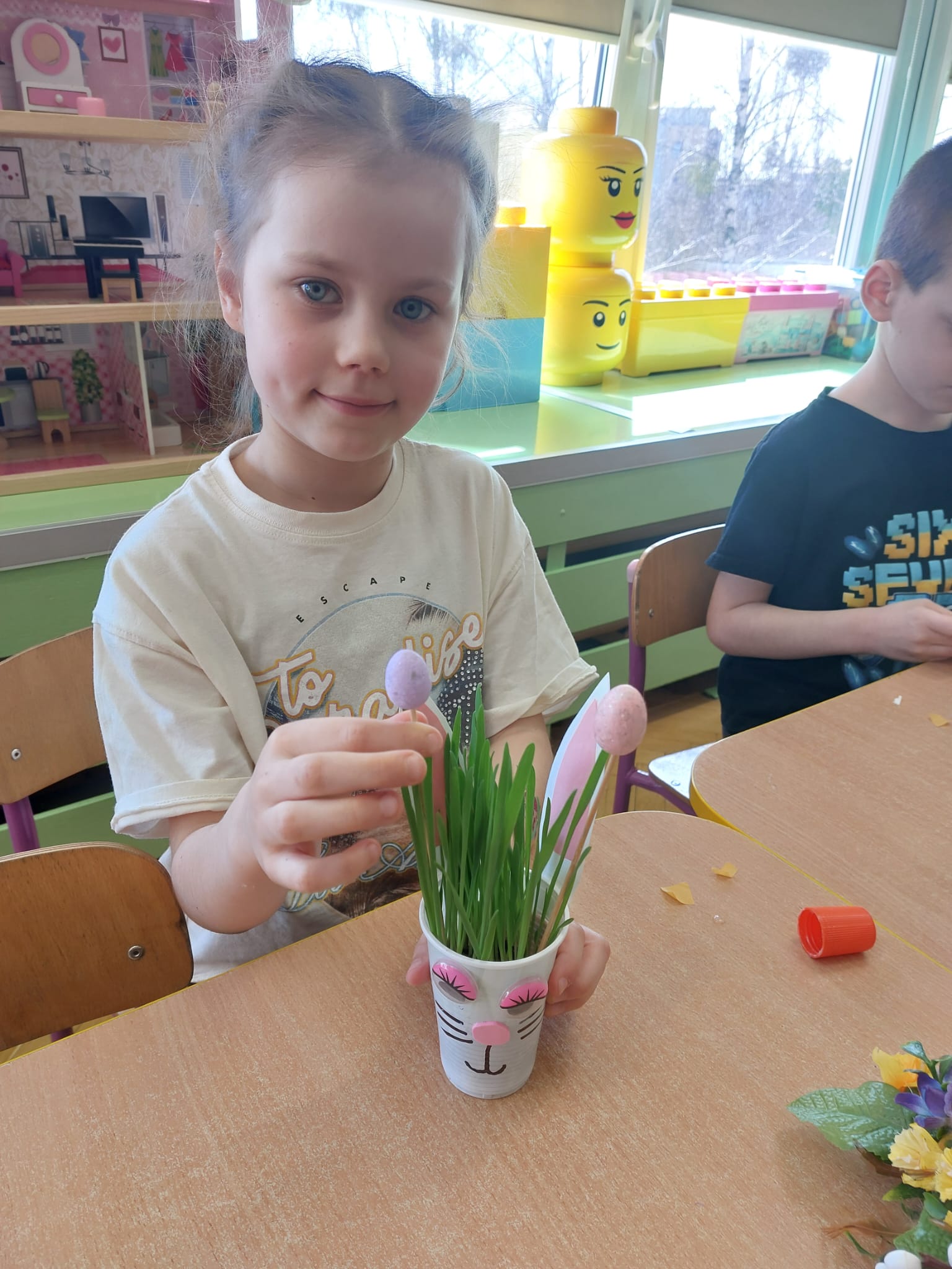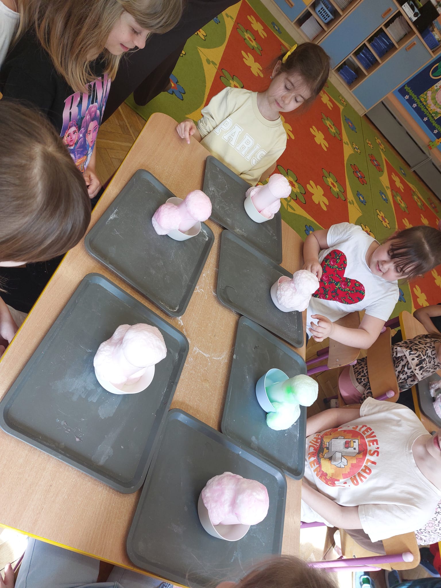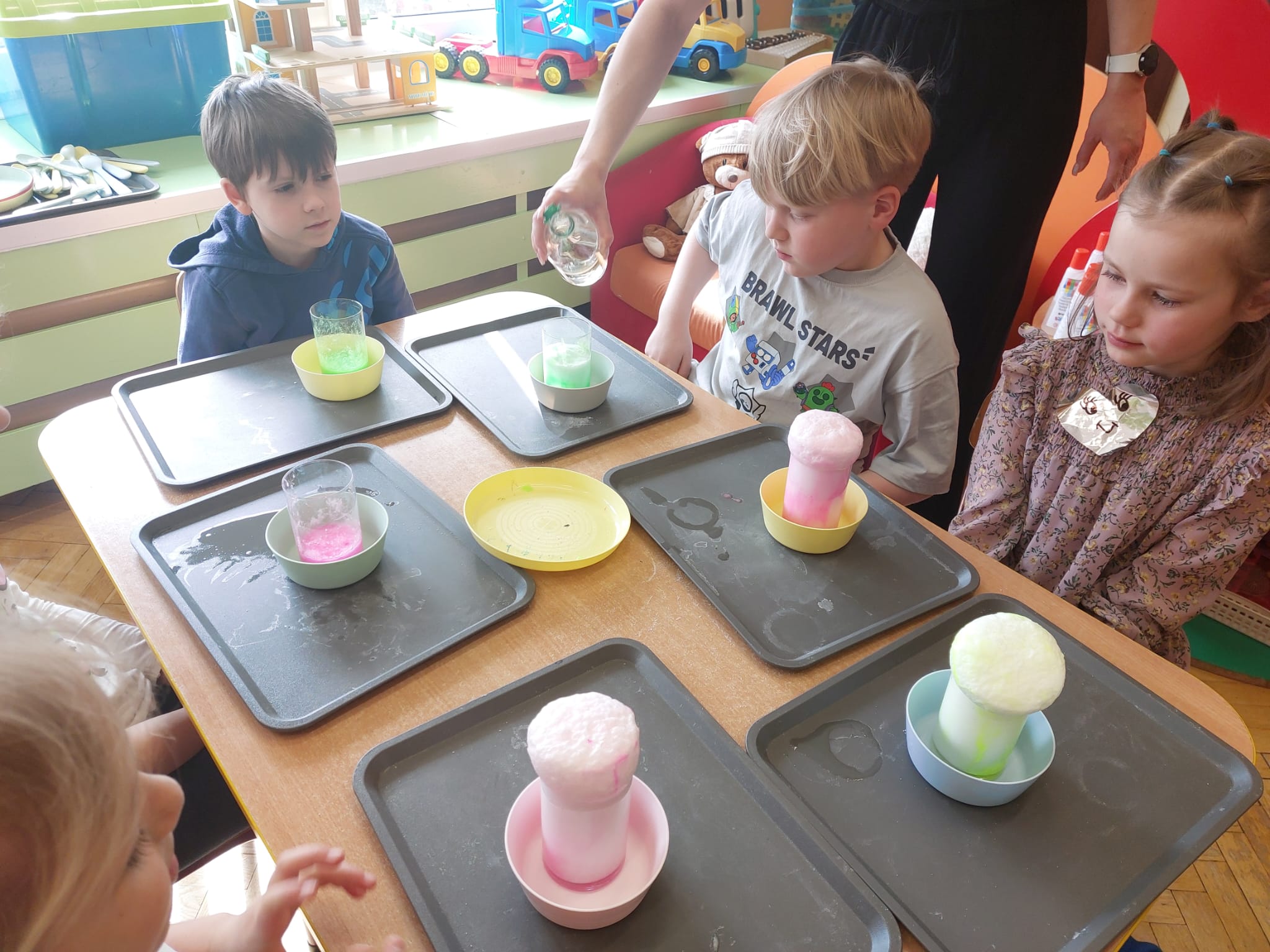 W grupie starszaków zapachniało nauką… i jajkiem!...Podczas warsztatów pt. „Eksperymenty z jajem” mali odkrywcy zamienili się w prawdziwych naukowców. Na pierwszy ogień poszło wielkie wyzwanie: czy jajko da się postawić na stole? Okazało się, że z odrobiną cierpliwości i sprytu – jak najbardziej! Radości było co niemiara, gdy pierwszym śmiałkom się udało. Potem zajrzeliśmy do wnętrza jajka… no, prawie! Zastanawialiśmy się, czy w środku jest powietrze – i szybko odkryliśmy, że tak! Mała komora powietrzna stała się wielką tajemnicą, którą dzieci rozwikłały z błyskiem w oku. Kolejna zagadka: jak odróżnić jajko surowe od ugotowanego? Kręciliśmy, obserwowaliśmy, testowaliśmy – i już każdy wiedział, że jajko potrafi zdradzić swoją tajemnicę… wystarczy je dobrze „rozkręcić”! A potem magia! Zwykła woda zamieniła się w… trampolinę dla jajka! Dzięki soli jajko zaczęło unosić się jak prawdziwy pływak. Dzieci patrzyły z zachwytem, jak nauka potrafi czarować. Na wielki finał – wulkan z białka jajka! Było pianowo, było efektownie i było… trochę śmiesznie. Eksperyment wywołał prawdziwą erupcję śmiechu! I nie mogło zabraknąć najważniejszego pytania: Co było pierwsze – jajko czy kura? Odpowiedzi było tyle, ile dzieci – a każda równie genialna. Bo w końcu w nauce nie chodzi tylko o odpowiedzi, ale o ciekawość, odwagę i radość odkrywania. To był dzień pełen eksperymentów, zdziwień i małych wielkich odkryć. A jedno wiemy na pewno – jajko to nie tylko śniadanie… to prawdziwa kopalnia naukowych przygód!. Po naukowych warsztatach dzieci zabrały się za dekorowanie „wielkanocnego zajączka” z wysianego wcześniej owsa do którego włożyły czekoladowe kolorowe jajeczka… WESOŁYCH ŚWIĄT !!!