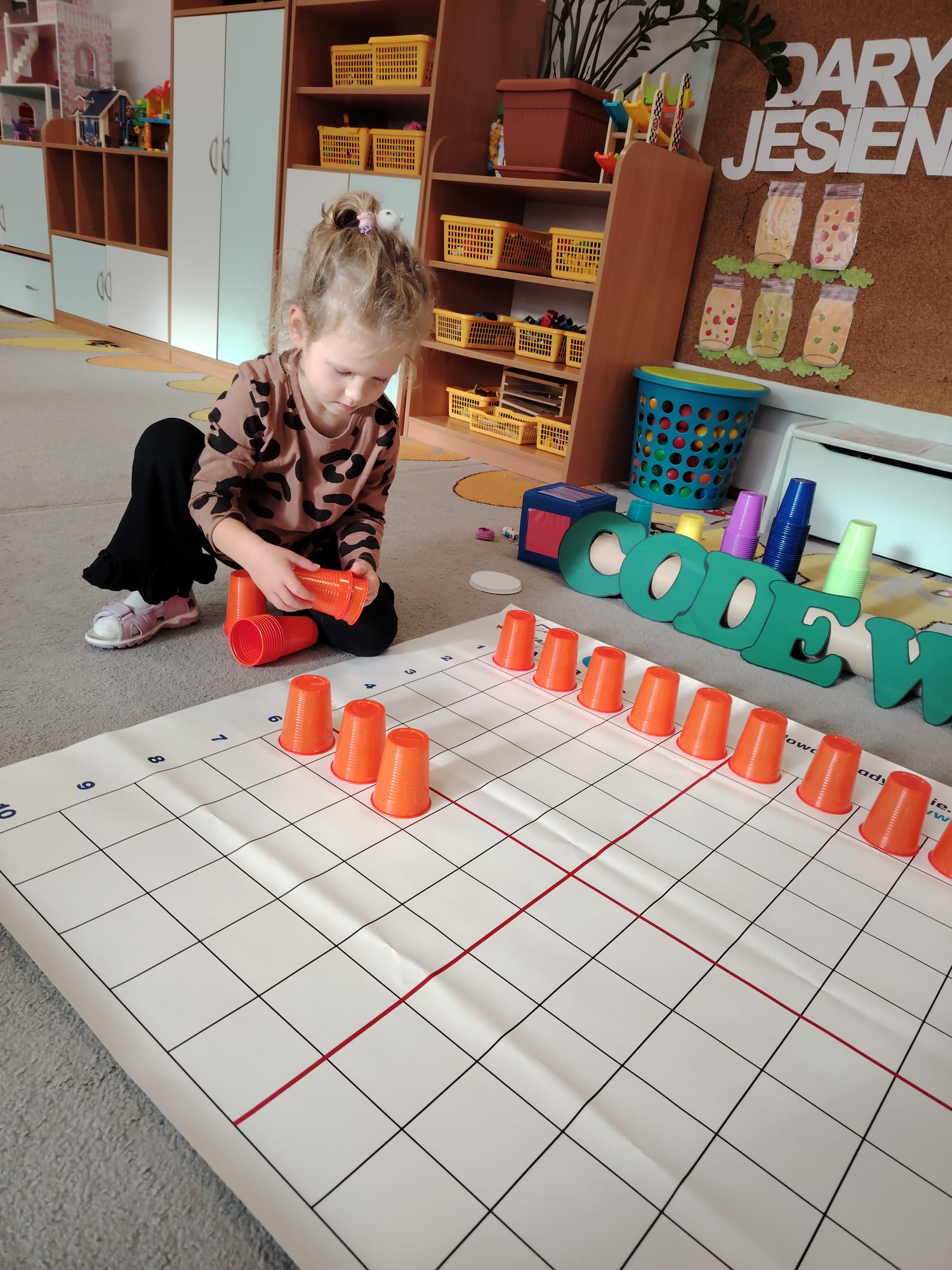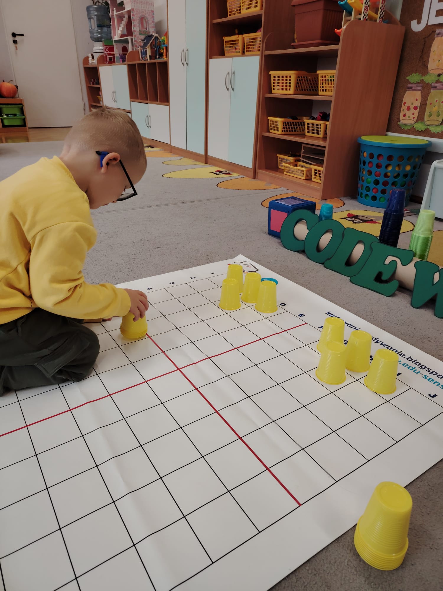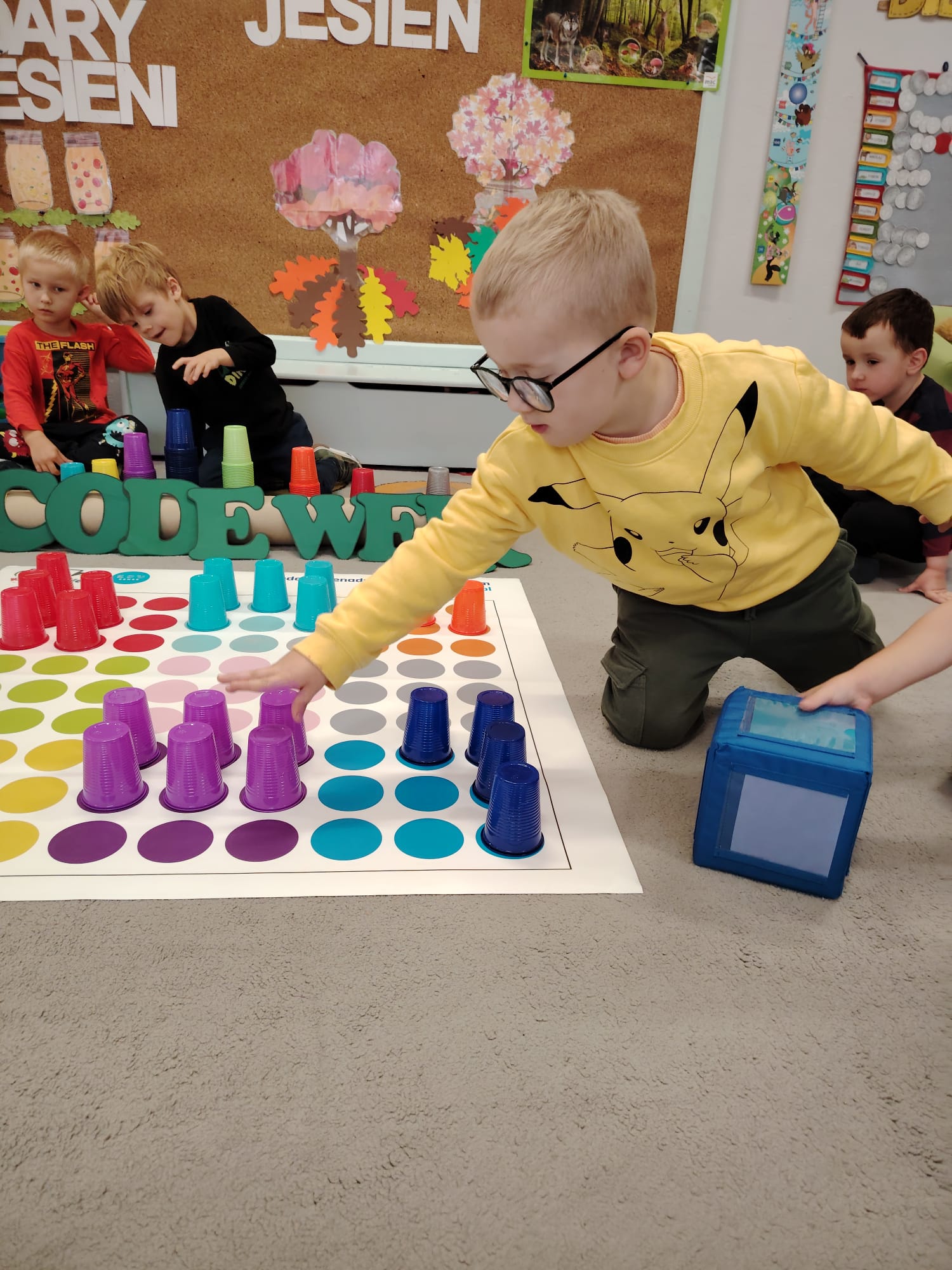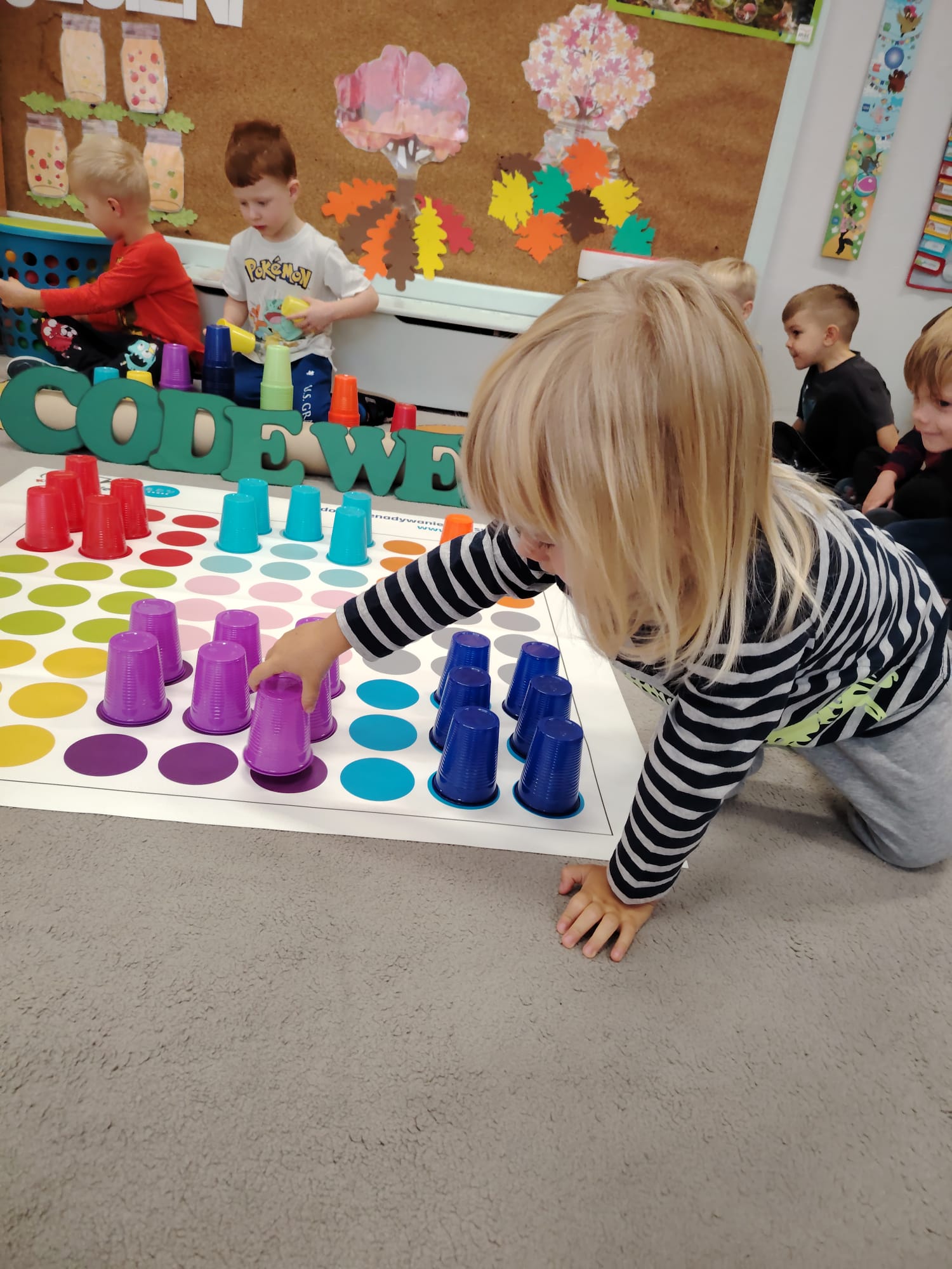 W ramach ogólnoeuropejskiej inicjatywy CodeWeek nasze przedszkolaki z grupy II wzięły udział w wyjątkowych zajęciach wprowadzających w świat kodowania i logicznego myślenia! Patrząc w kalendarz, w grupie II minął już rok pracy z kolorowymi kubeczkami oraz matą edukacyjną. Są to wspaniałe pomoce do opanowania umiejętności układania rytmów, segregowania kolorów, porównywania liczebności zbiorów, doskonalenia logicznego myślenia, ćwiczenia spostrzegawczości wzrokowej. To ekscytująca, wielka przygoda, która w przyszłości ułatwi dzieciom naukę matematyki. Dziś z racji aktualnie trwającego Tygodnia Kodowania mieliśmy nieograniczone możliwości, by dać upust swojej wyobraźni. Pierwszym etapem zabaw z kodowaniem było układanie kubków na macie, zgodnie z podanymi warunkami; odwzorowywanie układów - kodów kubeczkowych, układanie ich pod dyktando- określanie położenia przedmiotów. Następnie tworzyliśmy zakodowane wieże i piramidy. Odkodowaliśmy również jesienne drzewo na tablicy interaktywnej i poszło nam całkiem nieźle. Zajęcia były pełne śmiechu, ruchu i ciekawych wyzwań – a dzieci już nie mogą się doczekać kolejnych przygód z kodowaniem! Do galerii zapraszają przedszkolaki z Białego konika!