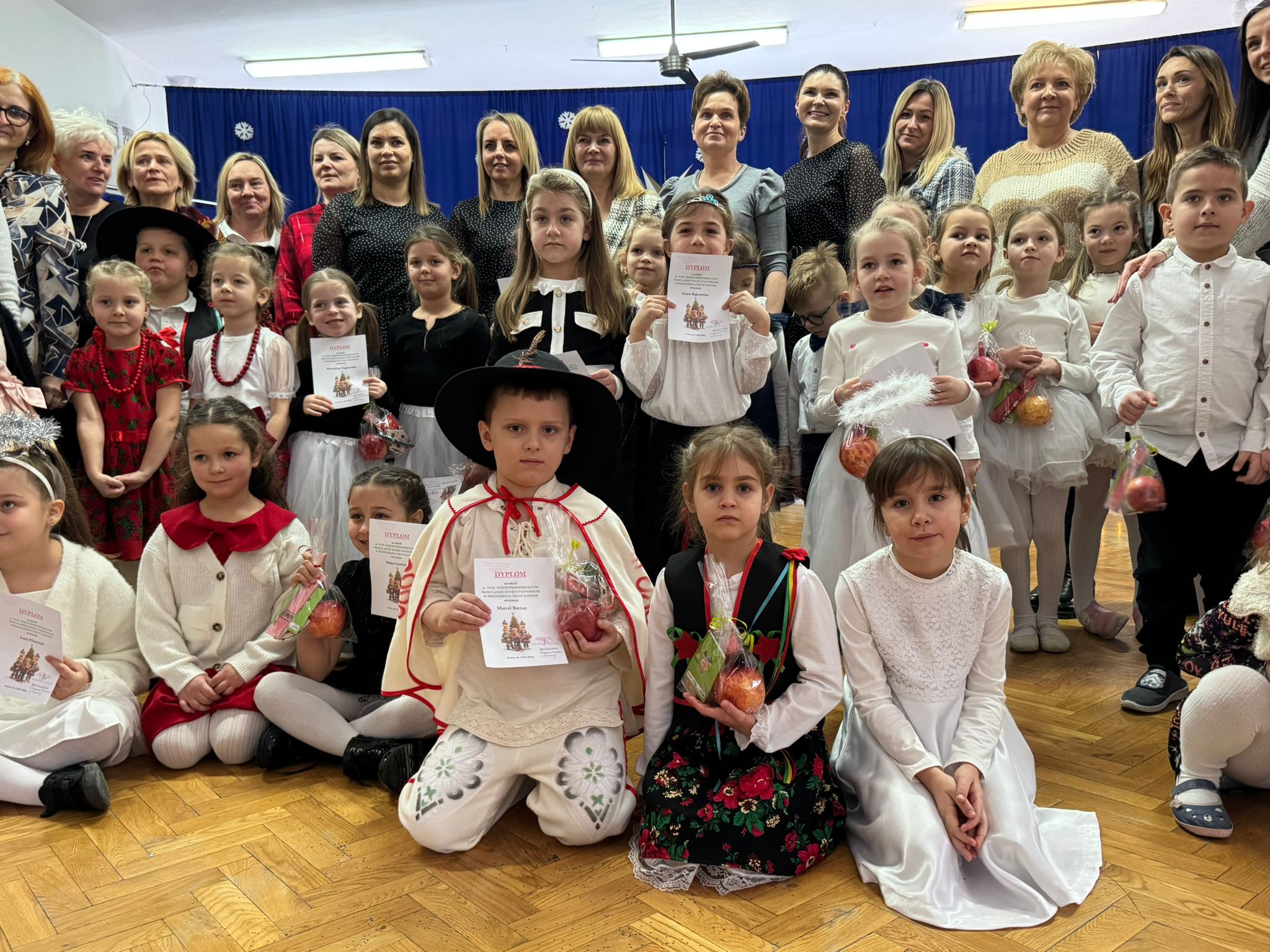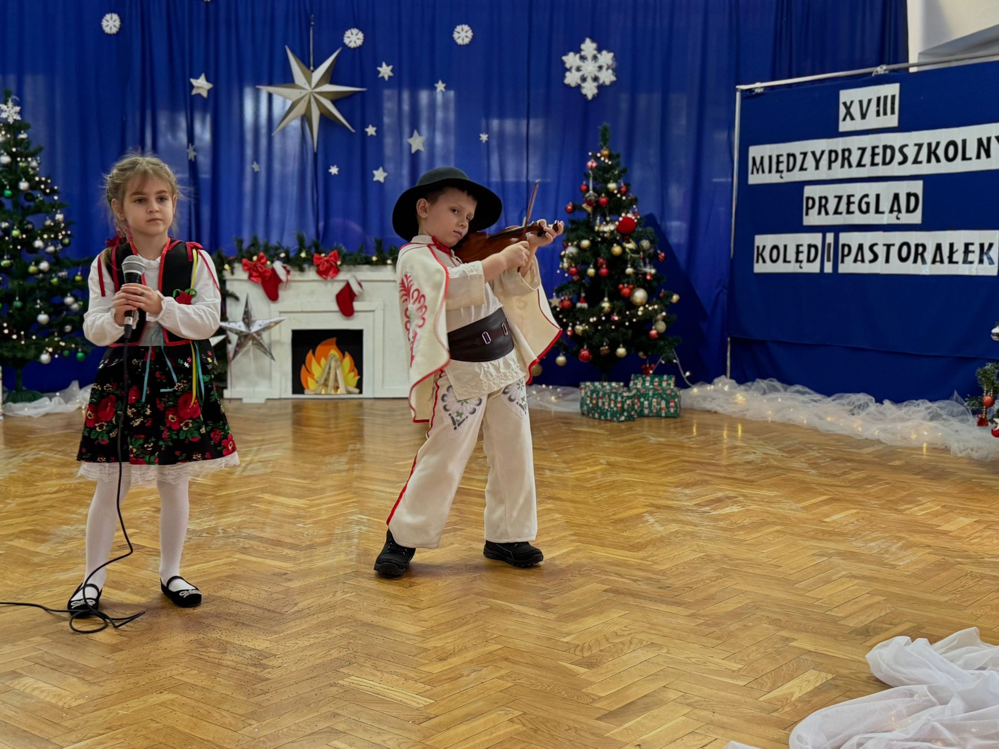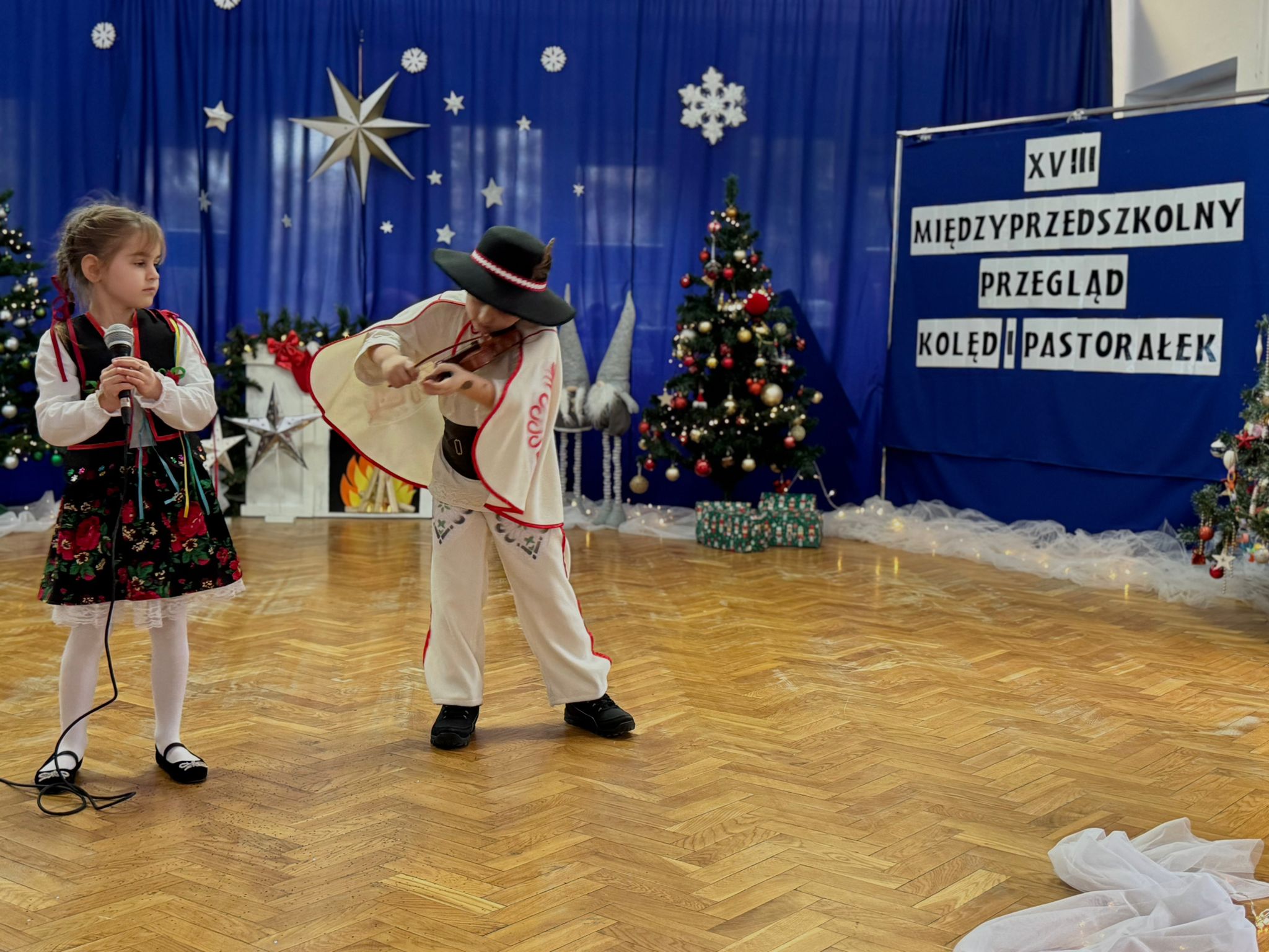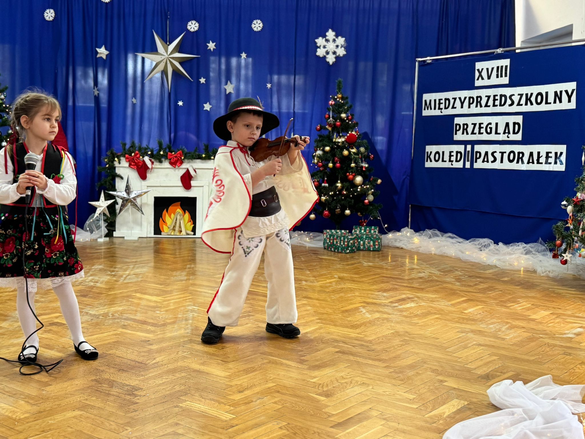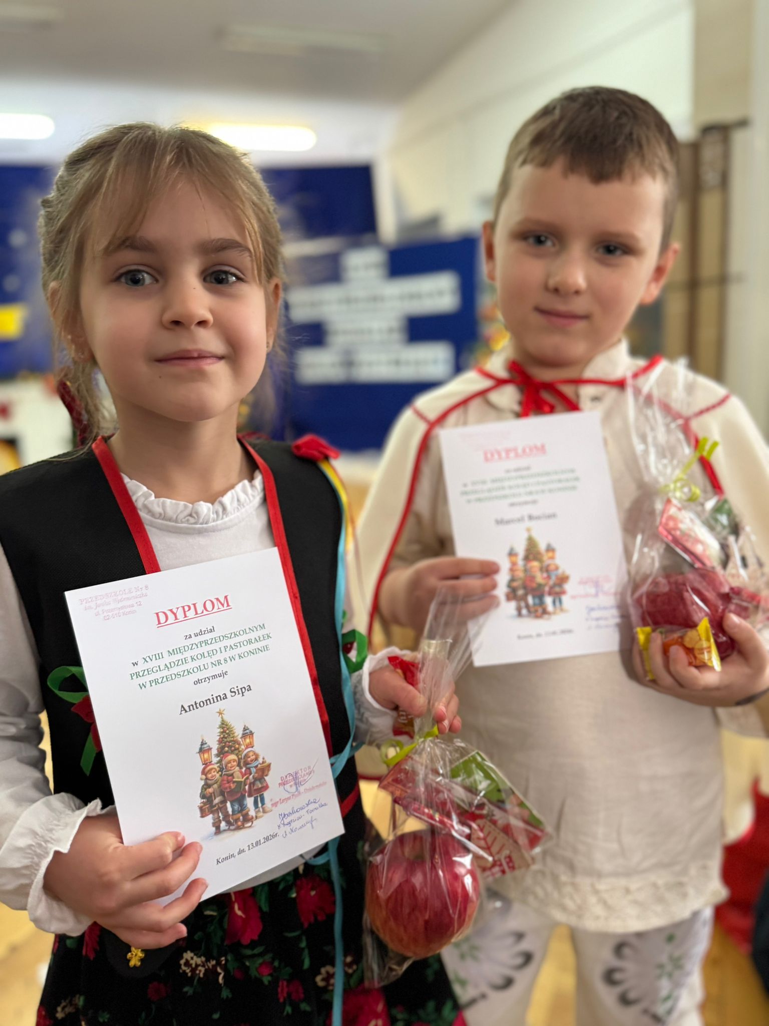 W dniu dzisiejszym dzieci z grupy IV wzięły udział w XVIII Międzyprzedszkolnym Przeglądzie Kolęd i Pastorałek, który odbył się w Przedszkolu nr 8 w Koninie. Celem przeglądu była m.in. prezentacja umiejętności wokalnych dzieci w wieku przedszkolnym, promowanie aktywności twórczej wśród dzieci, promocja nowych talentów, podtrzymanie w młodym pokoleniu tradycji śpiewania kolęd i pastorałek, poszerzenie wiedzy na temat tradycji bożonarodzeniowych, popularyzacja śpiewu wśród dzieci jako jednej z przyjemniejszych form spędzania wolnego czasu. Podczas przeglądu Antosia S. zachwyciła publiczność kolędą „Tylko jedna jest taka noc”, a Marcelek B. „grą” na skrzypcach niczym prawdziwy wirtuoz. Dzieci wystąpiły w pięknych strojach góralskich, co dodatkowo podkreśliło wyjątkowy charakter występu. Wykonanie naszych przedszkolaków spotkało się z ogromnym uznaniem i aplauzem. Dzieci nie tylko zaprezentowały swoje umiejętności, ale również wniosły do wspólnego świętowania prawdziwy, świąteczny klimat.