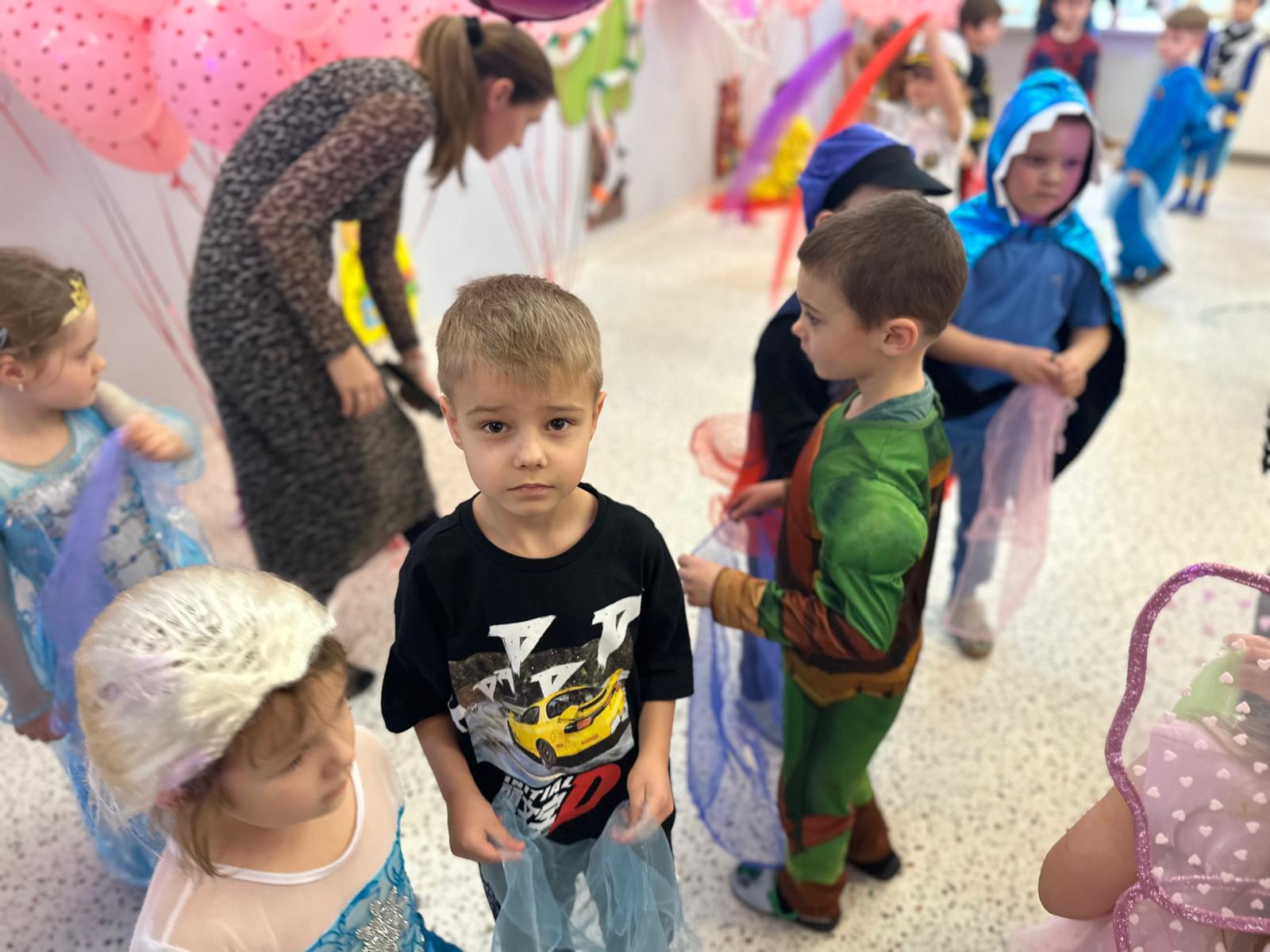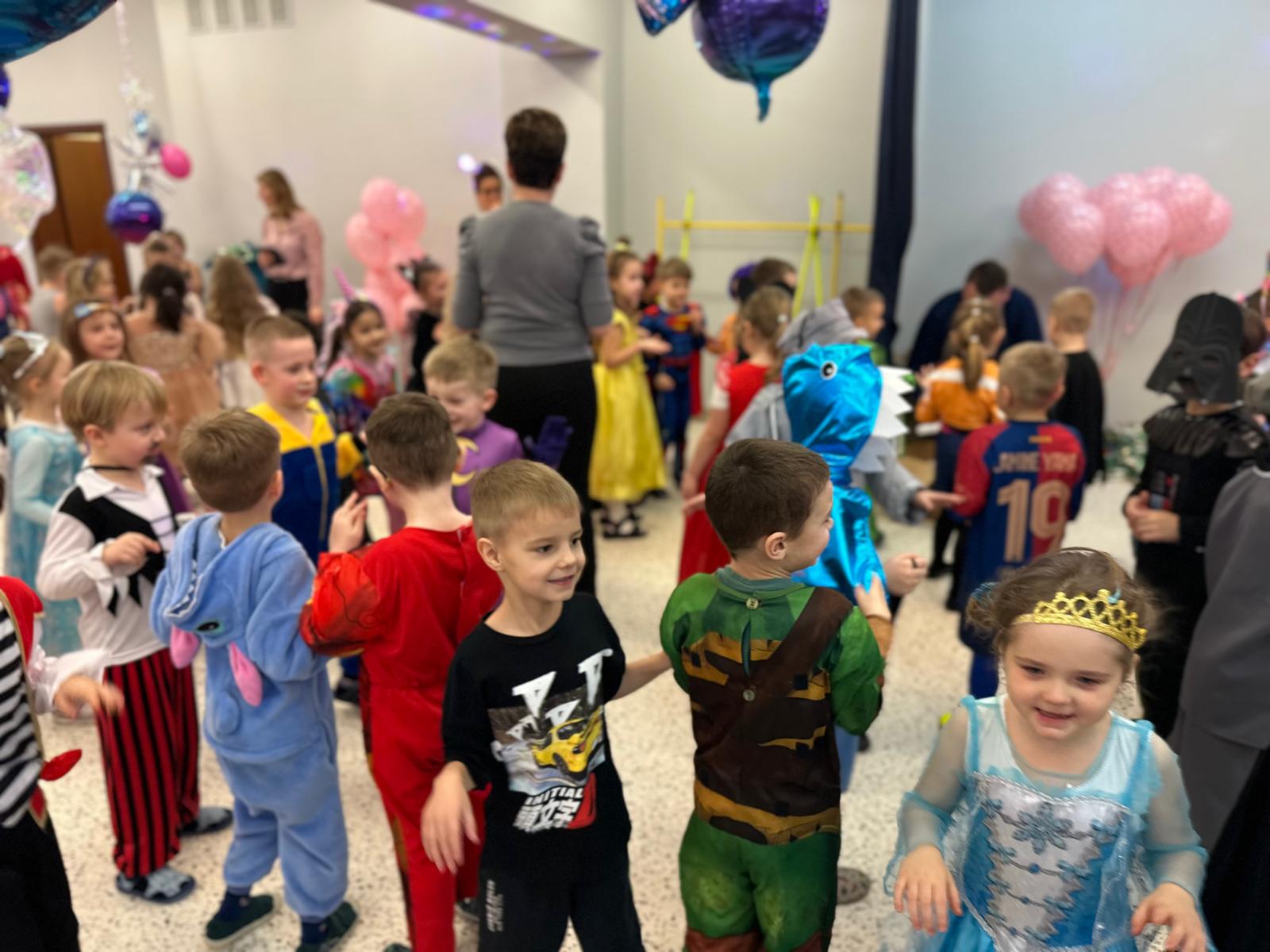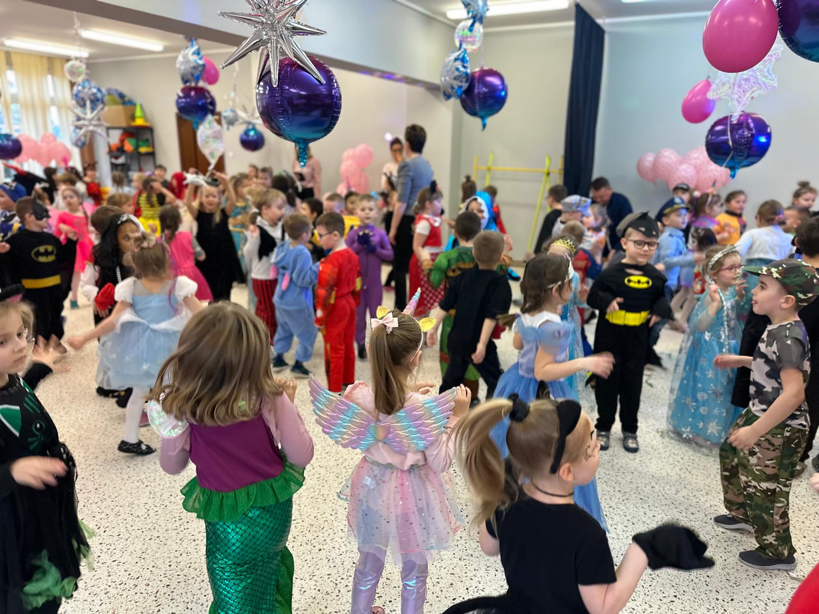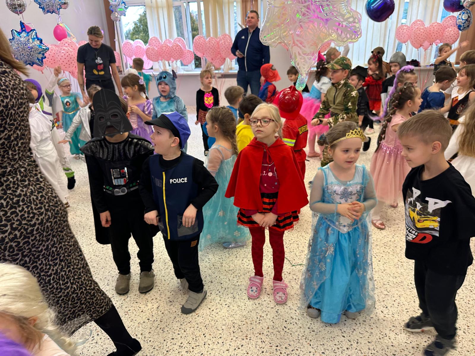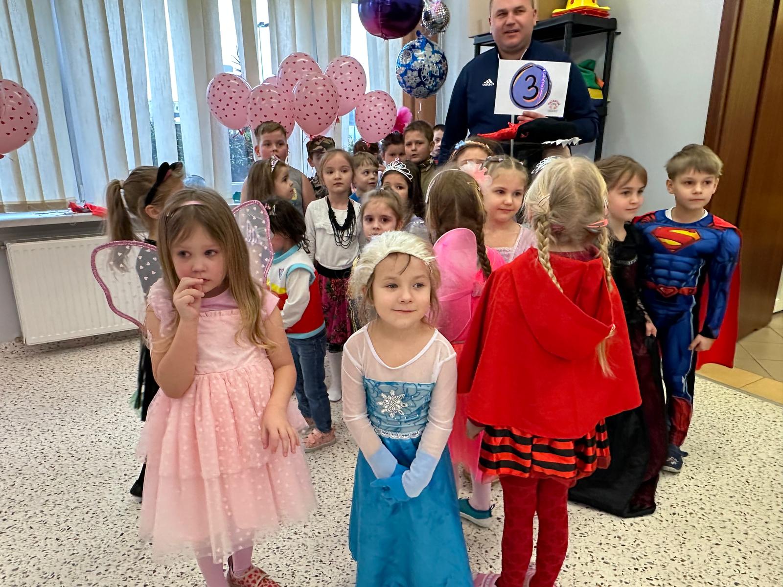 Tego dnia przedszkolna sala gimnastyczna zamieniła się w barwną, pełną karnawałowych dekoracji przestrzeń. Dzieci przyszły w przepięknych, pomysłowych strojach – można było spotkać księżniczki, policjantów, superbohaterów, zwierzątka oraz wiele bajkowych postaci. Wspólne tańce przy muzyce, zabawy integracyjne oraz konkursy sprawiły, że atmosfera była niezwykle radosna i pełna energii.