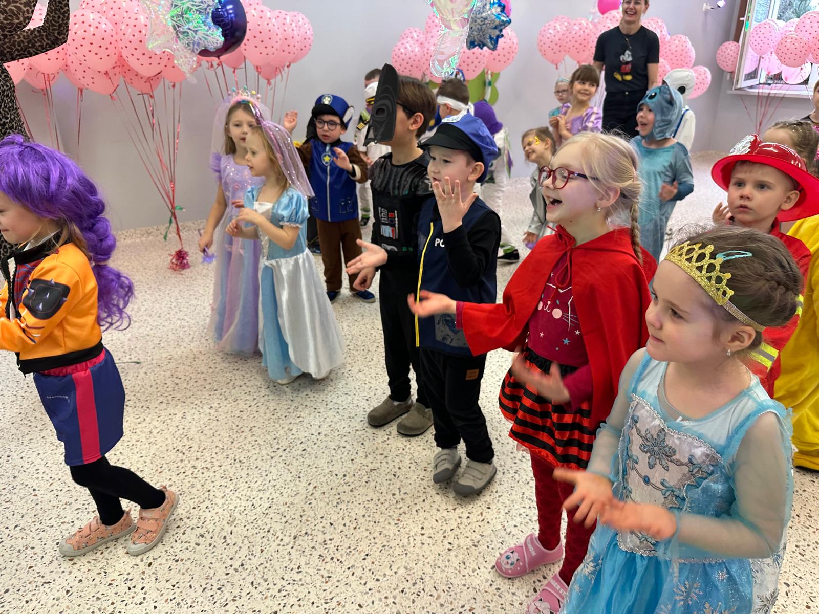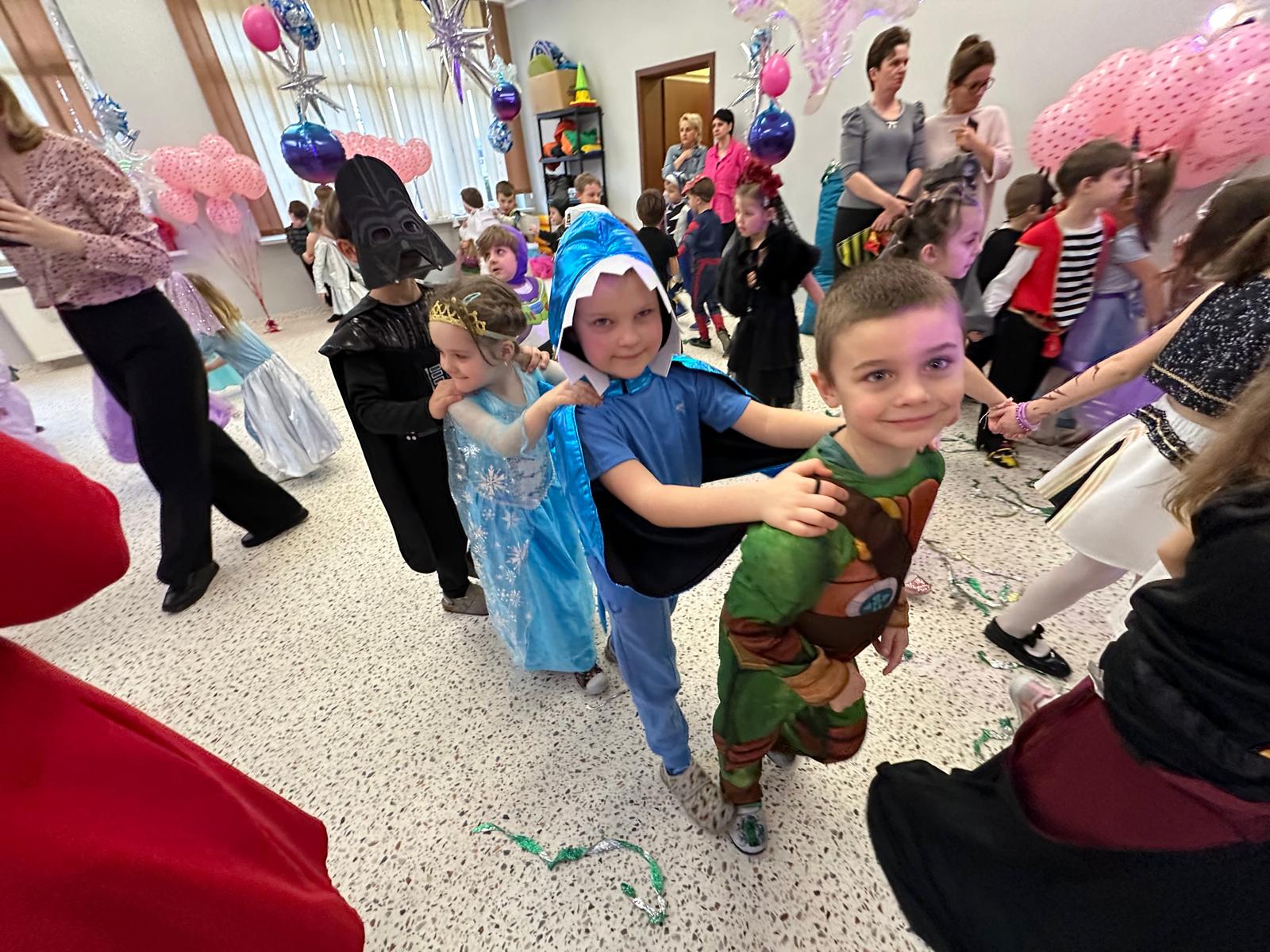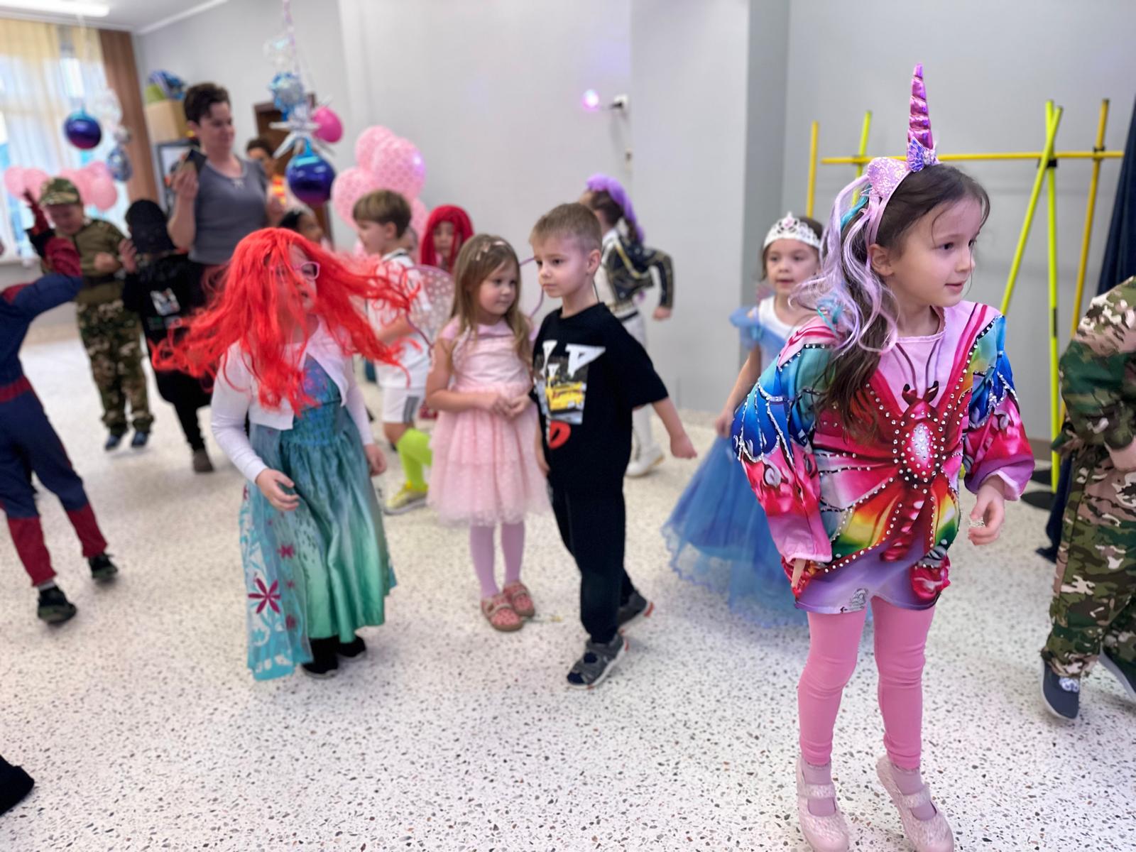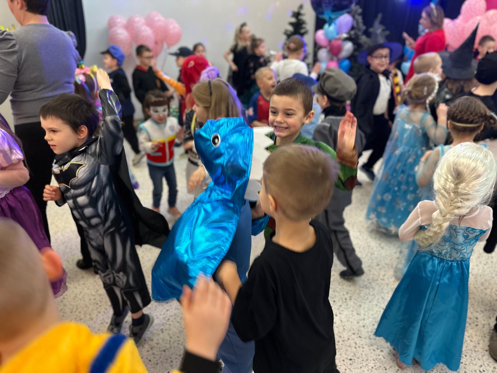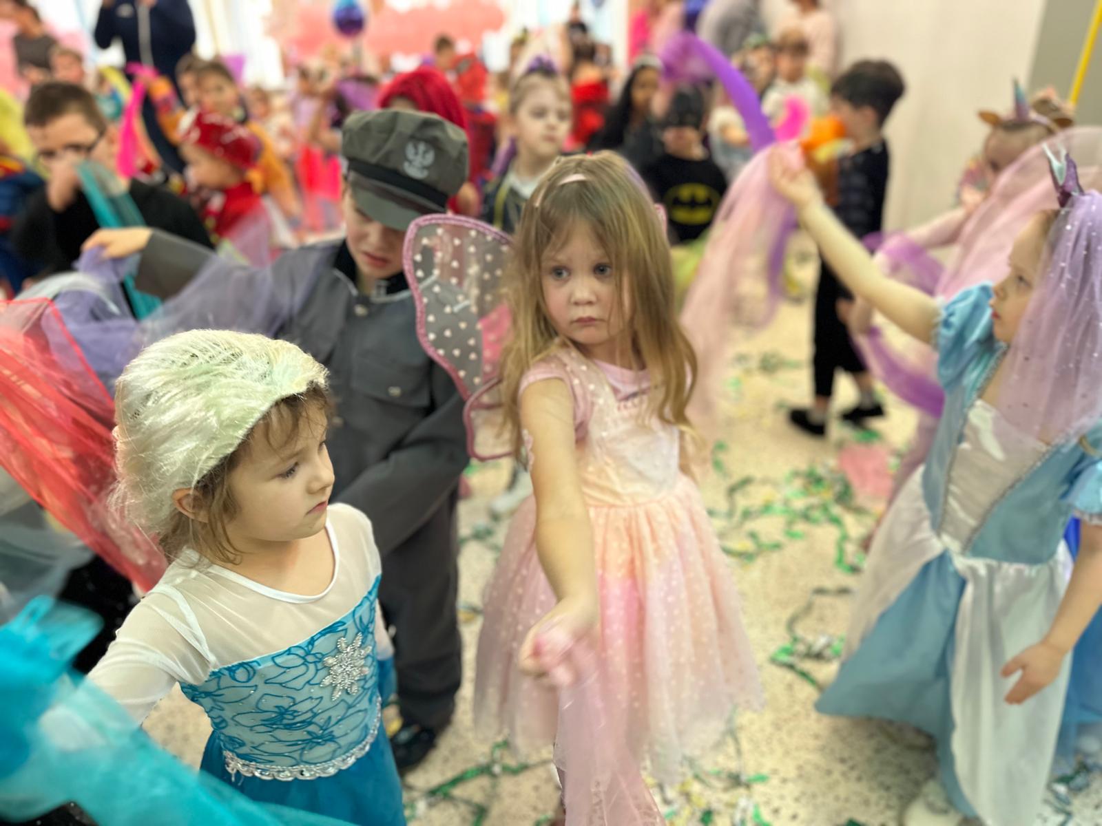 Tego dnia przedszkolna sala gimnastyczna zamieniła się w barwną, pełną karnawałowych dekoracji przestrzeń. Dzieci przyszły w przepięknych, pomysłowych strojach – można było spotkać księżniczki, policjantów, superbohaterów, zwierzątka oraz wiele bajkowych postaci. Wspólne tańce przy muzyce, zabawy integracyjne oraz konkursy sprawiły, że atmosfera była niezwykle radosna i pełna energii.