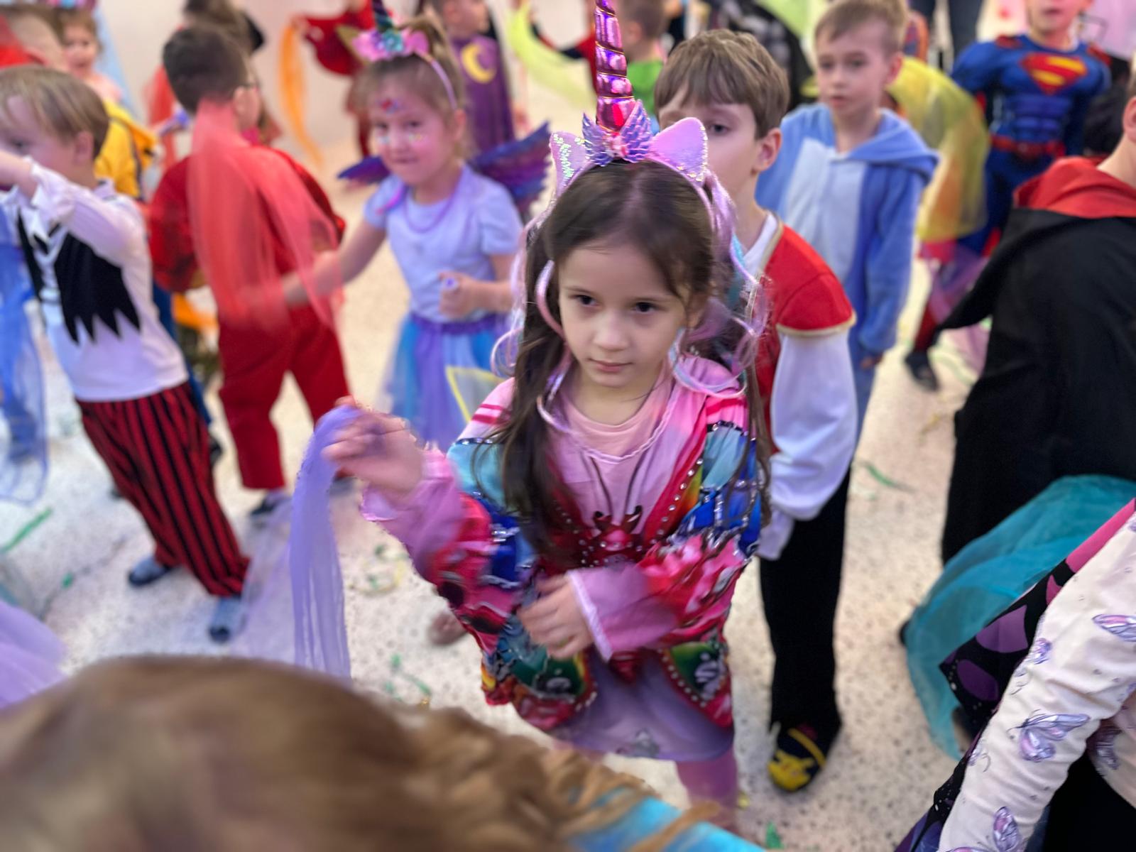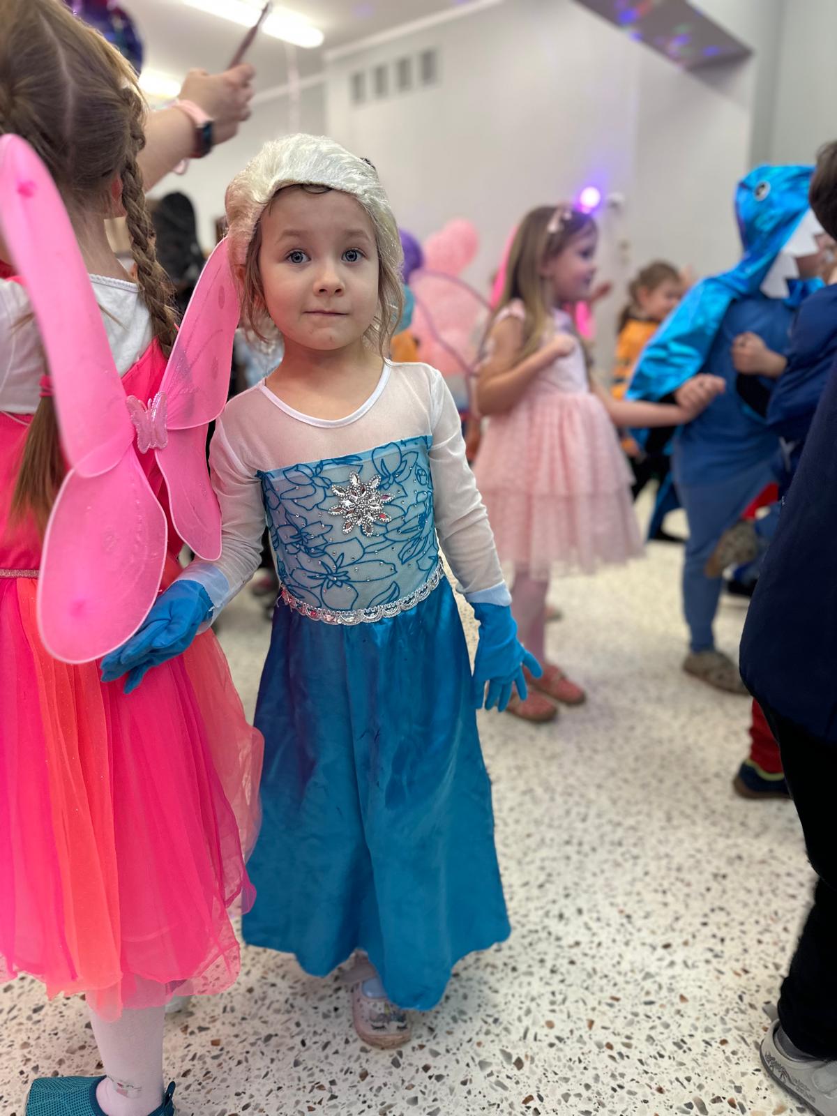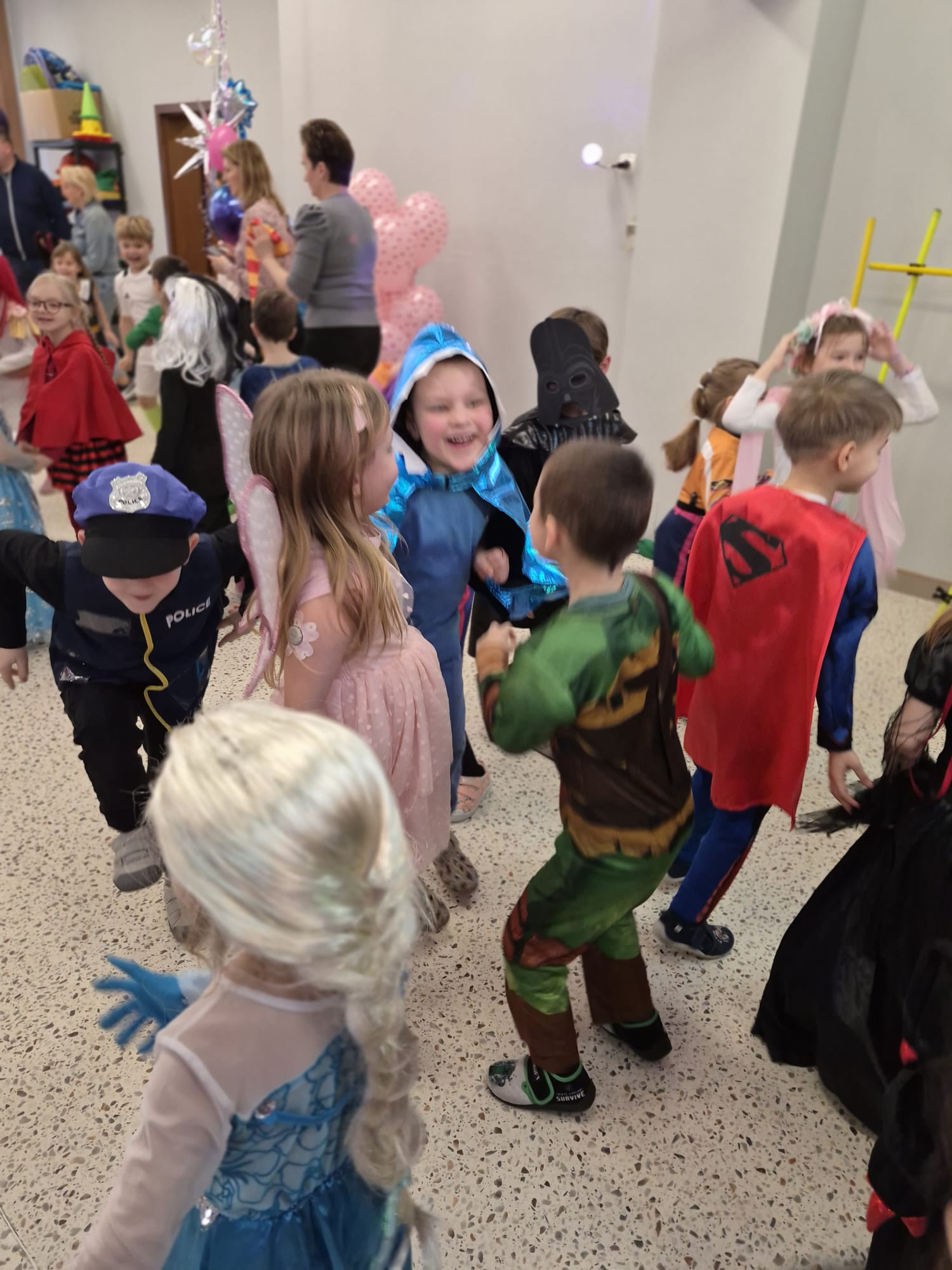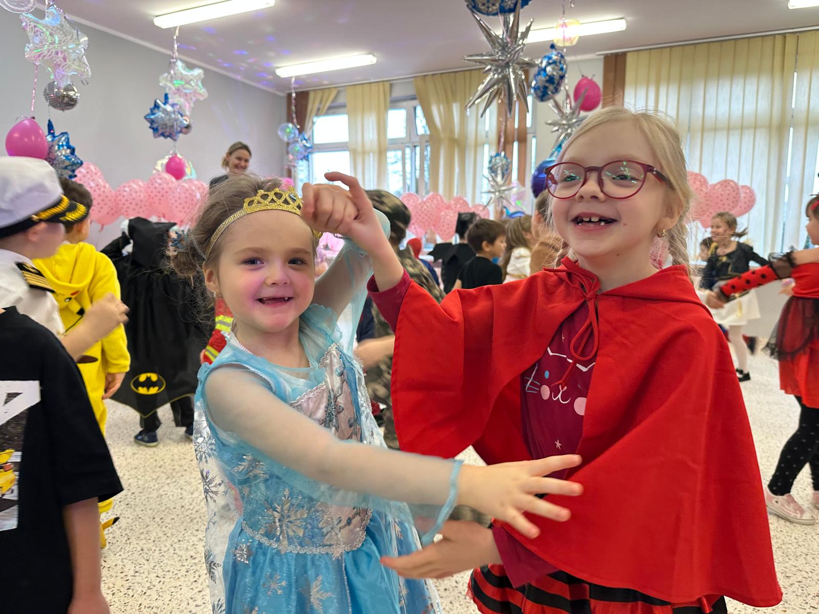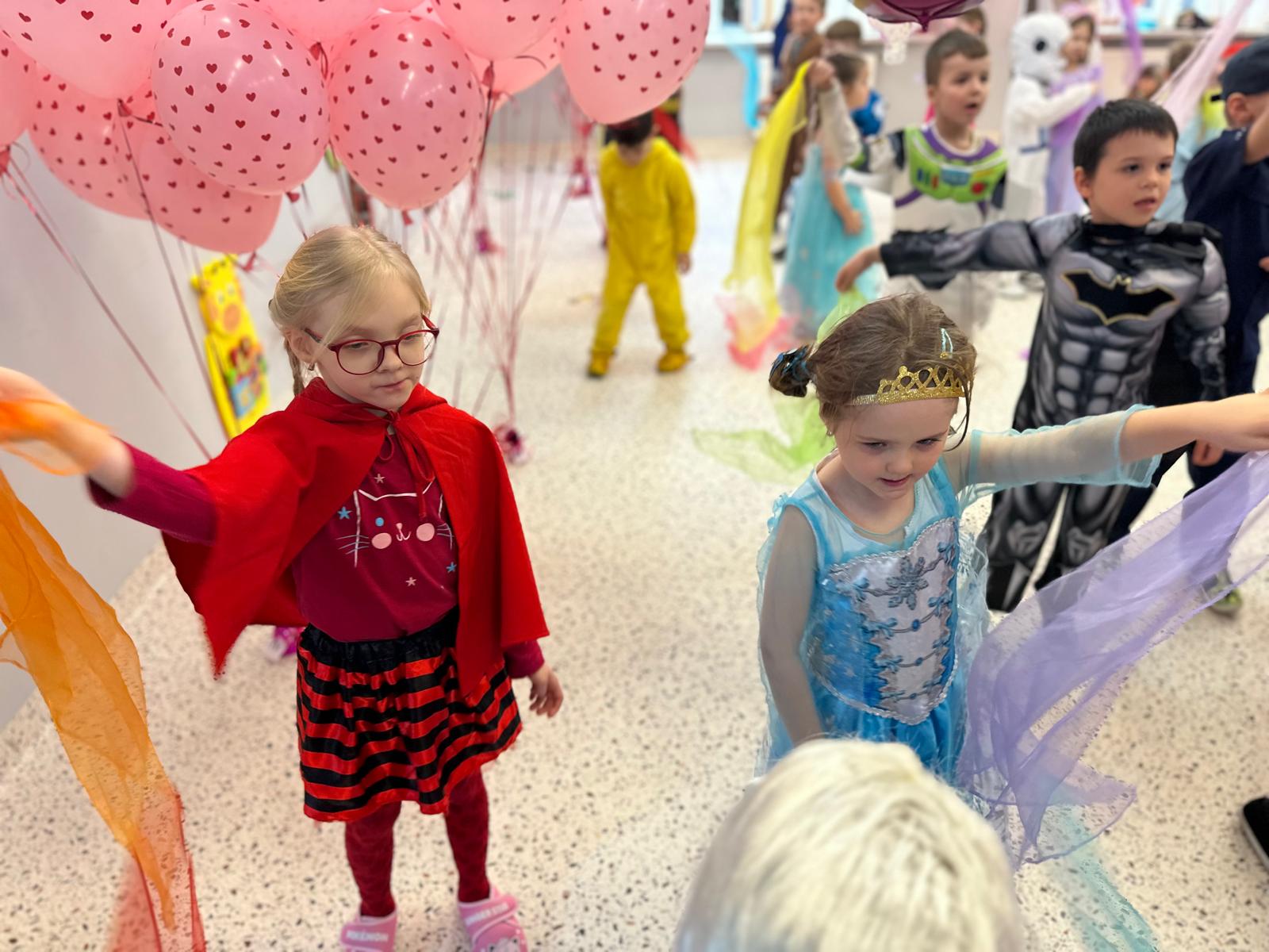 Tego dnia przedszkolna sala gimnastyczna zamieniła się w barwną, pełną karnawałowych dekoracji przestrzeń. Dzieci przyszły w przepięknych, pomysłowych strojach – można było spotkać księżniczki, policjantów, superbohaterów, zwierzątka oraz wiele bajkowych postaci. Wspólne tańce przy muzyce, zabawy integracyjne oraz konkursy sprawiły, że atmosfera była niezwykle radosna i pełna energii.