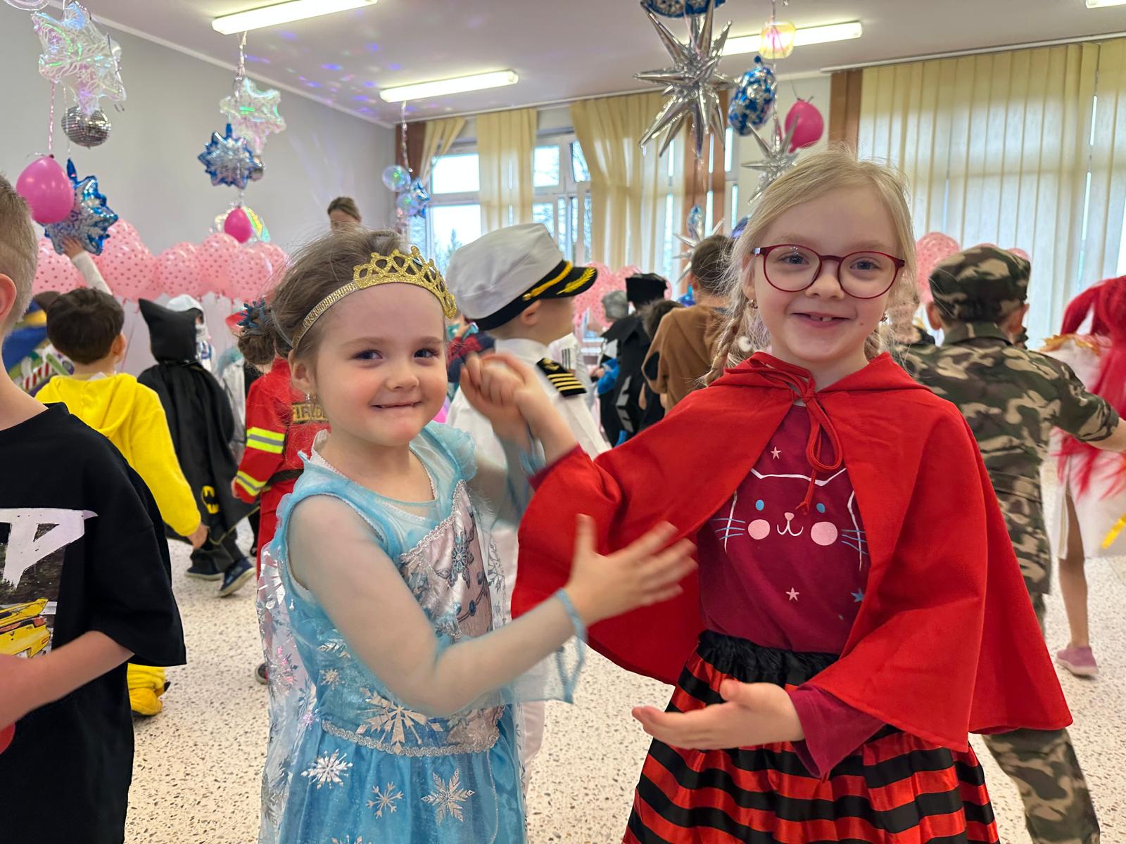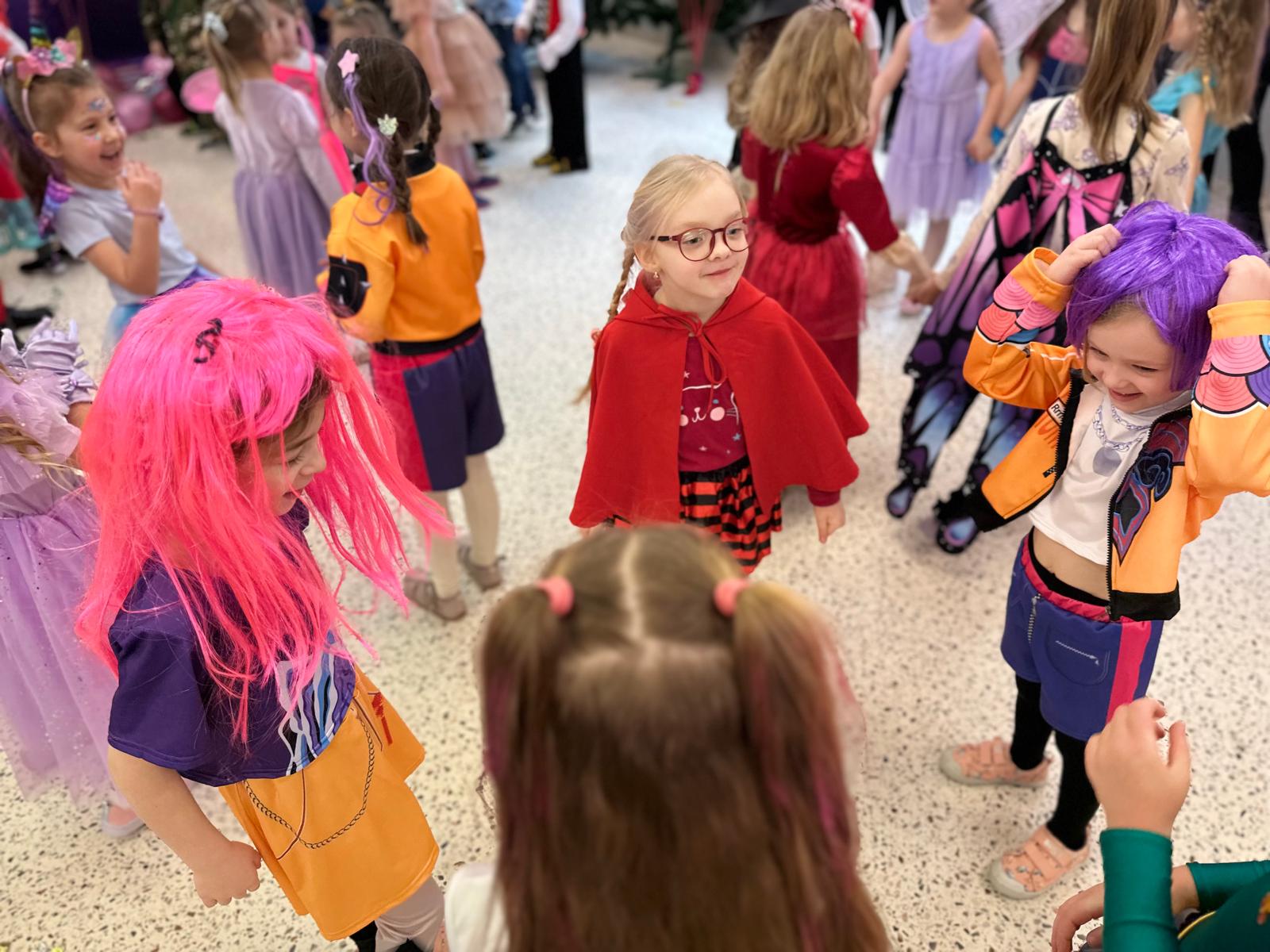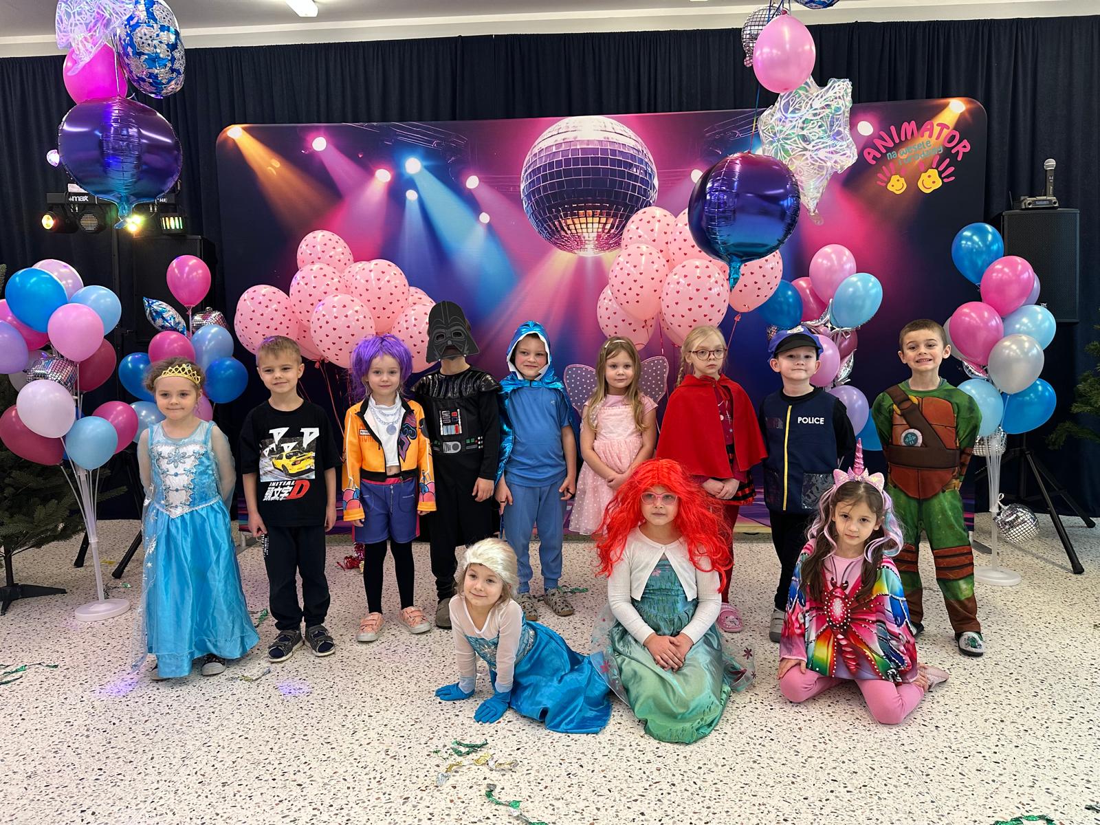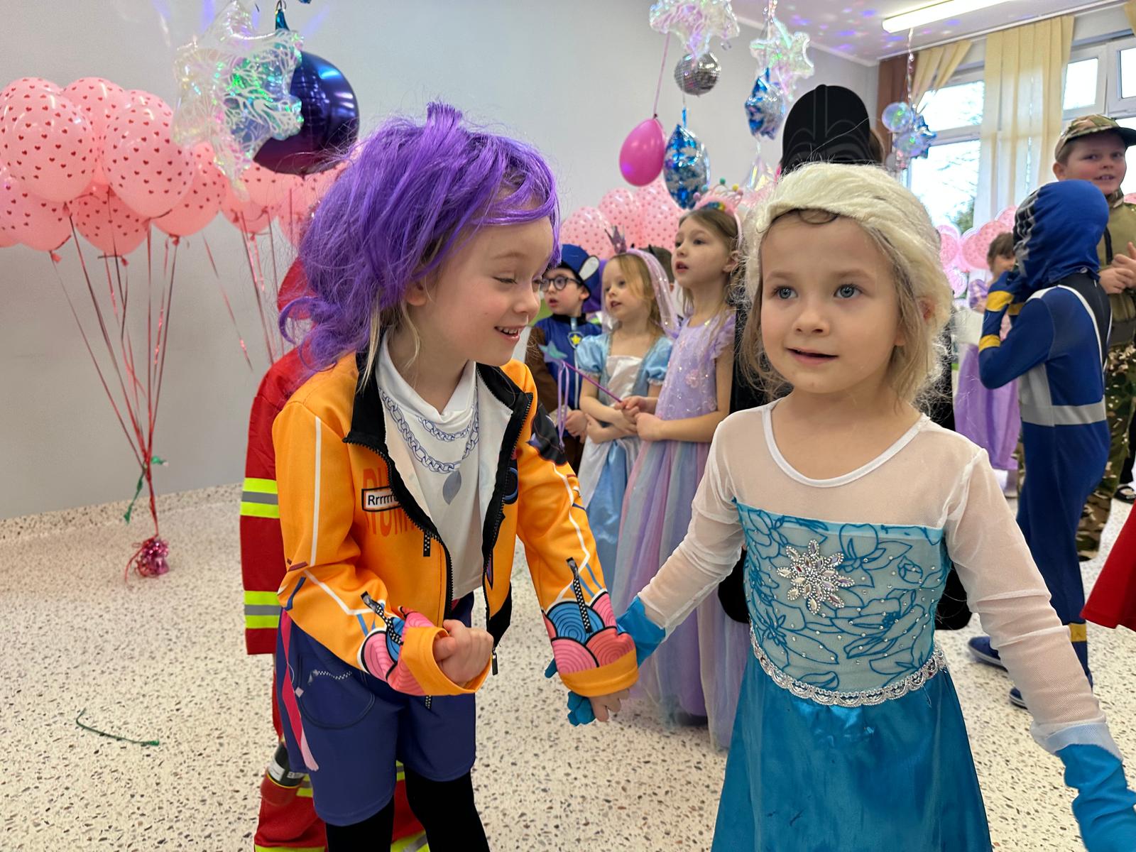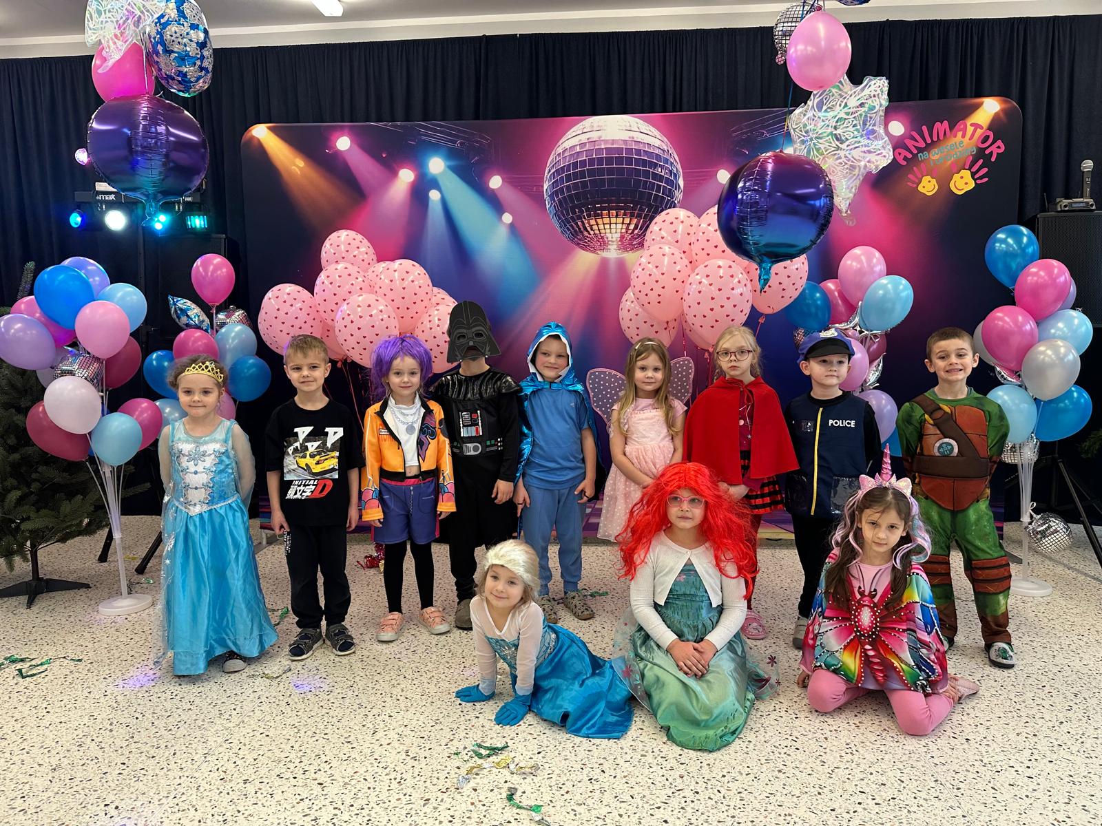 Tego dnia przedszkolna sala gimnastyczna zamieniła się w barwną, pełną karnawałowych dekoracji przestrzeń. Dzieci przyszły w przepięknych, pomysłowych strojach – można było spotkać księżniczki, policjantów, superbohaterów, zwierzątka oraz wiele bajkowych postaci. Wspólne tańce przy muzyce, zabawy integracyjne oraz konkursy sprawiły, że atmosfera była niezwykle radosna i pełna energii.