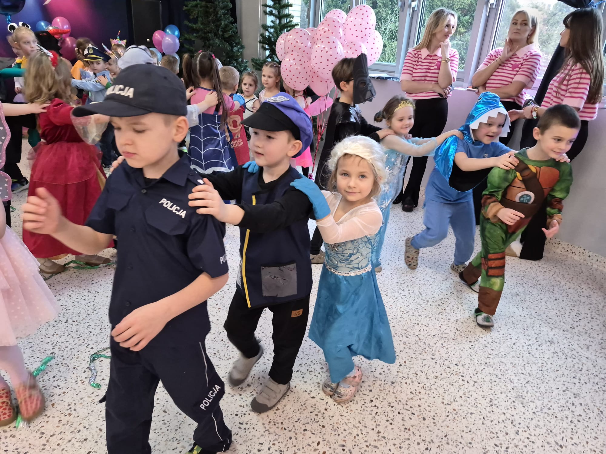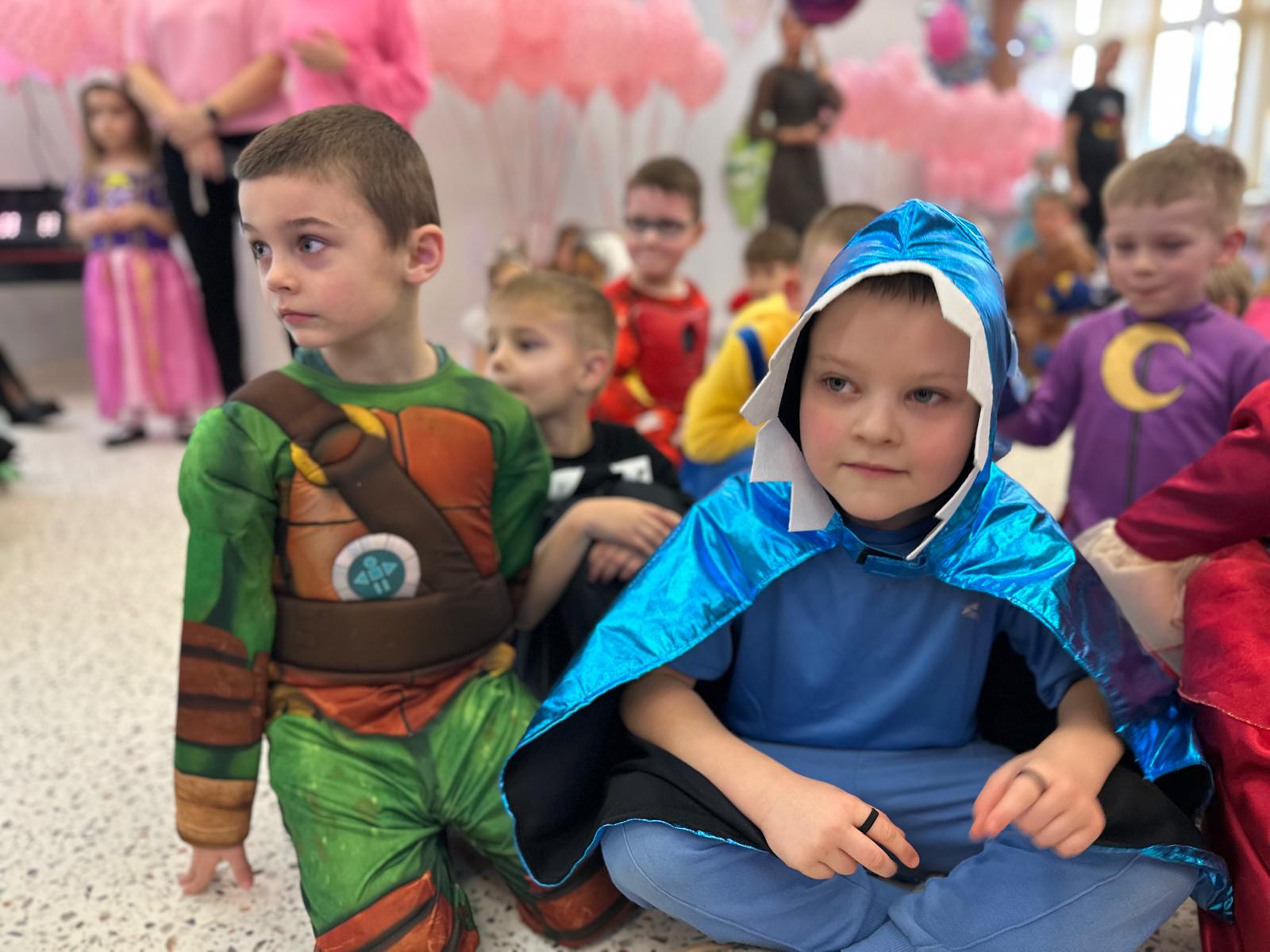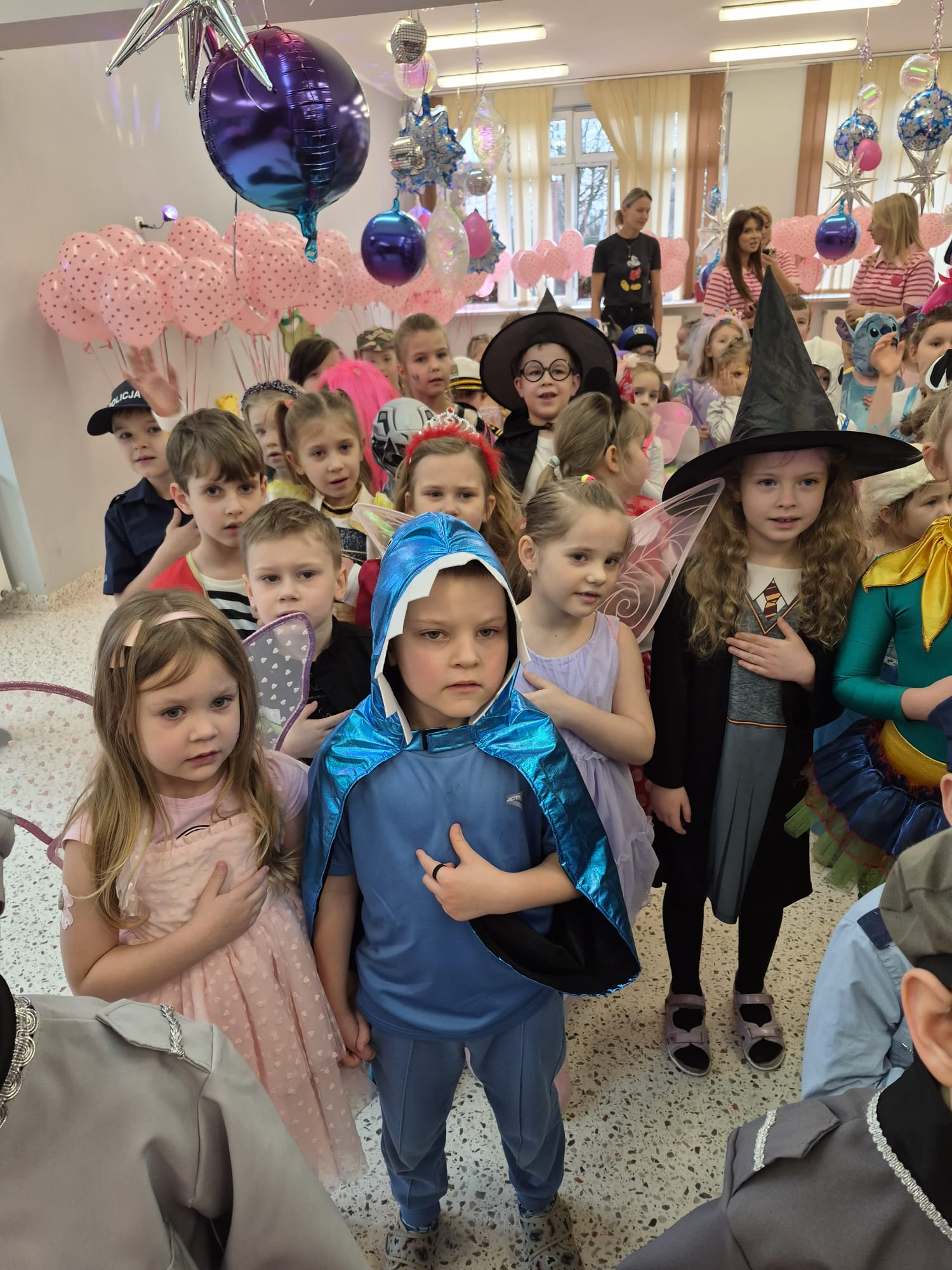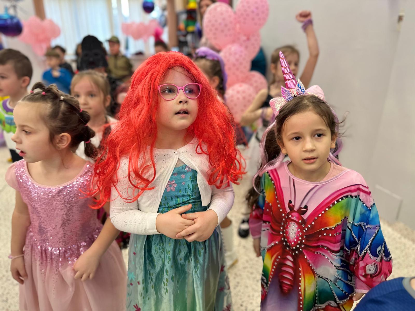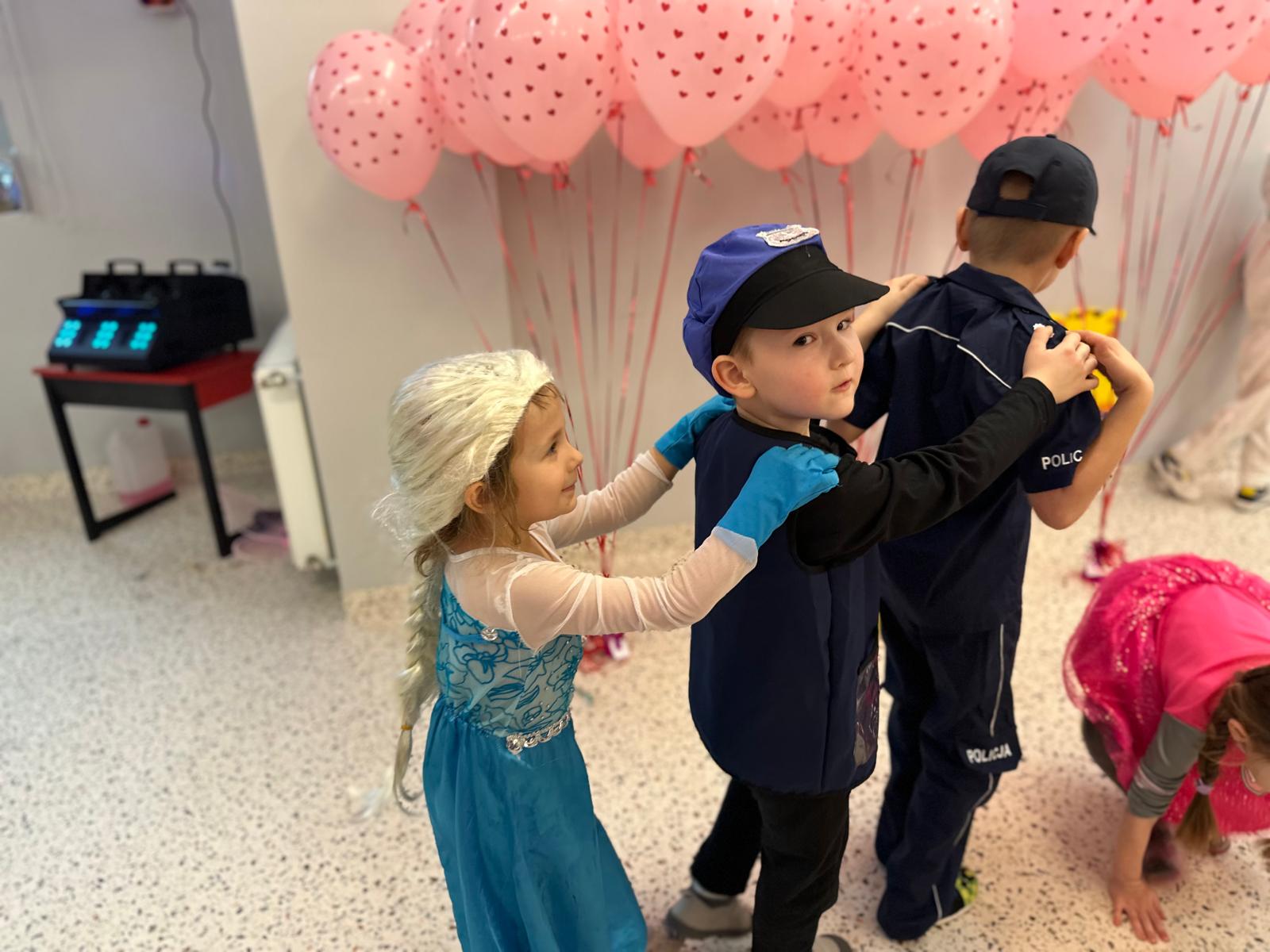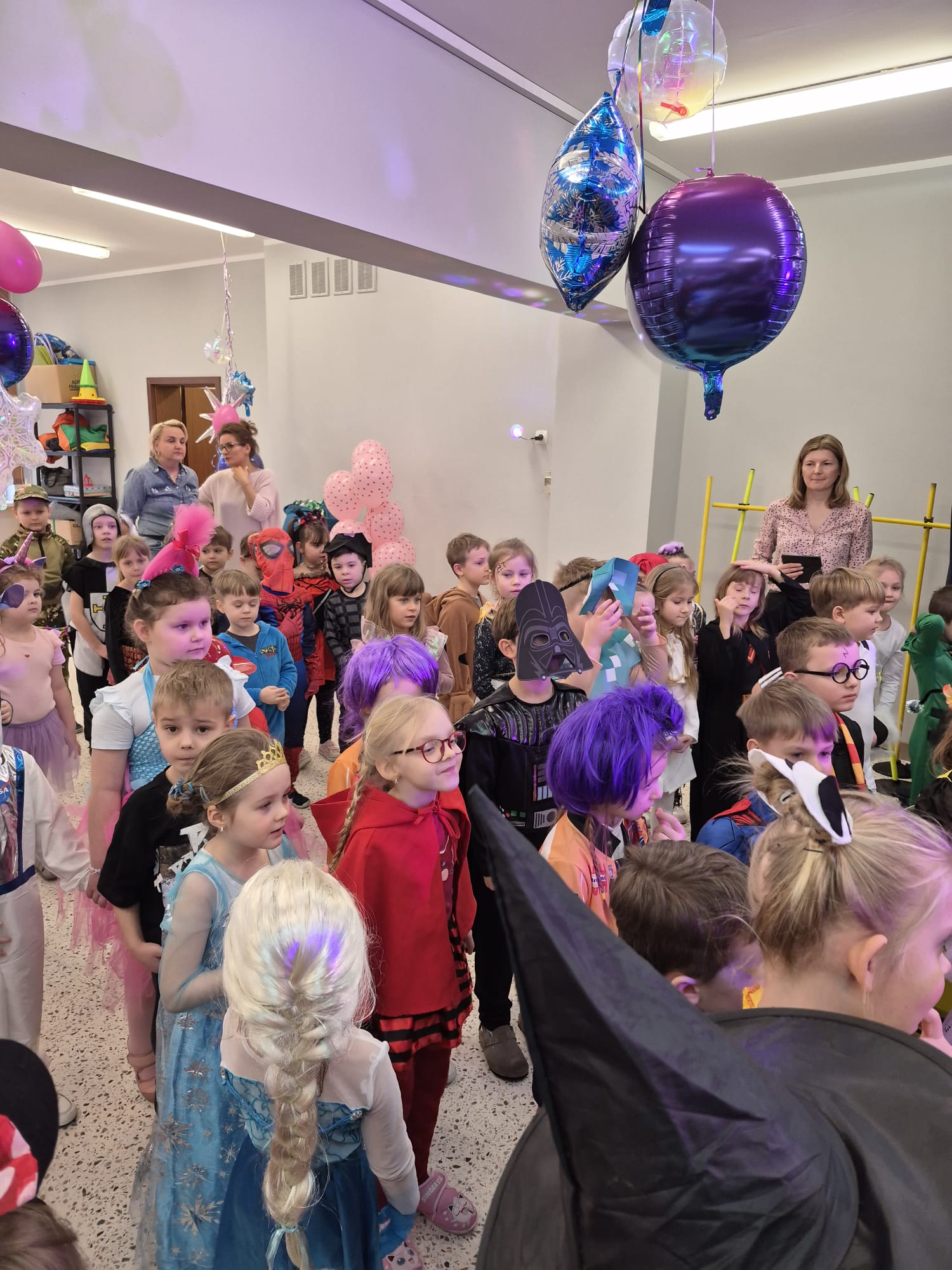 Tego dnia przedszkolna sala gimnastyczna zamieniła się w barwną, pełną karnawałowych dekoracji przestrzeń. Dzieci przyszły w przepięknych, pomysłowych strojach – można było spotkać księżniczki, policjantów, superbohaterów, zwierzątka oraz wiele bajkowych postaci. Wspólne tańce przy muzyce, zabawy integracyjne oraz konkursy sprawiły, że atmosfera była niezwykle radosna i pełna energii.