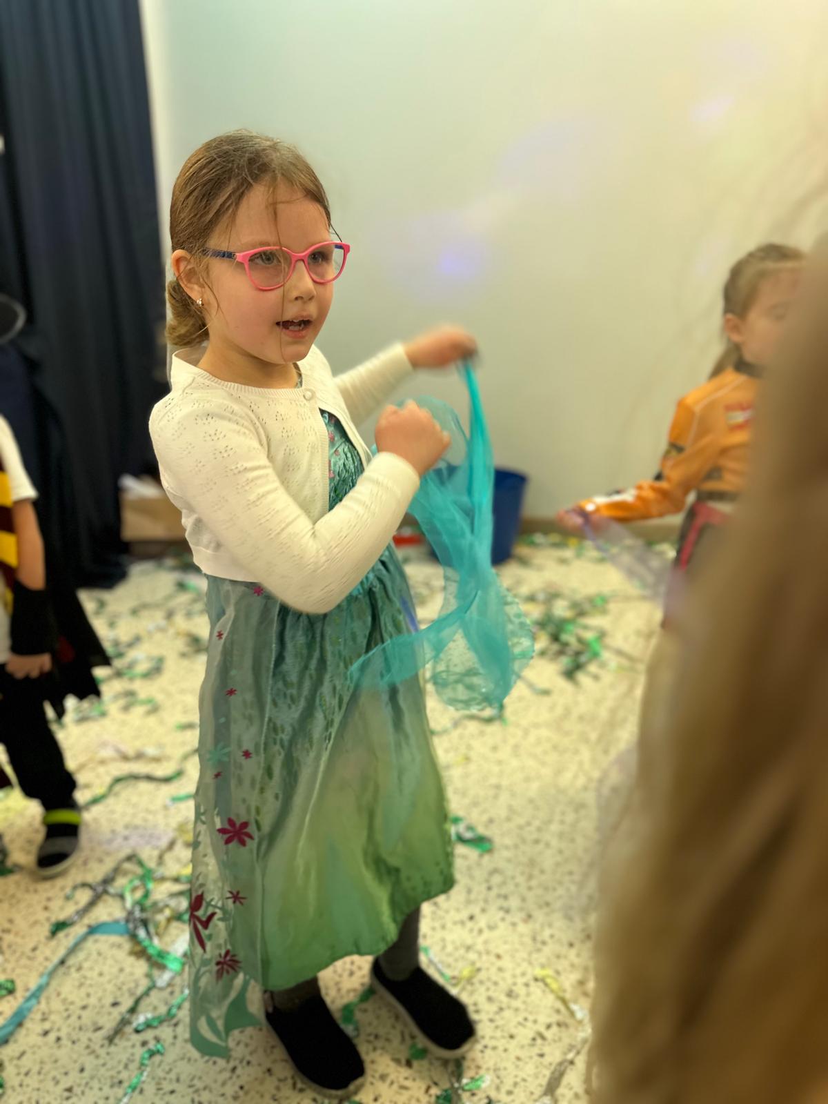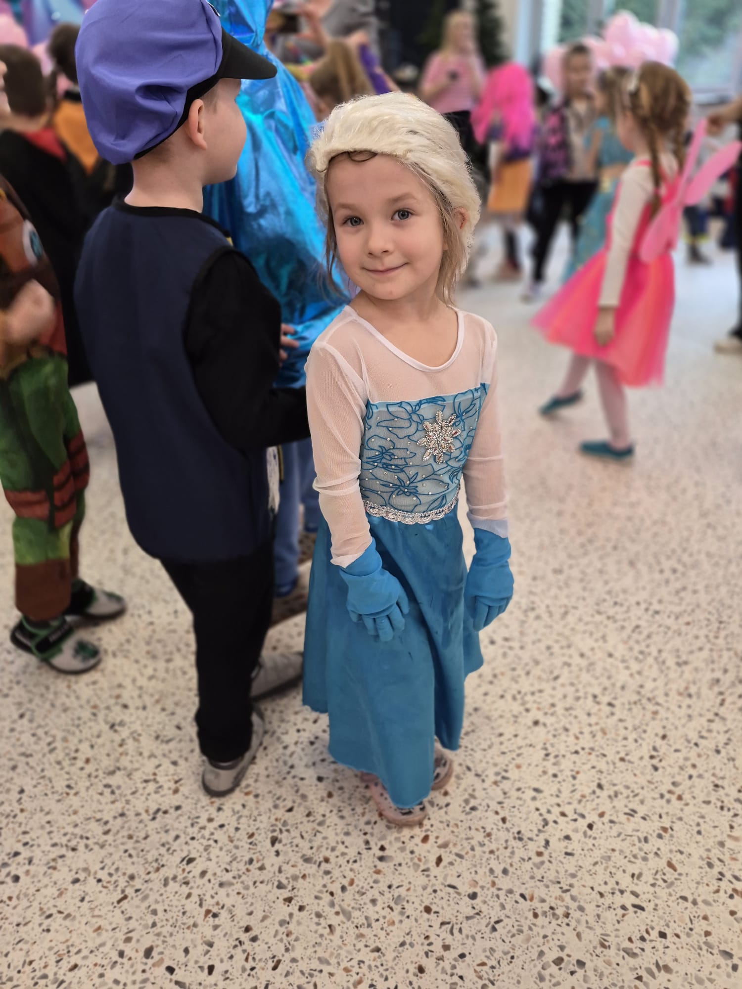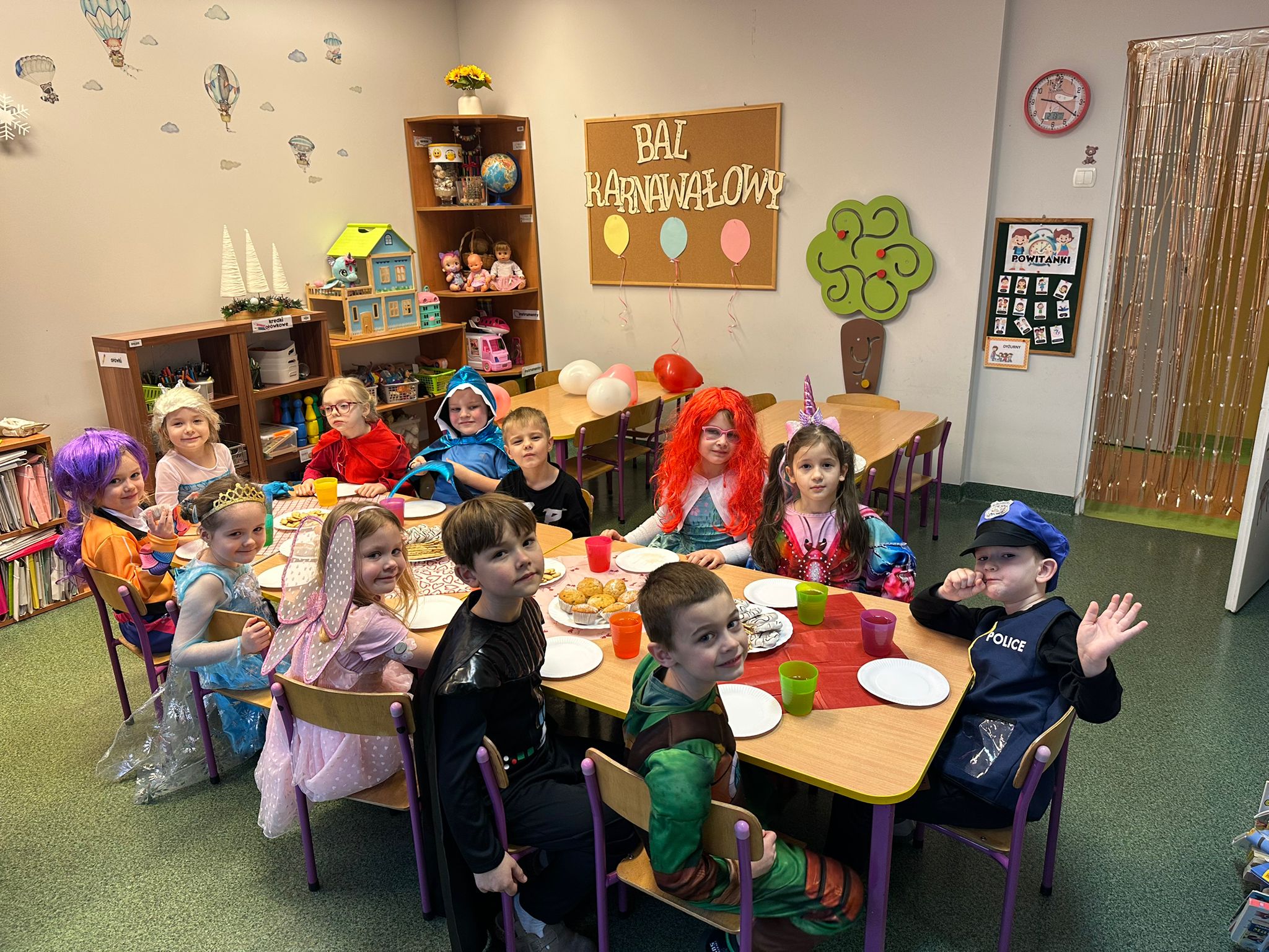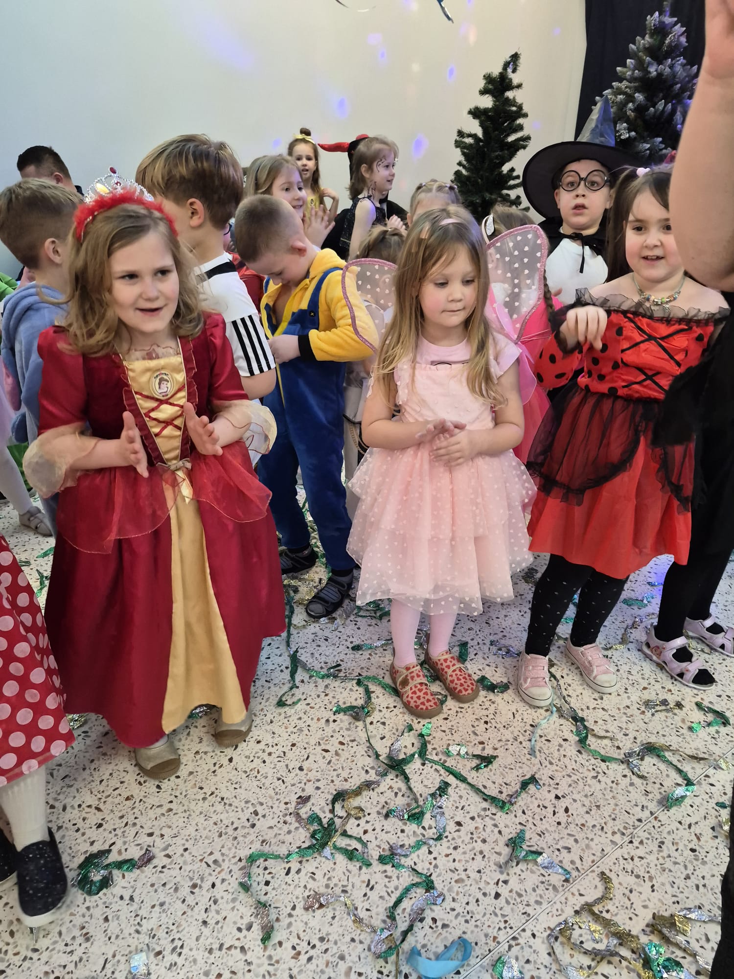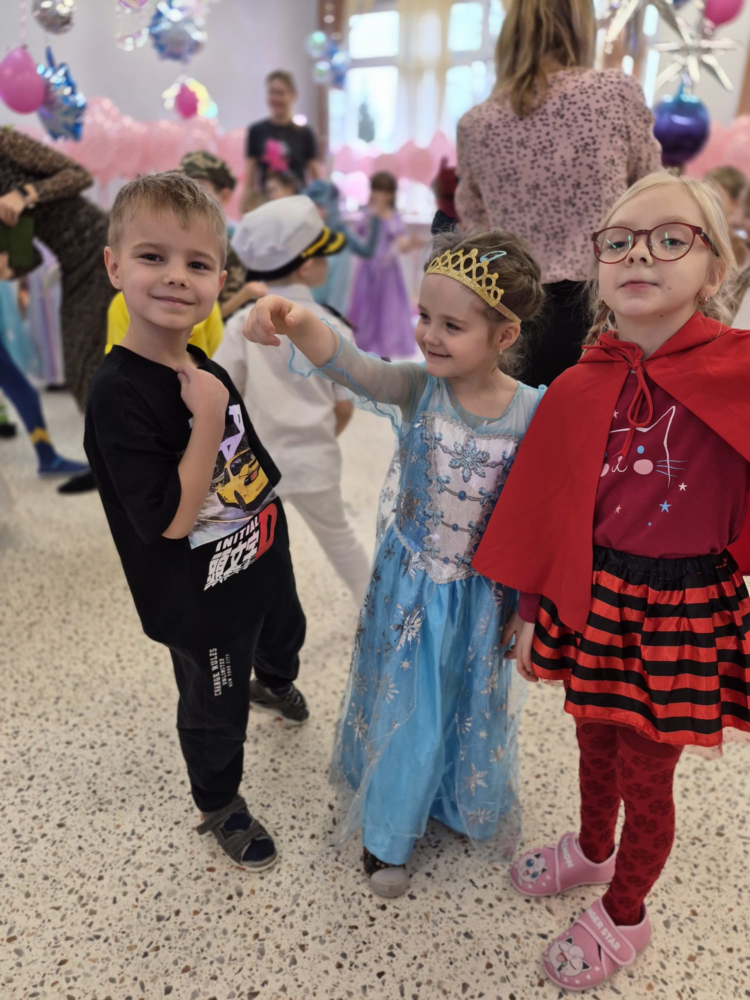 Tego dnia przedszkolna sala gimnastyczna zamieniła się w barwną, pełną karnawałowych dekoracji przestrzeń. Dzieci przyszły w przepięknych, pomysłowych strojach – można było spotkać księżniczki, policjantów, superbohaterów, zwierzątka oraz wiele bajkowych postaci. Wspólne tańce przy muzyce, zabawy integracyjne oraz konkursy sprawiły, że atmosfera była niezwykle radosna i pełna energii.