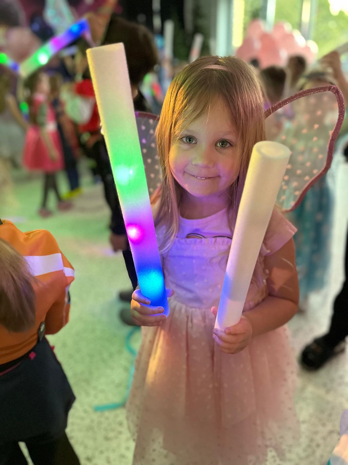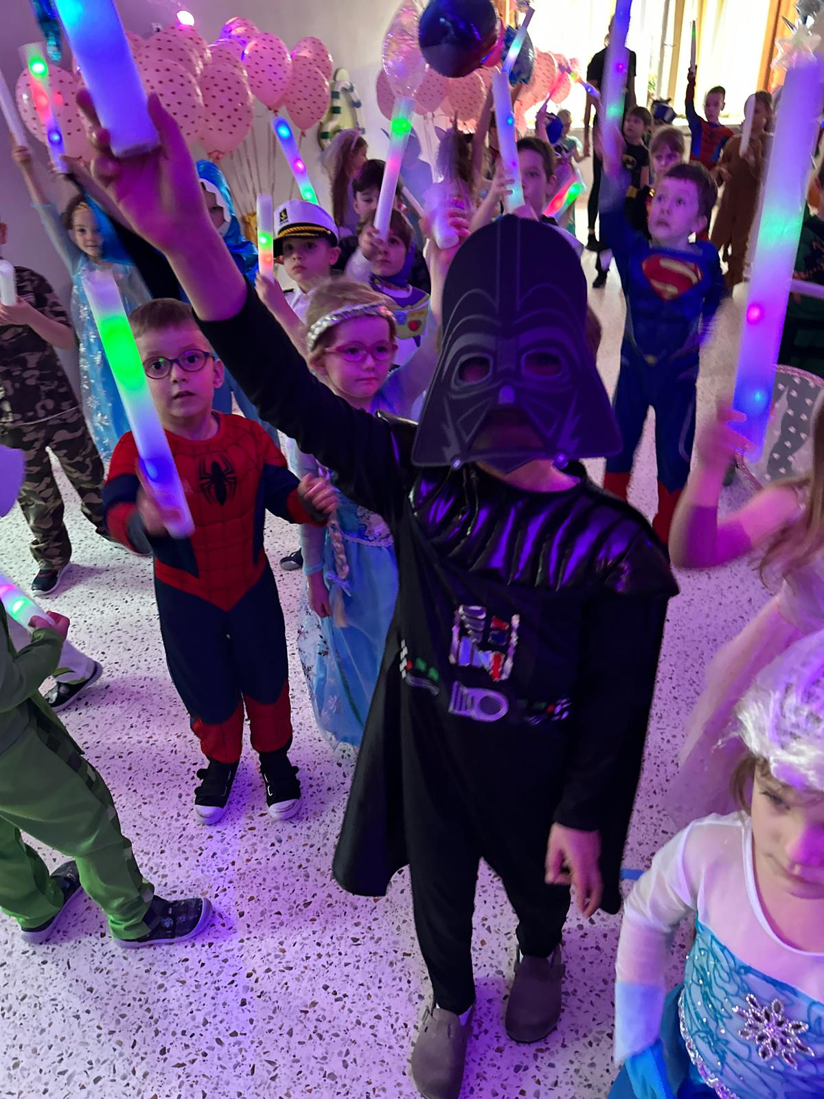 Nie zabrakło także wspaniałych zabaw z magicznymi świecącymi pałeczkami, czy wesołych konkursów do znanych i lubianych przez dzieci utworów z dziecięcych playlist. Wspólne zabawy poprzedzone zostały słodkim poczęstunkiem i wspólnymi rozmowami o bohaterach ze swoich kostiumów.