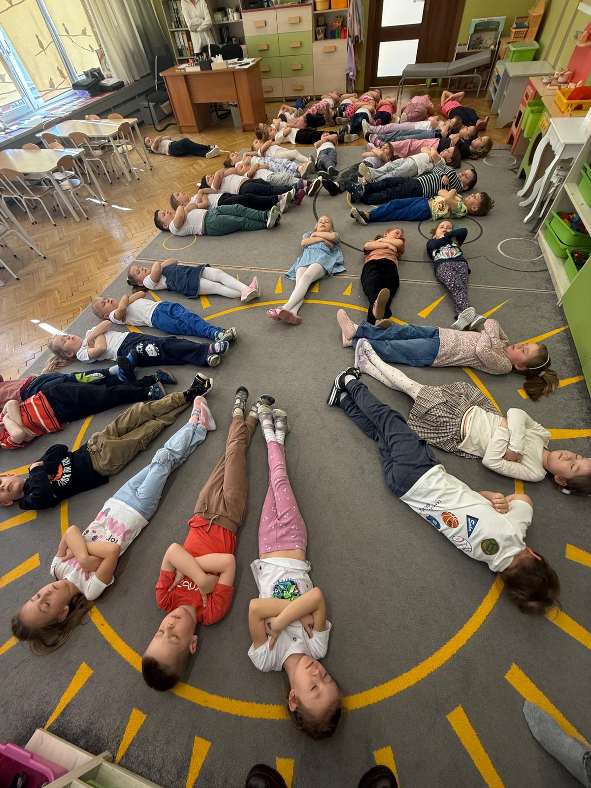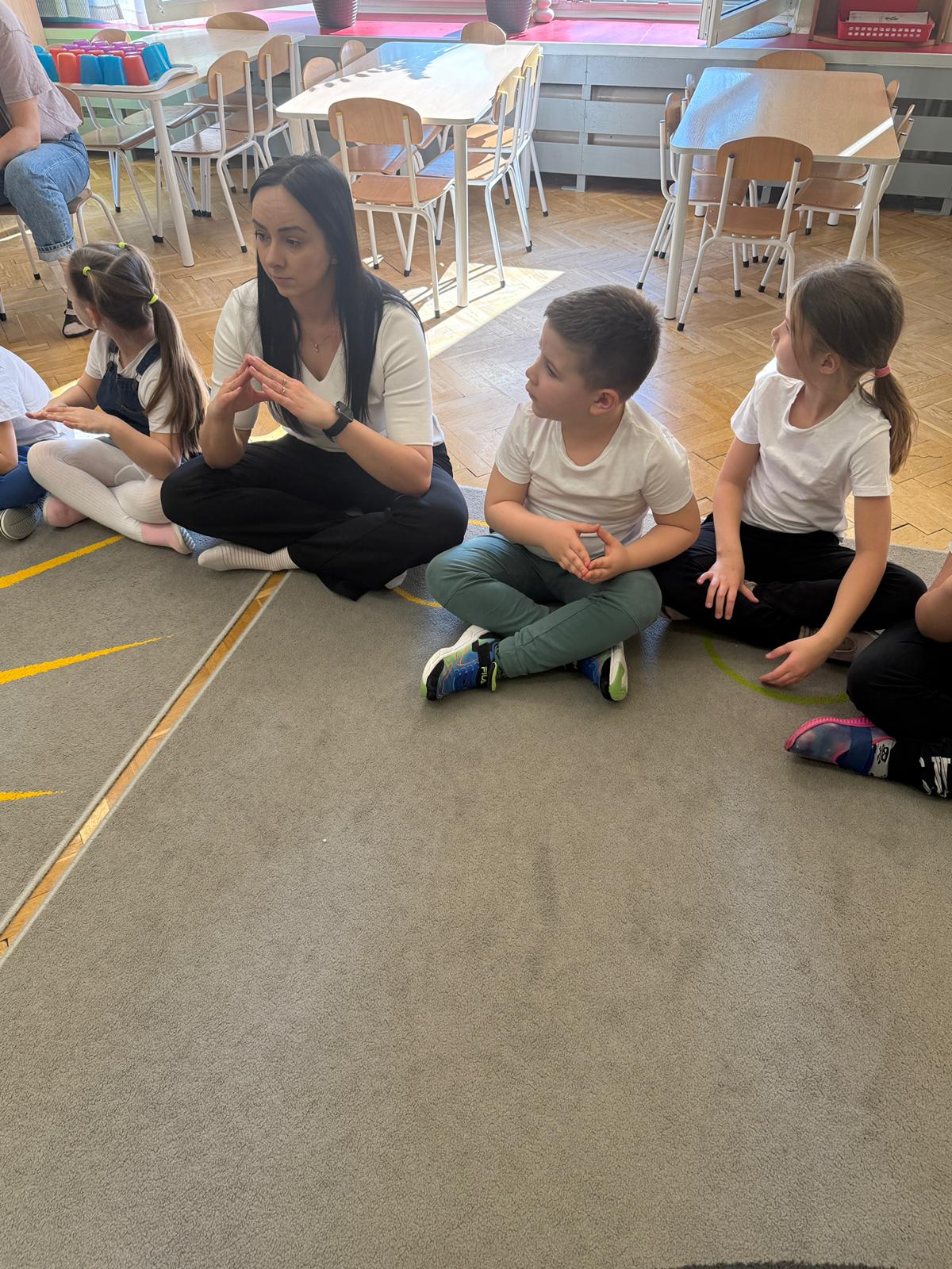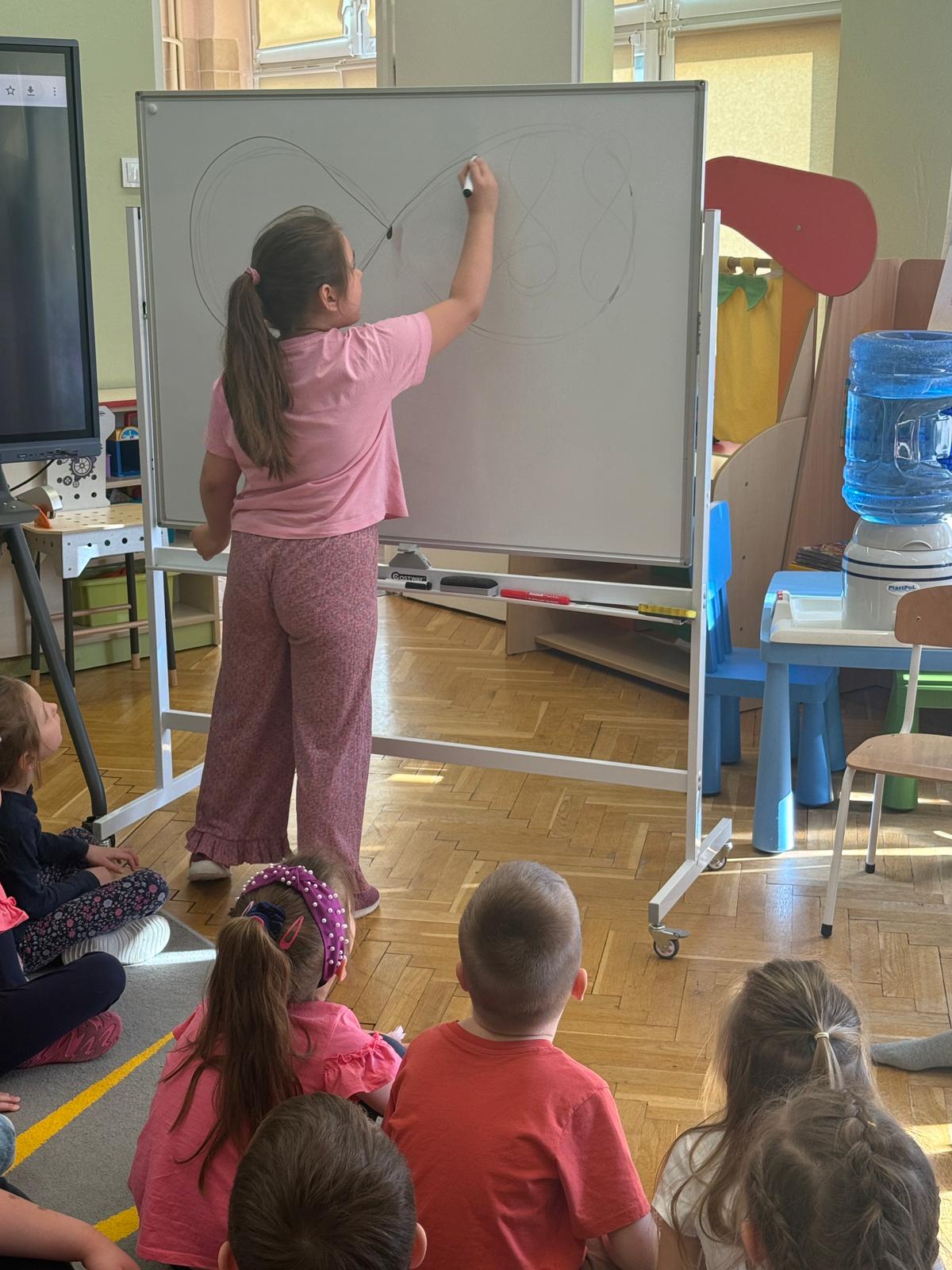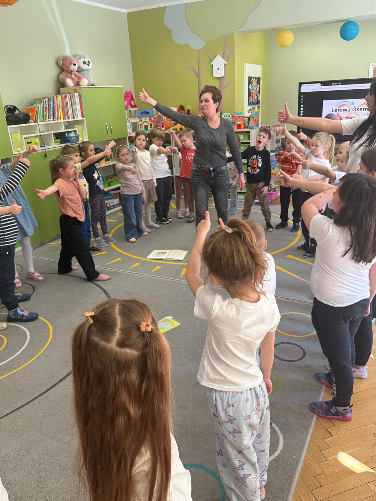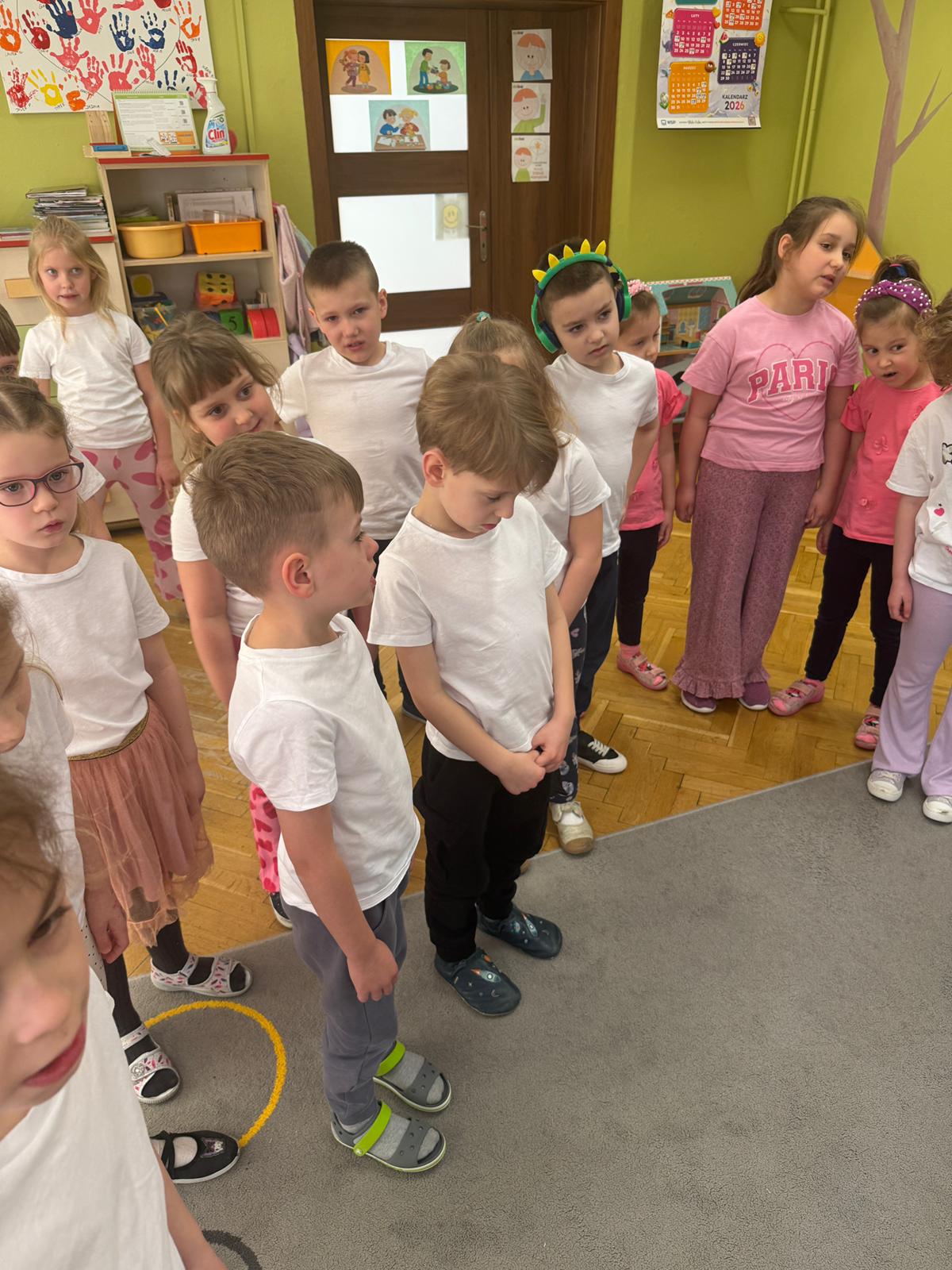 W grupie IV i VI odbyły się zajęcia koleżeńskie oparte na metodzie Kinezjologii Edukacyjnej, inaczej zwanej Gimnastyki Mózgu, opracowanej przez Paula Dennisona. Głównym celem tej metody jest: wspieranie integracji pracy obu półkul mózgowych; poprawa koncentracji i uwagi dzieci; rozwijanie koordynacji wzrokowo-ruchowej; usprawnianie motoryki dużej i małej; redukowanie napięcia i stresu u dzieci; wspieranie procesów uczenia się (czytania, pisania, liczenia); rozwijanie orientacji w schemacie własnego ciała. Zajęcia rozpoczęły się od krótkiego wprowadzenia i rozmowy z dziećmi o tym, dlaczego ruch jest ważny dla naszego mózgu. Następnie dzieci wykonywały serię prostych ćwiczeń ruchowych charakterystycznych dla gimnastyki mózgu. Wśród nich znalazły się m.in. ruchy naprzemienne, leniwe ósemki, ćwiczenie „słoń", punkty na myślenie czy pozycja Cooka. Zajęcia miały formę zabawy ruchowej, dzięki czemu dzieci chętnie i aktywnie w nich uczestniczyły zwracając szczególną uwagę na oddech, koncentrację oraz płynność ruchów. Ćwiczenia sprawiły dzieciom wiele radości, a jednocześnie przyniosły pozytywne efekty: pomogły im się wyciszyć, lepiej skupić uwagę i rozwinąć sprawność ruchową. Zajęcia pokazały, że proste ćwiczenia ruchowe mogą w ciekawy sposób wspierać rozwój dziecka i przygotowywać je do dalszej nauki.