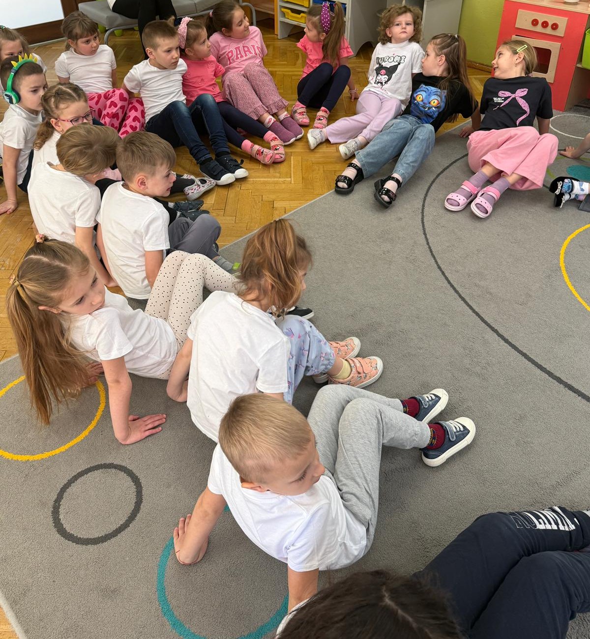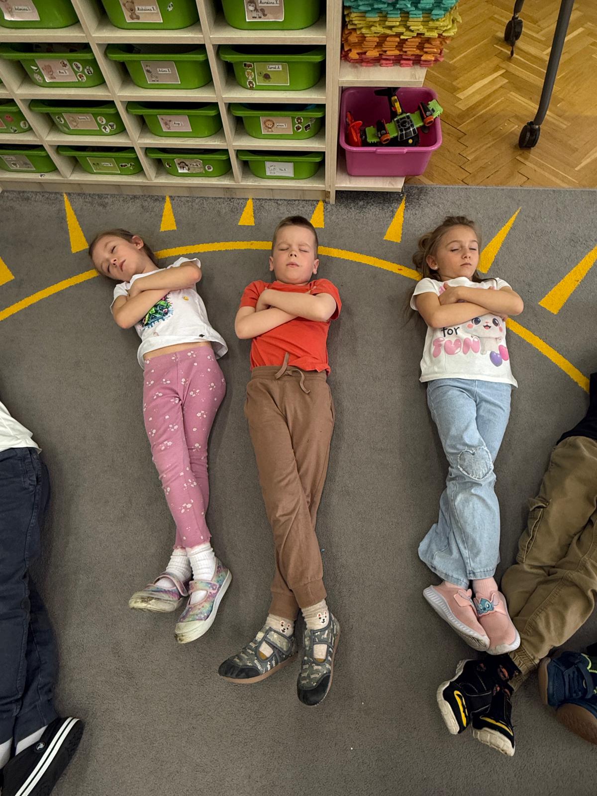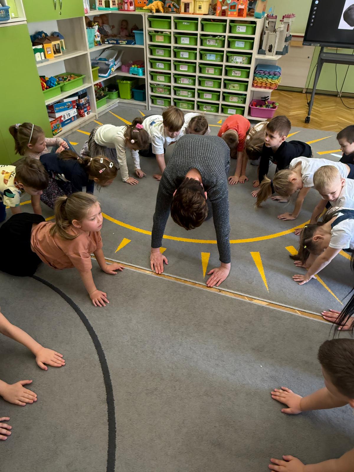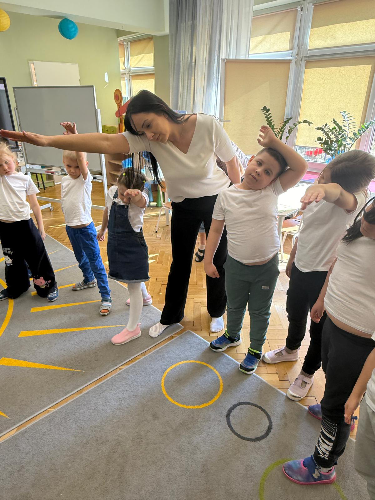 W grupie IV i VI odbyły się zajęcia koleżeńskie oparte na metodzie Kinezjologii Edukacyjnej, inaczej zwanej Gimnastyki Mózgu, opracowanej przez Paula Dennisona. Głównym celem tej metody jest: wspieranie integracji pracy obu półkul mózgowych; poprawa koncentracji i uwagi dzieci; rozwijanie koordynacji wzrokowo-ruchowej; usprawnianie motoryki dużej i małej; redukowanie napięcia i stresu u dzieci; wspieranie procesów uczenia się (czytania, pisania, liczenia); rozwijanie orientacji w schemacie własnego ciała. Zajęcia rozpoczęły się od krótkiego wprowadzenia i rozmowy z dziećmi o tym, dlaczego ruch jest ważny dla naszego mózgu. Następnie dzieci wykonywały serię prostych ćwiczeń ruchowych charakterystycznych dla gimnastyki mózgu. Wśród nich znalazły się m.in. ruchy naprzemienne, leniwe ósemki, ćwiczenie „słoń", punkty na myślenie czy pozycja Cooka. Zajęcia miały formę zabawy ruchowej, dzięki czemu dzieci chętnie i aktywnie w nich uczestniczyły zwracając szczególną uwagę na oddech, koncentrację oraz płynność ruchów. Ćwiczenia sprawiły dzieciom wiele radości, a jednocześnie przyniosły pozytywne efekty: pomogły im się wyciszyć, lepiej skupić uwagę i rozwinąć sprawność ruchową. Zajęcia pokazały, że proste ćwiczenia ruchowe mogą w ciekawy sposób wspierać rozwój dziecka i przygotowywać je do dalszej nauki.