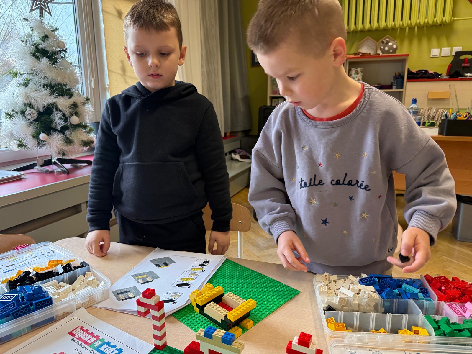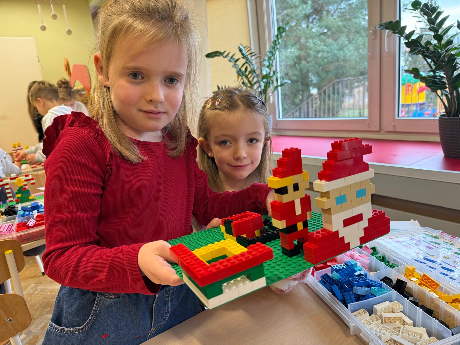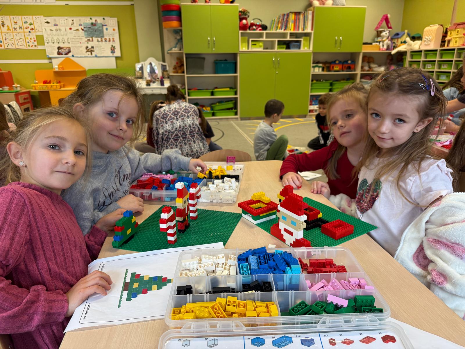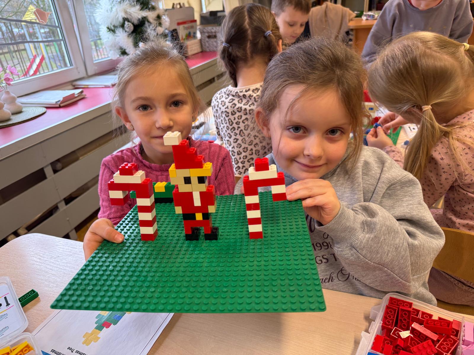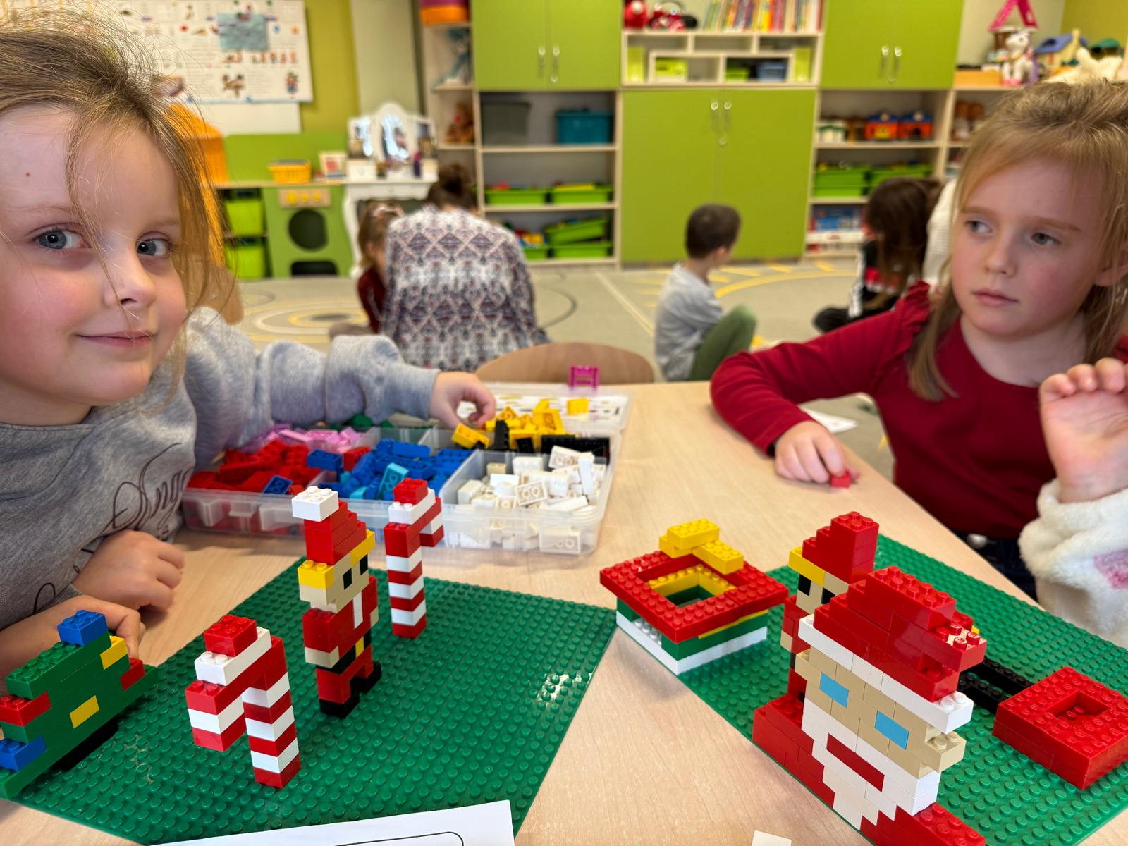 W naszej grupie odbyły się niezwykłe warsztaty, które wprowadziły dzieci w świąteczny klimat i pozwoliły im twórczo przygotować się do nadchodzących Świąt Bożego Narodzenia. Celem spotkania było rozwijanie kreatywności dzieci, poszerzanie ich wiedzy o tradycjach bożonarodzeniowych oraz kształtowanie umiejętności konstrukcyjnych poprzez budowanie modeli z klocków LEGO. Podczas zajęć dzieci z zaangażowaniem opowiadały o Świętach Bożego Narodzenia, wieczerzy wigilijnej, potrawach, zwyczajach i rodzinnych tradycjach. Wspólna rozmowa pozwoliła im lepiej zrozumieć sens świątecznych obrzędów i podzielić się własnymi doświadczeniami. Następnie przedszkolaki zamieniły się w małych konstruktorów Fabryki Świętego Mikołaja. Z klocków LEGO budowały choinki, Mikołaja, bałwana, sanie, renifery oraz inne elementy związane ze świętami. Każde dziecko miało okazję stworzyć własny, niepowtarzalny model, wykazując się wyobraźnią i kreatywnością. Warsztaty przyniosły wiele radości, a dzieci utrwaliły wiedzę o tradycjach bożonarodzeniowych, rozwinęły umiejętności konstrukcyjne i współpracy, a także wzbogaciły swoją wyobraźnię przestrzenną. Spotkanie pozwoliło im poczuć magię świąt i z dumą prezentować swoje wyjątkowe prace.