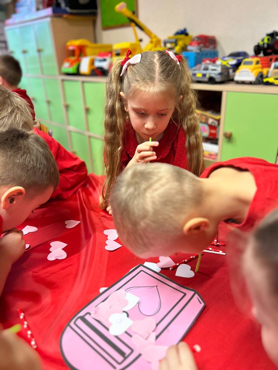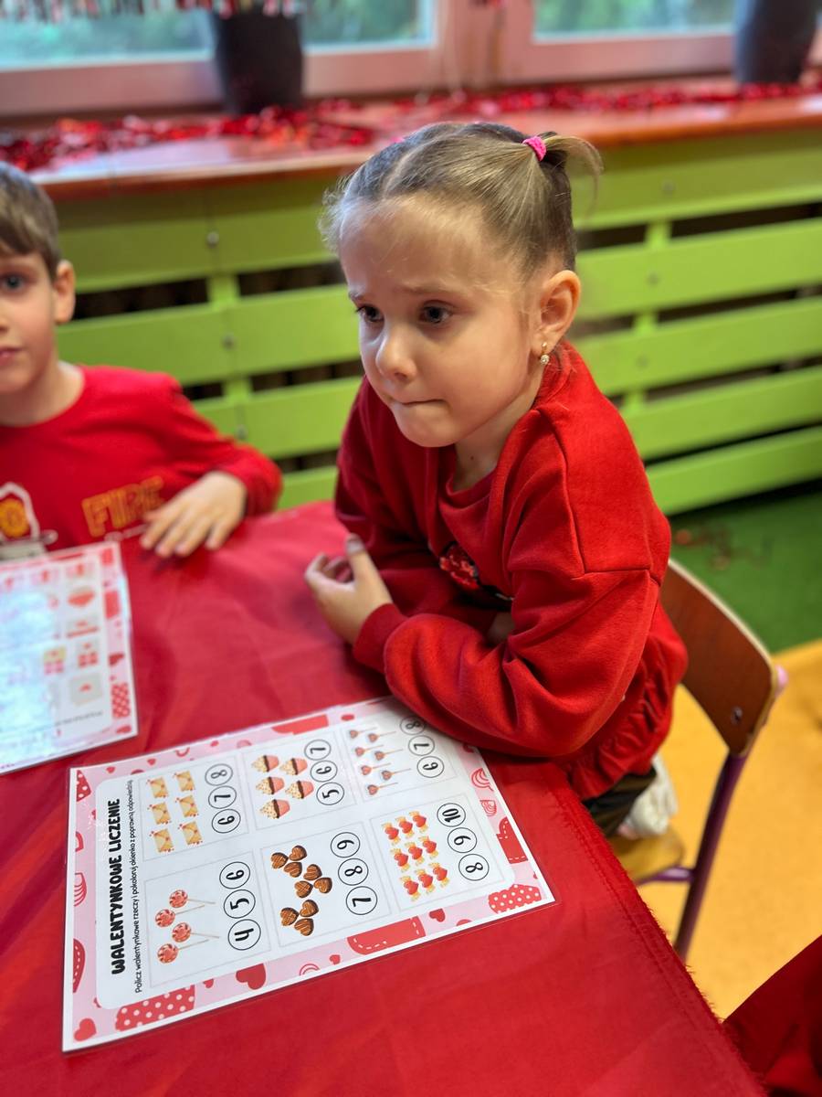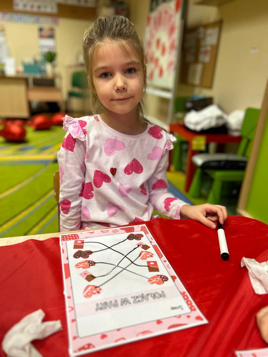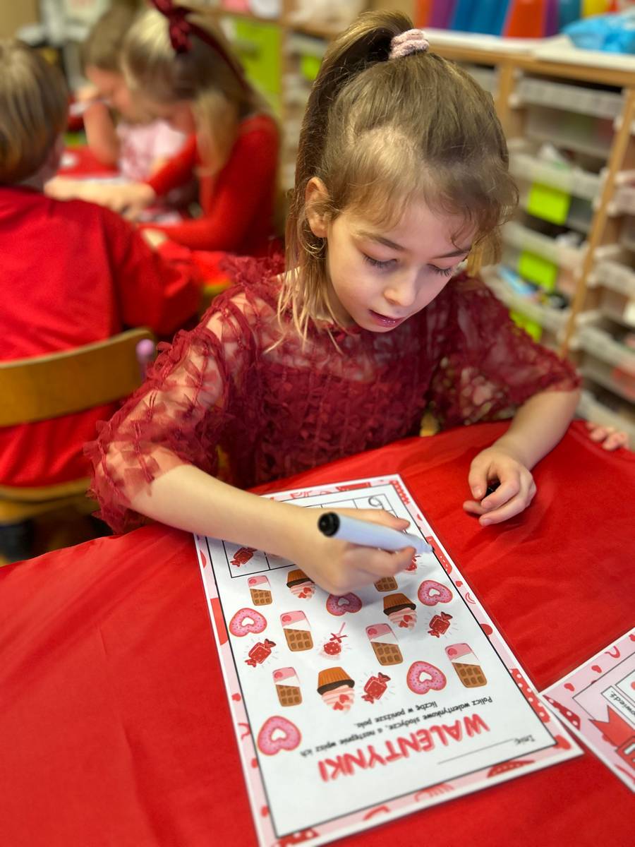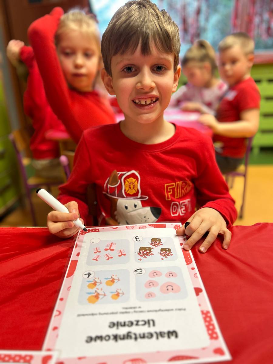 Walentynkowy dzień upłynął pod znakiem wspólnych rozmów, zabawy i odkrywania czym jest miłość w dziecięcym świecie. Zaczęliśmy od rozmowy w kręgu, podczas której dzieci dzieliły się swoimi skojarzeniami- mówiły, że miłość to przytulanie, pomaganie, dzielenie się zabawkami. Podczas walentynkowych zajęć rozmawialiśmy także o tym, skąd wzięło się to wyjątkowe święto oraz dlaczego serce jest symbolem miłości. Następnie przedszkolaki z wielkim zaangażowaniem rozwiązywały walentynkowe zadania, które prowadziły je przez "serduszkowe" wyzwania, ćwicząc spostrzegawczość, współpracę i logiczne myślenie.