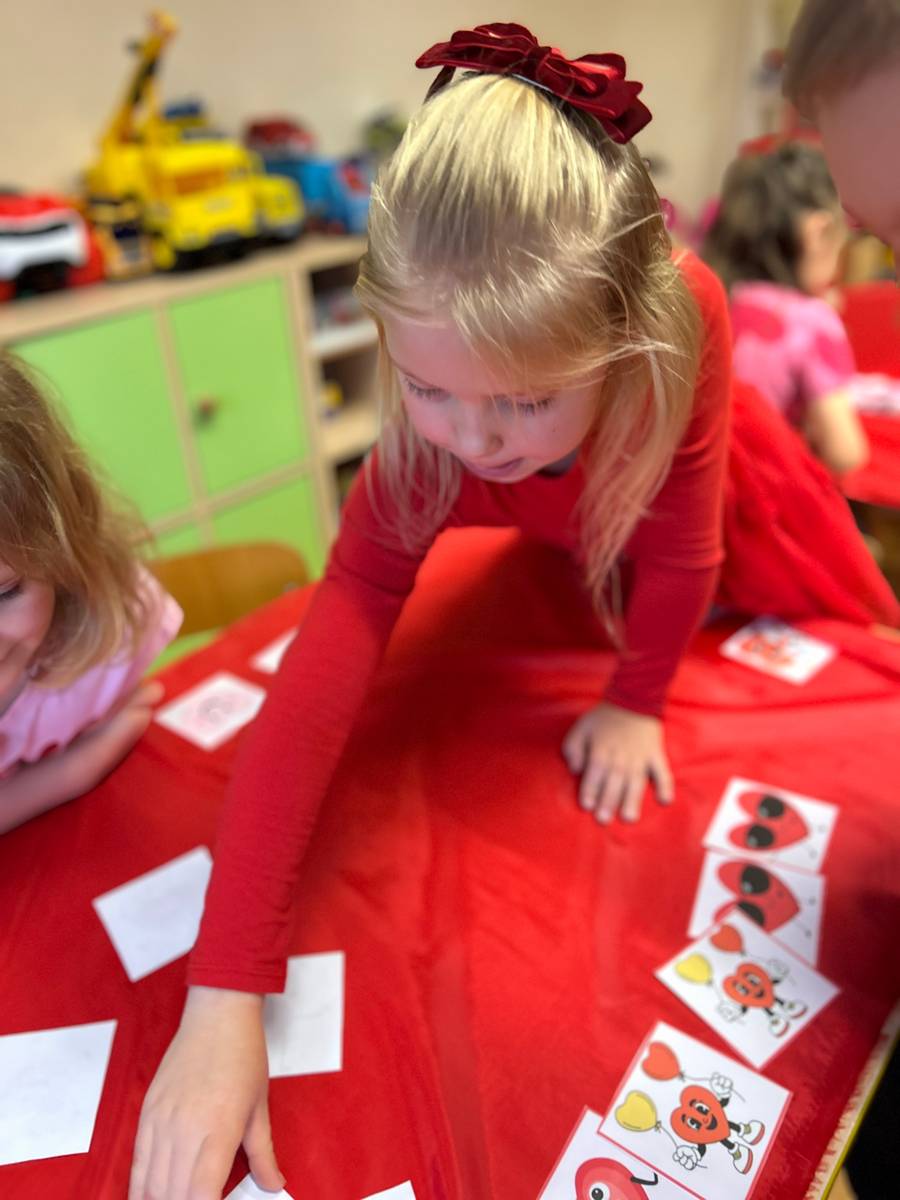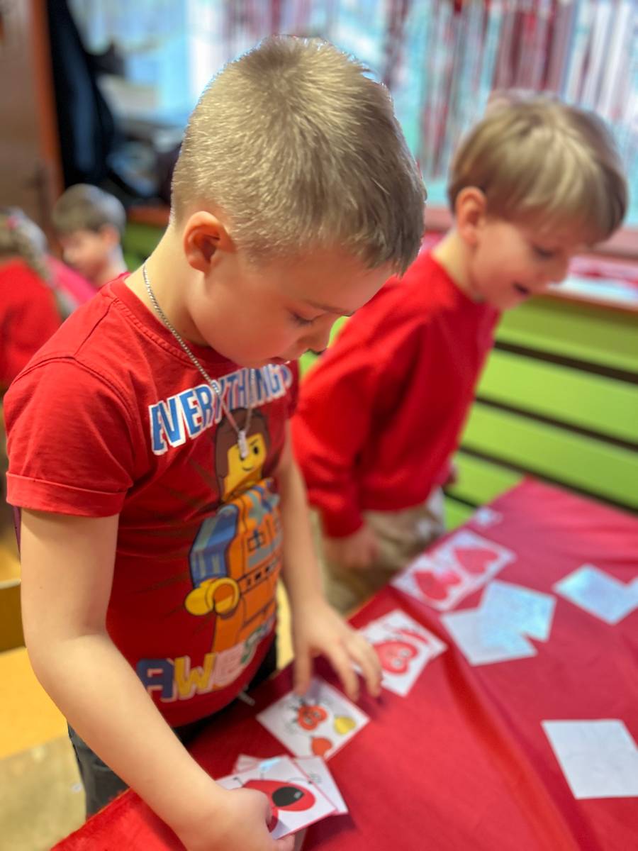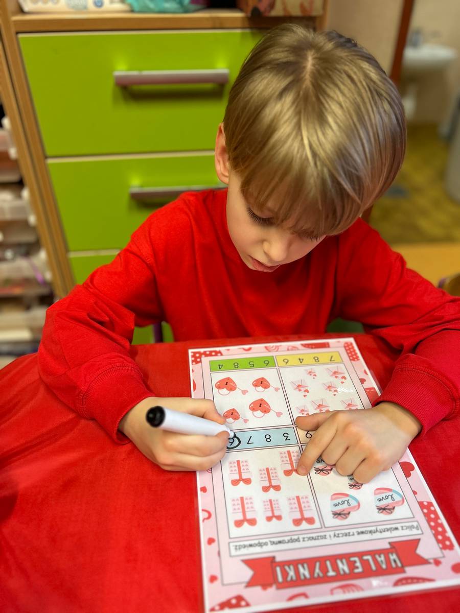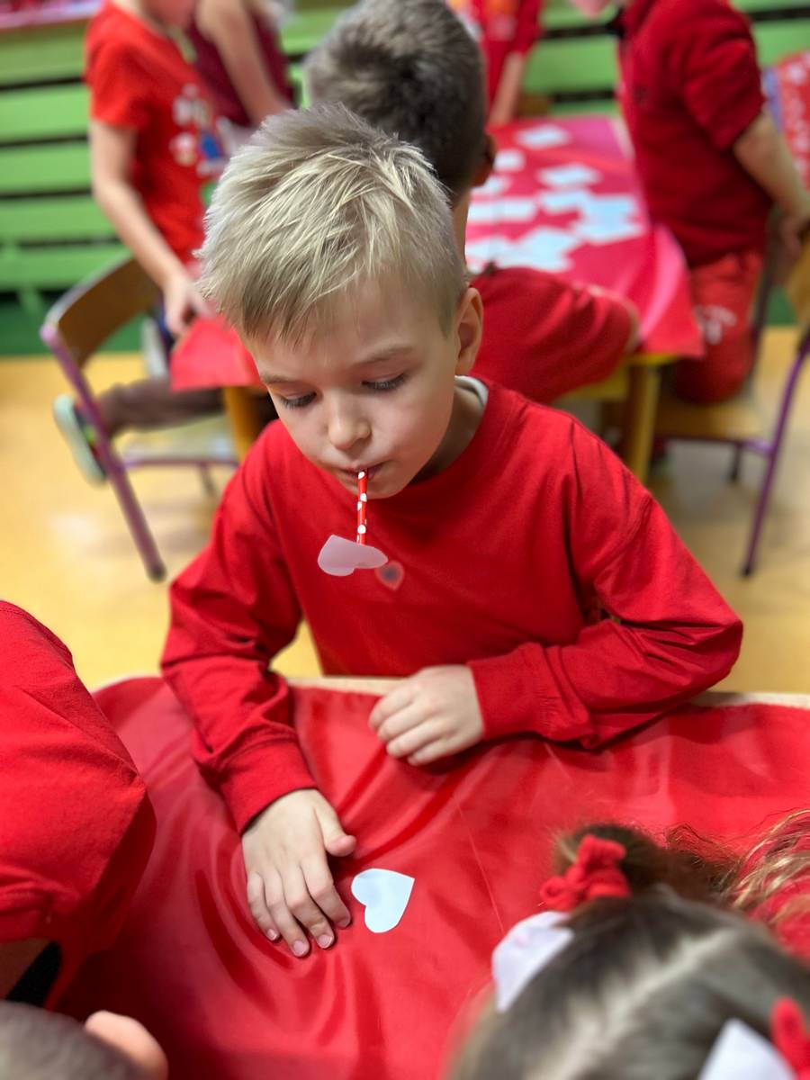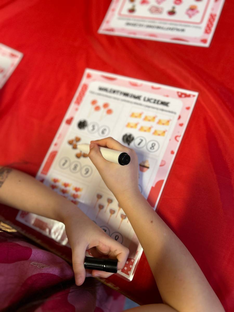 Walentynkowy dzień upłynął pod znakiem wspólnych rozmów, zabawy i odkrywania czym jest miłość w dziecięcym świecie. Zaczęliśmy od rozmowy w kręgu, podczas której dzieci dzieliły się swoimi skojarzeniami- mówiły, że miłość to przytulanie, pomaganie, dzielenie się zabawkami. Podczas walentynkowych zajęć rozmawialiśmy także o tym, skąd wzięło się to wyjątkowe święto oraz dlaczego serce jest symbolem miłości. Następnie przedszkolaki z wielkim zaangażowaniem rozwiązywały walentynkowe zadania, które prowadziły je przez "serduszkowe" wyzwania, ćwicząc spostrzegawczość, współpracę i logiczne myślenie.