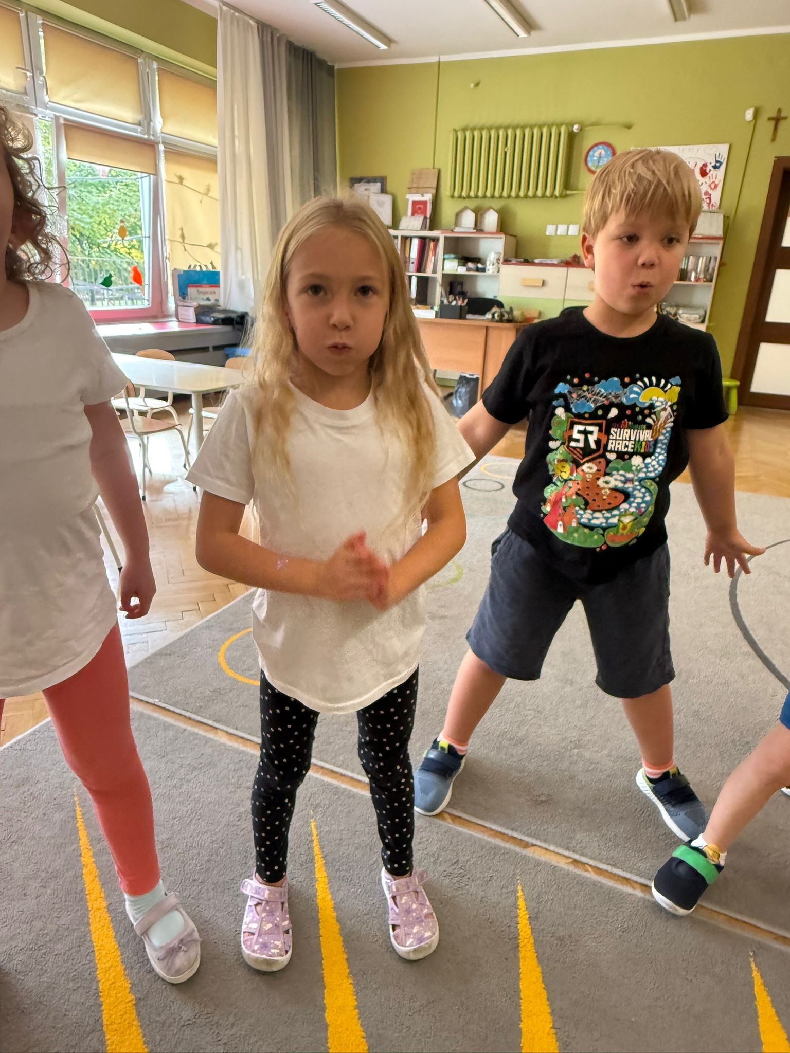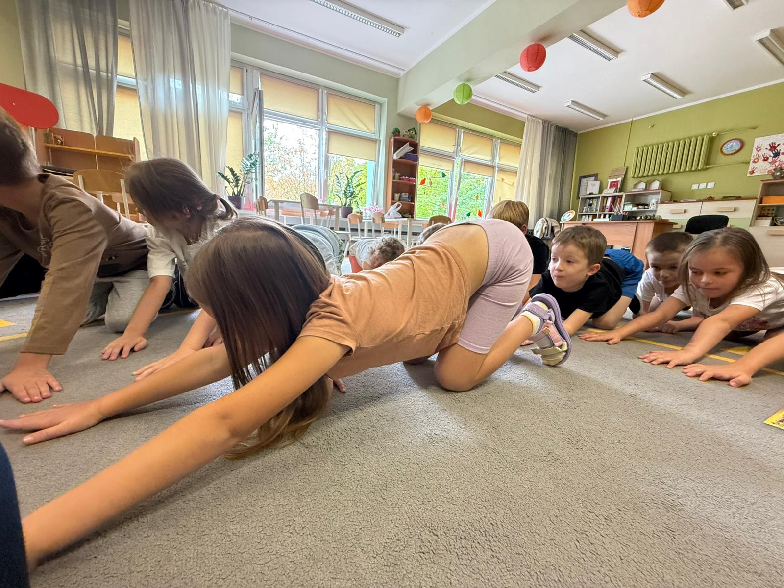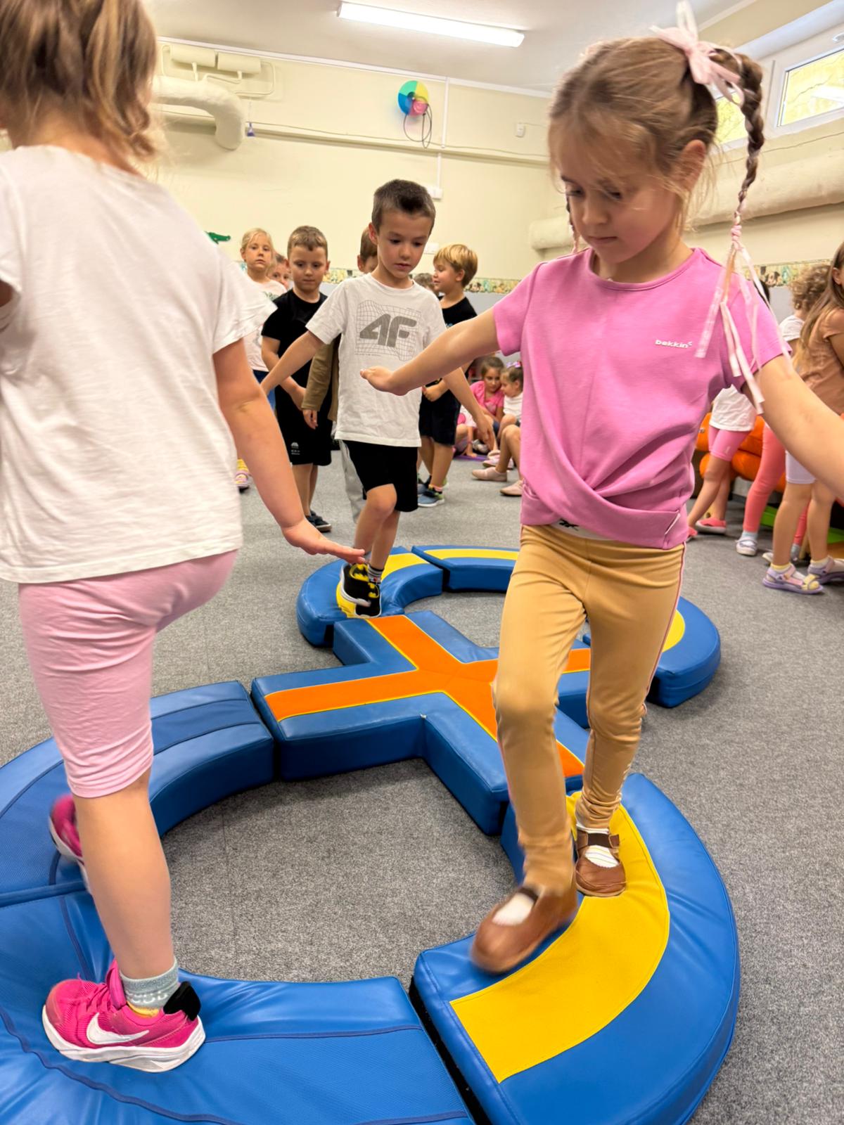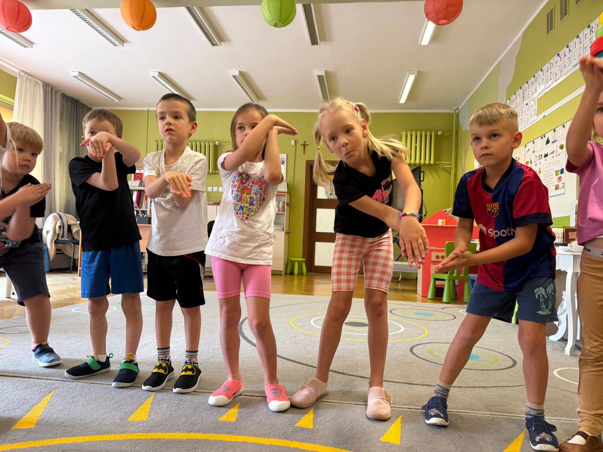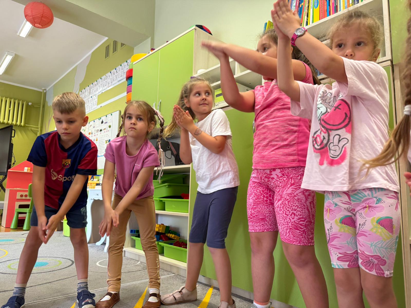 Od czterech lat w naszej grupie z powodzeniem stosujemy metodę Paula Dennisona, łącząc ruch i aktywność fizyczną z nauką. Na początku dzieci w wieku czterech lat uczyły się podstawowych ćwiczeń integrujących półkule mózgu, a obecnie, jako sześciolatkowie, kontynuują te działania, rozwijając, koncentrację i umiejętności poznawcze. Celem metody jest wspieranie integracji obu półkul mózgowych, poprawa koordynacji i równowagi, rozwijanie umiejętności motorycznych i koncentracji, wspomaganie procesu uczenia się i zapamiętywania, budowanie pewności siebie i pozytywnego nastawienia do nauki. Dzieci, dzięki regularnym ćwiczeniom, stają się bardziej skoncentrowane, lepiej radzą sobie z zadaniami wymagającymi precyzji i kreatywności, a także czerpią radość z nauki i zabawy. Dzięki tej metodzie dzieciom łatwiej jest osiągnąć dojrzałość szkolną, co pozytywnie wpływa na ich gotowość do nauki w przyszłości.