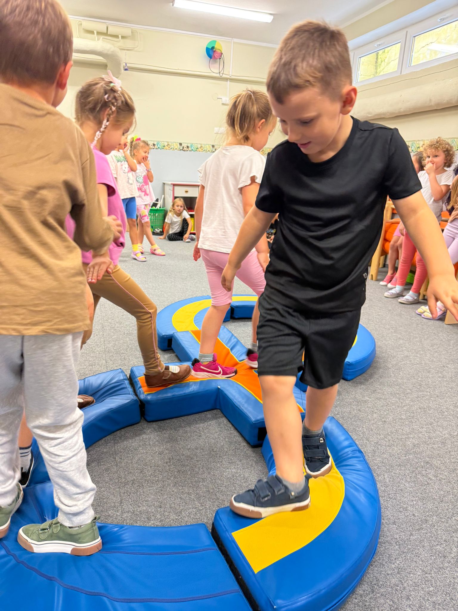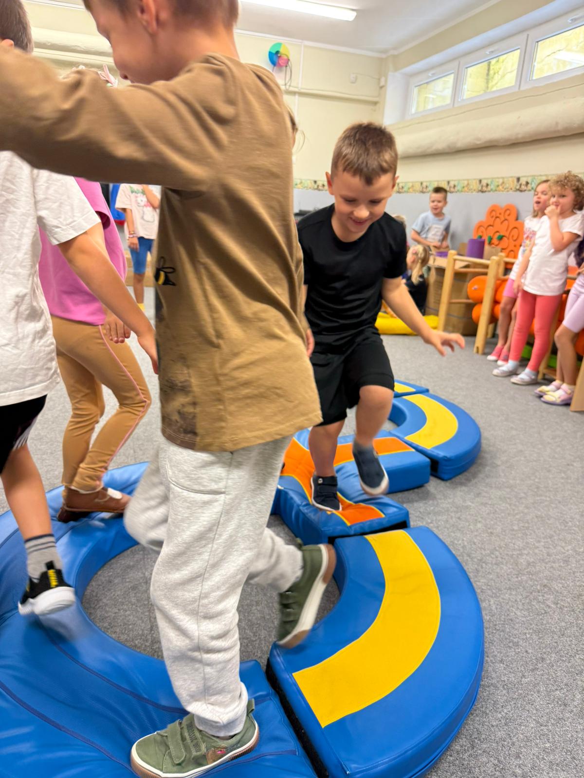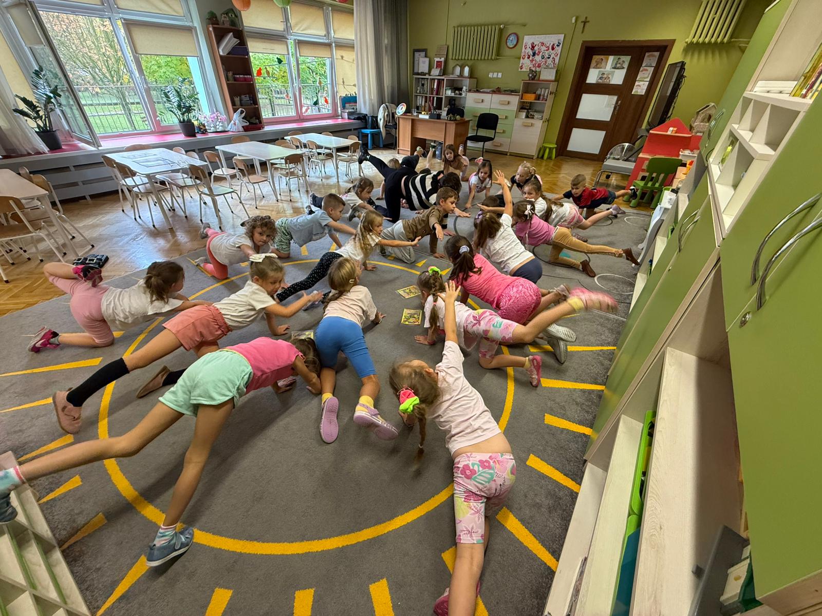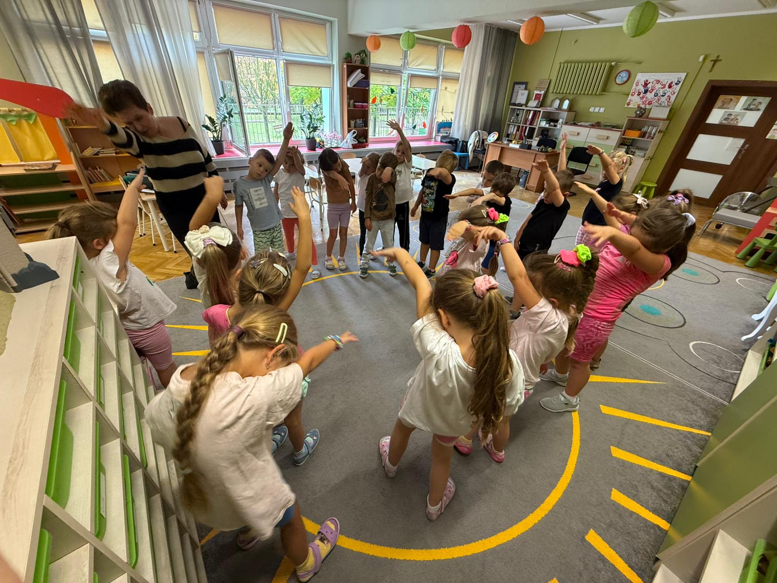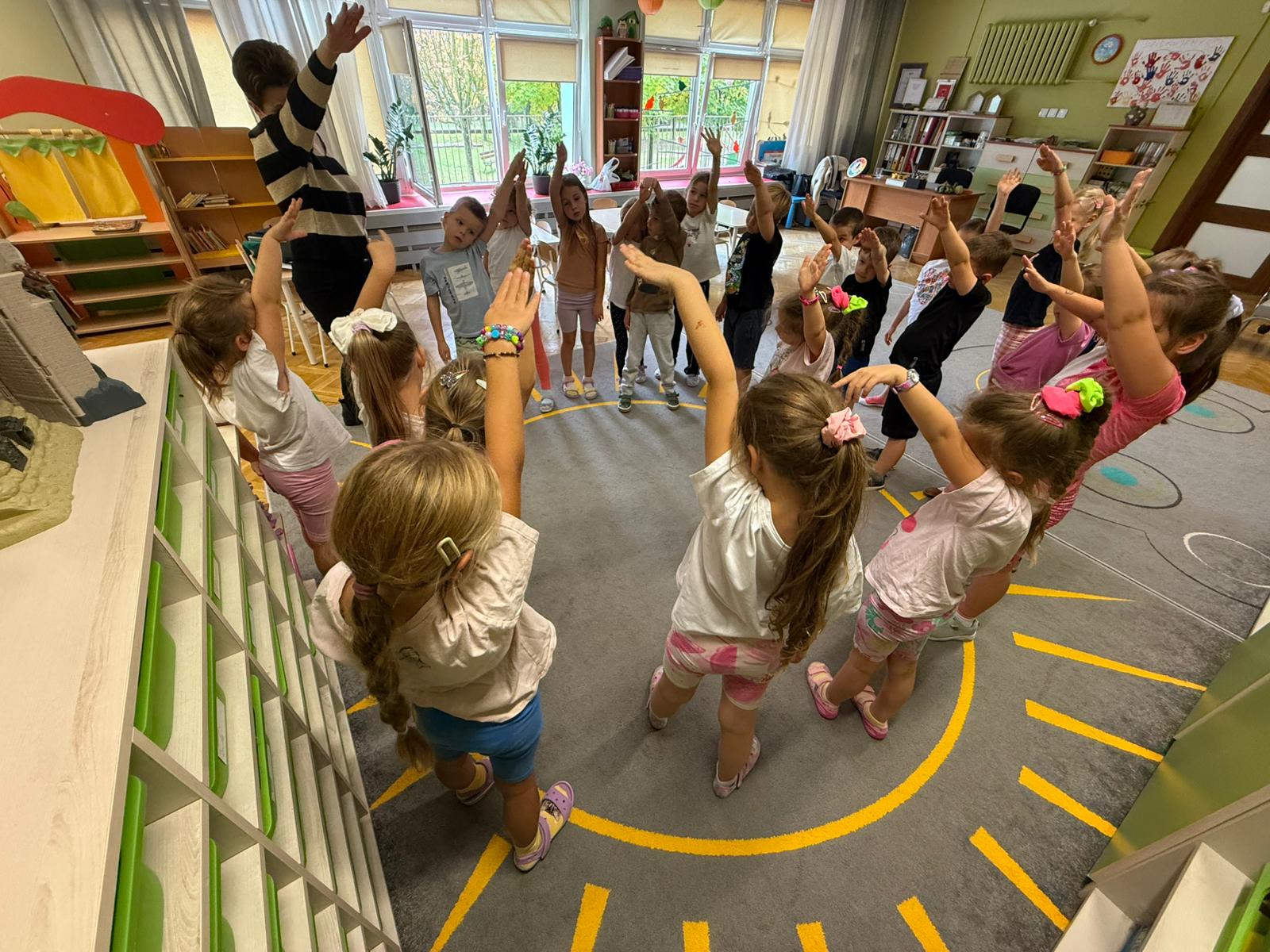 Od czterech lat w naszej grupie z powodzeniem stosujemy metodę Paula Dennisona, łącząc ruch i aktywność fizyczną z nauką. Na początku dzieci w wieku czterech lat uczyły się podstawowych ćwiczeń integrujących półkule mózgu, a obecnie, jako sześciolatkowie, kontynuują te działania, rozwijając, koncentrację i umiejętności poznawcze. Celem metody jest wspieranie integracji obu półkul mózgowych, poprawa koordynacji i równowagi, rozwijanie umiejętności motorycznych i koncentracji, wspomaganie procesu uczenia się i zapamiętywania, budowanie pewności siebie i pozytywnego nastawienia do nauki. Dzieci, dzięki regularnym ćwiczeniom, stają się bardziej skoncentrowane, lepiej radzą sobie z zadaniami wymagającymi precyzji i kreatywności, a także czerpią radość z nauki i zabawy. Dzięki tej metodzie dzieciom łatwiej jest osiągnąć dojrzałość szkolną, co pozytywnie wpływa na ich gotowość do nauki w przyszłości.