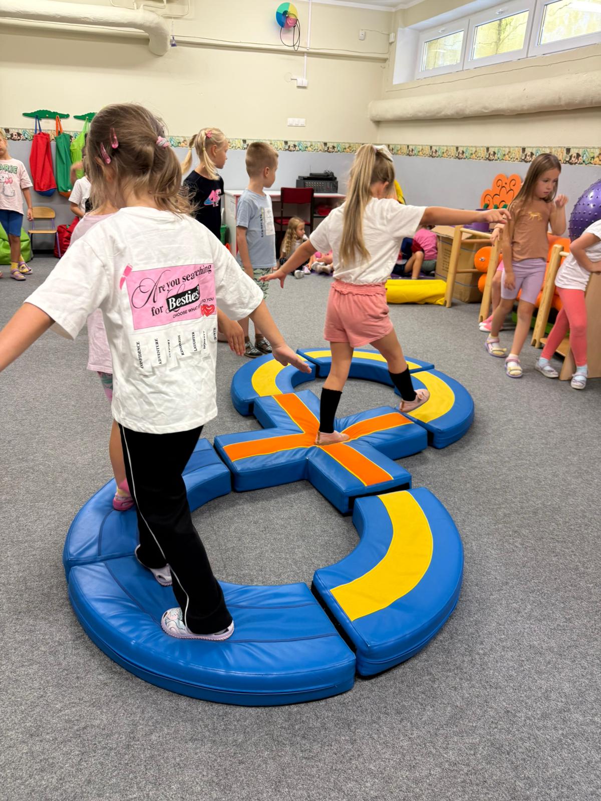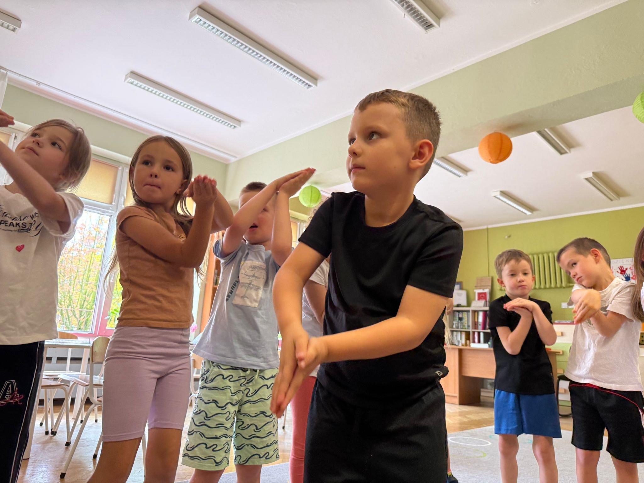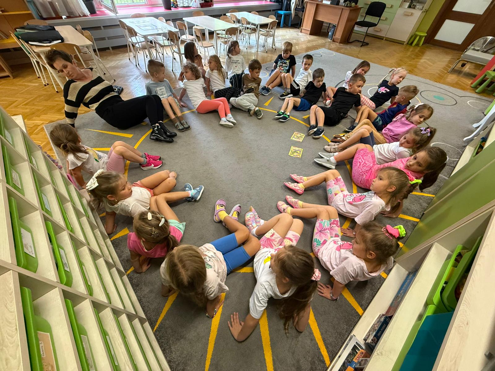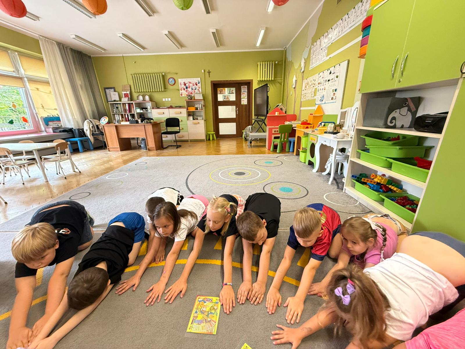 Od czterech lat w naszej grupie z powodzeniem stosujemy metodę Paula Dennisona, łącząc ruch i aktywność fizyczną z nauką. Na początku dzieci w wieku czterech lat uczyły się podstawowych ćwiczeń integrujących półkule mózgu, a obecnie, jako sześciolatkowie, kontynuują te działania, rozwijając, koncentrację i umiejętności poznawcze. Celem metody jest wspieranie integracji obu półkul mózgowych, poprawa koordynacji i równowagi, rozwijanie umiejętności motorycznych i koncentracji, wspomaganie procesu uczenia się i zapamiętywania, budowanie pewności siebie i pozytywnego nastawienia do nauki. Dzieci, dzięki regularnym ćwiczeniom, stają się bardziej skoncentrowane, lepiej radzą sobie z zadaniami wymagającymi precyzji i kreatywności, a także czerpią radość z nauki i zabawy. Dzięki tej metodzie dzieciom łatwiej jest osiągnąć dojrzałość szkolną, co pozytywnie wpływa na ich gotowość do nauki w przyszłości.