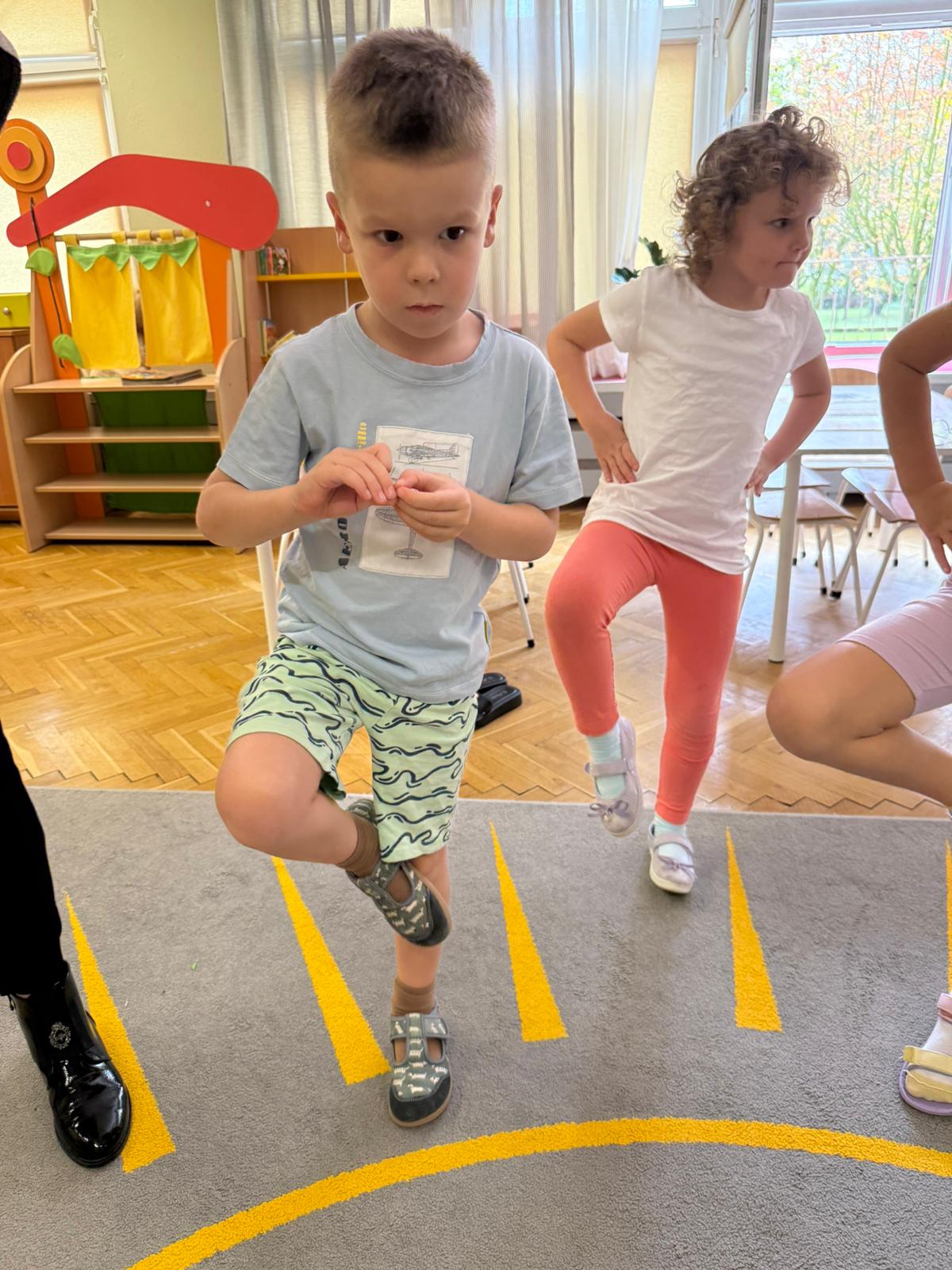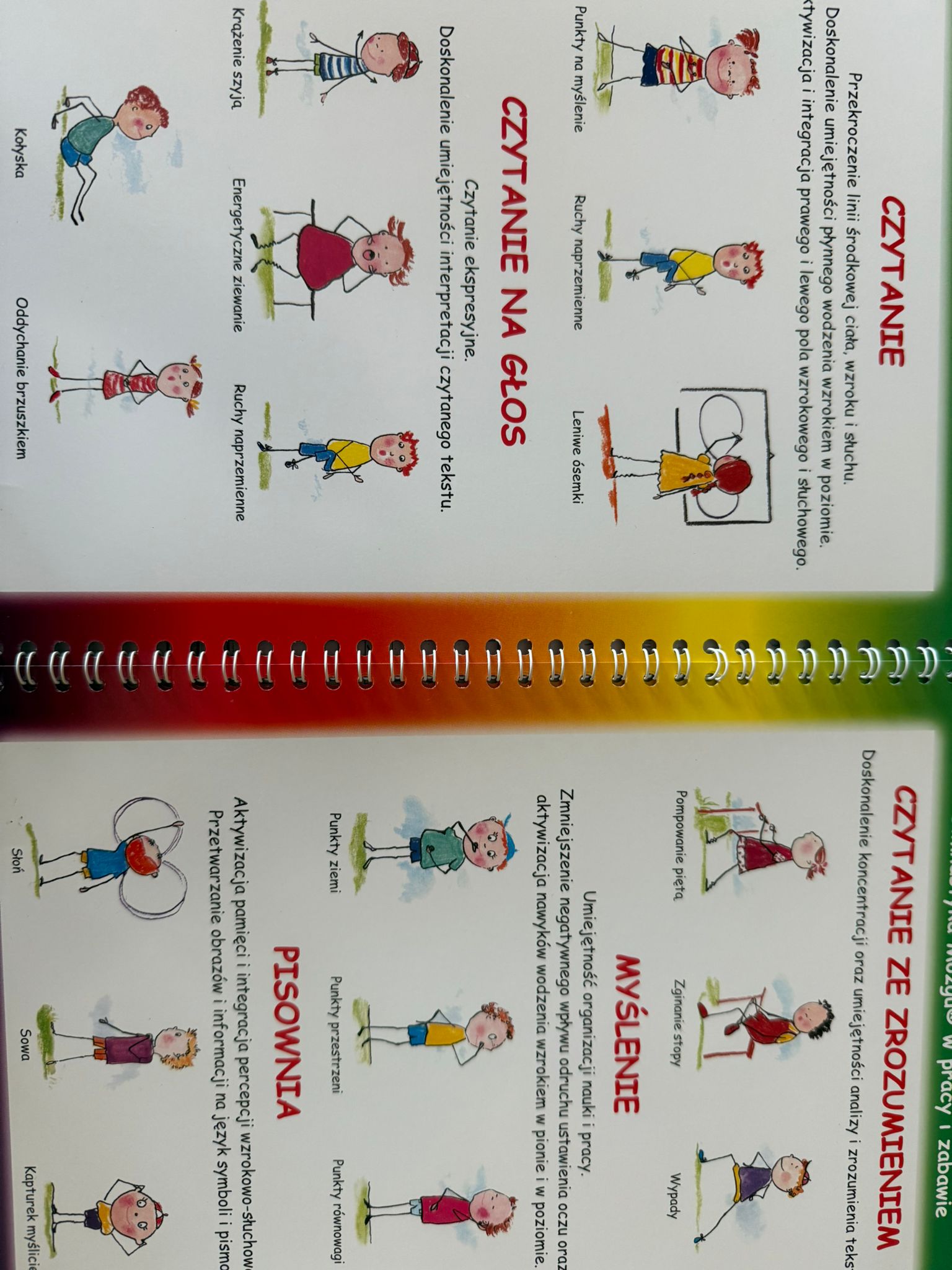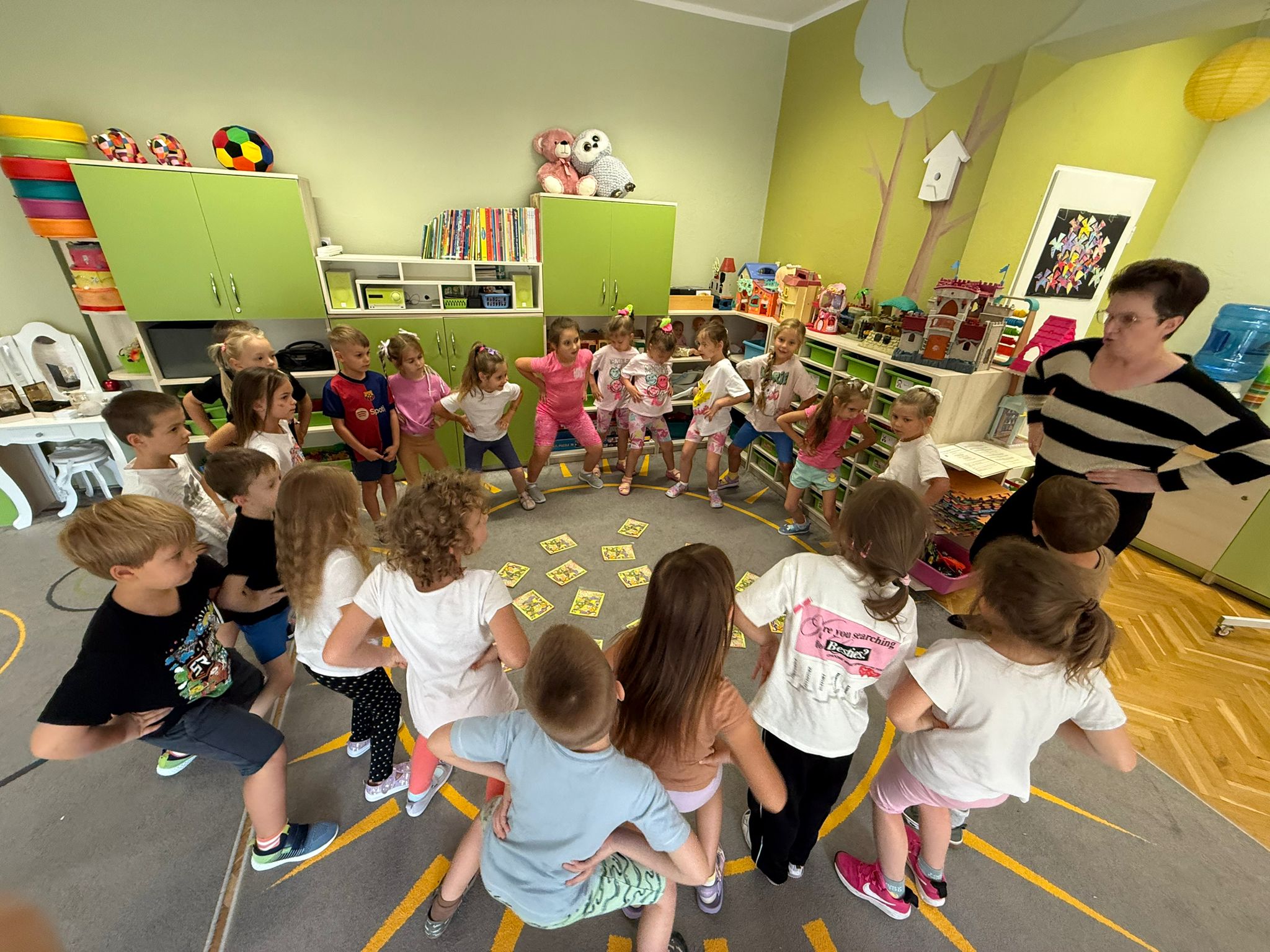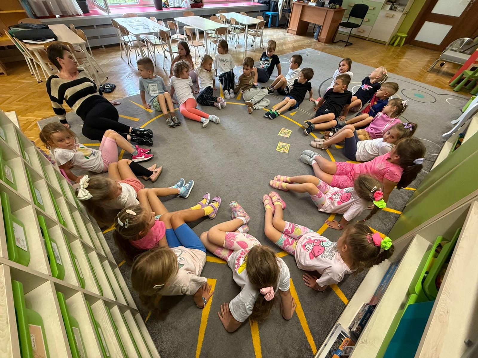 Od czterech lat w naszej grupie z powodzeniem stosujemy metodę Paula Dennisona, łącząc ruch i aktywność fizyczną z nauką. Na początku dzieci w wieku czterech lat uczyły się podstawowych ćwiczeń integrujących półkule mózgu, a obecnie, jako sześciolatkowie, kontynuują te działania, rozwijając, koncentrację i umiejętności poznawcze. Celem metody jest wspieranie integracji obu półkul mózgowych, poprawa koordynacji i równowagi, rozwijanie umiejętności motorycznych i koncentracji, wspomaganie procesu uczenia się i zapamiętywania, budowanie pewności siebie i pozytywnego nastawienia do nauki. Dzieci, dzięki regularnym ćwiczeniom, stają się bardziej skoncentrowane, lepiej radzą sobie z zadaniami wymagającymi precyzji i kreatywności, a także czerpią radość z nauki i zabawy. Dzięki tej metodzie dzieciom łatwiej jest osiągnąć dojrzałość szkolną, co pozytywnie wpływa na ich gotowość do nauki w przyszłości.