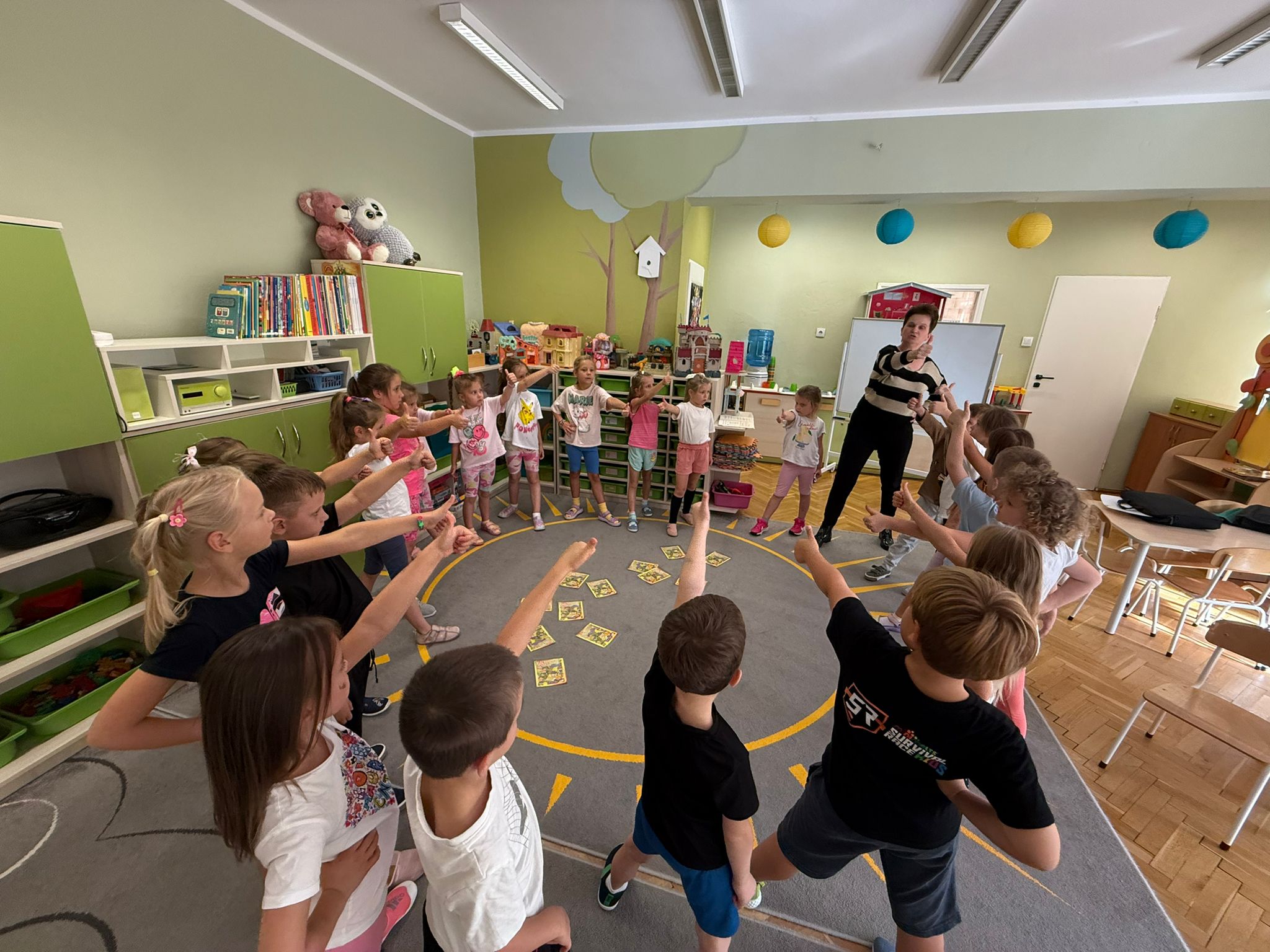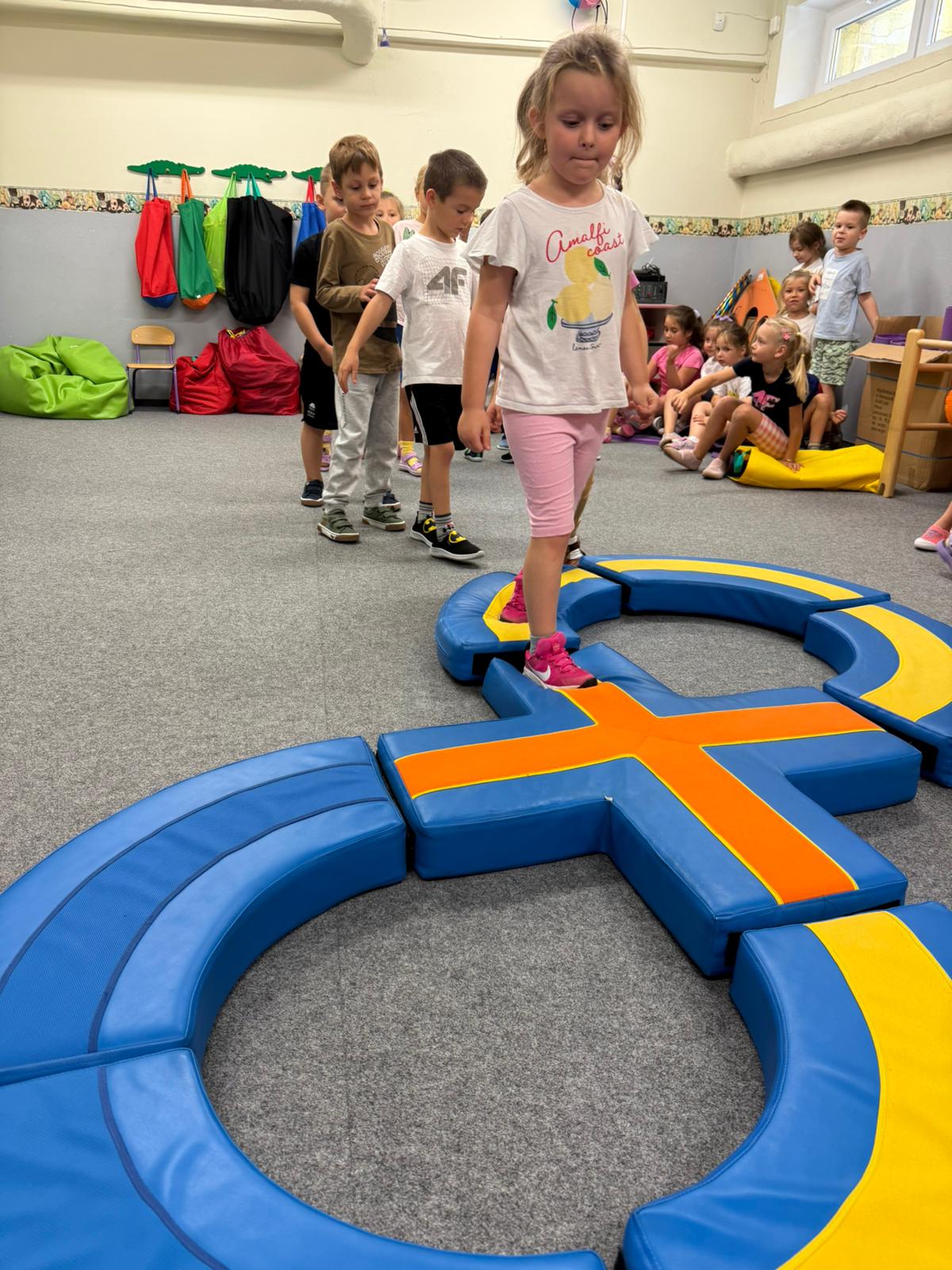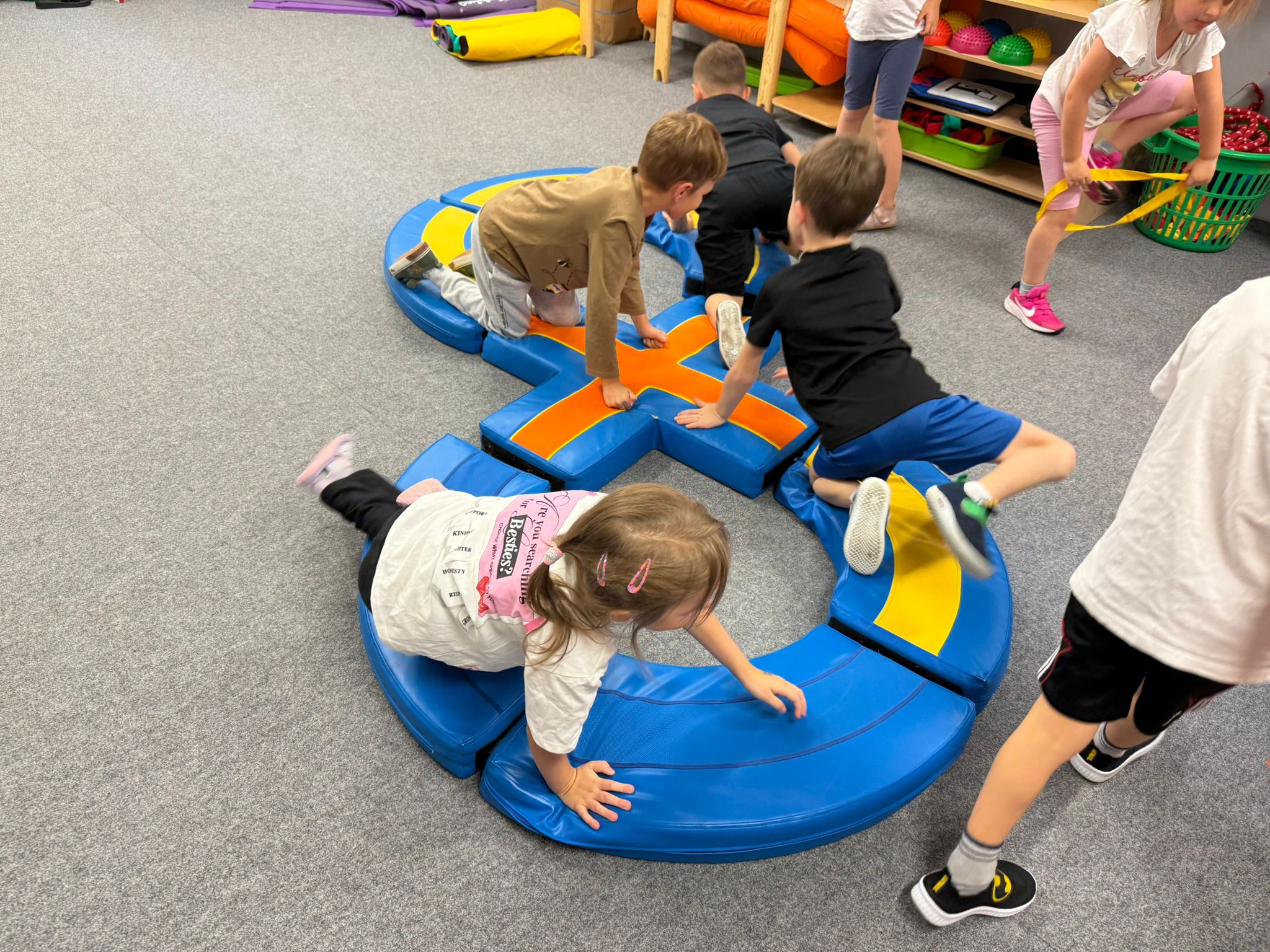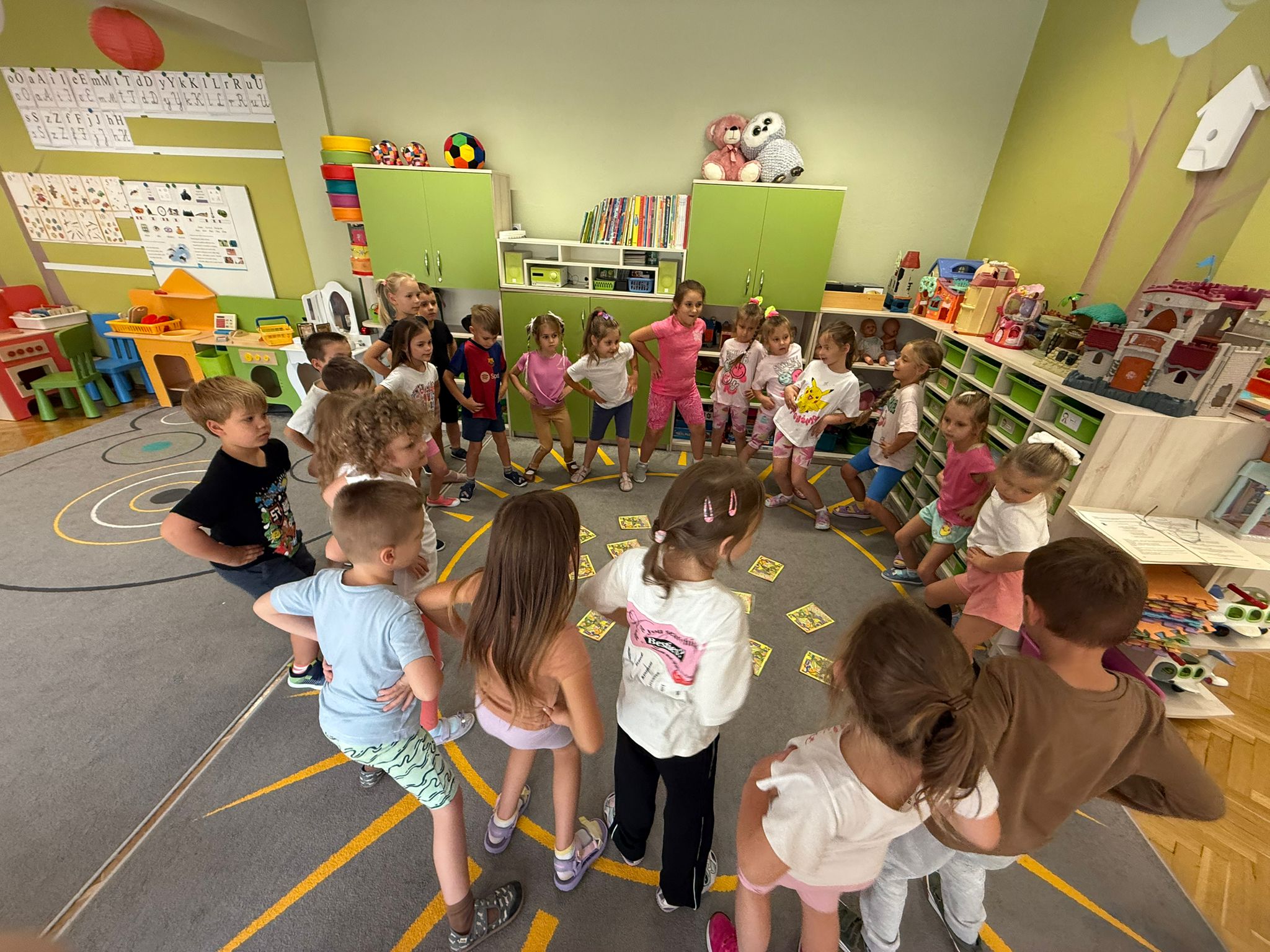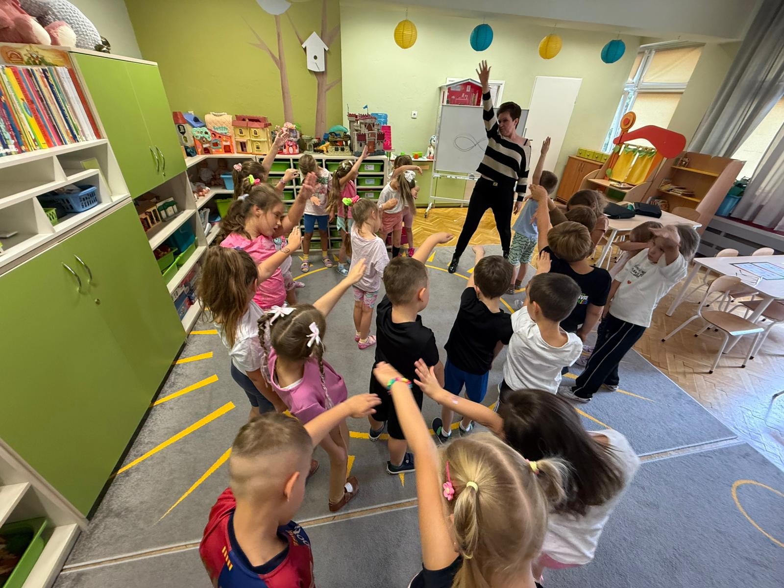 Od czterech lat w naszej grupie z powodzeniem stosujemy metodę Paula Dennisona, łącząc ruch i aktywność fizyczną z nauką. Na początku dzieci w wieku czterech lat uczyły się podstawowych ćwiczeń integrujących półkule mózgu, a obecnie, jako sześciolatkowie, kontynuują te działania, rozwijając, koncentrację i umiejętności poznawcze. Celem metody jest wspieranie integracji obu półkul mózgowych, poprawa koordynacji i równowagi, rozwijanie umiejętności motorycznych i koncentracji, wspomaganie procesu uczenia się i zapamiętywania, budowanie pewności siebie i pozytywnego nastawienia do nauki. Dzieci, dzięki regularnym ćwiczeniom, stają się bardziej skoncentrowane, lepiej radzą sobie z zadaniami wymagającymi precyzji i kreatywności, a także czerpią radość z nauki i zabawy. Dzięki tej metodzie dzieciom łatwiej jest osiągnąć dojrzałość szkolną, co pozytywnie wpływa na ich gotowość do nauki w przyszłości.