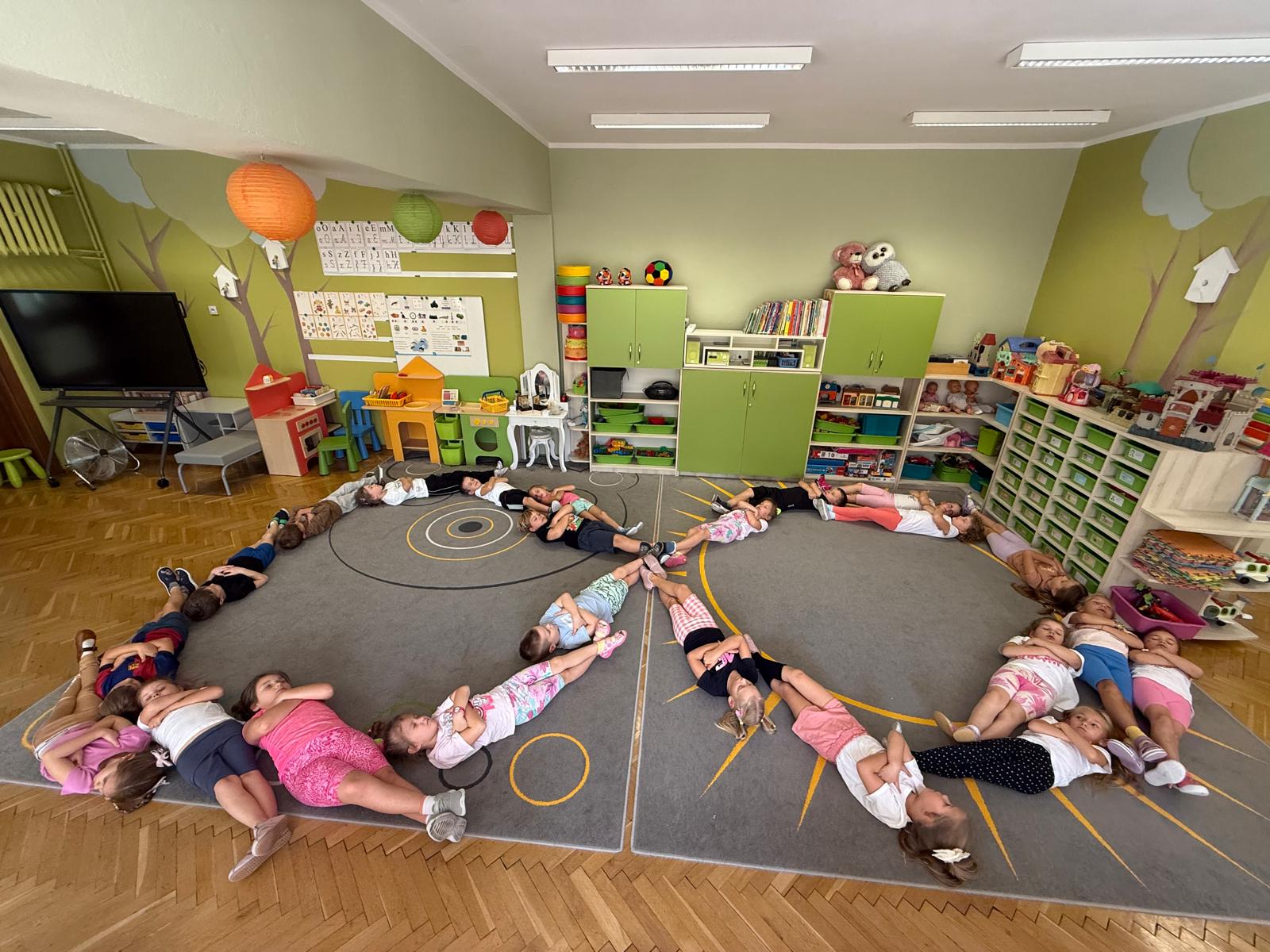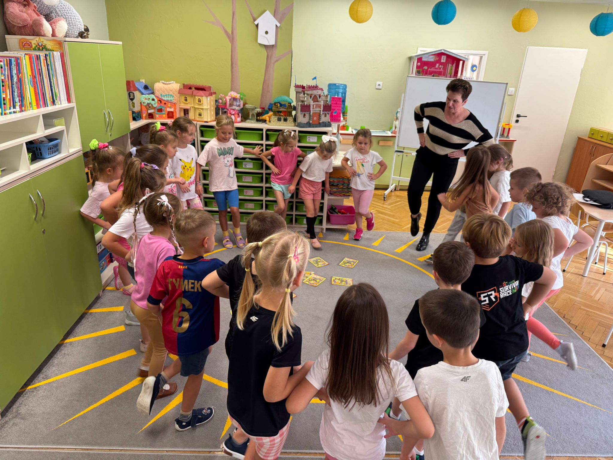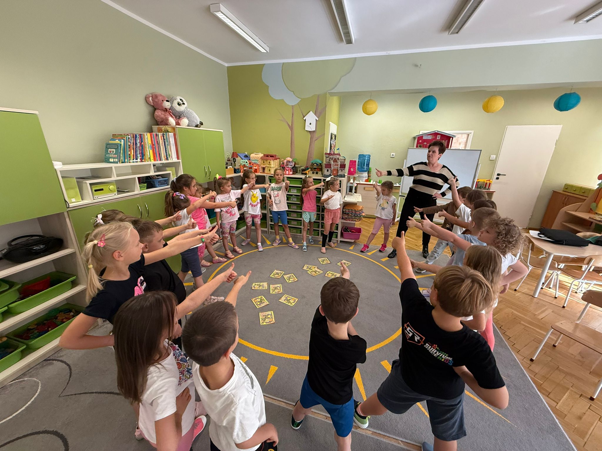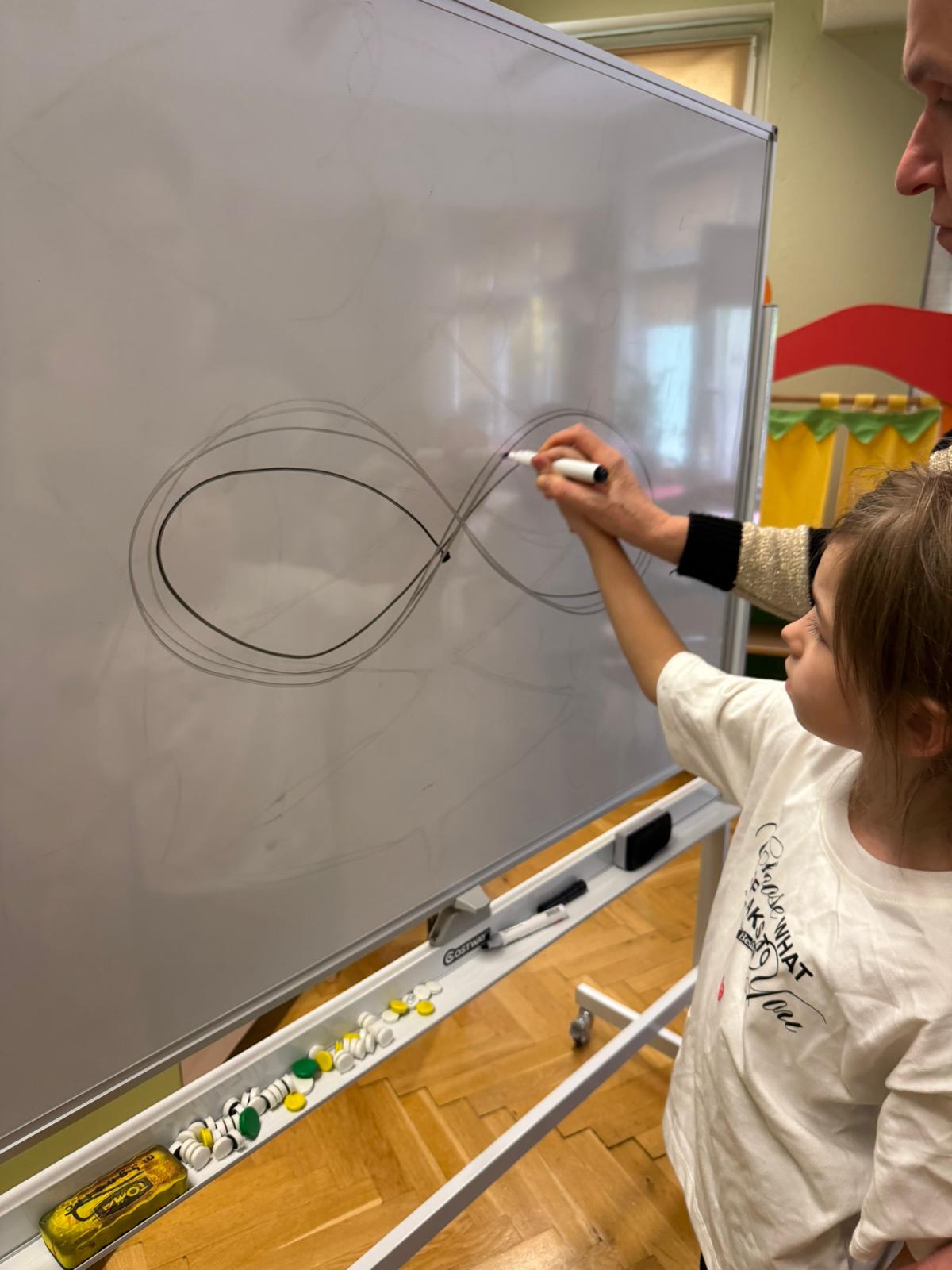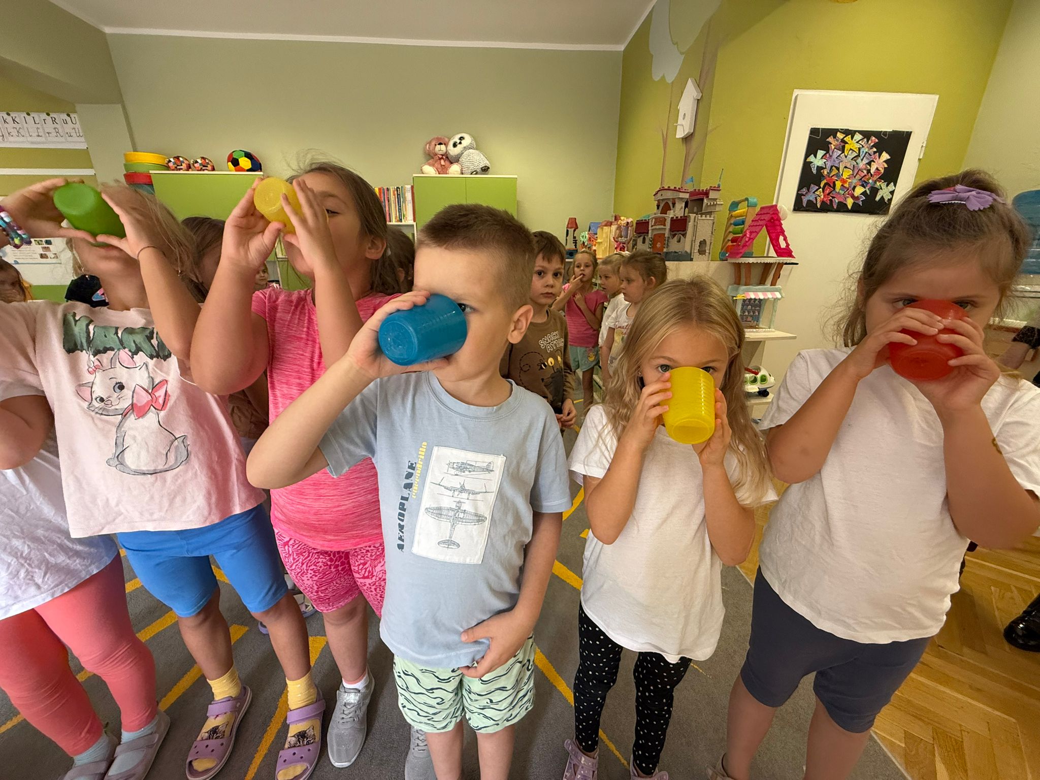 Od czterech lat w naszej grupie z powodzeniem stosujemy metodę Paula Dennisona, łącząc ruch i aktywność fizyczną z nauką. Na początku dzieci w wieku czterech lat uczyły się podstawowych ćwiczeń integrujących półkule mózgu, a obecnie, jako sześciolatkowie, kontynuują te działania, rozwijając, koncentrację i umiejętności poznawcze. Celem metody jest wspieranie integracji obu półkul mózgowych, poprawa koordynacji i równowagi, rozwijanie umiejętności motorycznych i koncentracji, wspomaganie procesu uczenia się i zapamiętywania, budowanie pewności siebie i pozytywnego nastawienia do nauki. Dzieci, dzięki regularnym ćwiczeniom, stają się bardziej skoncentrowane, lepiej radzą sobie z zadaniami wymagającymi precyzji i kreatywności, a także czerpią radość z nauki i zabawy. Dzięki tej metodzie dzieciom łatwiej jest osiągnąć dojrzałość szkolną, co pozytywnie wpływa na ich gotowość do nauki w przyszłości.