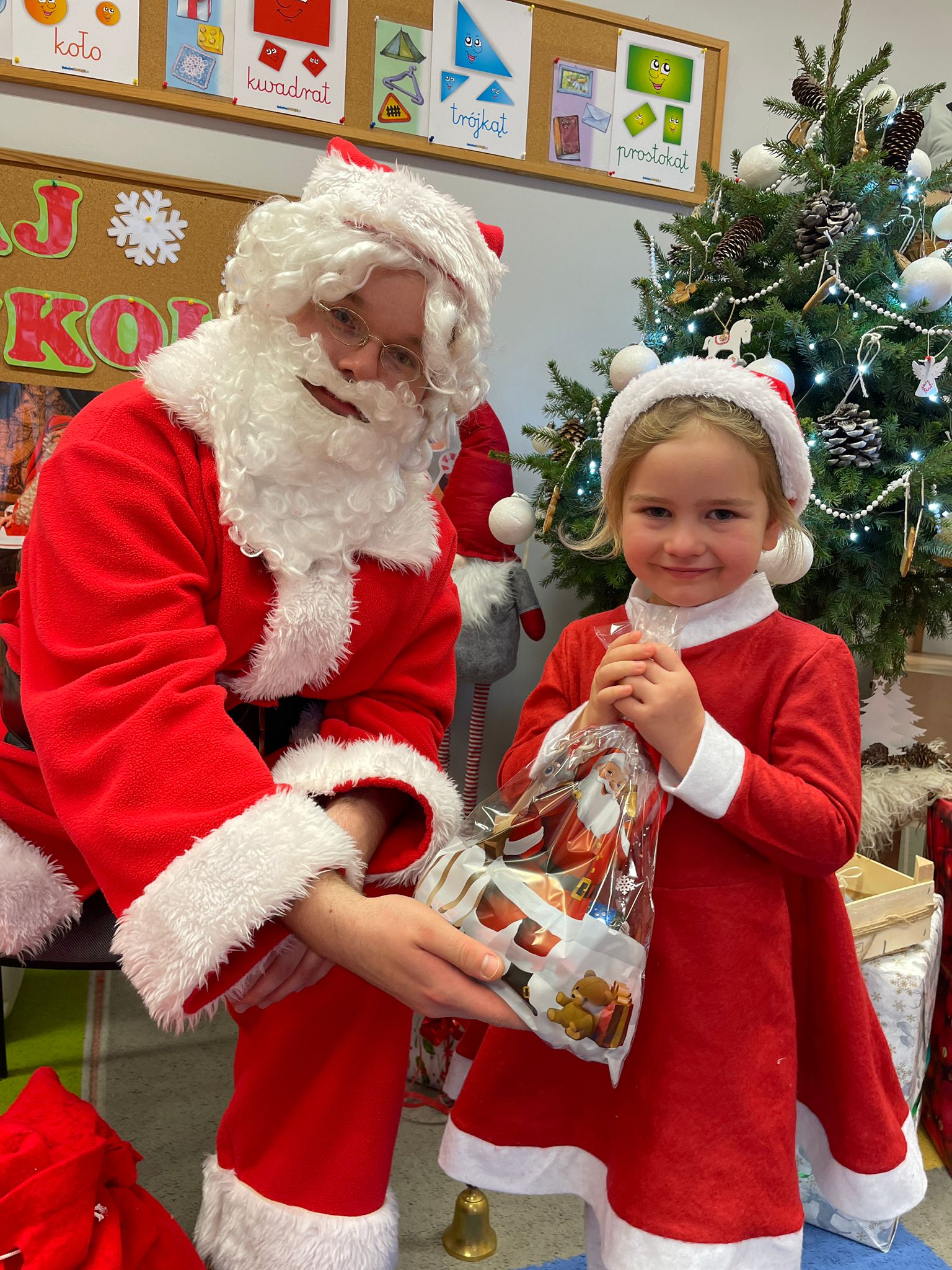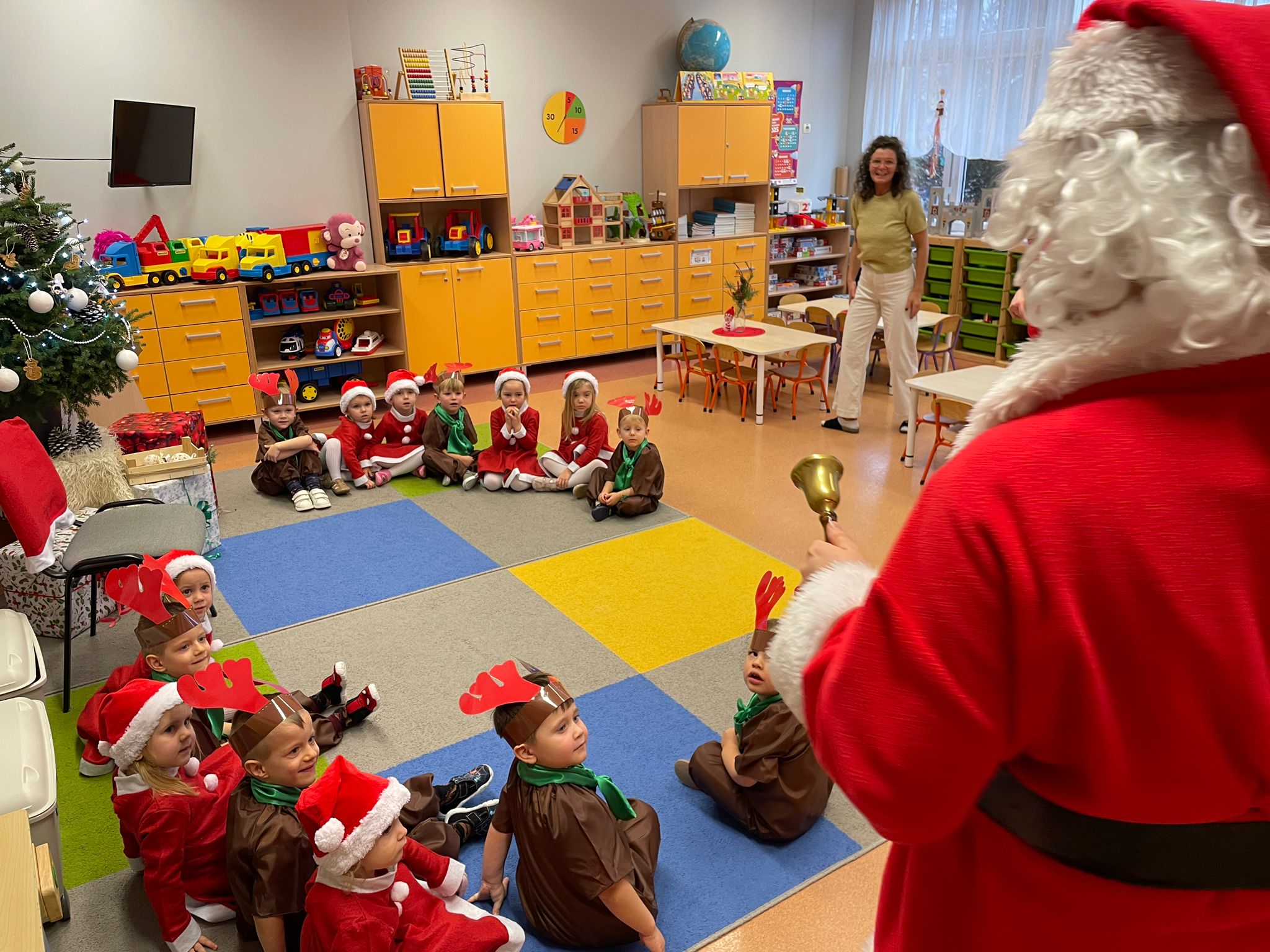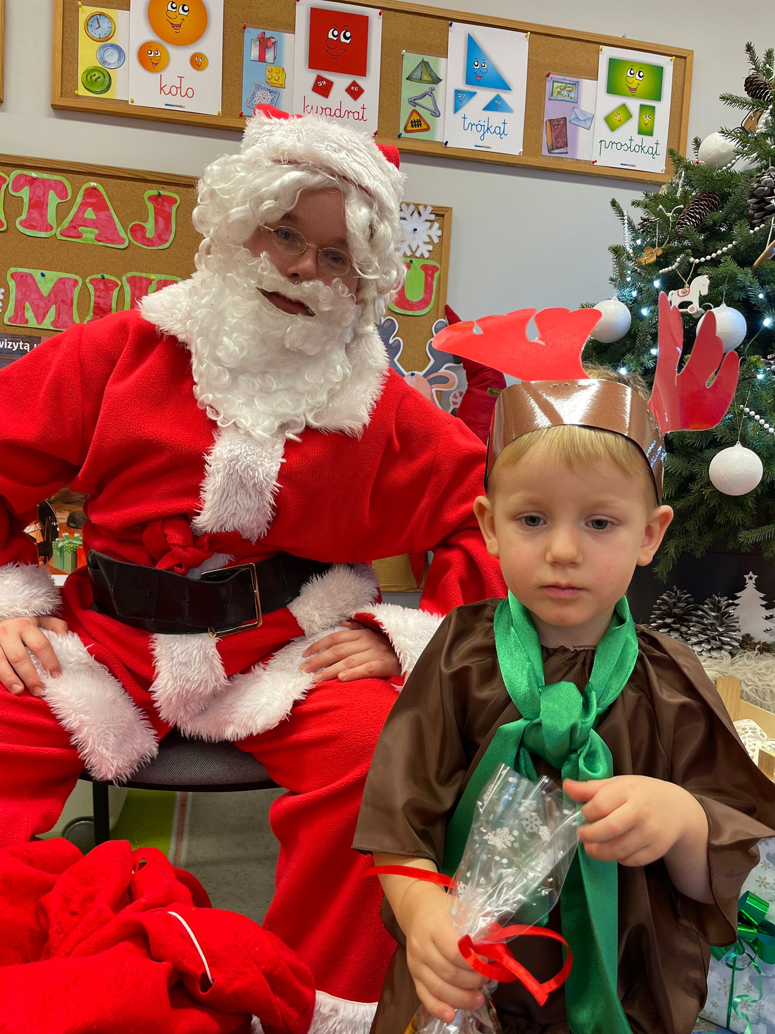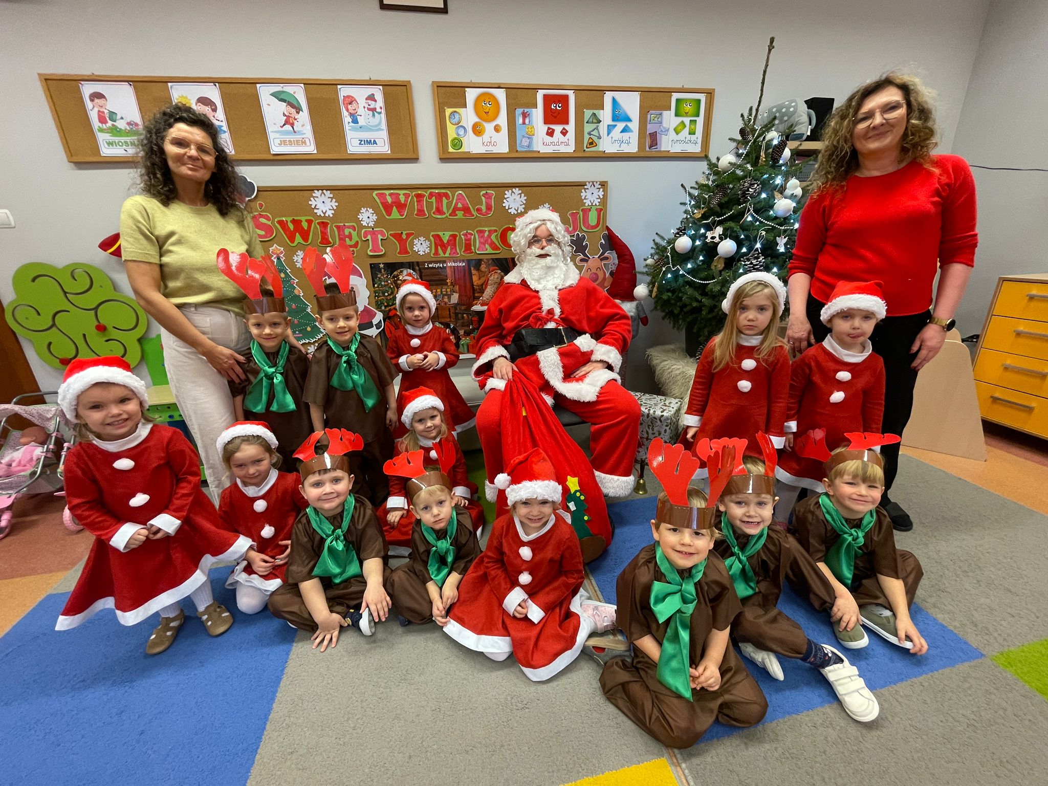 Dziś maluszki z niecierpliwością oczekiwały na wizytę Świętego Mikołaja w naszej przedszkolnej sali. Wszystkie dzieci już od samego rana spoglądały w okno, nasłuchiwały „Mikołajowych” dzwoneczków i radosną piosenką zapraszały Mikołaja. Wyczarowały także świąteczny klimat i wspólnie ubrały choinkę, przy której później wesoło się bawiły. Święty Mikołaj nie zawiódł i i nie kazał długo na siebie czekać… Wszedł ze swoim tubalnym „Ho, Ho, Ho „…I z pewnością też był bardzo zadowolony ze spotkania, bo uśmiech nie znikał z jego twarzy. Dzieci długo wspominały chwile spędzone z Mikołajem, z dużym entuzjazmem rozpakowywały prezenty oraz zerkały przez okno z nadzieją, że jeszcze raz zobaczą naszego gościa i pomachają mu na pożegnanie.