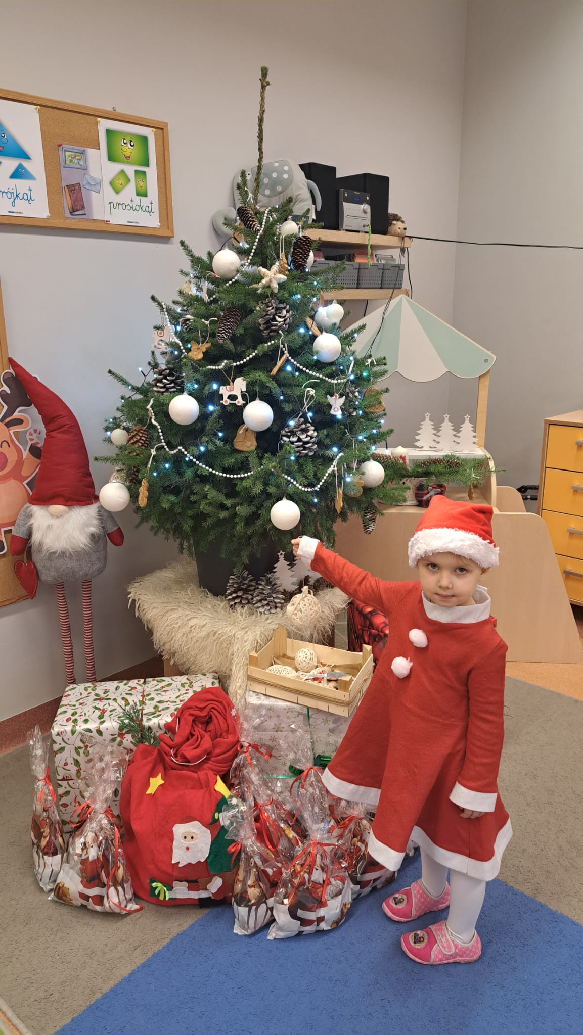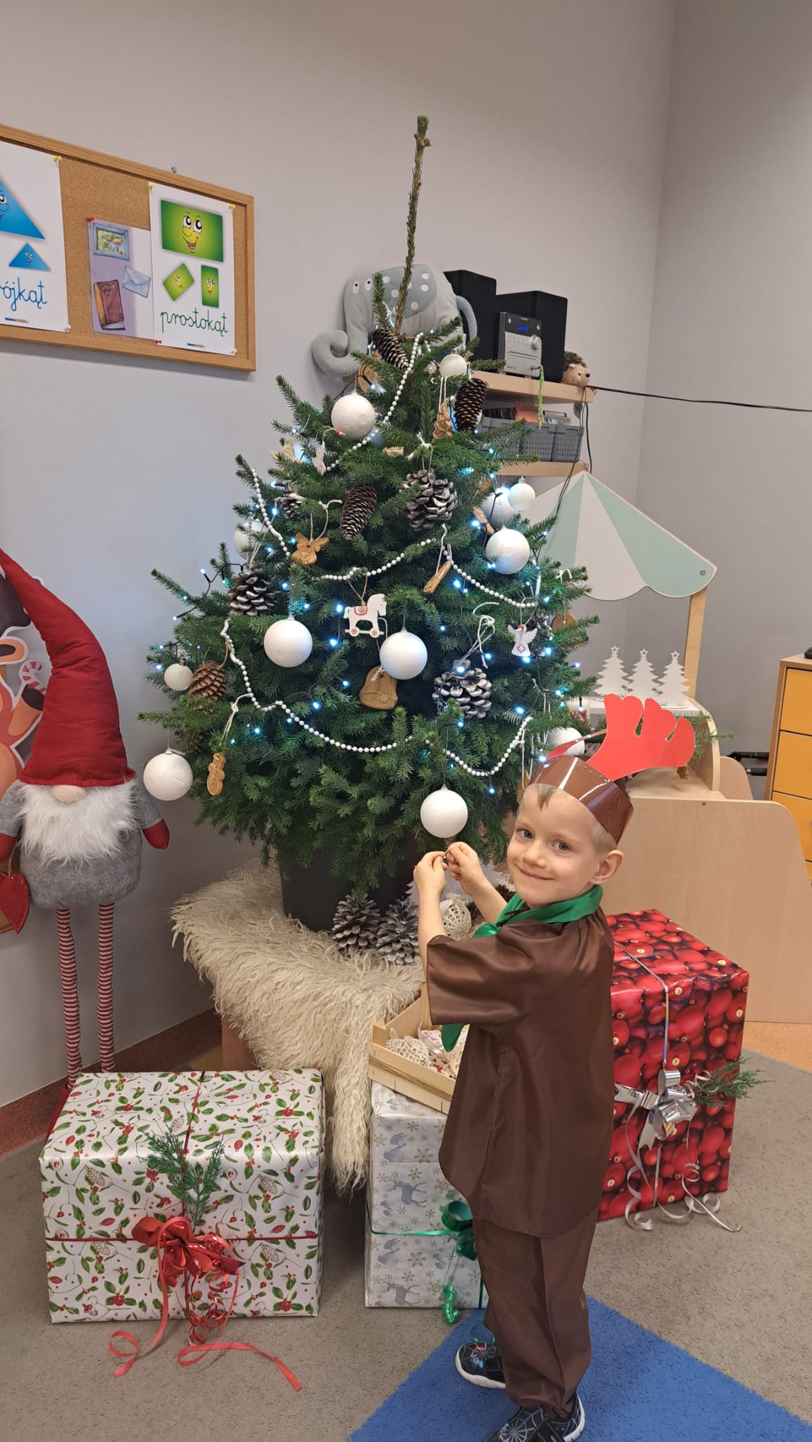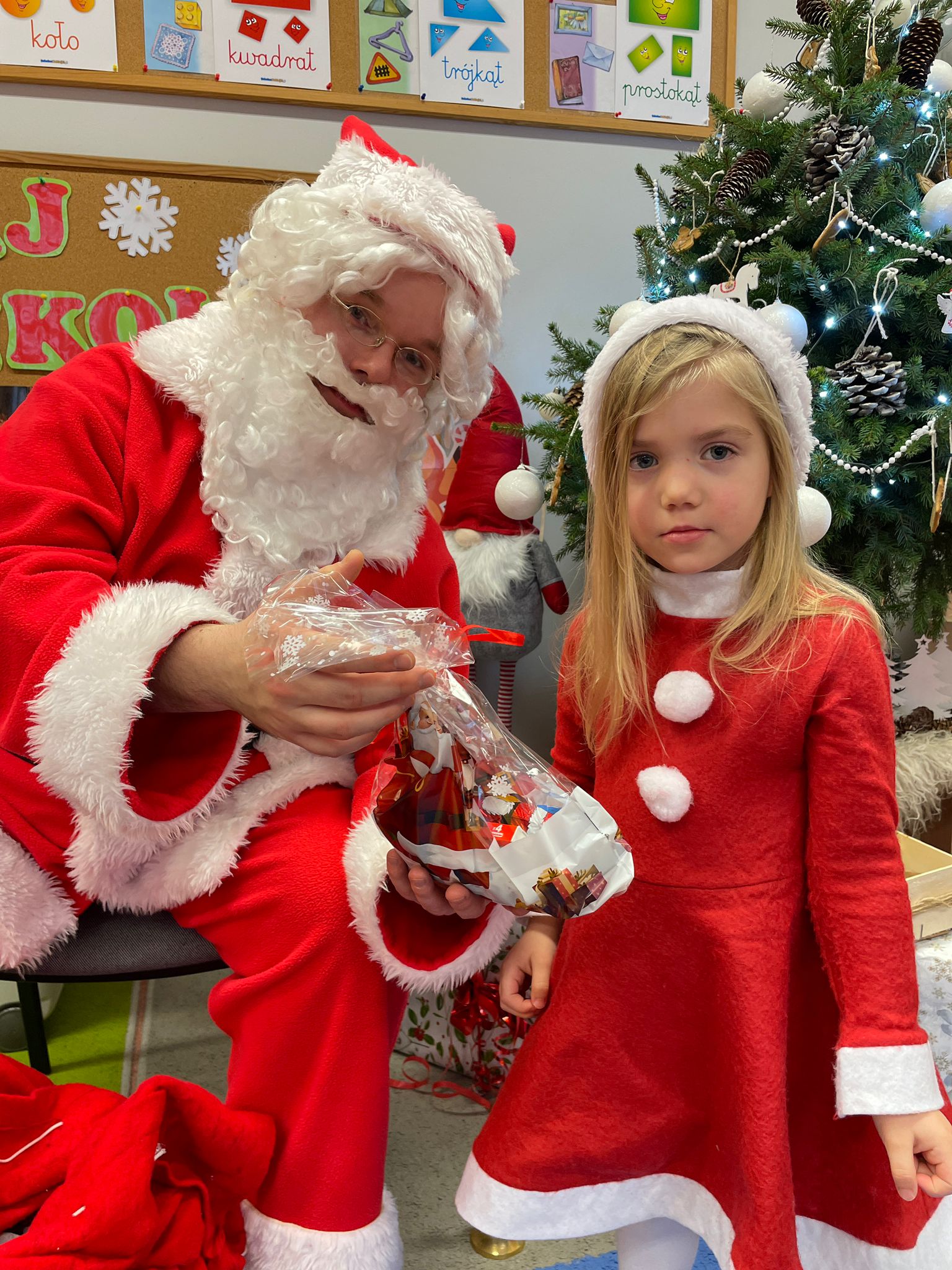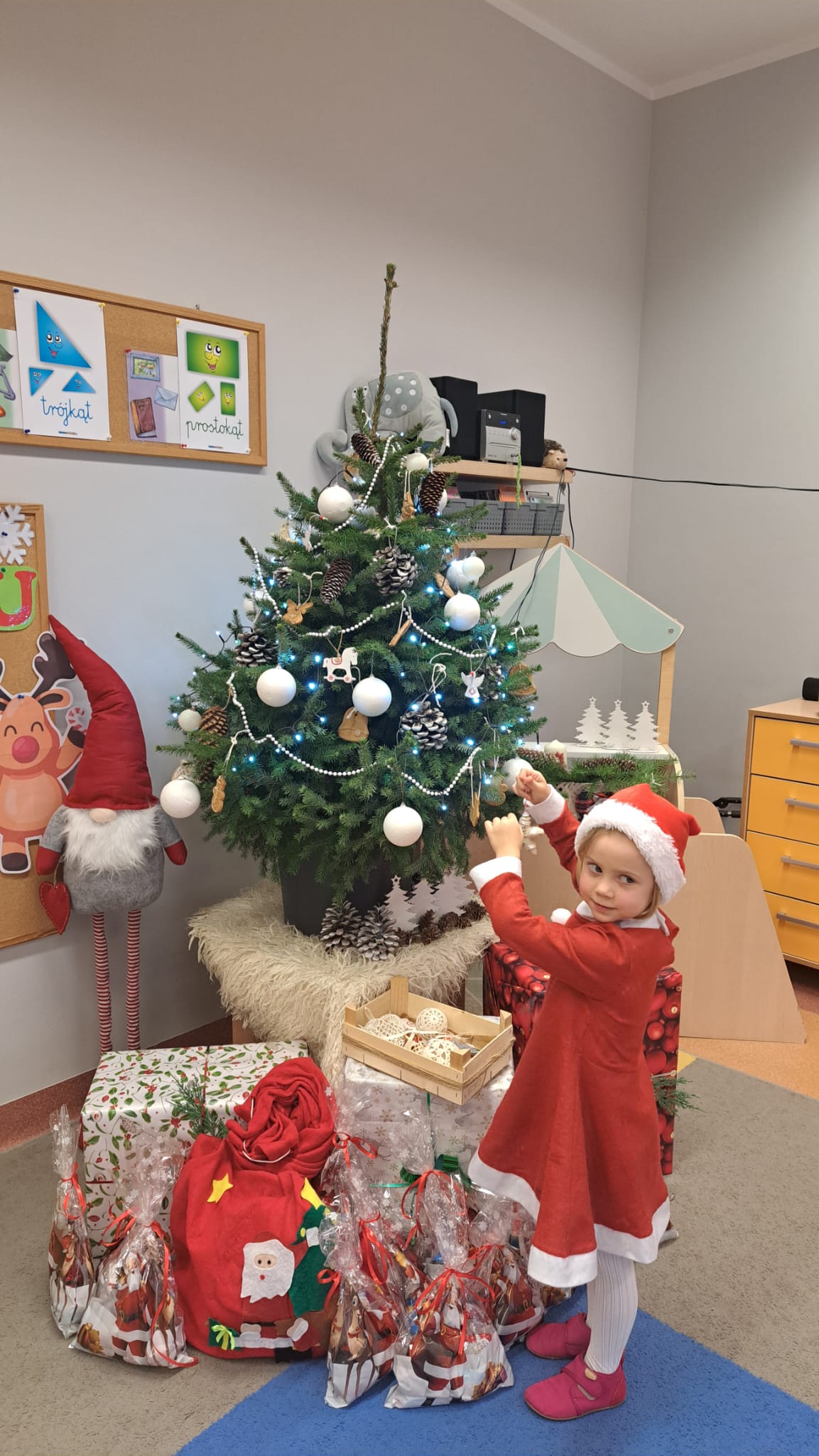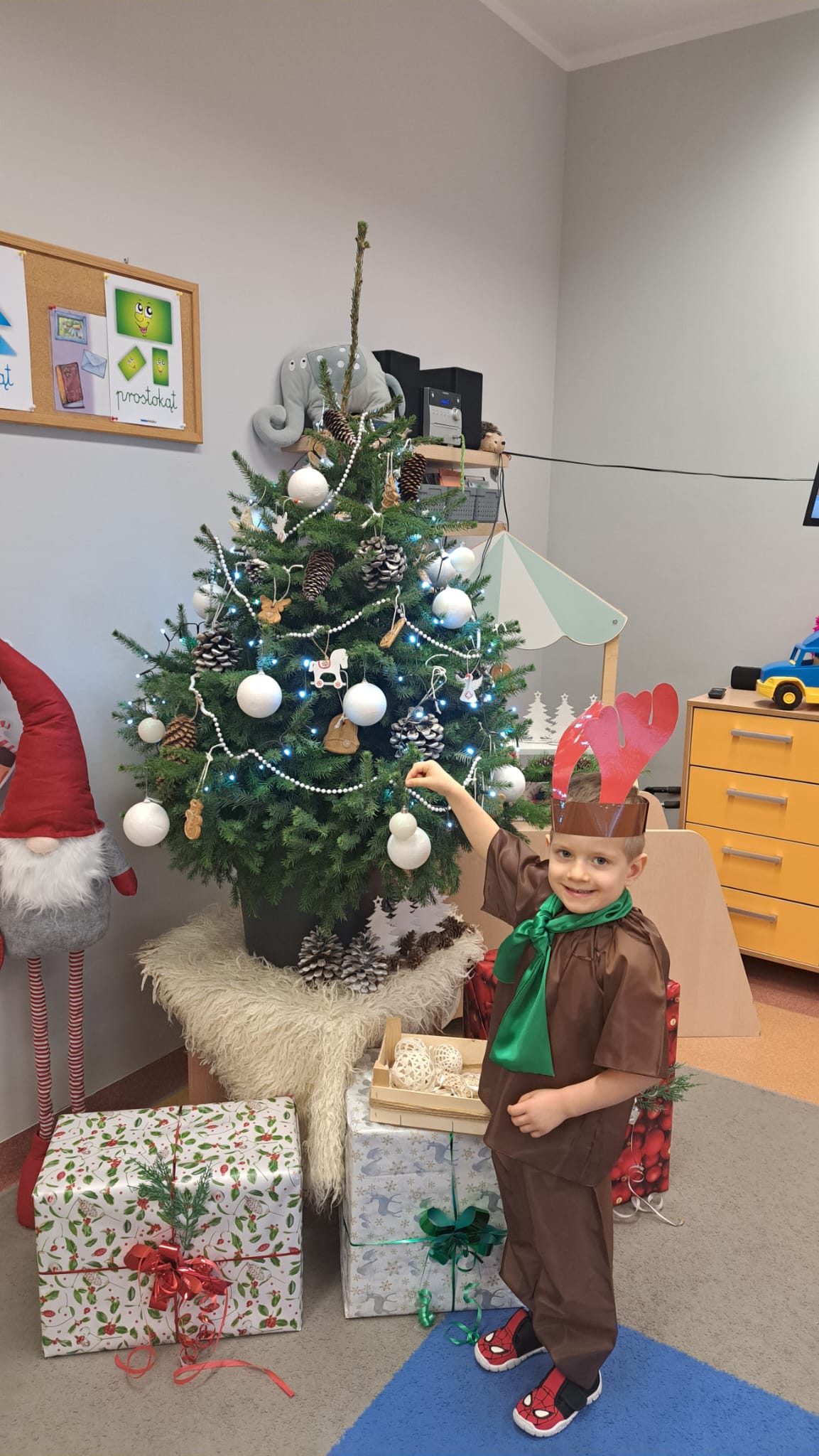 Dziś maluszki z niecierpliwością oczekiwały na wizytę Świętego Mikołaja w naszej przedszkolnej sali. Wszystkie dzieci już od samego rana spoglądały w okno, nasłuchiwały „Mikołajowych” dzwoneczków i radosną piosenką zapraszały Mikołaja. Wyczarowały także świąteczny klimat i wspólnie ubrały choinkę, przy której później wesoło się bawiły. Święty Mikołaj nie zawiódł i i nie kazał długo na siebie czekać… Wszedł ze swoim tubalnym „Ho, Ho, Ho „…I z pewnością też był bardzo zadowolony ze spotkania, bo uśmiech nie znikał z jego twarzy. Dzieci długo wspominały chwile spędzone z Mikołajem, z dużym entuzjazmem rozpakowywały prezenty oraz zerkały przez okno z nadzieją, że jeszcze raz zobaczą naszego gościa i pomachają mu na pożegnanie.