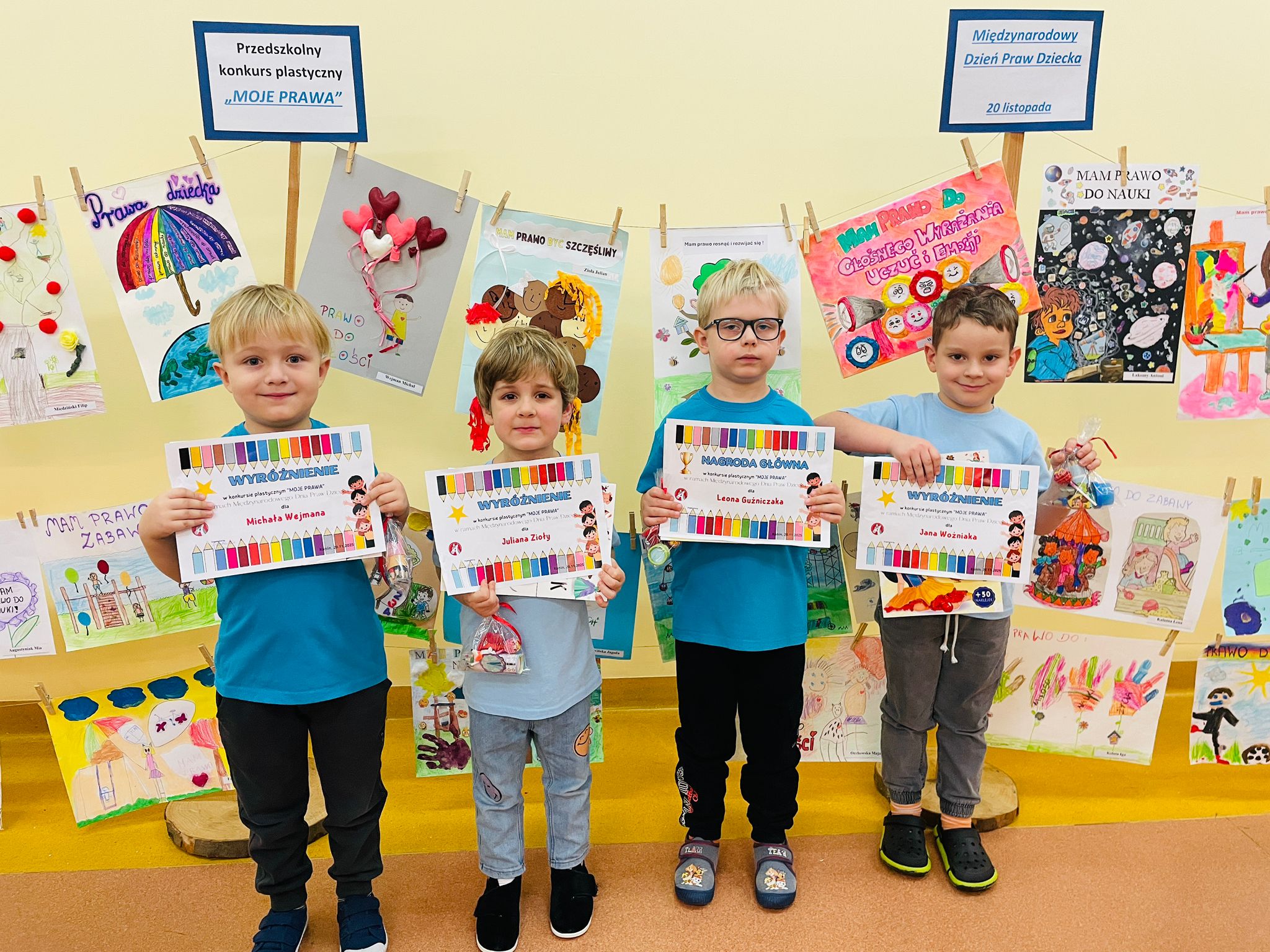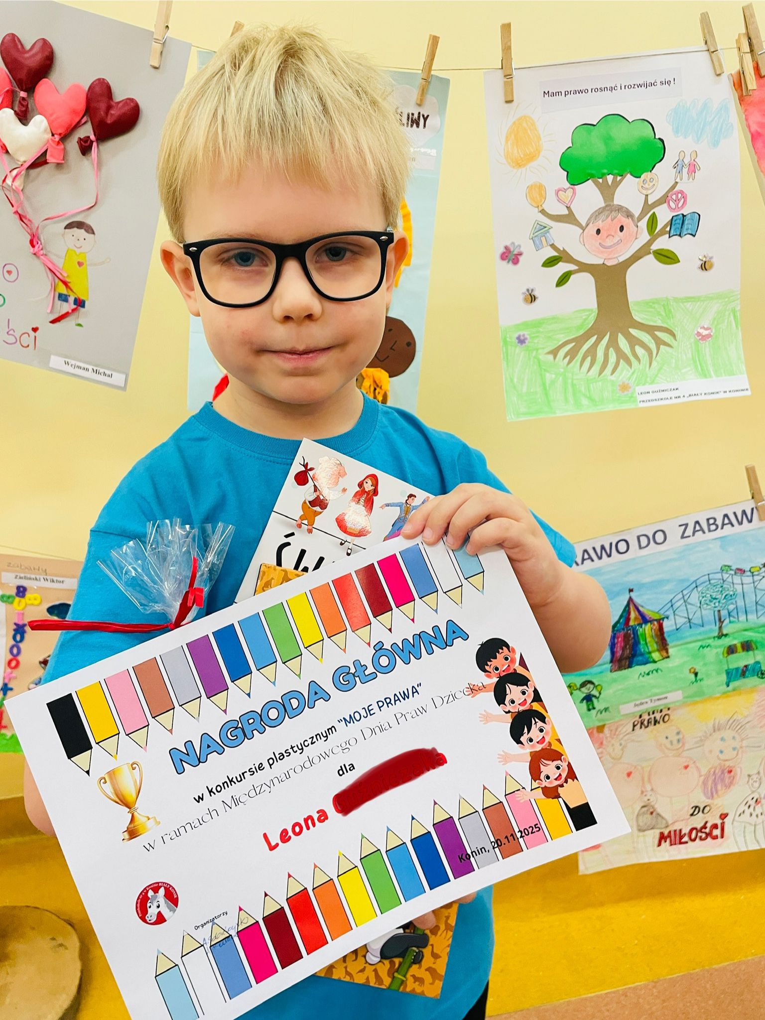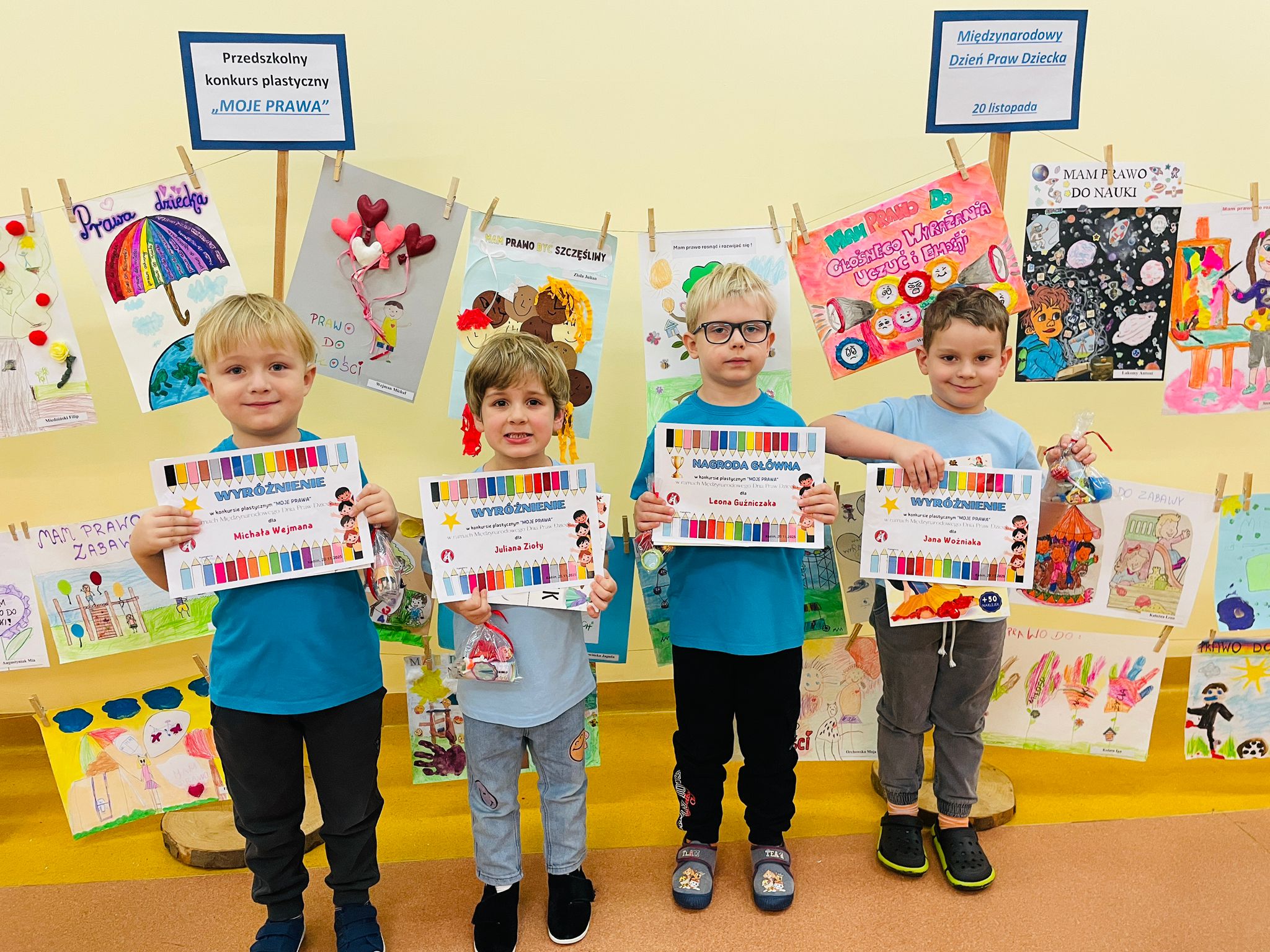 Z okazji listopadowego Międzynarodowego Dnia Praw Dziecka w Białym koniki zorganizowany został konkurs plastyczny "Moje prawa". Wzięły w nim udział dzieci z grupy XI i XII. Celem akcji było promowanie wiedzy o prawach dziecka oraz rozwijanie twórczej ekspresji najmłodszych. Uczestnicy przygotowywali swoje prace w domu, wykazując się dużą kreatywnością i wrażliwością. Wszystkie dzieci zostały docenione za wkład pracy i podjęcie się tego działania. Każdy z nich otrzymał drobne nagrody za udział. Trzy prace naszych przedszkolaków otrzymały wyróżnienie. Natomiast praca Leona G. z gr. XI została wybrana, jako najlepiej wpisująca się w tematykę konkursu i będzie ją można zobaczyć wyświetlaną na ekranach autobusów miejskiej komunikacji w Koninie. Dziękujemy dzieciom za zaangażowanie, a rodzicom za wsparcie. Gratulujemy wszystkim uczestnikom i laureatom!