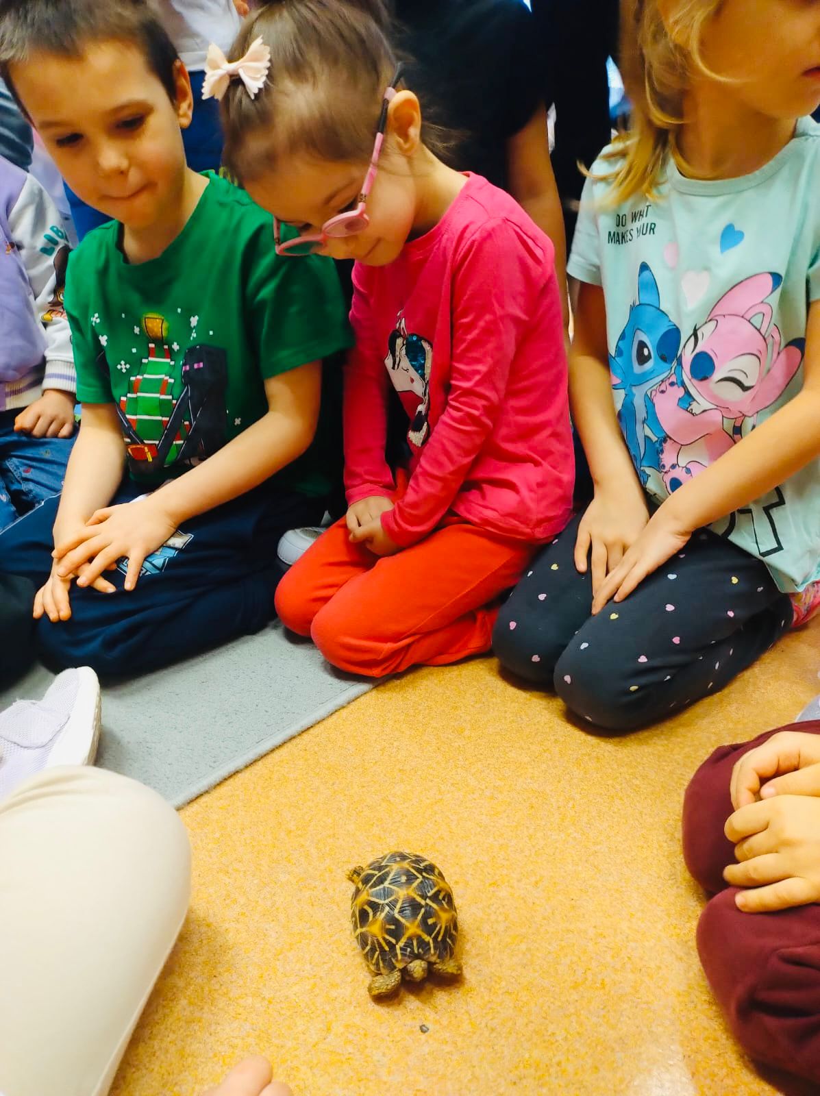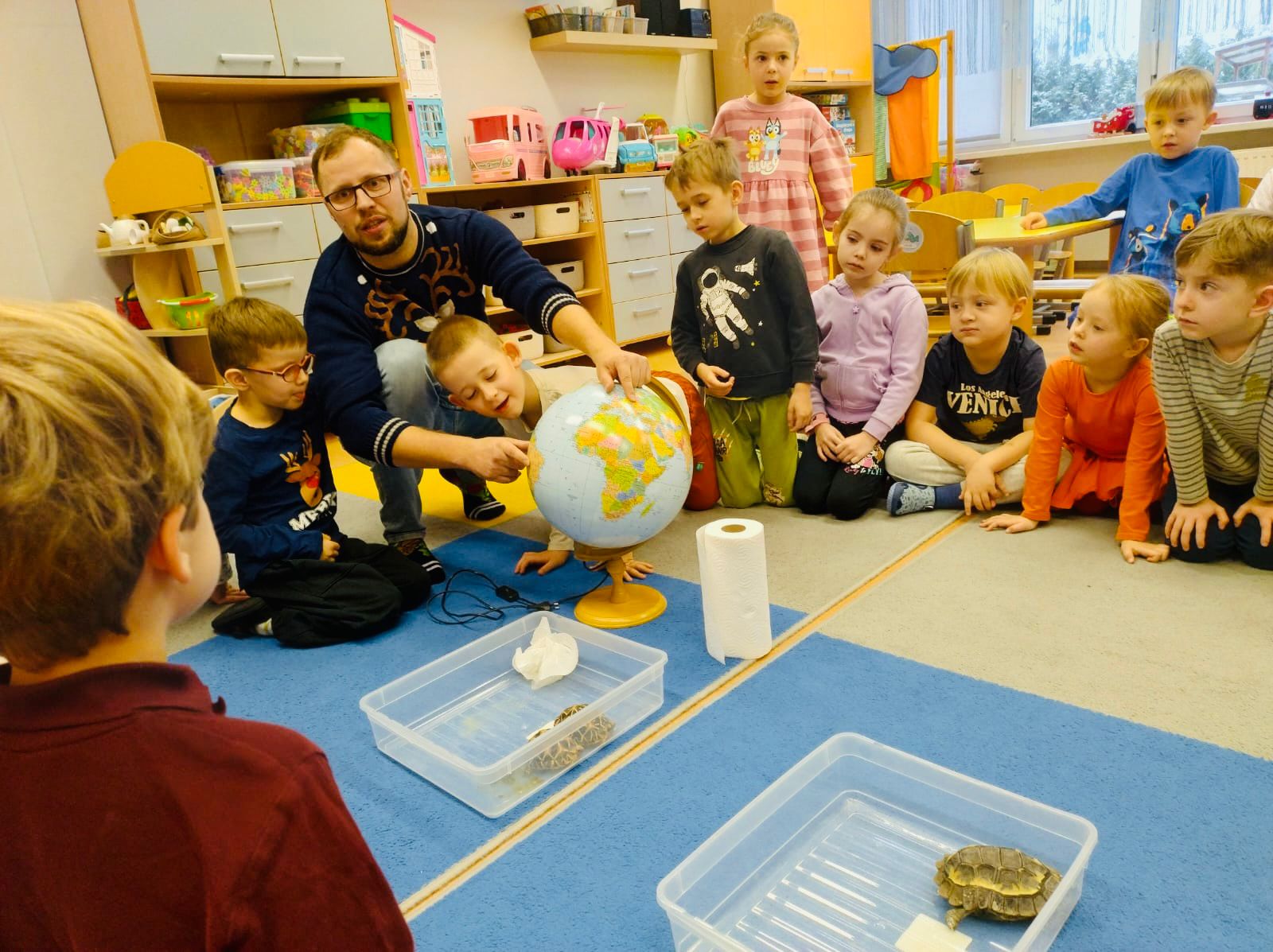 Dziś dzieci z gr. XI i XII uczestniczyły w niezwykle interesującym spotkaniu. Co sprawiło, że akurat ten czas okazał się tak nietuzinkowy? Goście! Tata naszego Antosia postanowił pochwalić się nam swoją niesamowitą pasją, którą są żółwie. Ma ich aż 7! Te, które przyjechały z nim do naszego przedszkola okazały się bardzo ciekawskie i towarzyskie, a swoje korzenie mają w najdalszych zakątkach Ziemi, m.in. w Indiach. Pan Damian opowiedział przedszkolakom, jak opiekuje się żółwiami, gdzie na co dzień mieszkają, co jedzą, czy wolą środowisko lądowe, czy wodne i dlaczego w terrarium mają lampy. Te i wiele innych ciekawostek wzbogaciły wiedzę dzieci o otaczającym nas świecie, a przy okazji przedszkolaki doświadczyły prawdziwej lekcji empatii do żywych stworzeń. Serdecznie dziękujemy Panu Damianowi za zorganizowanie nam niezapomnianych zajęć.