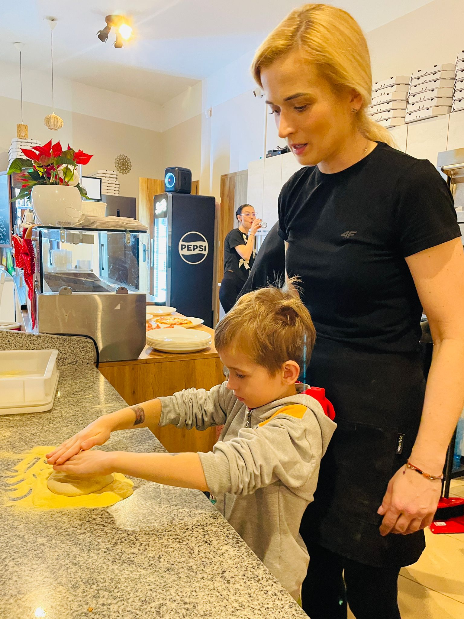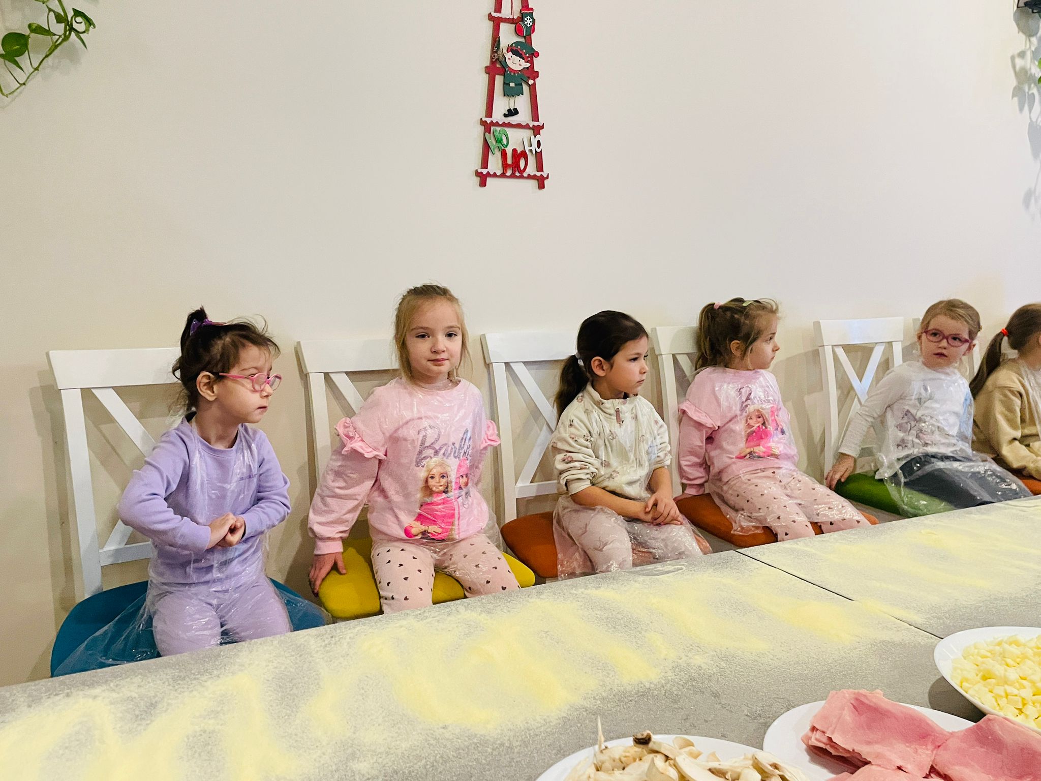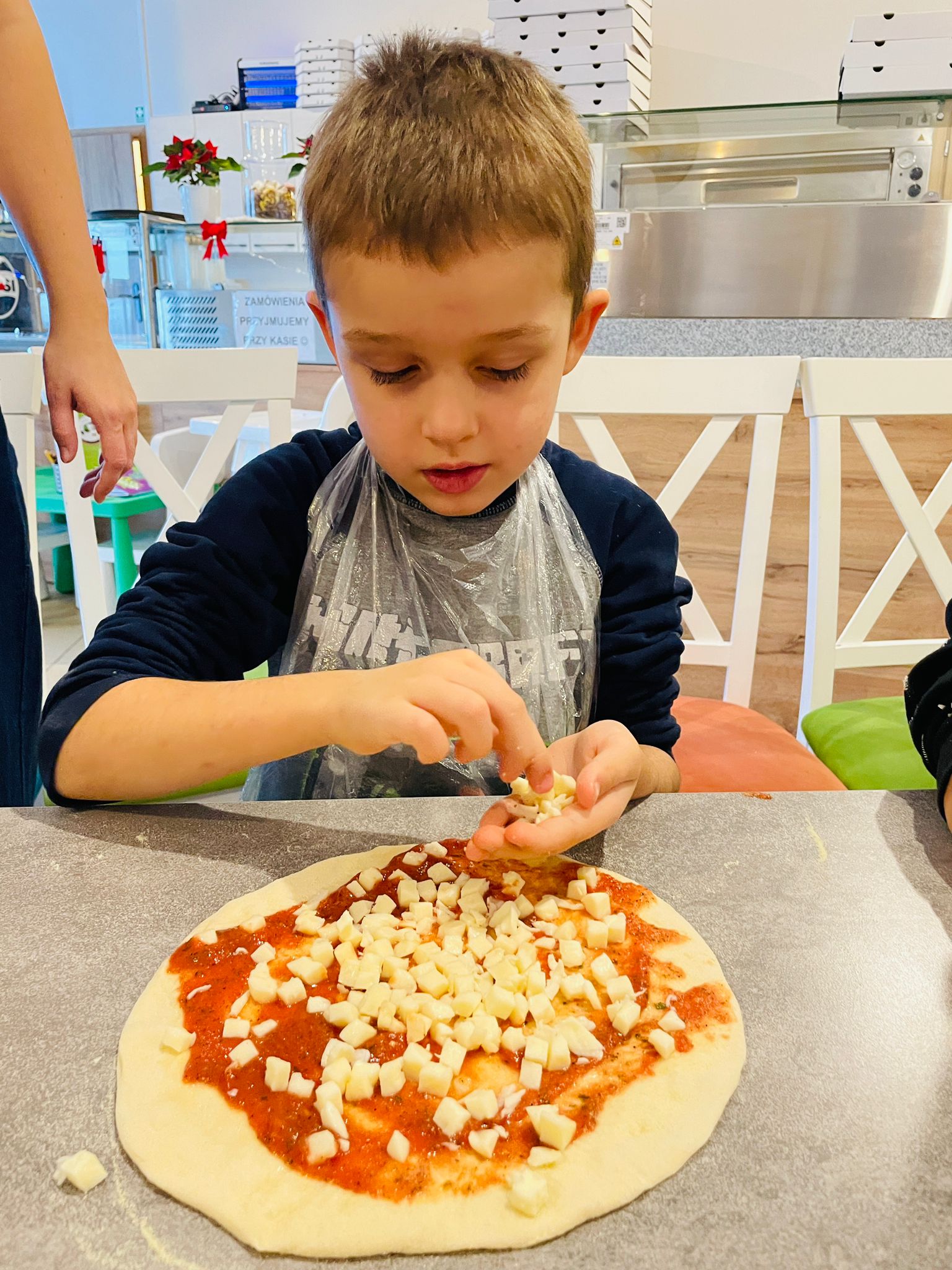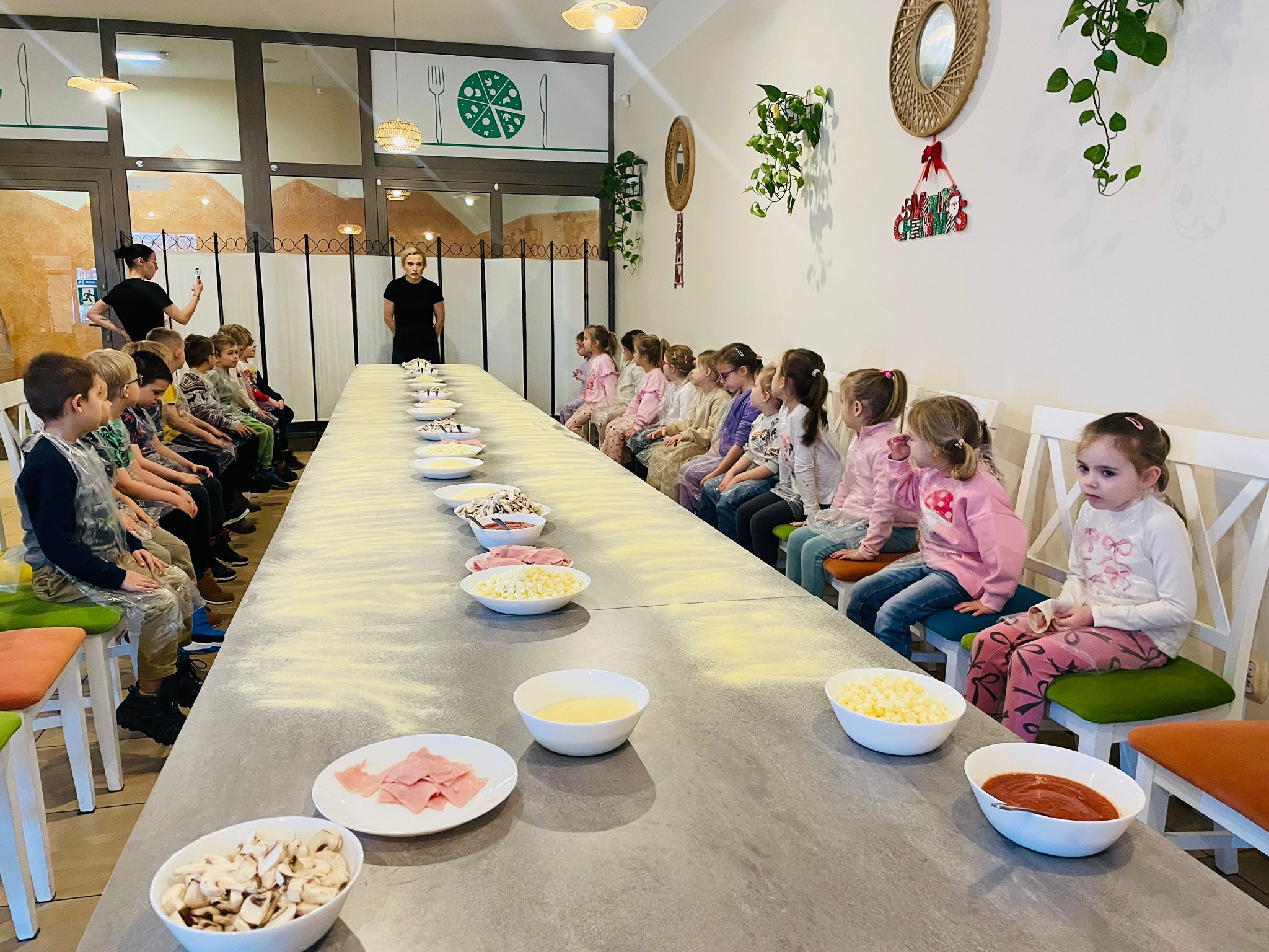 Kolejne kulinarne przygody za nami. Przedszkolaki z gr. XI miały okazję uczestniczyć w warsztatach z robienia pizzy organizowanych w pobliskiej Restauracji "Osiedlowa". Na początku szefowa kuchni- p. Ania, przybliżyła dzieciom historię pizzy. Następnie do akcji wkroczył p. Oliwer- pizzerman, który pokazał dzieciom, jak przejść do części praktycznej. Chłopcy i dziewczynki samodzielnie sypali mąkę, wyrabiali ciasto, a na koniec dodawali ulubione smakołyki. Po wypieczeniu pizzy w specjalnym piecu przyszedł czas na pałaszowanie. Dzieci pracowały z niezwykłym zaangażowaniem, a czekając na wypiek zaśpiewały pracownikom restauracji świąteczną piosenkę. To był niezwykle miły czas.