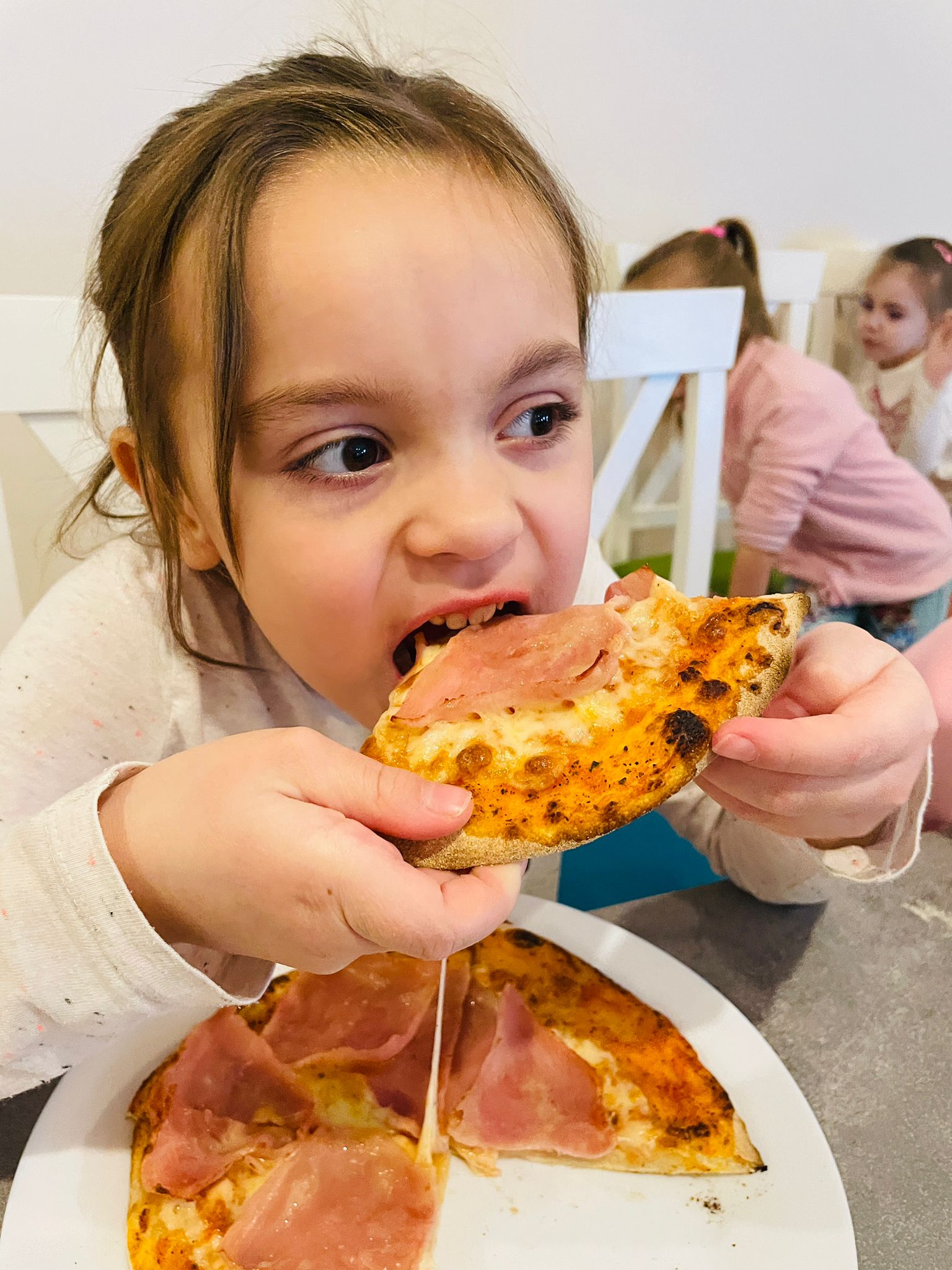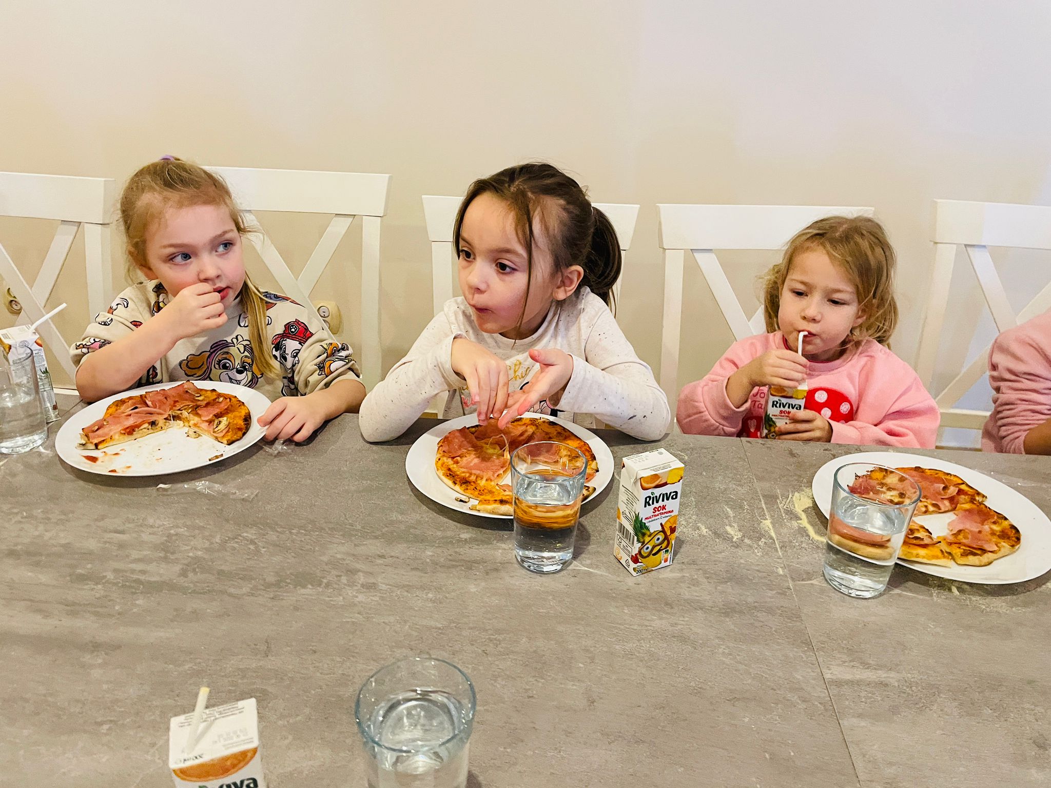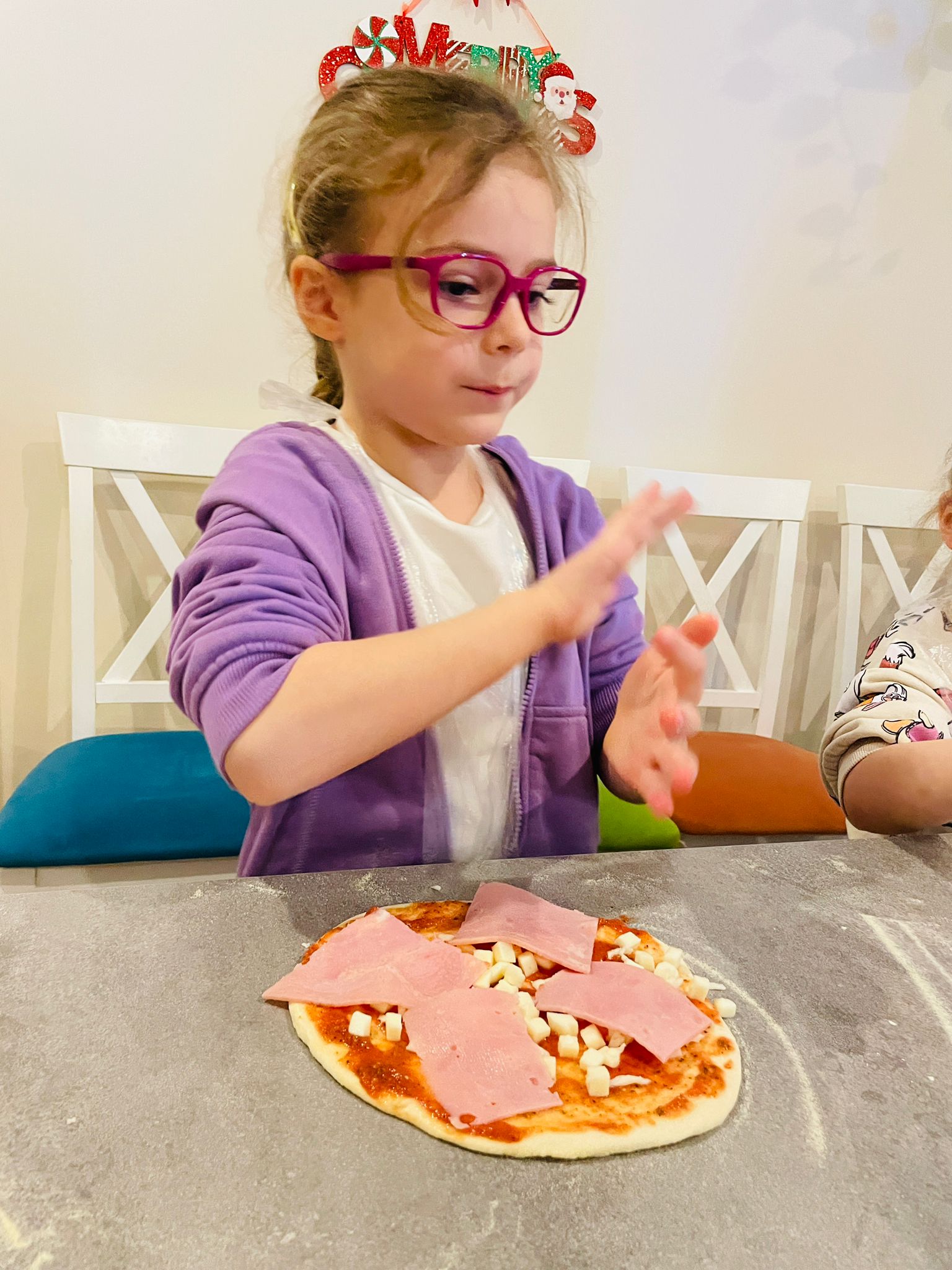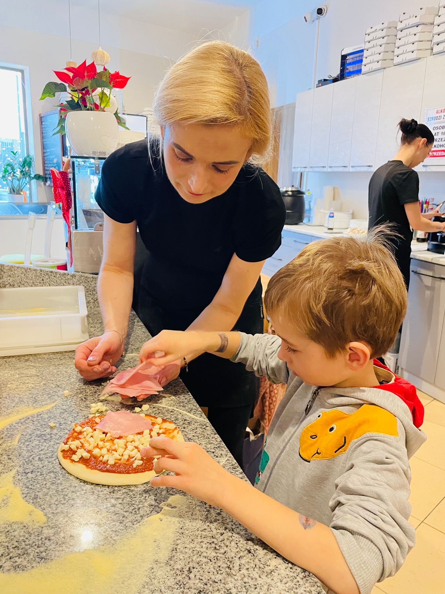 Kolejne kulinarne przygody za nami. Przedszkolaki z gr. XI miały okazję uczestniczyć w warsztatach z robienia pizzy organizowanych w pobliskiej Restauracji "Osiedlowa". Na początku szefowa kuchni- p. Ania, przybliżyła dzieciom historię pizzy. Następnie do akcji wkroczył p. Oliwer- pizzerman, który pokazał dzieciom, jak przejść do części praktycznej. Chłopcy i dziewczynki samodzielnie sypali mąkę, wyrabiali ciasto, a na koniec dodawali ulubione smakołyki. Po wypieczeniu pizzy w specjalnym piecu przyszedł czas na pałaszowanie. Dzieci pracowały z niezwykłym zaangażowaniem, a czekając na wypiek zaśpiewały pracownikom restauracji świąteczną piosenkę. To był niezwykle miły czas.