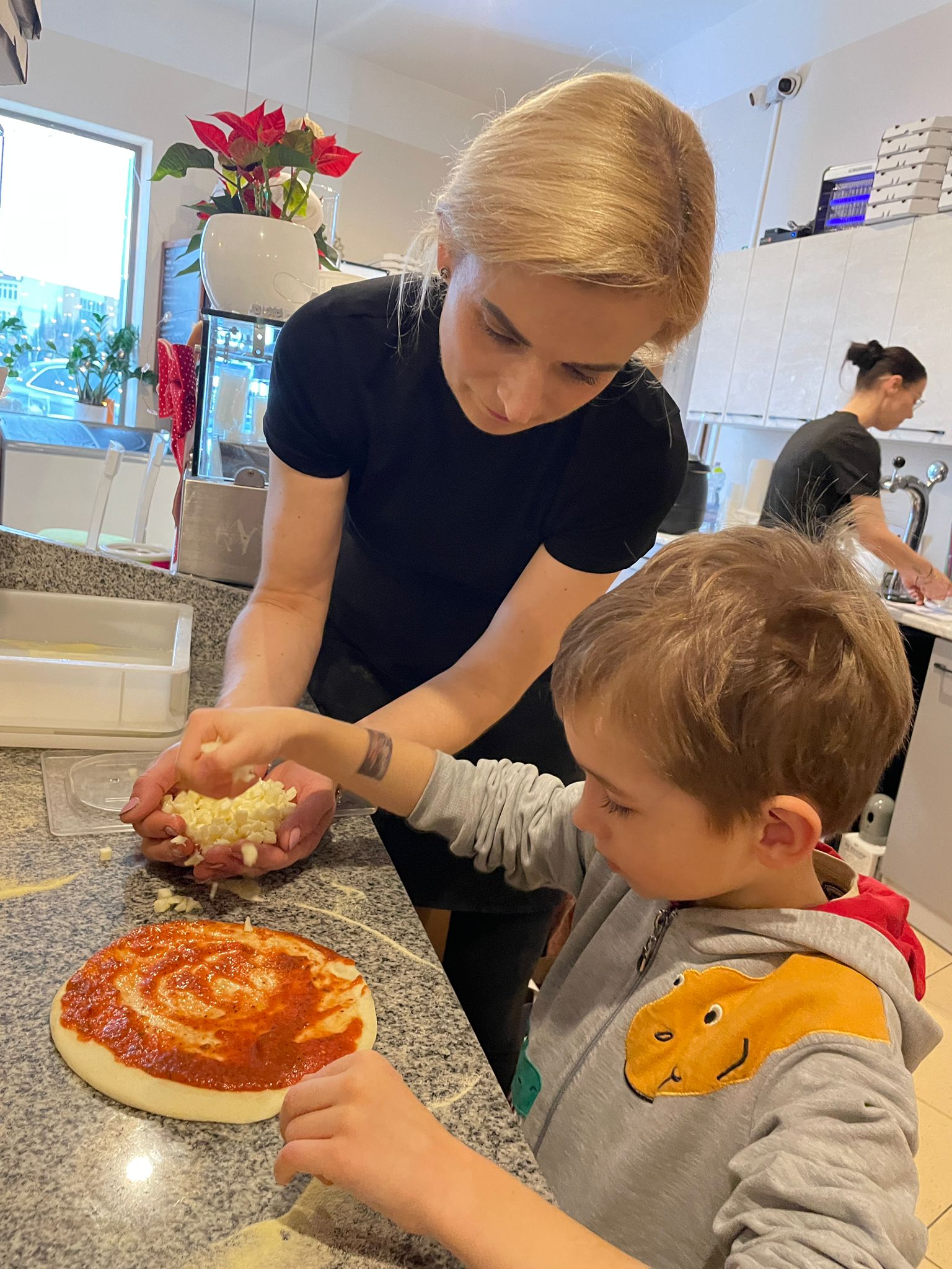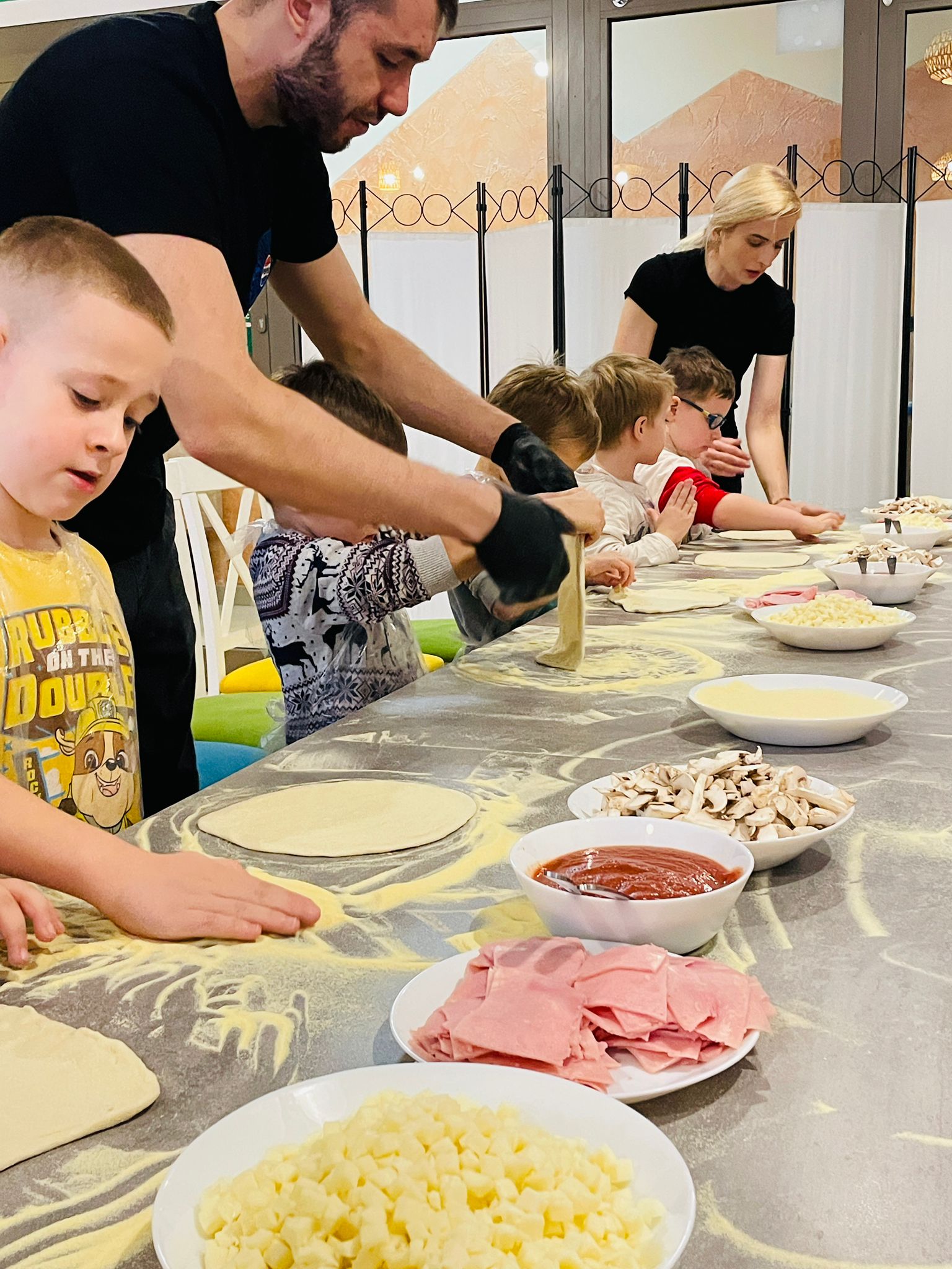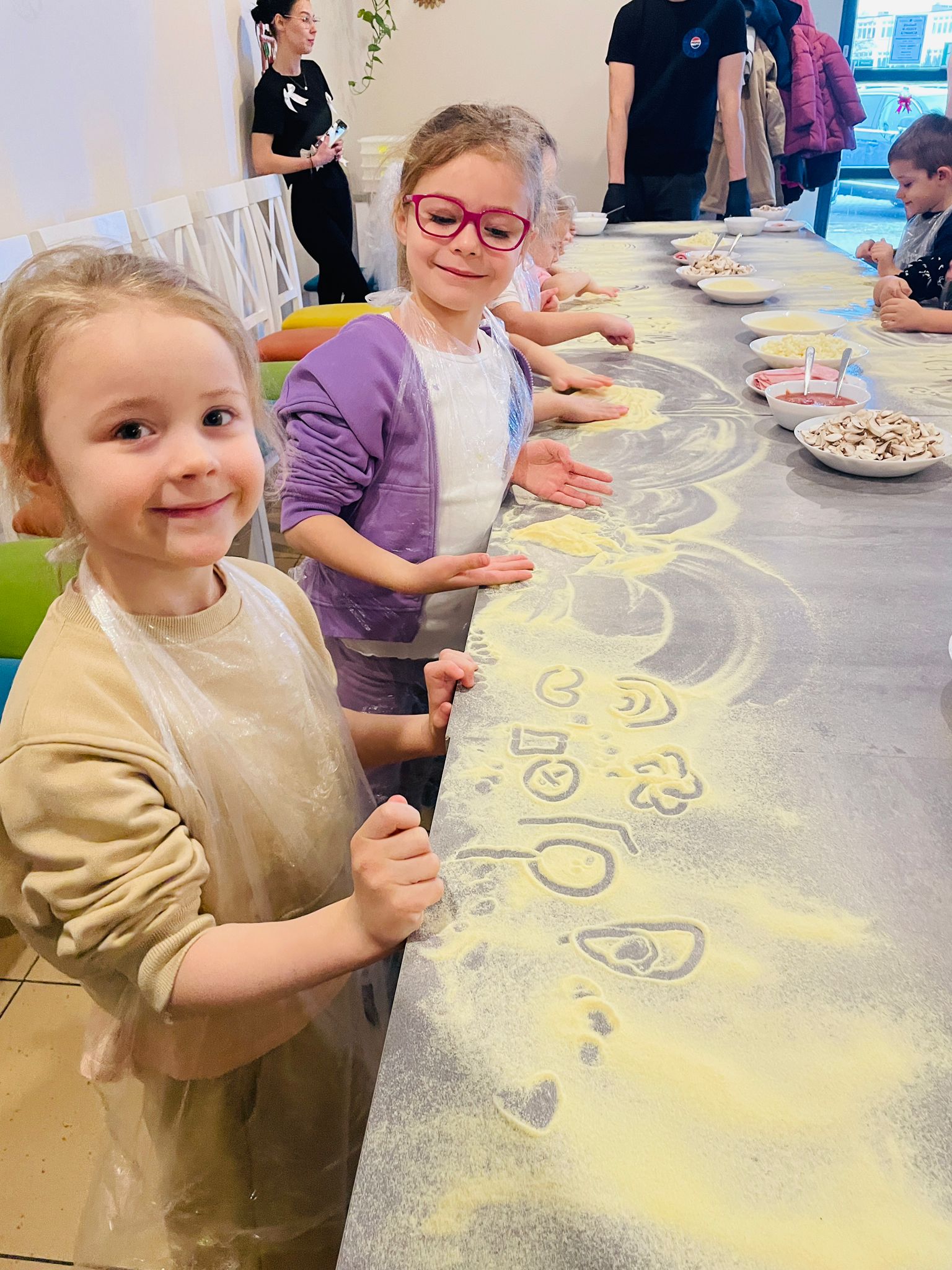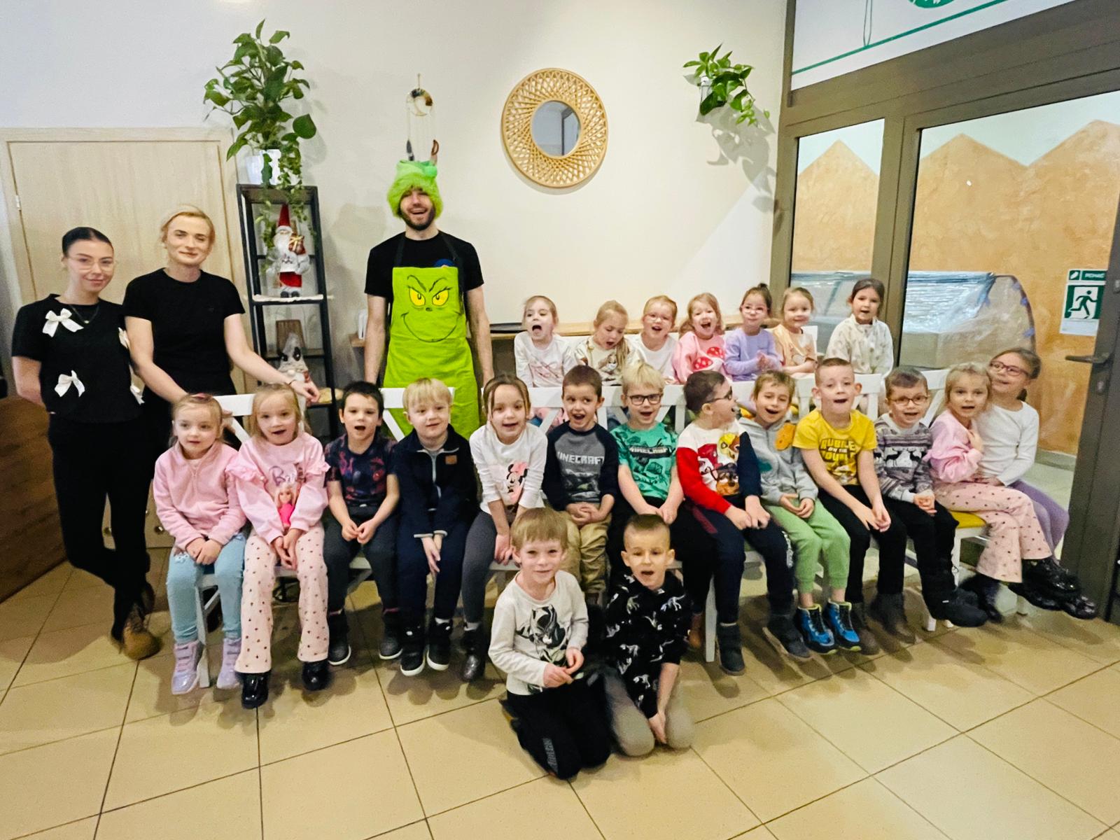 Kolejne kulinarne przygody za nami. Przedszkolaki z gr. XI miały okazję uczestniczyć w warsztatach z robienia pizzy organizowanych w pobliskiej Restauracji "Osiedlowa". Na początku szefowa kuchni- p. Ania, przybliżyła dzieciom historię pizzy. Następnie do akcji wkroczył p. Oliwer- pizzerman, który pokazał dzieciom, jak przejść do części praktycznej. Chłopcy i dziewczynki samodzielnie sypali mąkę, wyrabiali ciasto, a na koniec dodawali ulubione smakołyki. Po wypieczeniu pizzy w specjalnym piecu przyszedł czas na pałaszowanie. Dzieci pracowały z niezwykłym zaangażowaniem, a czekając na wypiek zaśpiewały pracownikom restauracji świąteczną piosenkę. To był niezwykle miły czas.