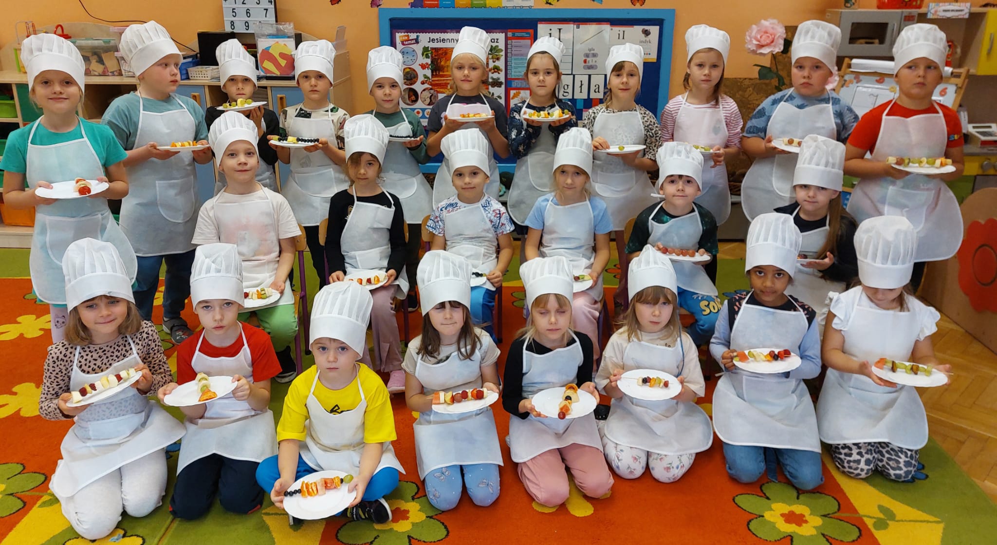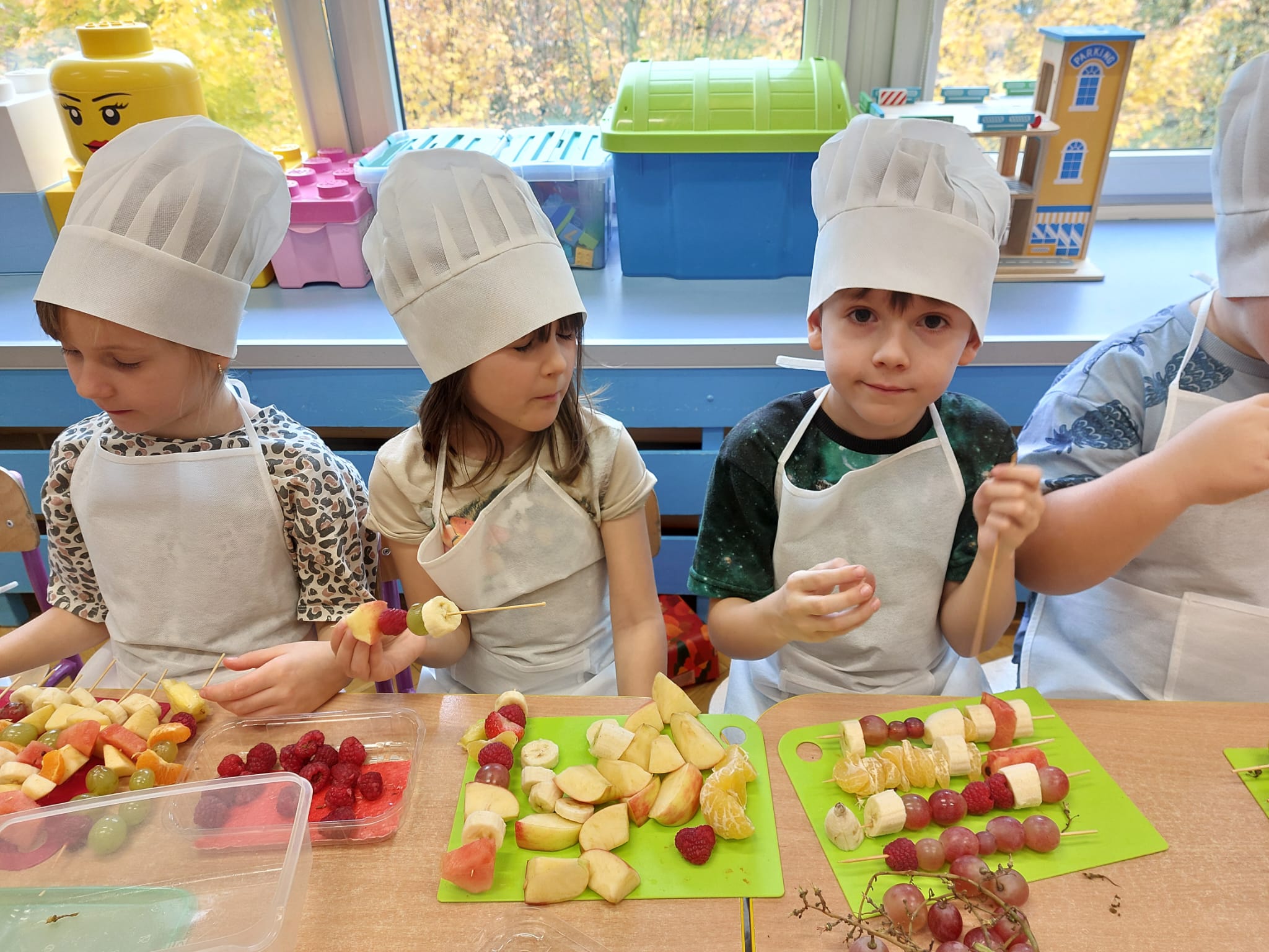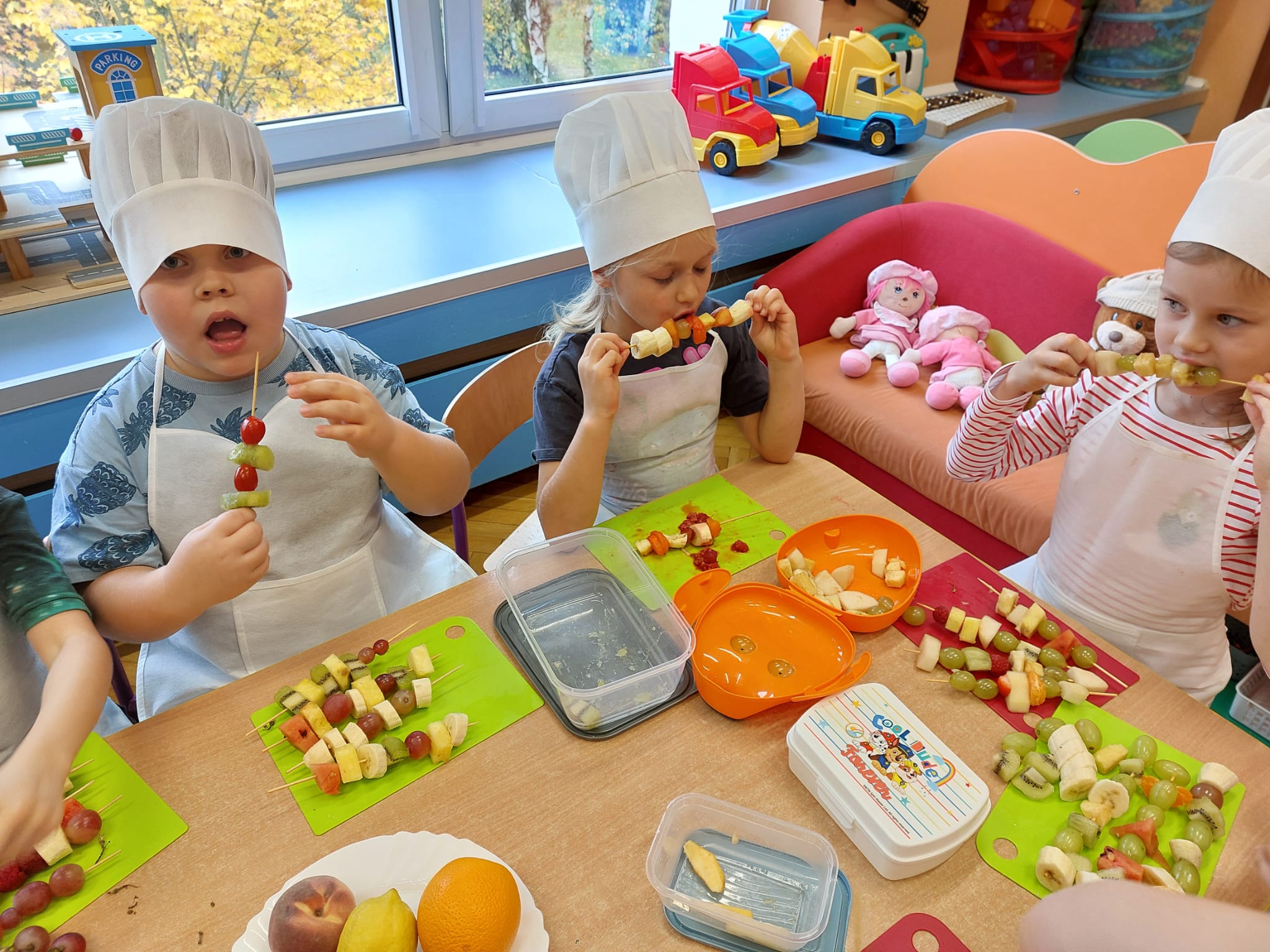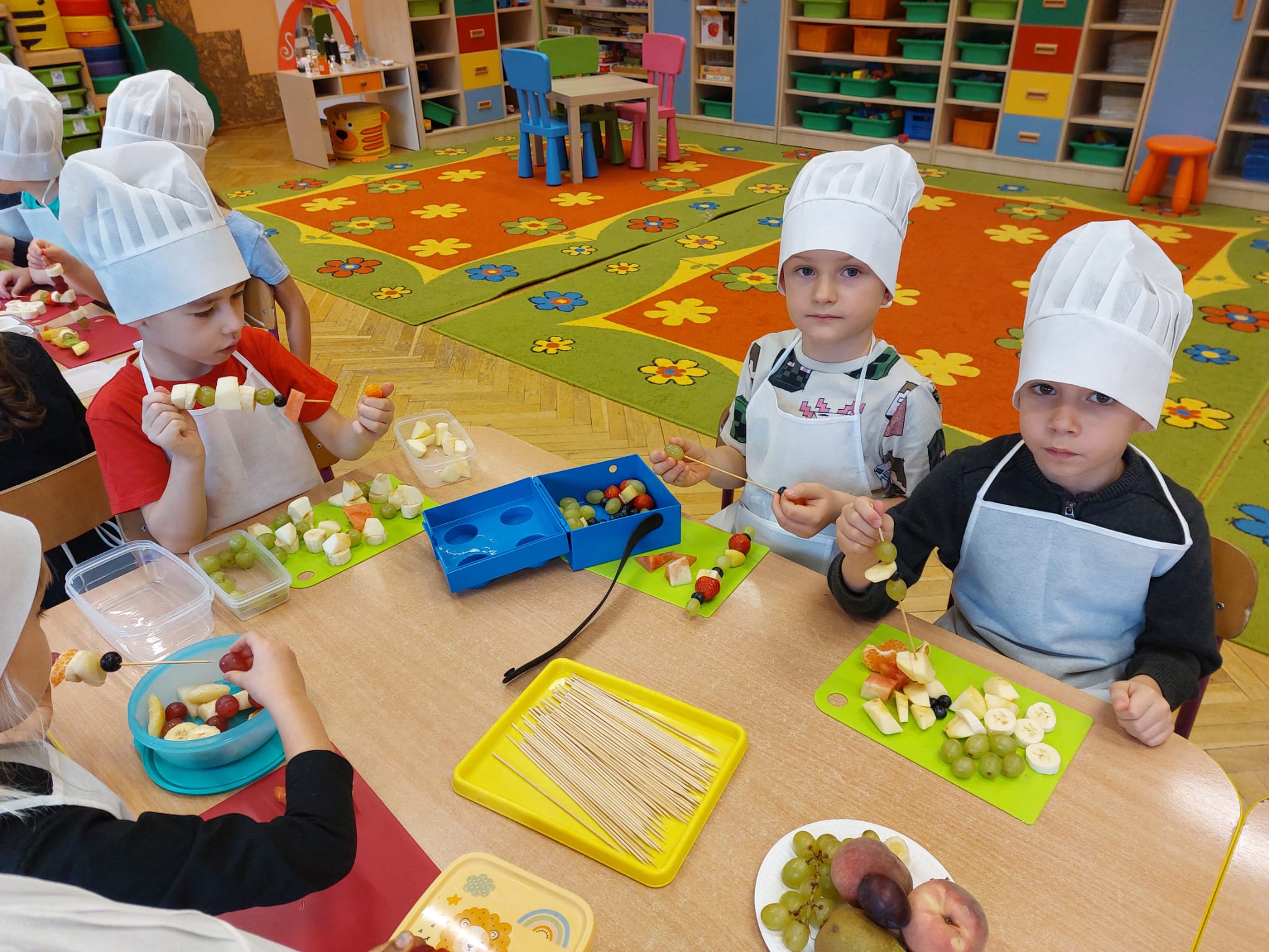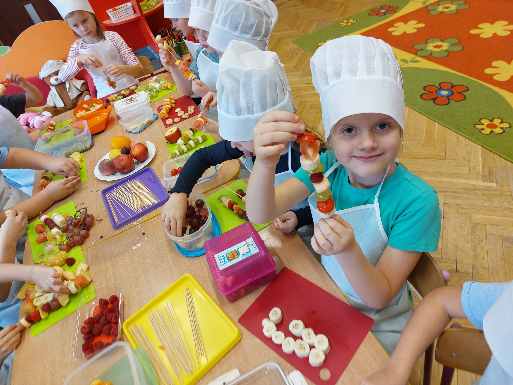 ,,Tup, tup…Pani Jesień owoce w koszu niesie…” pod takim hasłem, dzieci 6-letnie wykonały zdrowe i kolorowe szaszłyki. Celem dzisiejszych kulinarnych doświadczeń było m.in. promowanie zdrowego stylu życia, uświadamianie znaczenia spożywania owoców dla zdrowia, zachęcanie do spożywania owoców oraz ich przetworów, uświadamianie ich wartości odżywczych dla prawidłowego rozwoju, wyrabianie nawyku zdrowego odżywiania, doskonalenie umiejętności współpracy w grupie, jak również dostarczenie radości ze wspólnej zabawy.