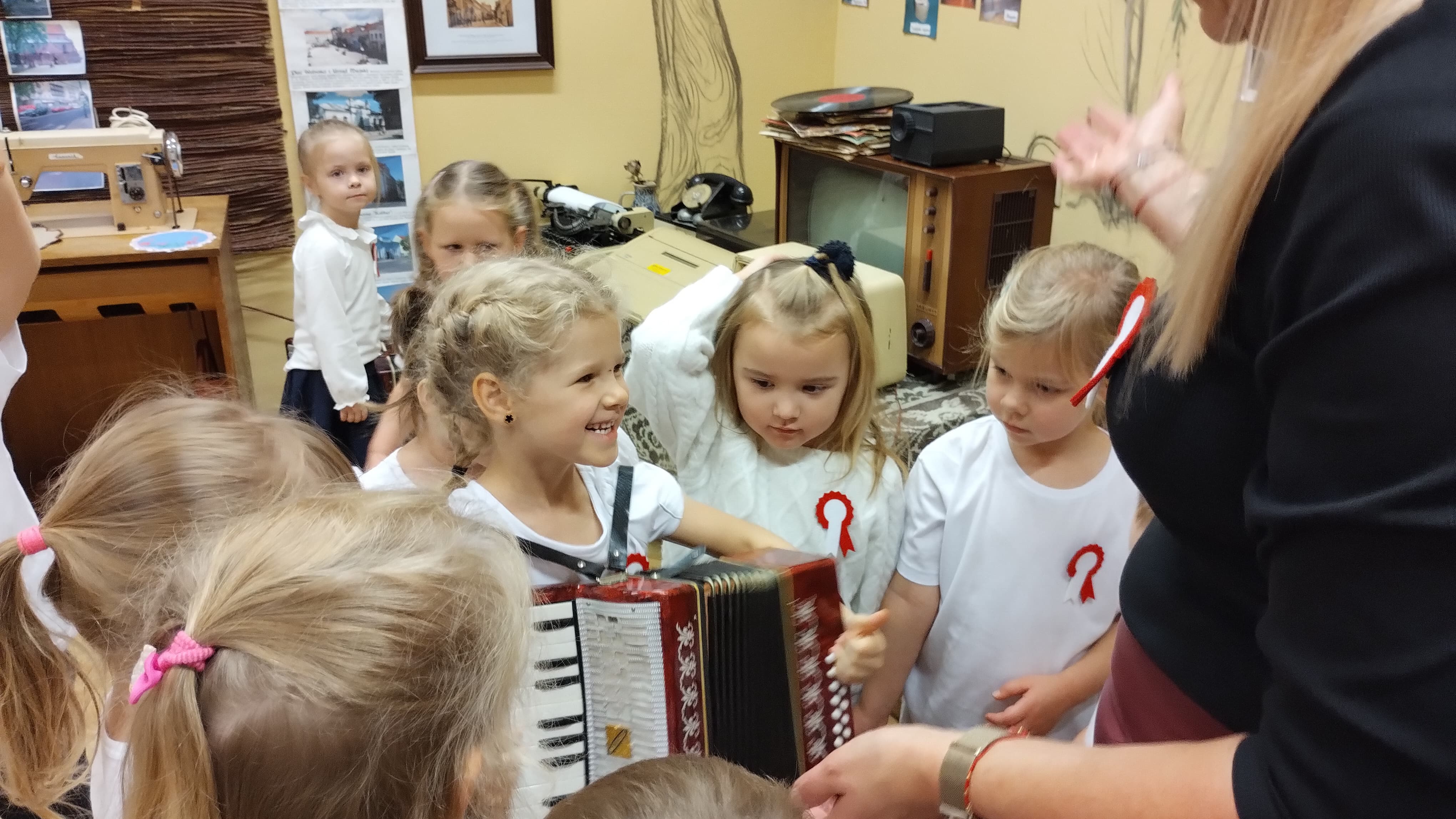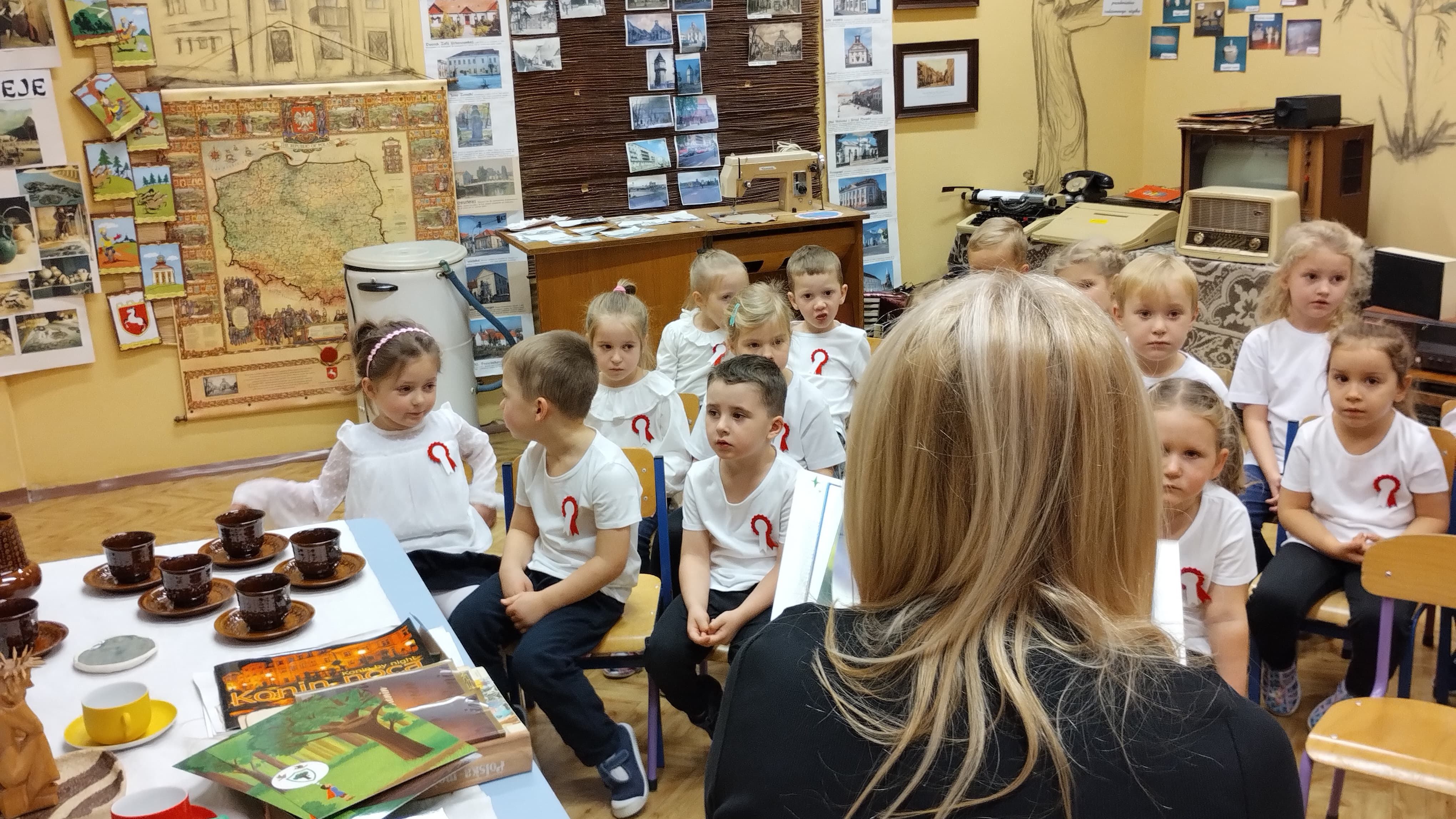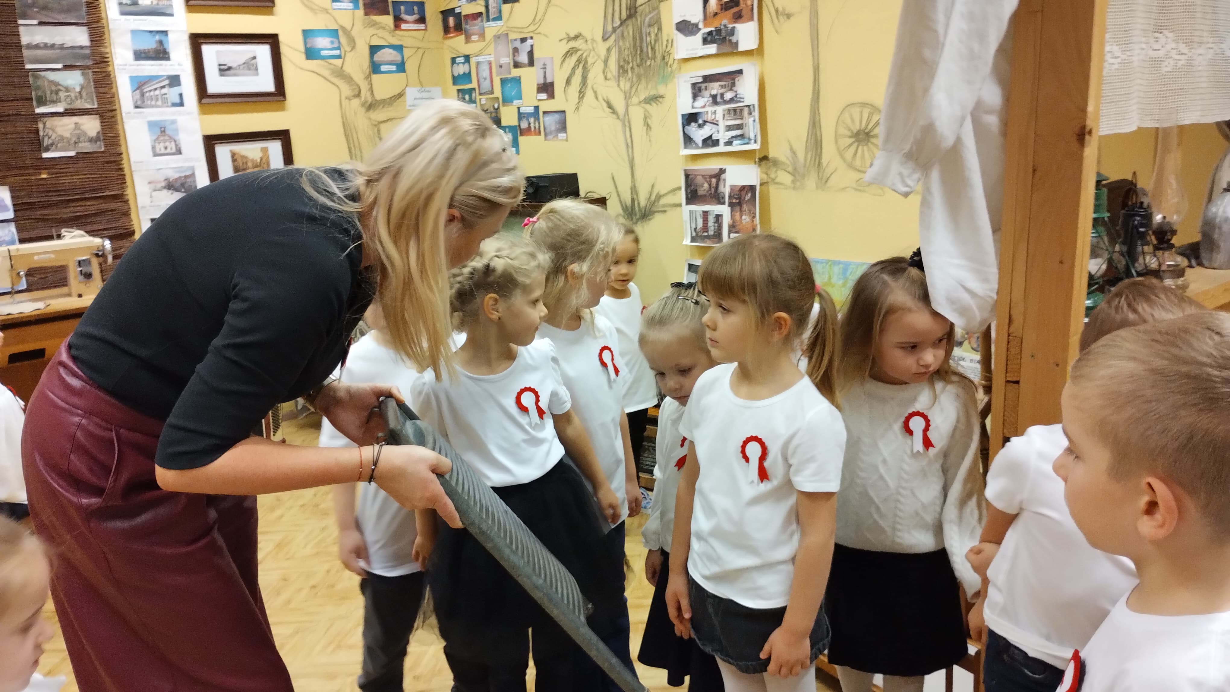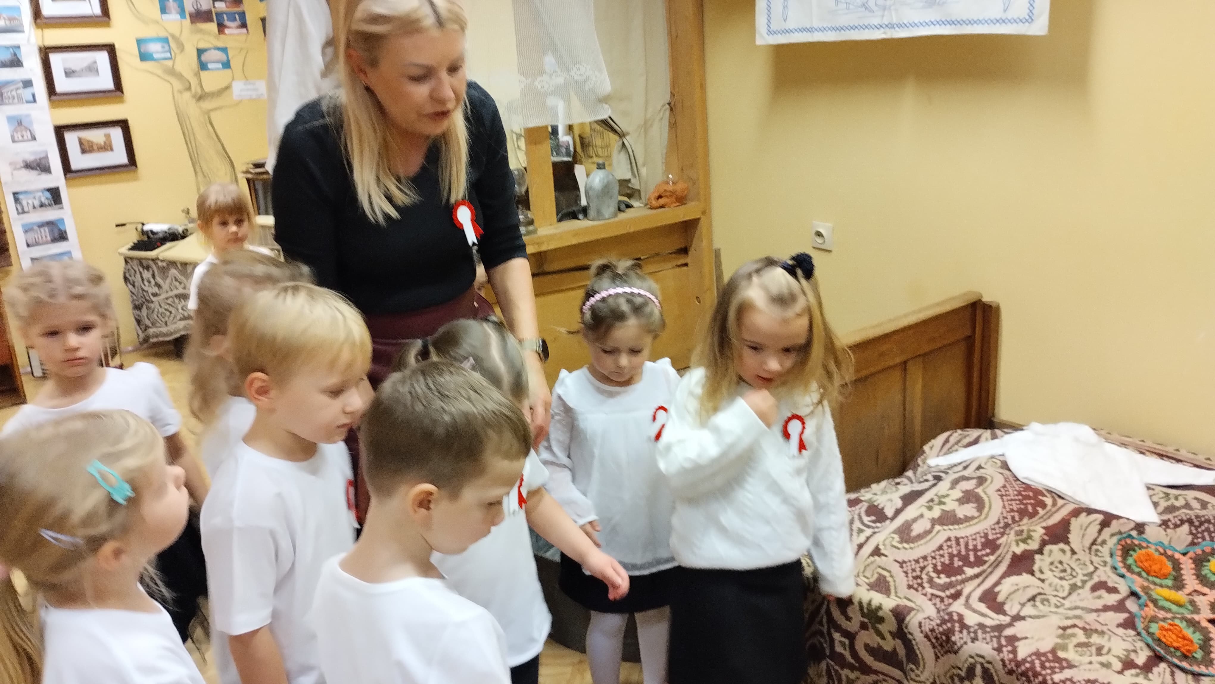 Następnie dzieci odwiedziły przedszkolne mini muzeum, gdzie mogły obejrzeć pamiątki związane z historią Polski – m.in. flagi, godło, zdjęcia i stroje ludowe. W muzeum wysłuchały również legendy o Lechu, Czechu i Rusie, poznając w ten sposób historię powstania państwa polskiego oraz symbolikę białego orła.