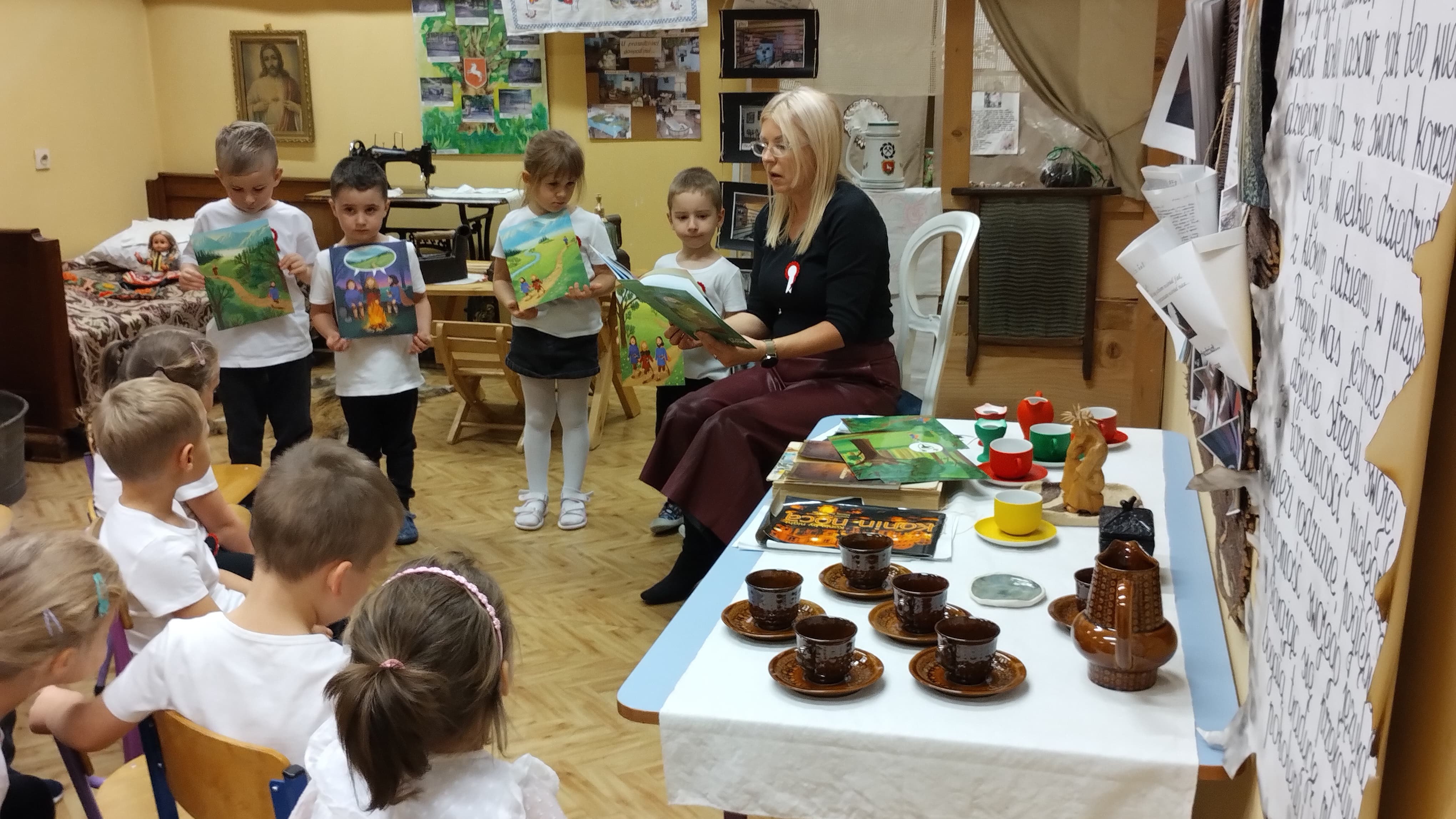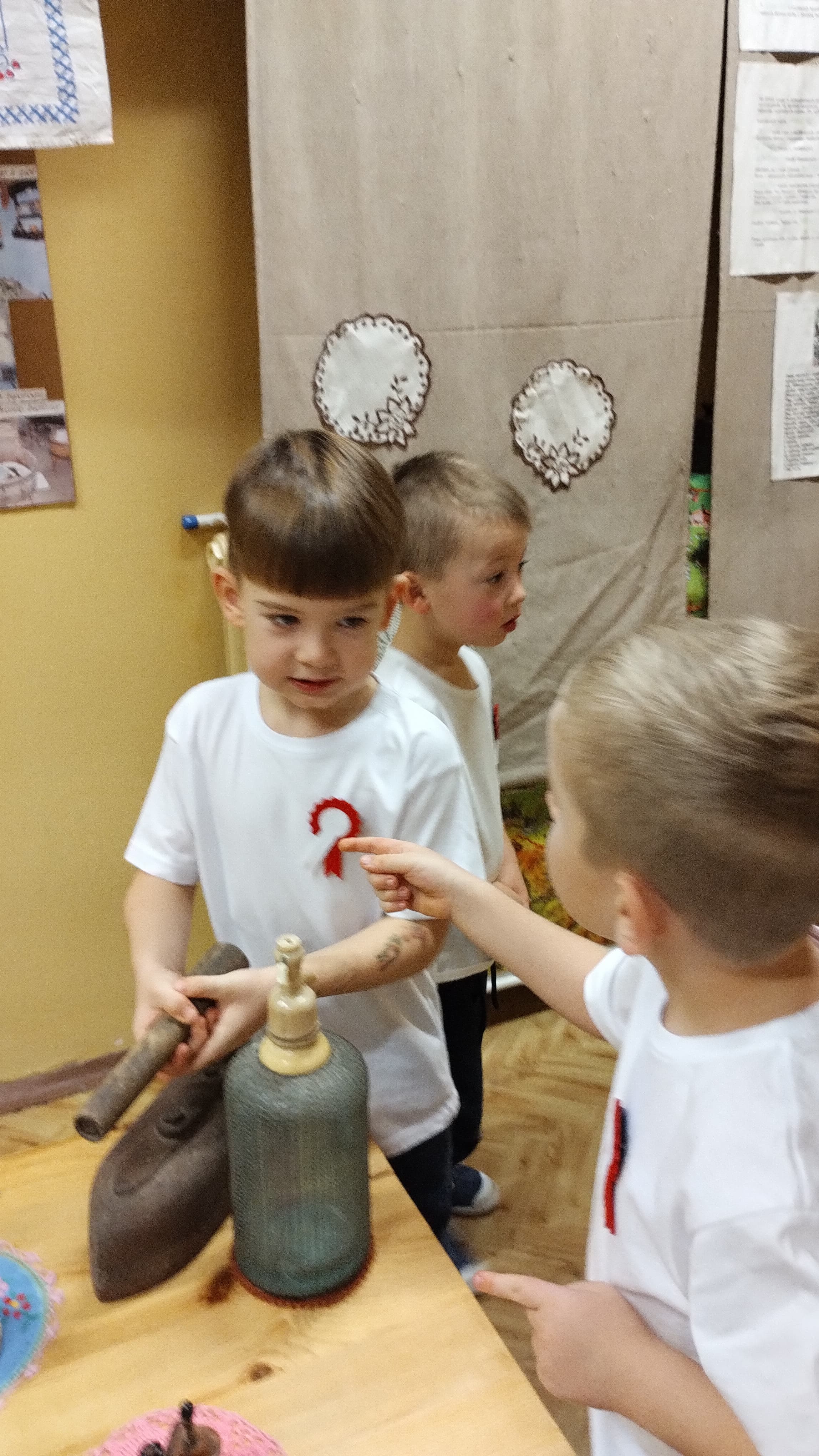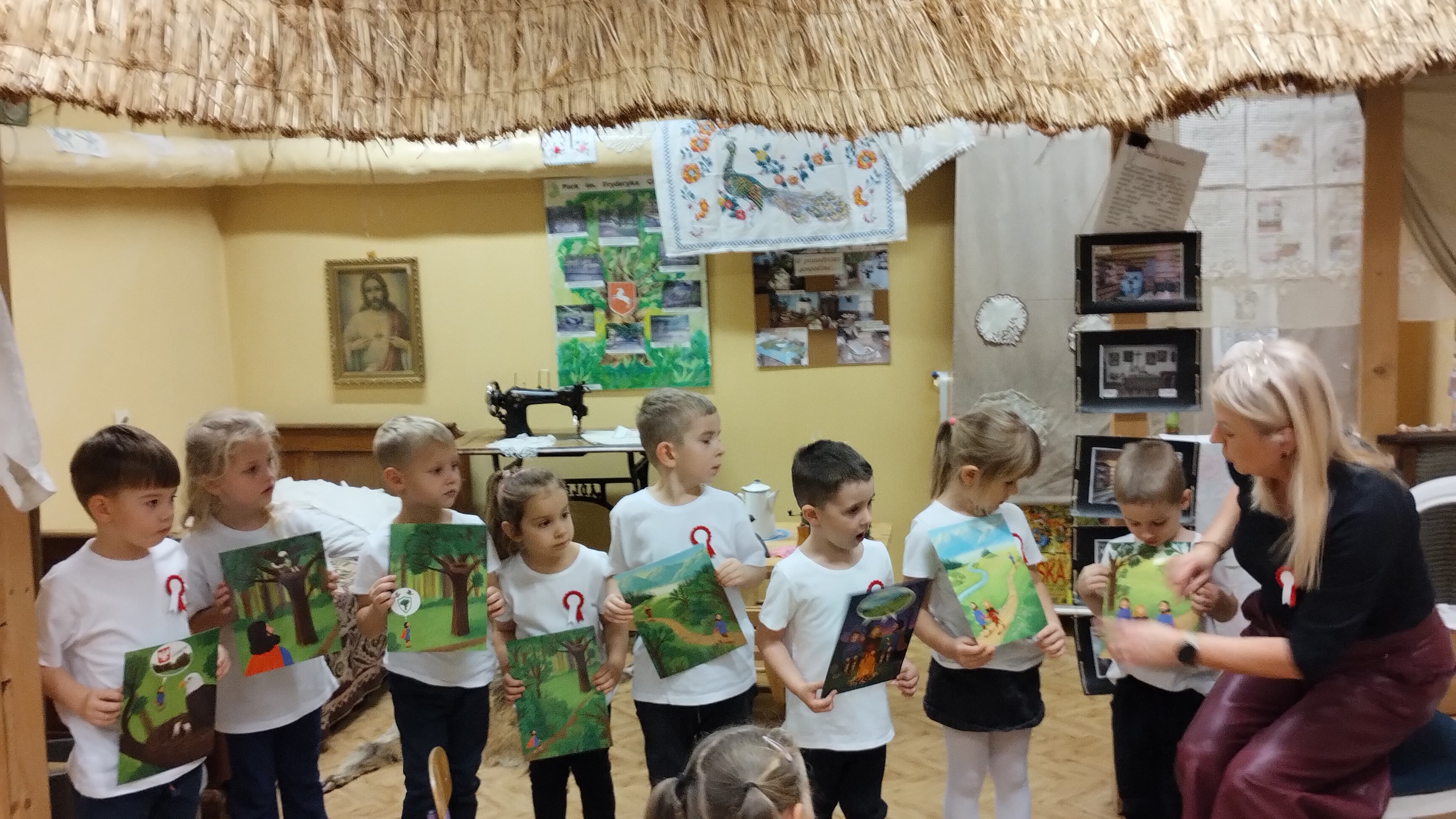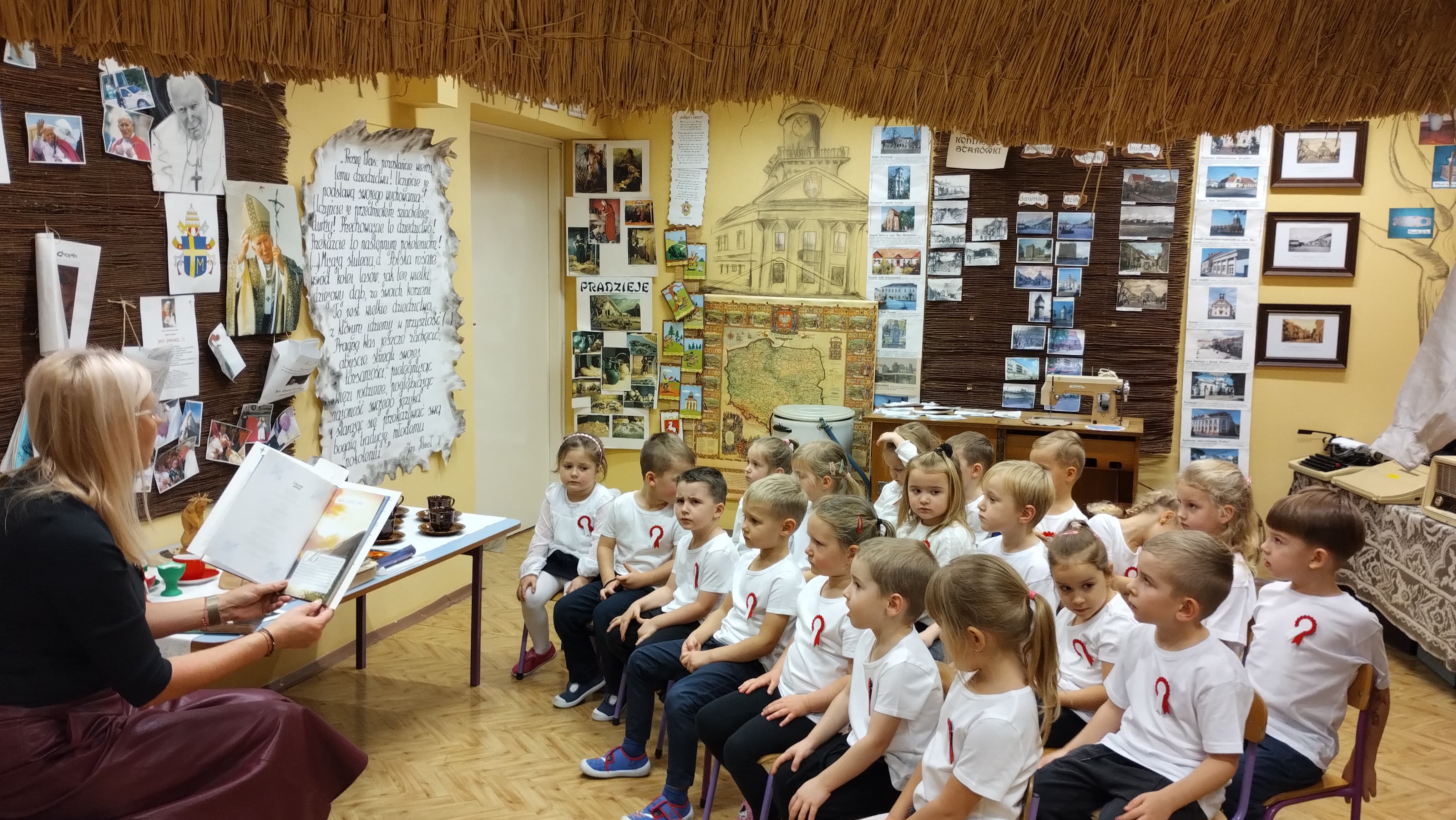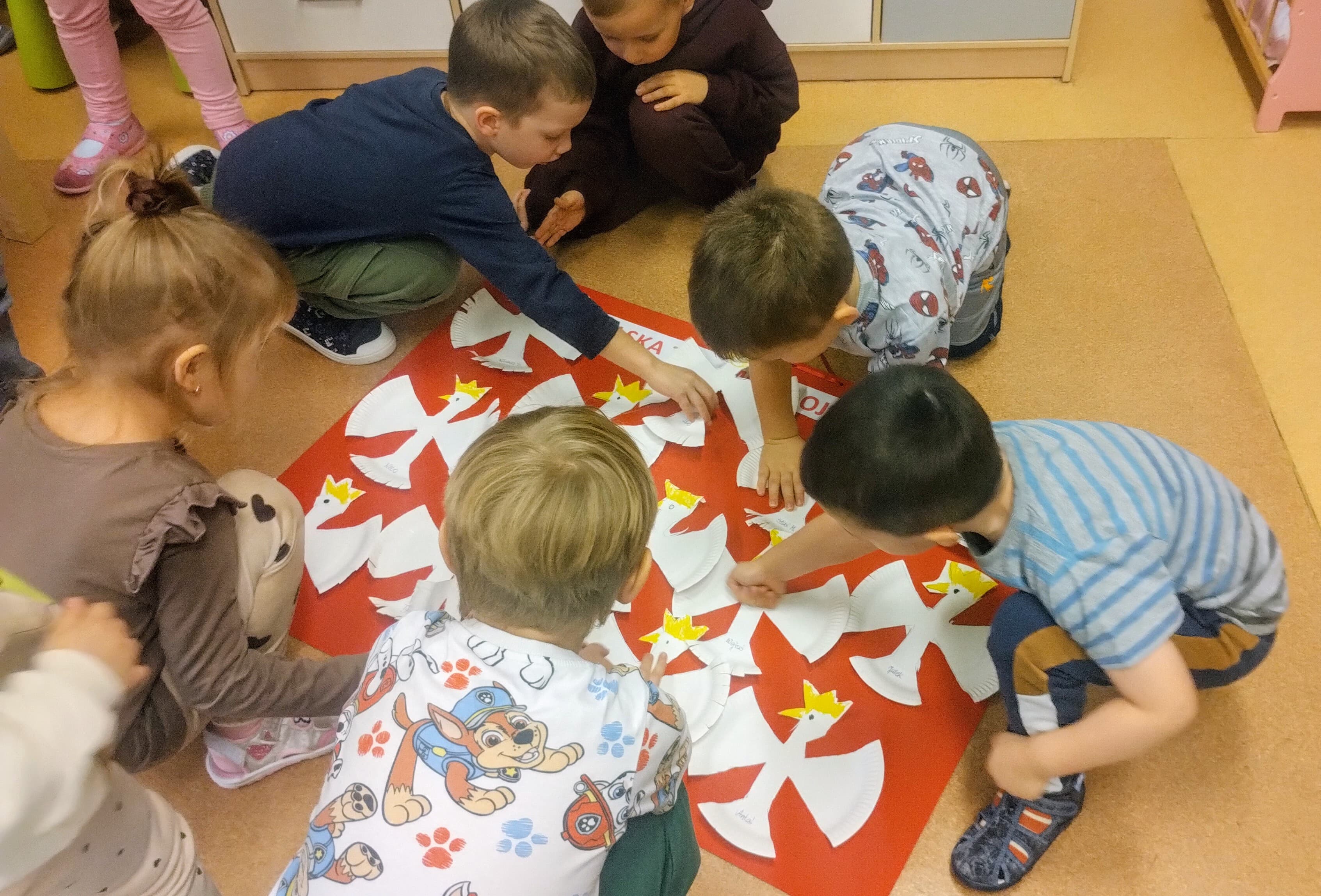 Następnie dzieci odwiedziły przedszkolne mini muzeum, gdzie mogły obejrzeć pamiątki związane z historią Polski – m.in. flagi, godło, zdjęcia i stroje ludowe. W muzeum wysłuchały również legendy o Lechu, Czechu i Rusie, poznając w ten sposób historię powstania państwa polskiego oraz symbolikę białego orła.