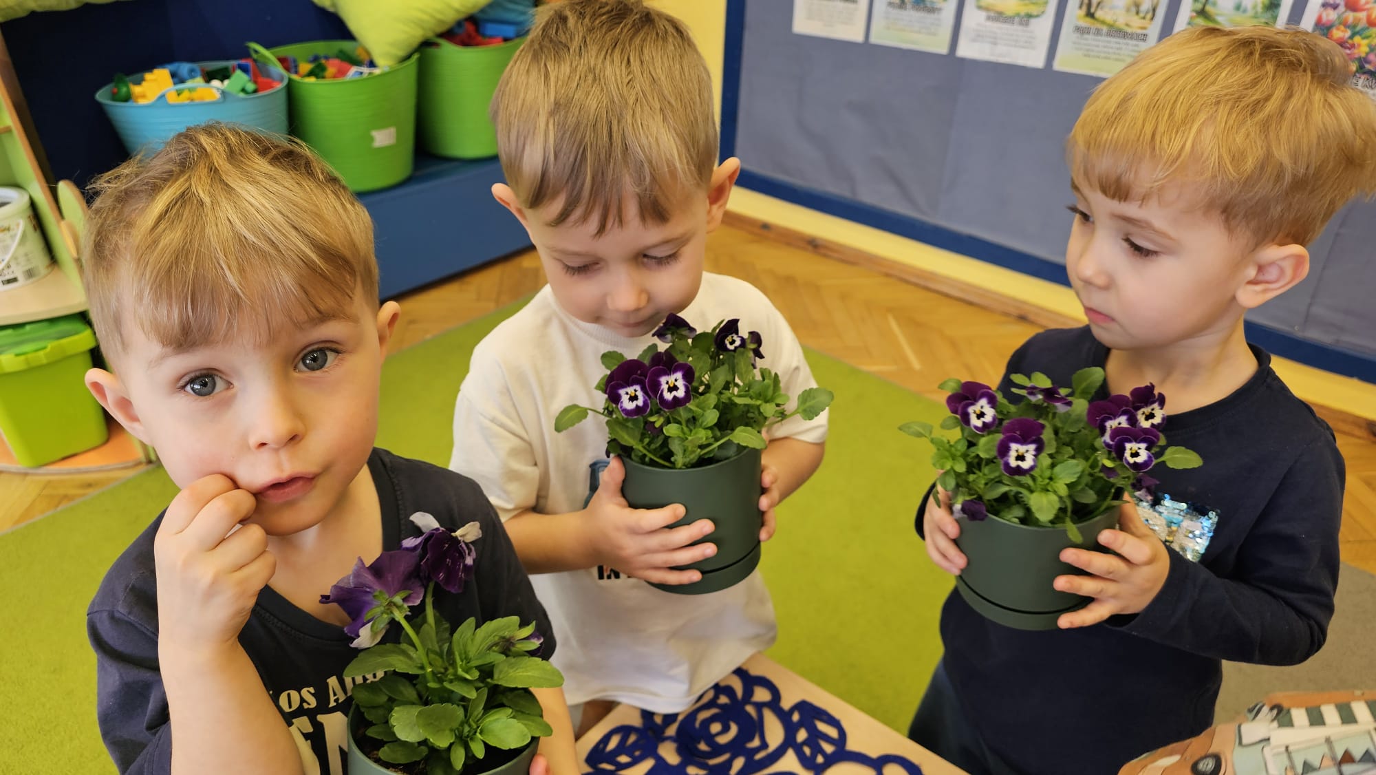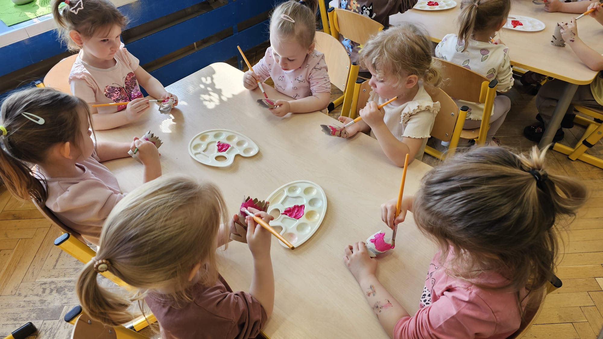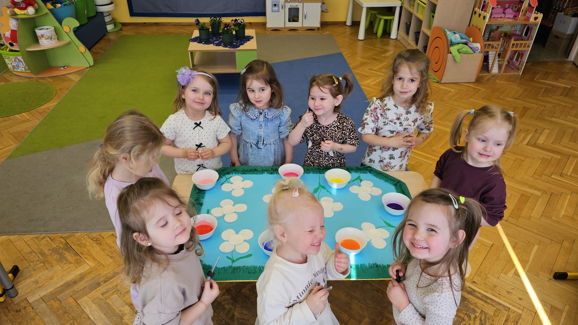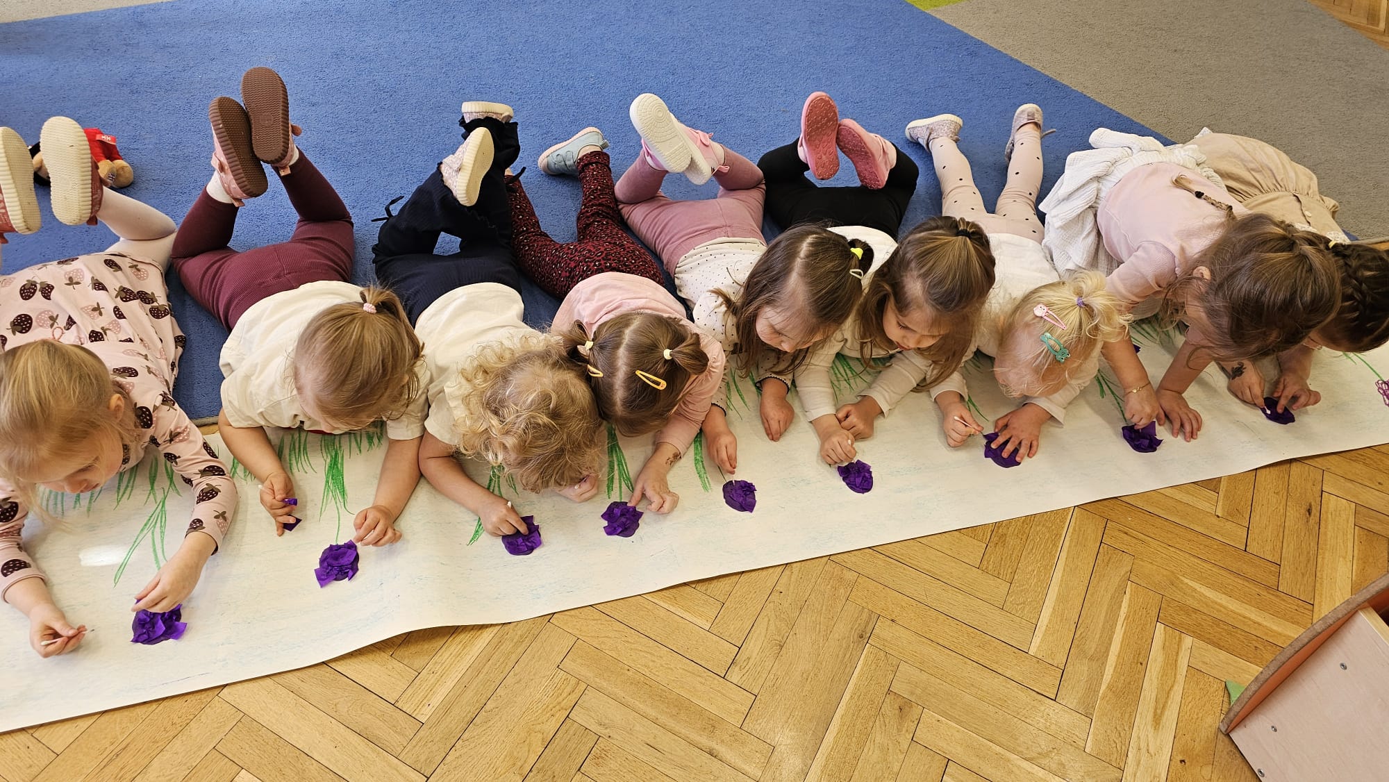 Podczas ostatniego cyklu zajęć pt. „Pierwsze wiosenne kwiatki” dzieci z grupy I maluszków miały okazję poznać pierwsze oznaki wiosny w sposób sensoryczny i artystyczny. Maluchy odkrywały przebiśniegi, hiacynty, tulipany oraz bratki, angażując różne zmysły. Dotykały, oglądały, wąchały i rozmawiały o ich wyglądzie, określały zapach. Dzieci z dużym zaangażowaniem tworzyły również własne kwiatki, wykorzystując różnorodne materiały i techniki plastyczne. Zajęcia były pełne radości, kreatywności i wiosennej atmosfery. Celem zajęć było: rozwijanie percepcji sensorycznej (wzrokowej, dotykowej, węchowej), poznanie wybranych wiosennych kwiatów, rozwijanie sprawności manualnej i kreatywności, kształtowanie umiejętności wypowiadania się i wzbogacanie słownictwa, a przede wszystkim budowanie zainteresowania przyrodą i zmianami zachodzącymi wiosną.