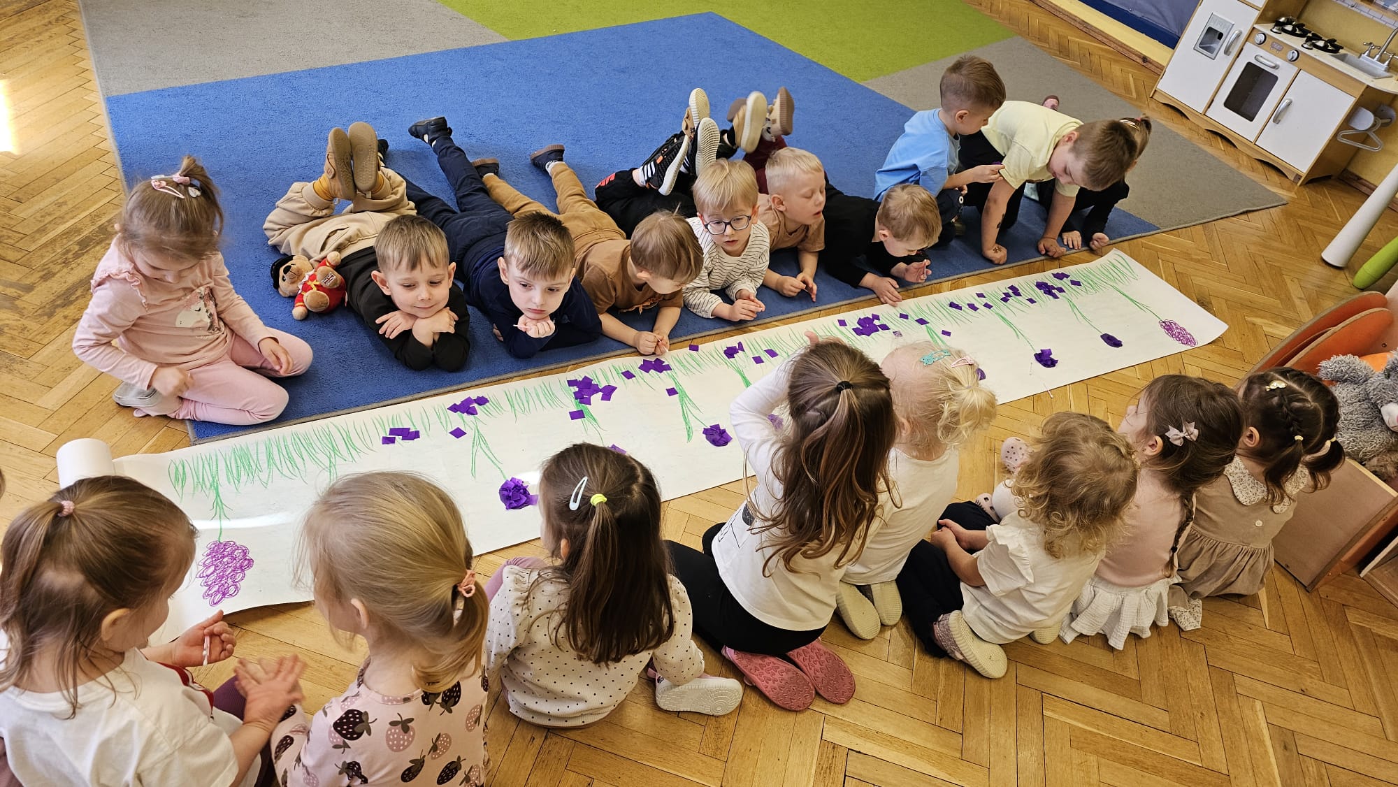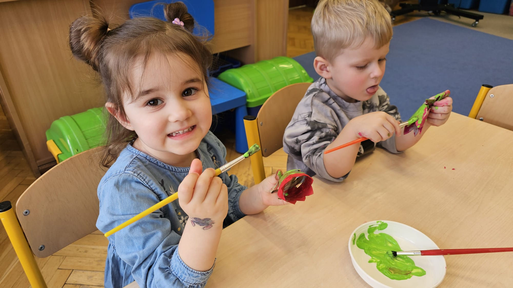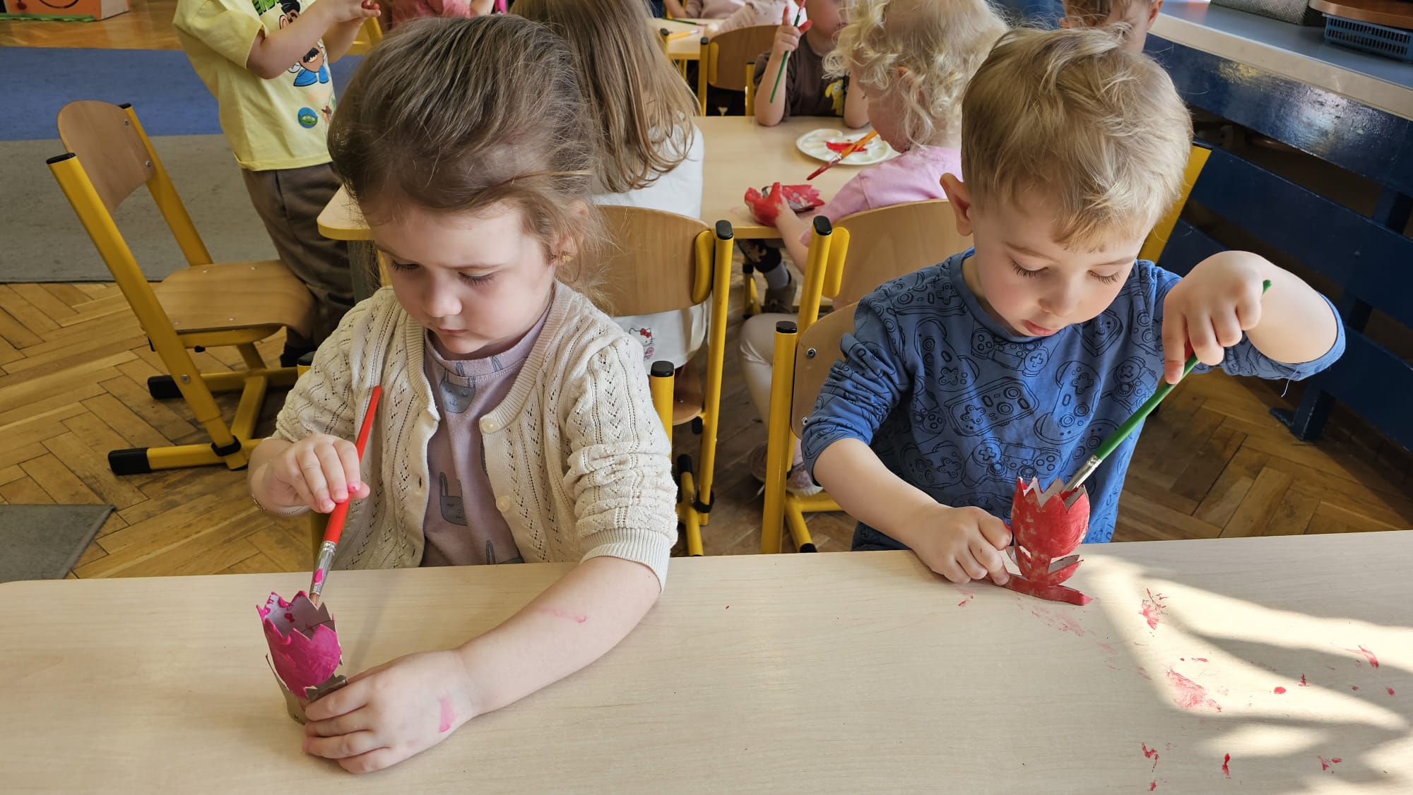 Podczas ostatniego cyklu zajęć pt. „Pierwsze wiosenne kwiatki” dzieci z grupy I maluszków miały okazję poznać pierwsze oznaki wiosny w sposób sensoryczny i artystyczny. Maluchy odkrywały przebiśniegi, hiacynty, tulipany oraz bratki, angażując różne zmysły. Dotykały, oglądały, wąchały i rozmawiały o ich wyglądzie, określały zapach. Dzieci z dużym zaangażowaniem tworzyły również własne kwiatki, wykorzystując różnorodne materiały i techniki plastyczne. Zajęcia były pełne radości, kreatywności i wiosennej atmosfery. Celem zajęć było: rozwijanie percepcji sensorycznej (wzrokowej, dotykowej, węchowej), poznanie wybranych wiosennych kwiatów, rozwijanie sprawności manualnej i kreatywności, kształtowanie umiejętności wypowiadania się i wzbogacanie słownictwa, a przede wszystkim budowanie zainteresowania przyrodą i zmianami zachodzącymi wiosną.