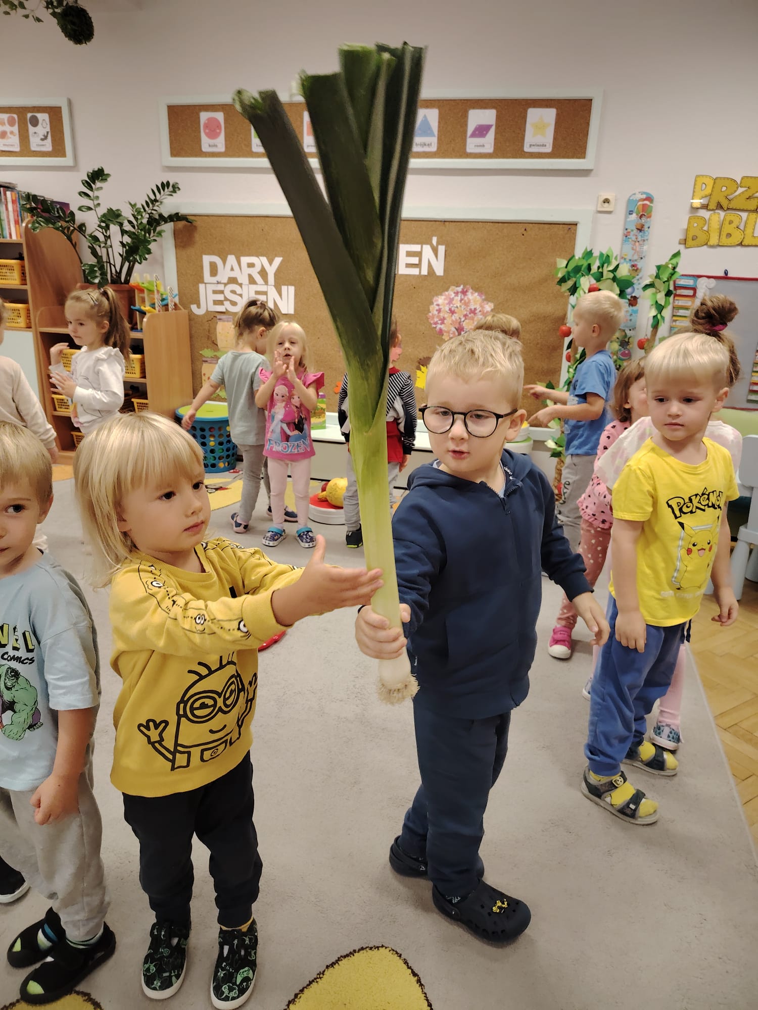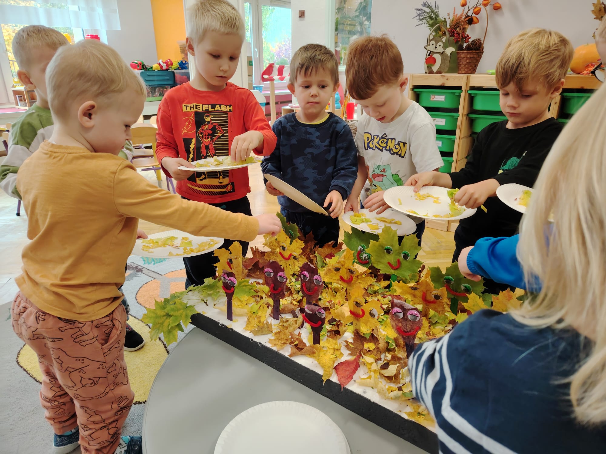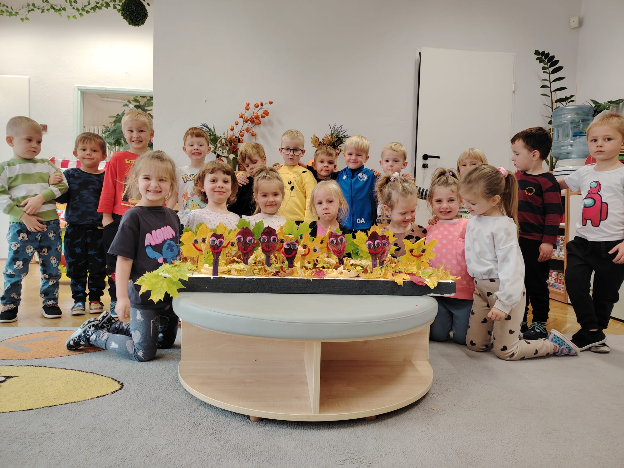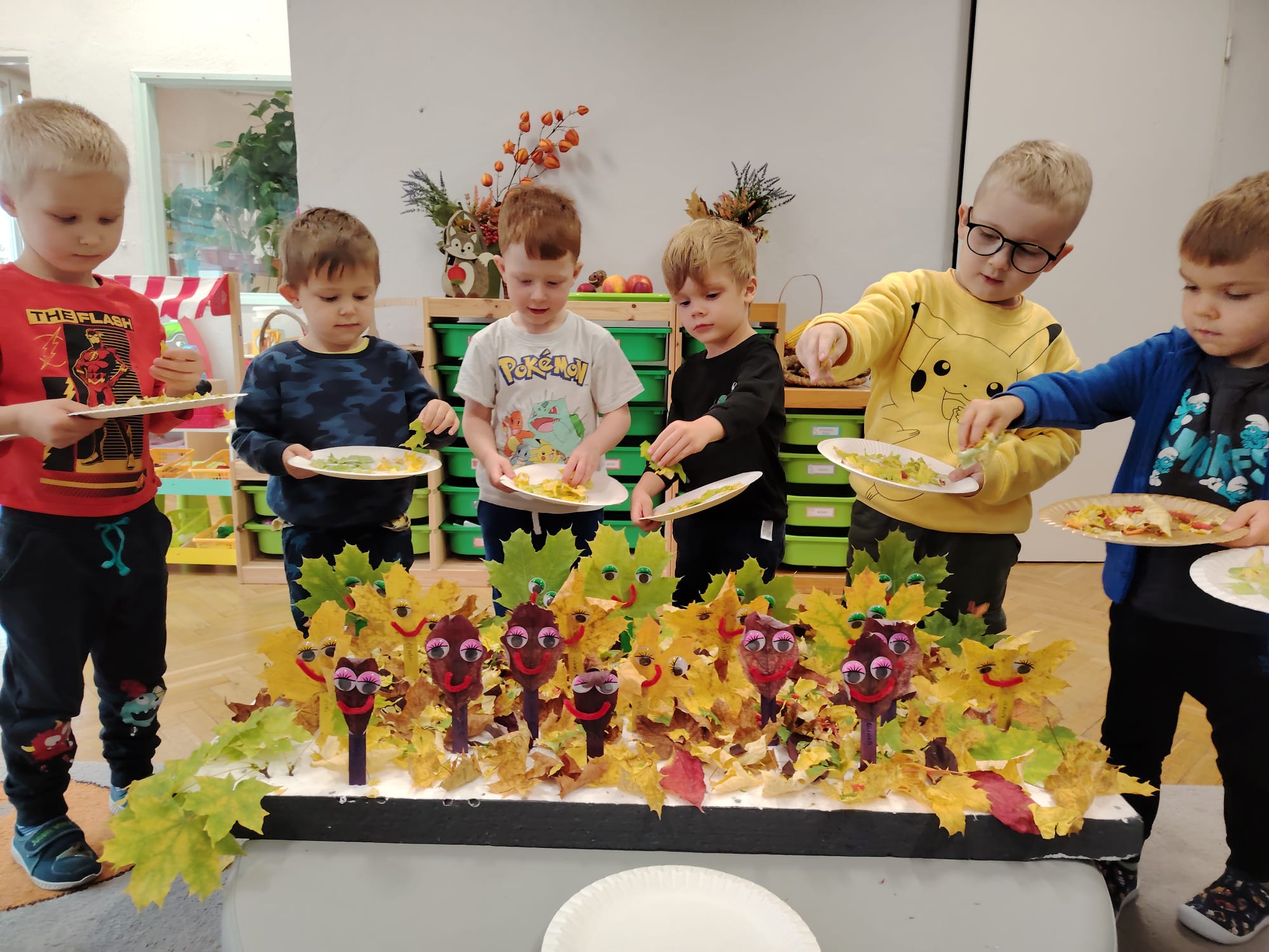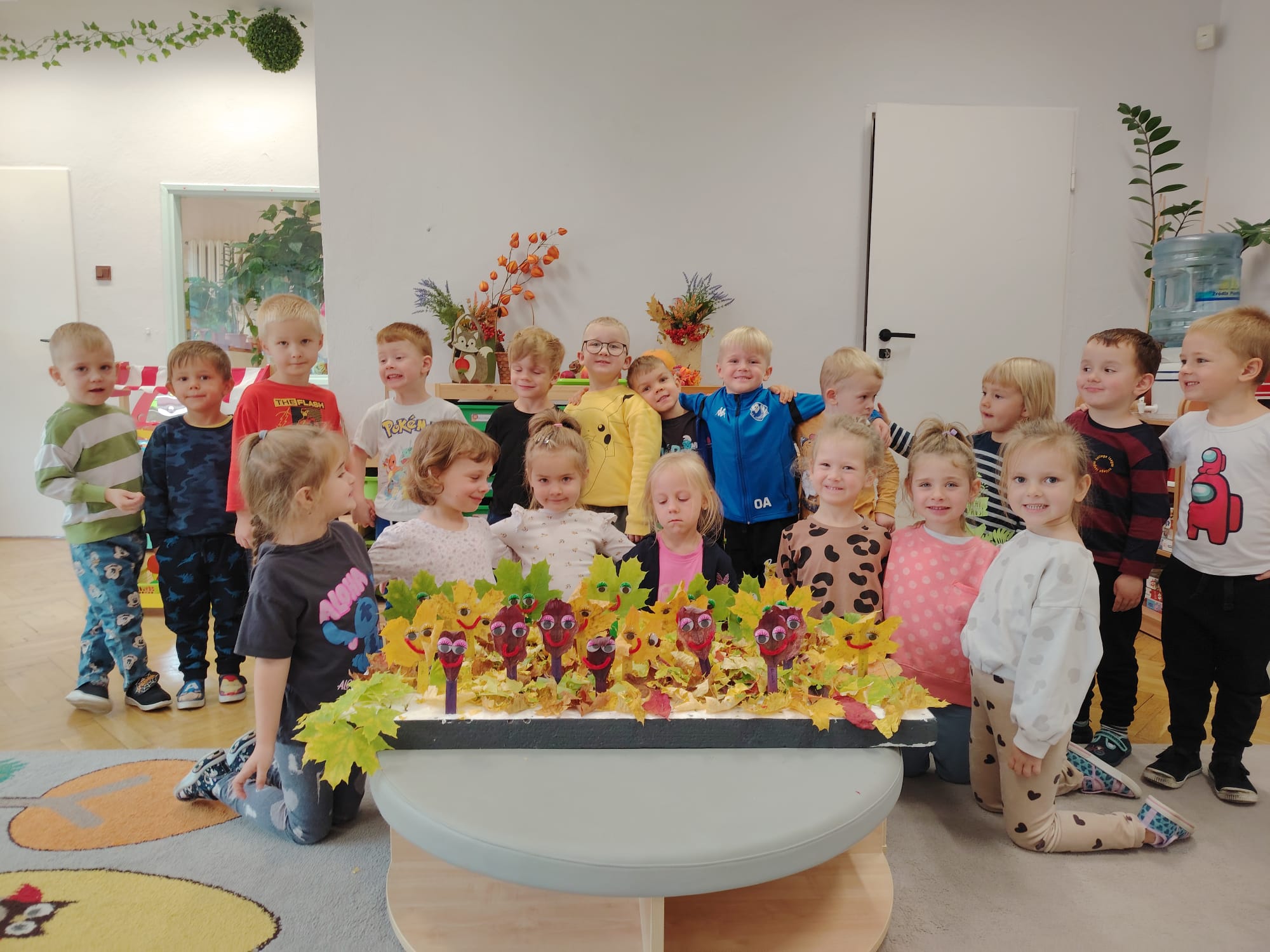 Jesień jest często niedocenianą porą roku, uważa się ją za ponurą i kapryśną... Jednak jest to pora przez nas uwielbiana! Dlaczego? Gdyż niesie ze sobą piękne dary, które służą nam do nauki przez doskonałą zabawę każdego dnia. Wystarczy wyjść na spacer, rozejrzeć się, przykucnąć w trawie, pod drzewami w parku... Znajdujemy wtedy żołędzie, kasztany, szyszki, kolorowe liście, jarzębinę... Czas niepogody to również świetna okazja do przeprowadzania wielozmysłowych zabaw. Grupa II przez ostatnie trzy tygodnie realizowała jesienny projekt edukacyjny, którego głównym celem było kształtowanie postaw poznawczych i proekologicznych poprzez wielozmysłowe doświadczanie otaczającej przyrody. W trakcie działań projektowych dzieci: podczas zabaw sensorycznych nazywały, rozróżniały i klasyfikowały naturalne produkty, rozwijały umiejętność planowania budując przestrzenny ogród z klocków, ćwiczyły analizę i syntezę wzrokową oraz logiczne myślenie, dopasowując warzywa do ich nazw i kształtów, uczestniczyły w zabawach ruchowych z elementami metody aktywnego słuchania w grze „Dopasuj owoc do drzewa”. Podczas jesiennego spaceru edukacyjnego przedszkolaki realizowały zadania z listy obserwacyjnej, rozwijając spostrzegawczość i świadomość zmian zachodzących w przyrodzie. W ramach podsumowania powstała galeria prac dzieci- „Kolorowa jesień oczami dziecka” stworzona z postaci z liści na patykach. Dzięki różnorodnym formom aktywności nasze przedszkolaki miały okazję uczyć się przez działanie, odkrywanie i współdziałanie w grupie. Był to naprawdę radosny i edukacyjnie drogocenny czas. Zapraszamy do galerii.