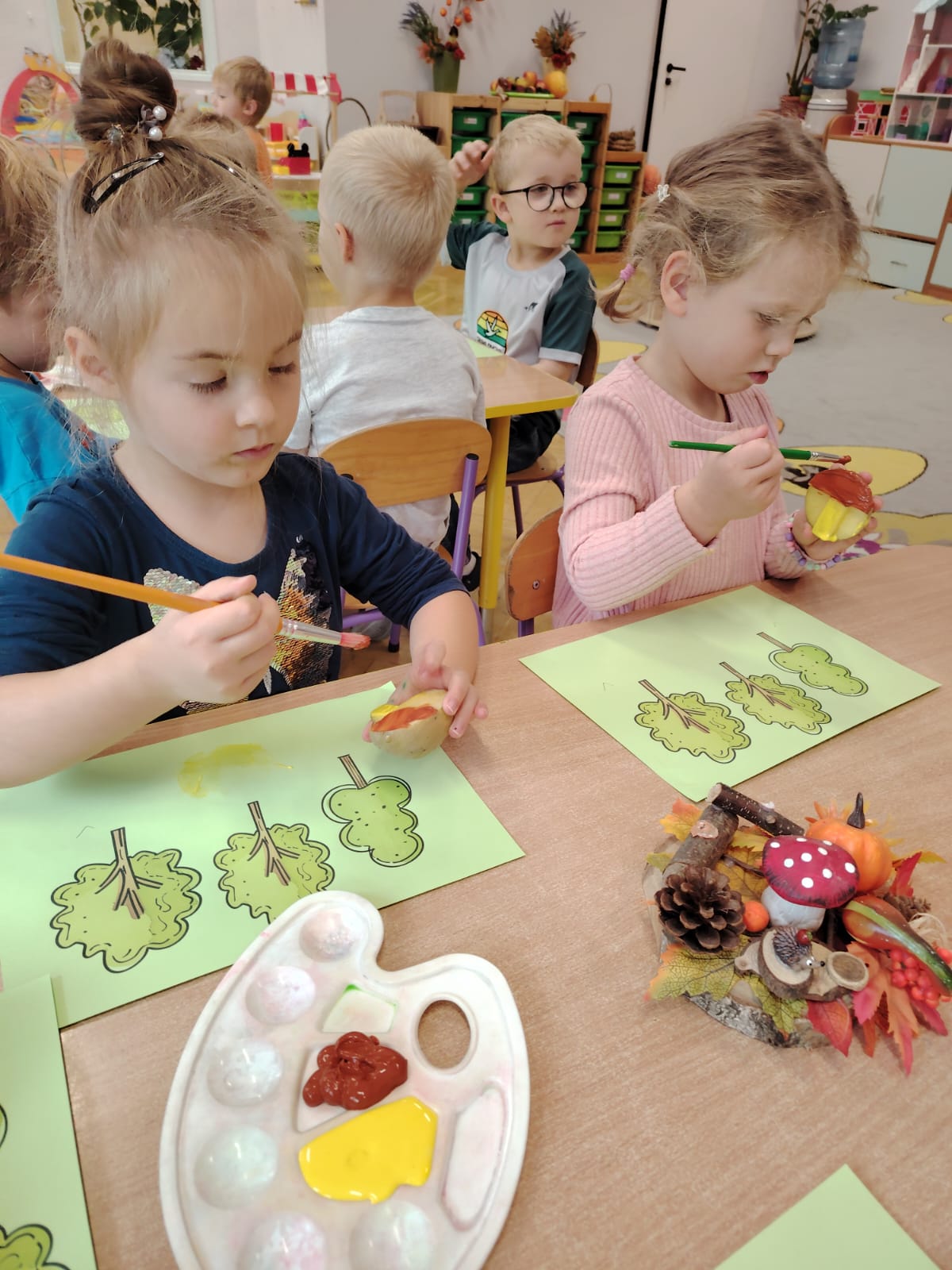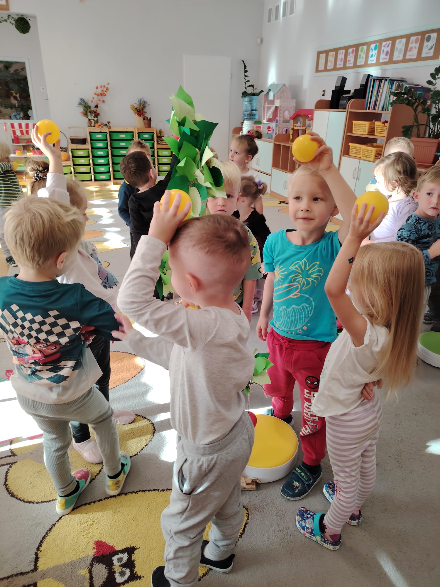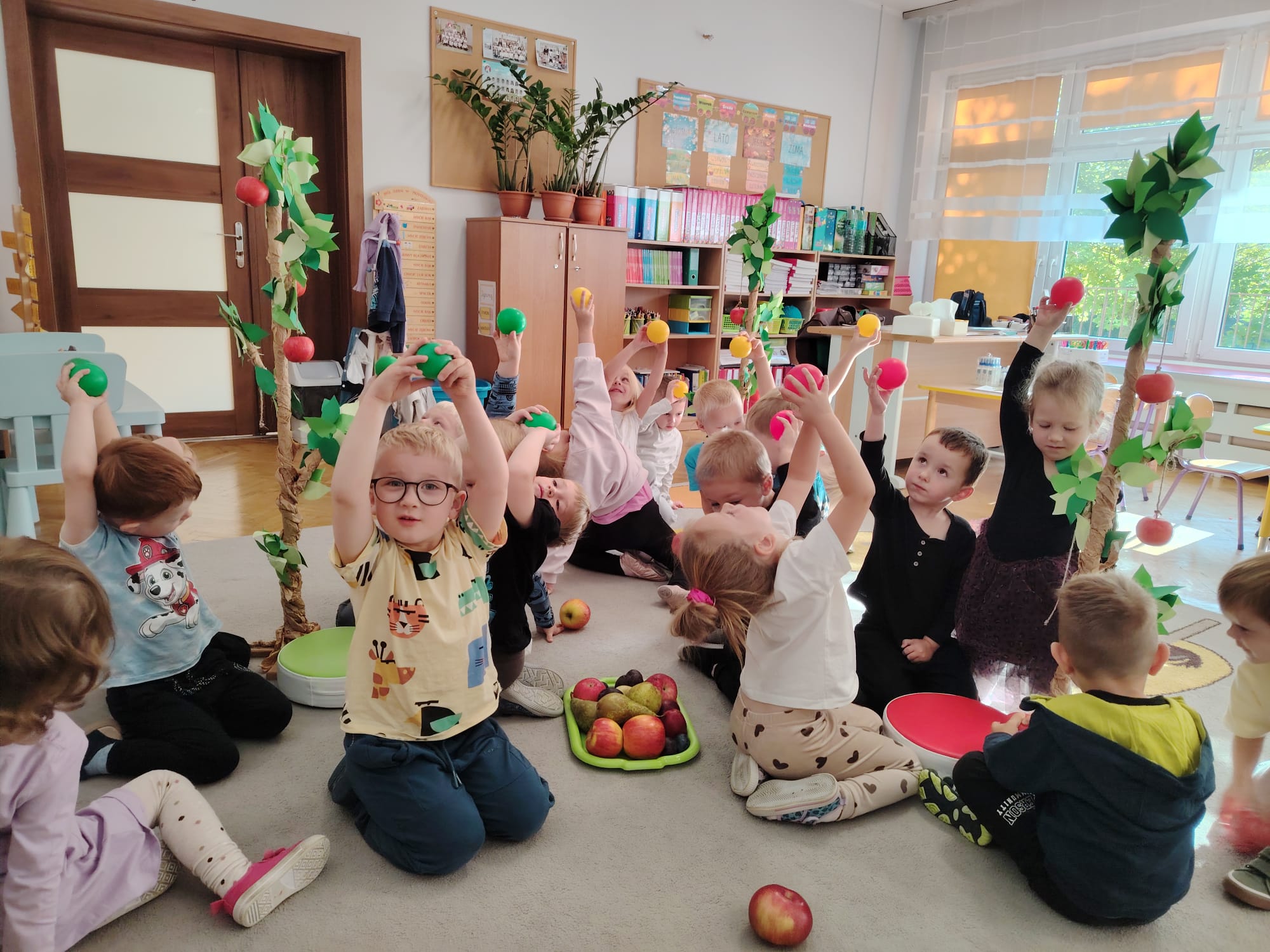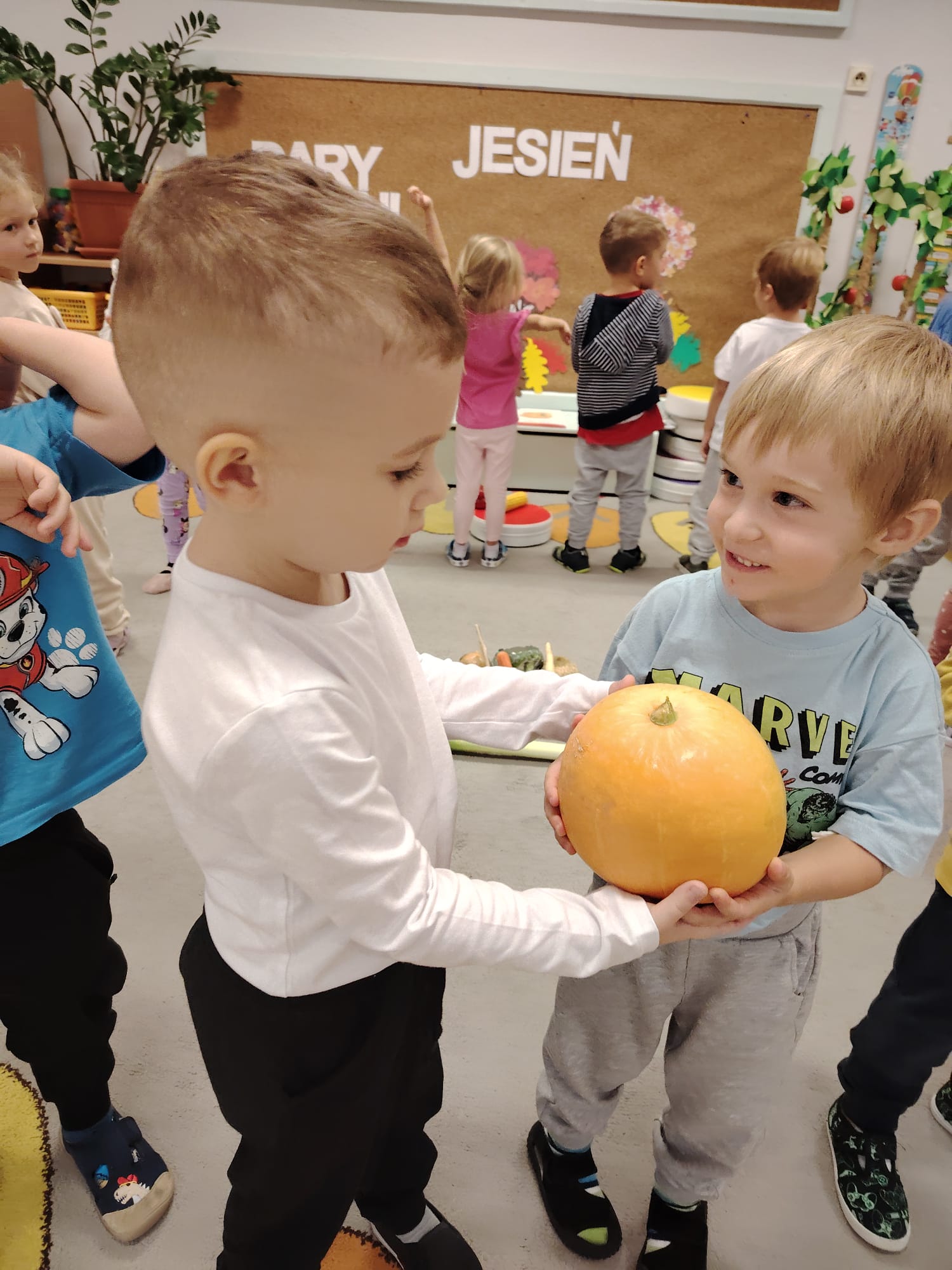 Jesień jest często niedocenianą porą roku, uważa się ją za ponurą i kapryśną... Jednak jest to pora przez nas uwielbiana! Dlaczego? Gdyż niesie ze sobą piękne dary, które służą nam do nauki przez doskonałą zabawę każdego dnia. Wystarczy wyjść na spacer, rozejrzeć się, przykucnąć w trawie, pod drzewami w parku... Znajdujemy wtedy żołędzie, kasztany, szyszki, kolorowe liście, jarzębinę... Czas niepogody to również świetna okazja do przeprowadzania wielozmysłowych zabaw. Grupa II przez ostatnie trzy tygodnie realizowała jesienny projekt edukacyjny, którego głównym celem było kształtowanie postaw poznawczych i proekologicznych poprzez wielozmysłowe doświadczanie otaczającej przyrody. W trakcie działań projektowych dzieci: podczas zabaw sensorycznych nazywały, rozróżniały i klasyfikowały naturalne produkty, rozwijały umiejętność planowania budując przestrzenny ogród z klocków, ćwiczyły analizę i syntezę wzrokową oraz logiczne myślenie, dopasowując warzywa do ich nazw i kształtów, uczestniczyły w zabawach ruchowych z elementami metody aktywnego słuchania w grze „Dopasuj owoc do drzewa”. Podczas jesiennego spaceru edukacyjnego przedszkolaki realizowały zadania z listy obserwacyjnej, rozwijając spostrzegawczość i świadomość zmian zachodzących w przyrodzie. W ramach podsumowania powstała galeria prac dzieci- „Kolorowa jesień oczami dziecka” stworzona z postaci z liści na patykach. Dzięki różnorodnym formom aktywności nasze przedszkolaki miały okazję uczyć się przez działanie, odkrywanie i współdziałanie w grupie. Był to naprawdę radosny i edukacyjnie drogocenny czas. Zapraszamy do galerii.