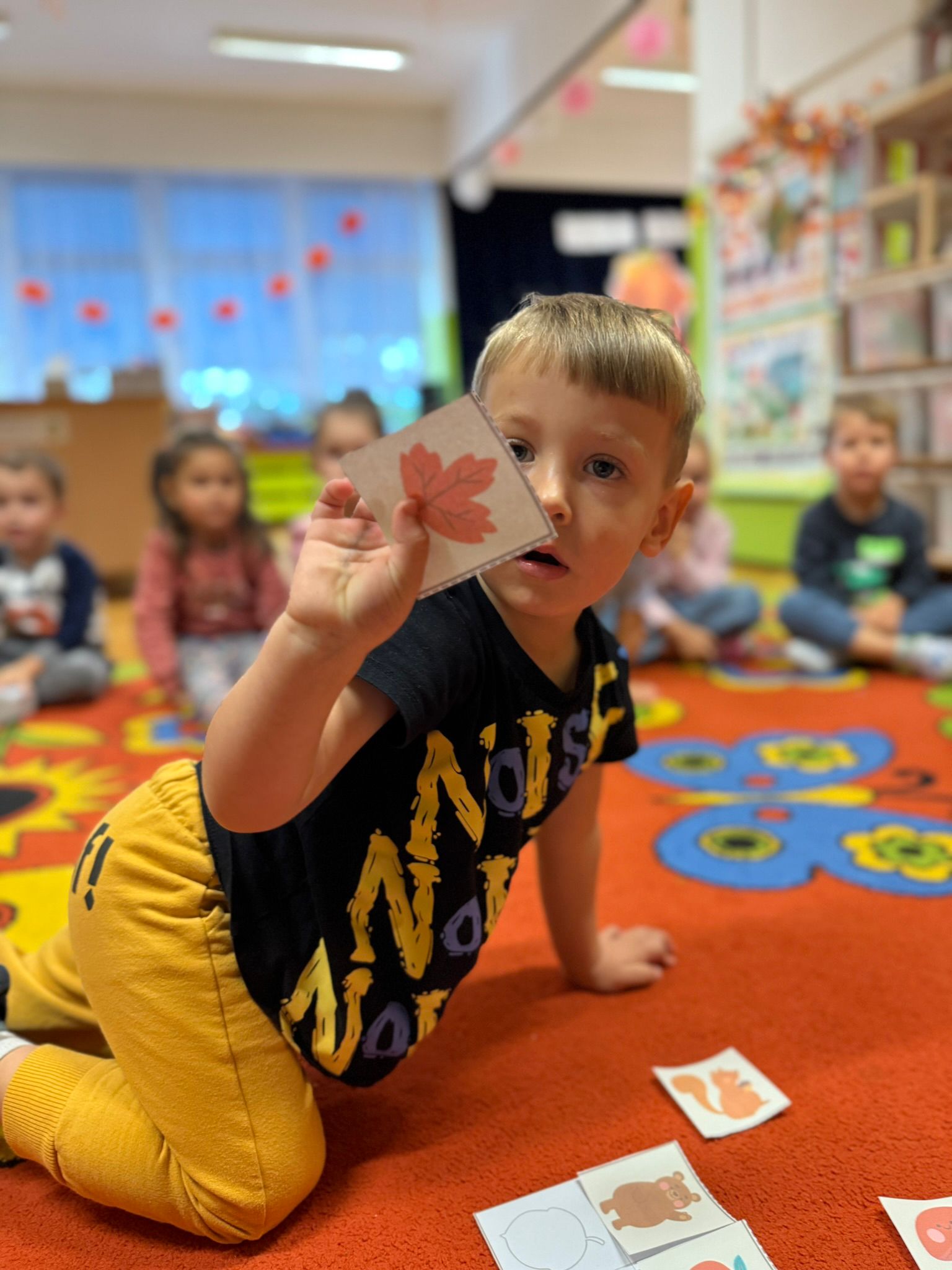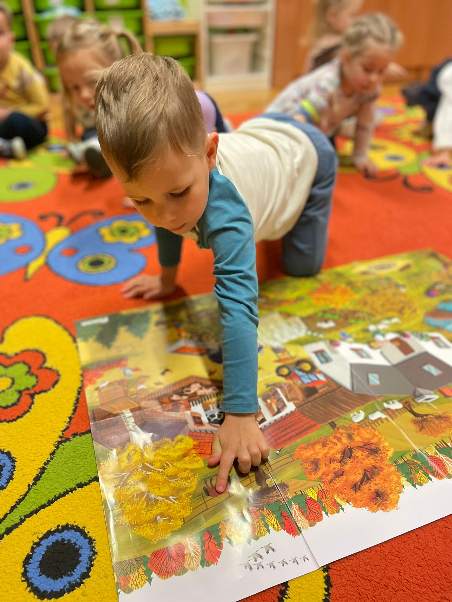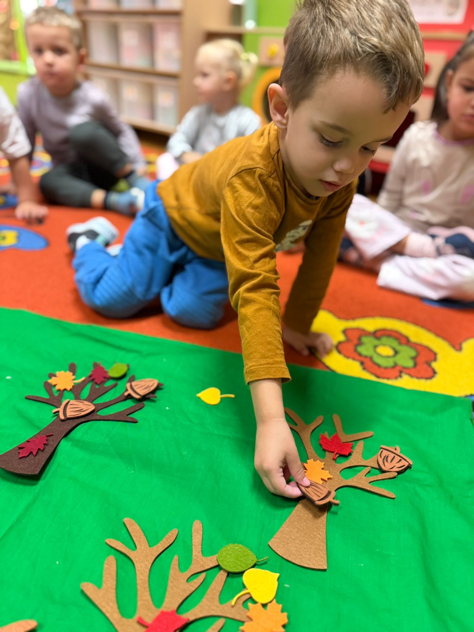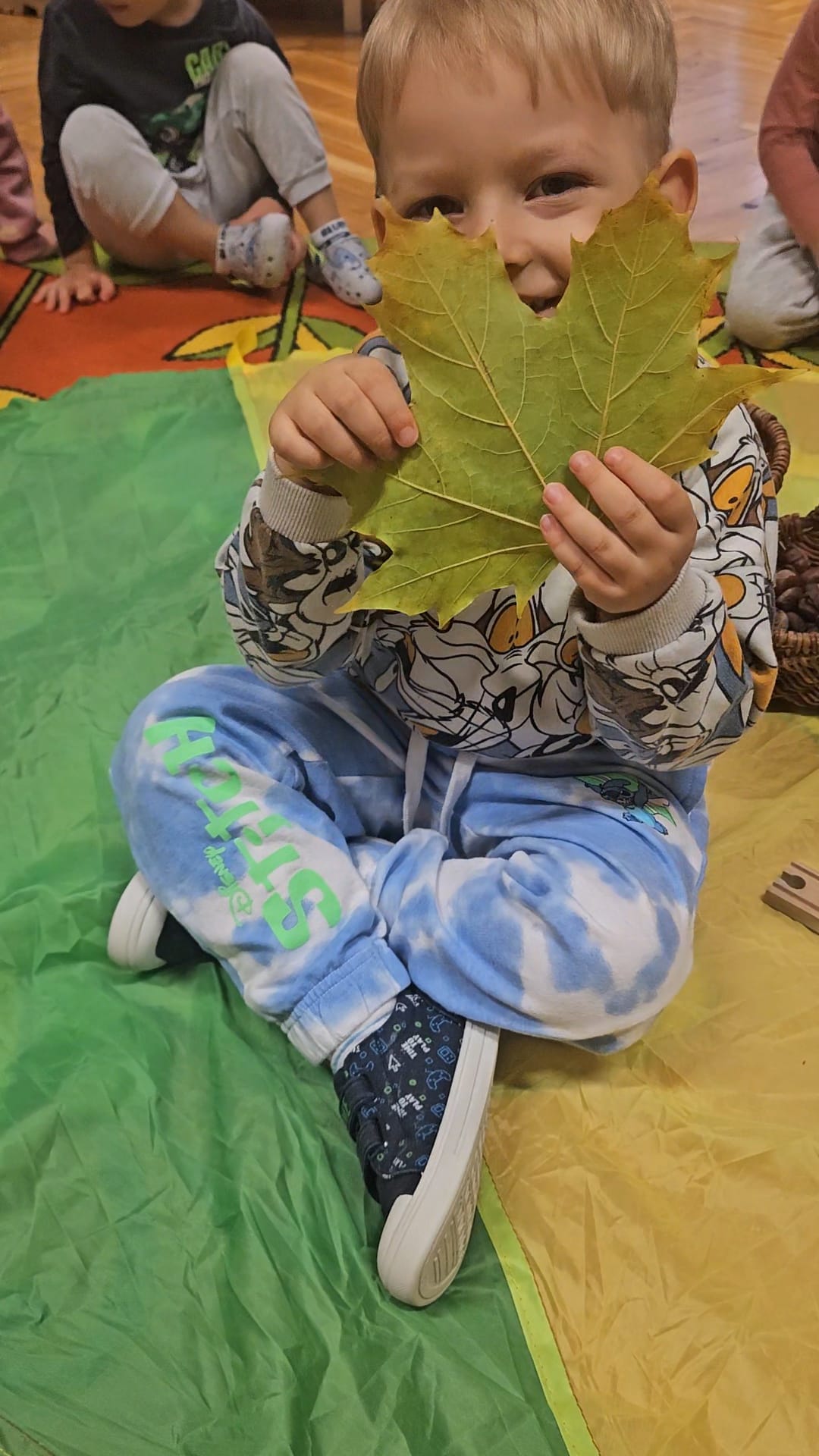 W grupie VII realizowaliśmy projekt edukacyjny „Dotykam, słucham, czuję – jesień”, podczas którego dzieci miały okazję poznawać jesień wszystkimi zmysłami.