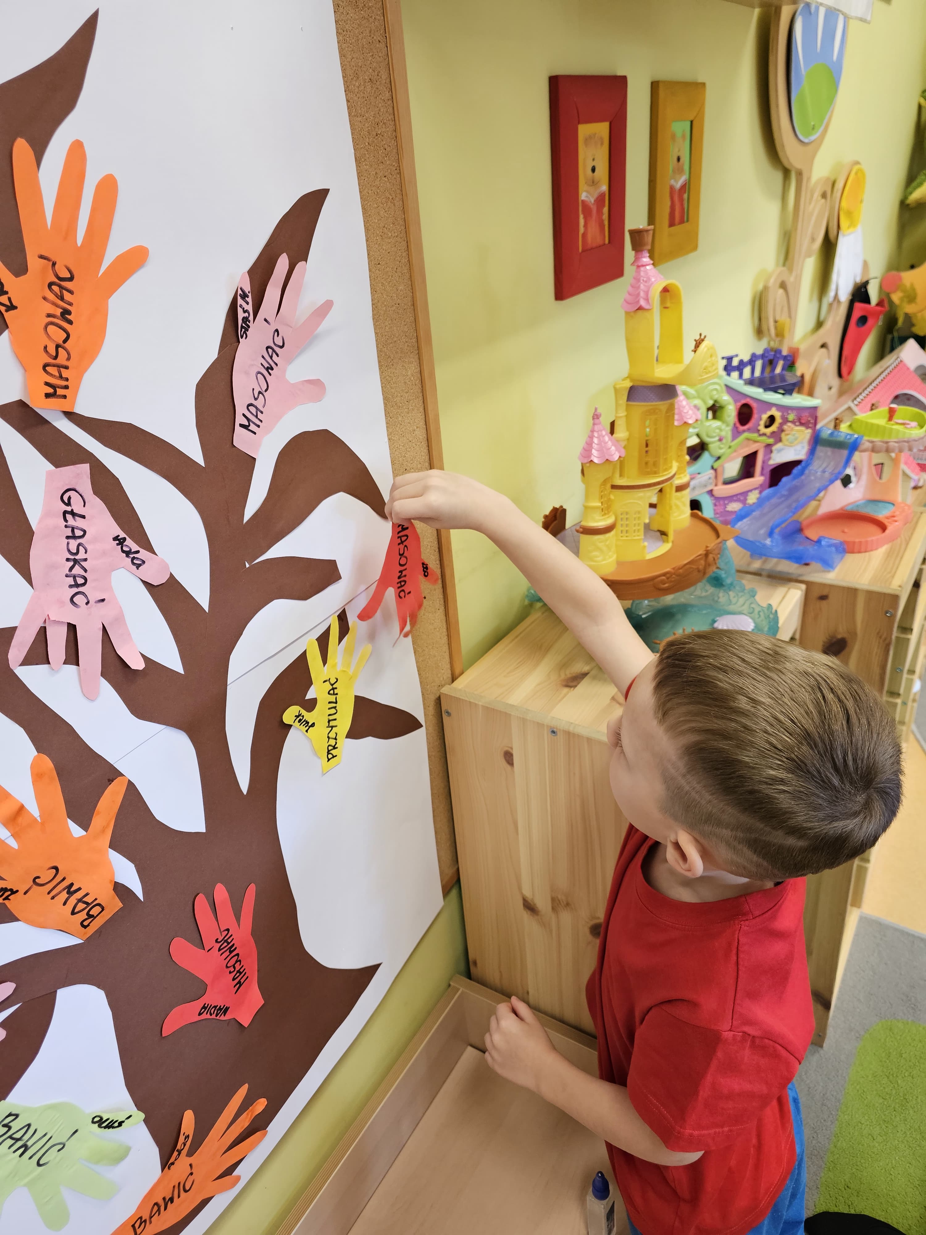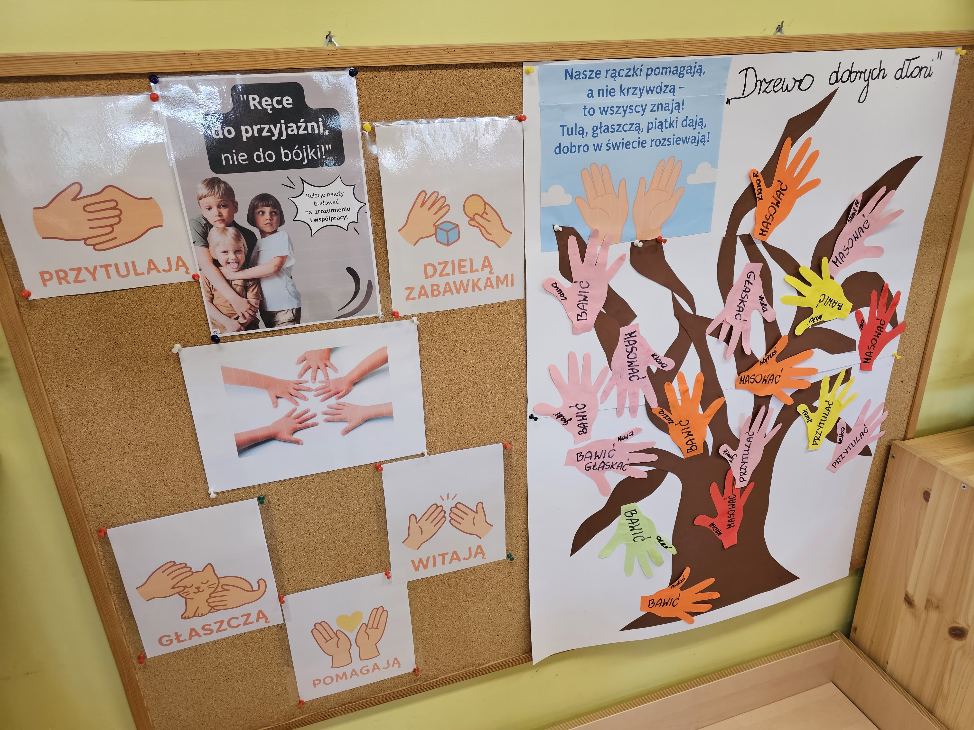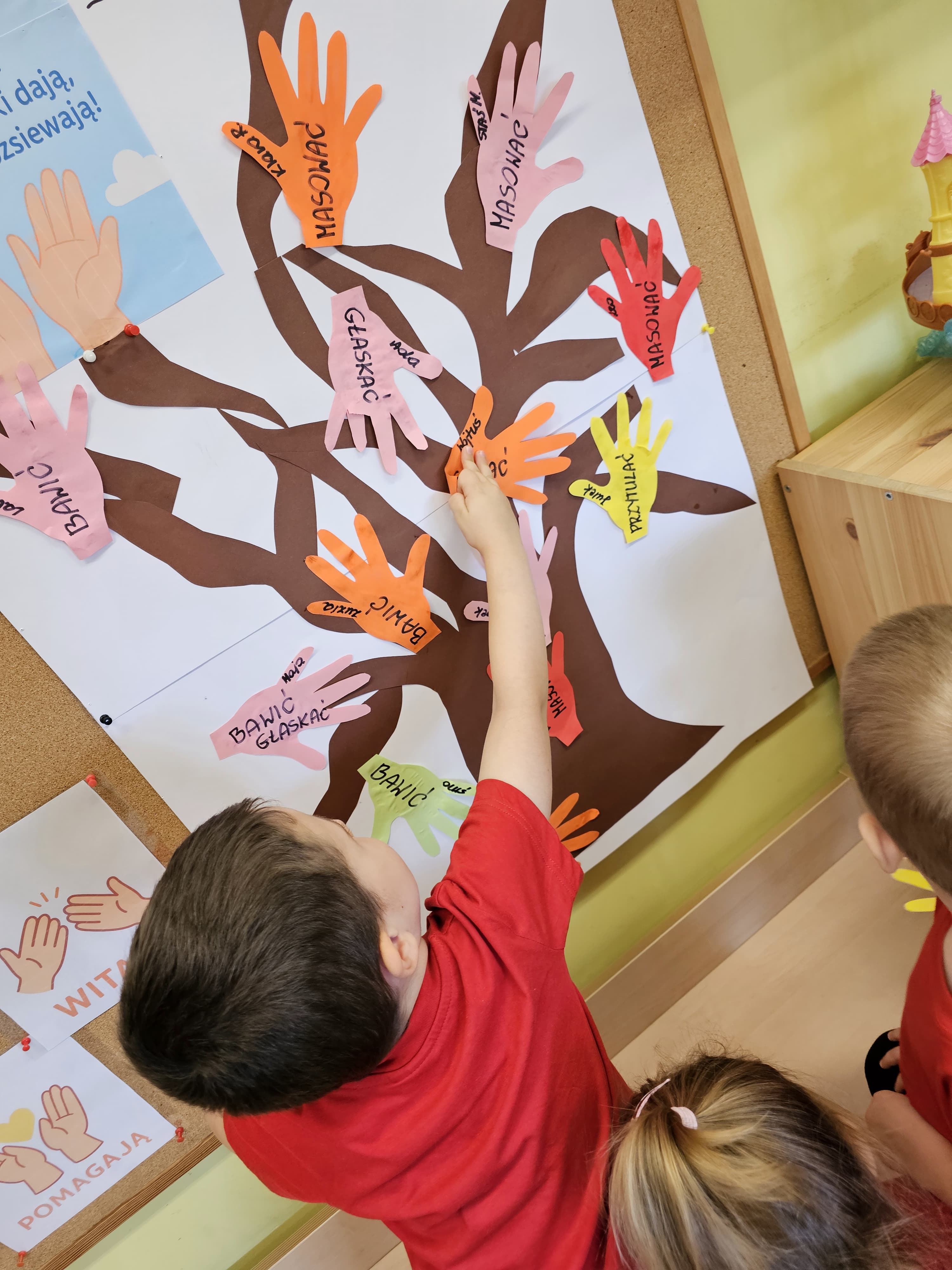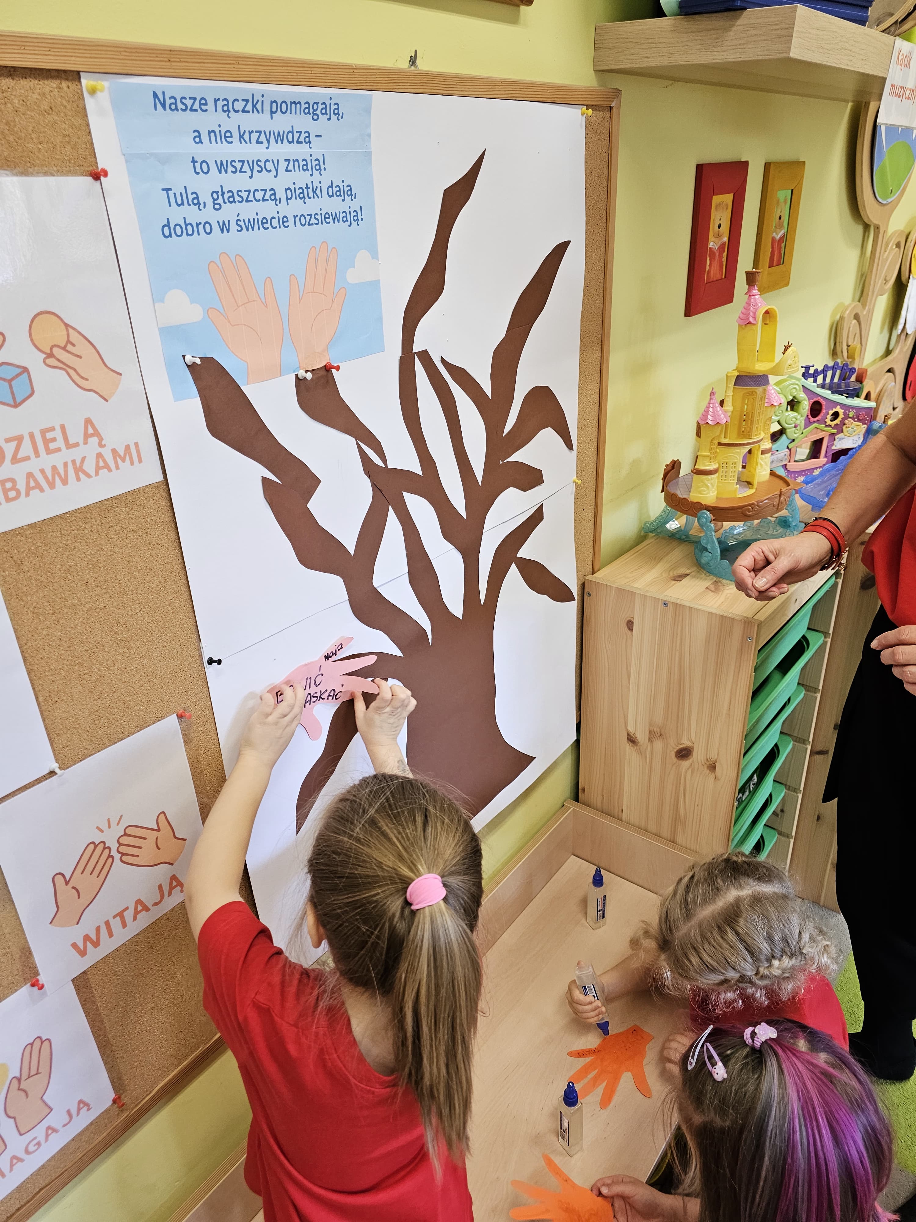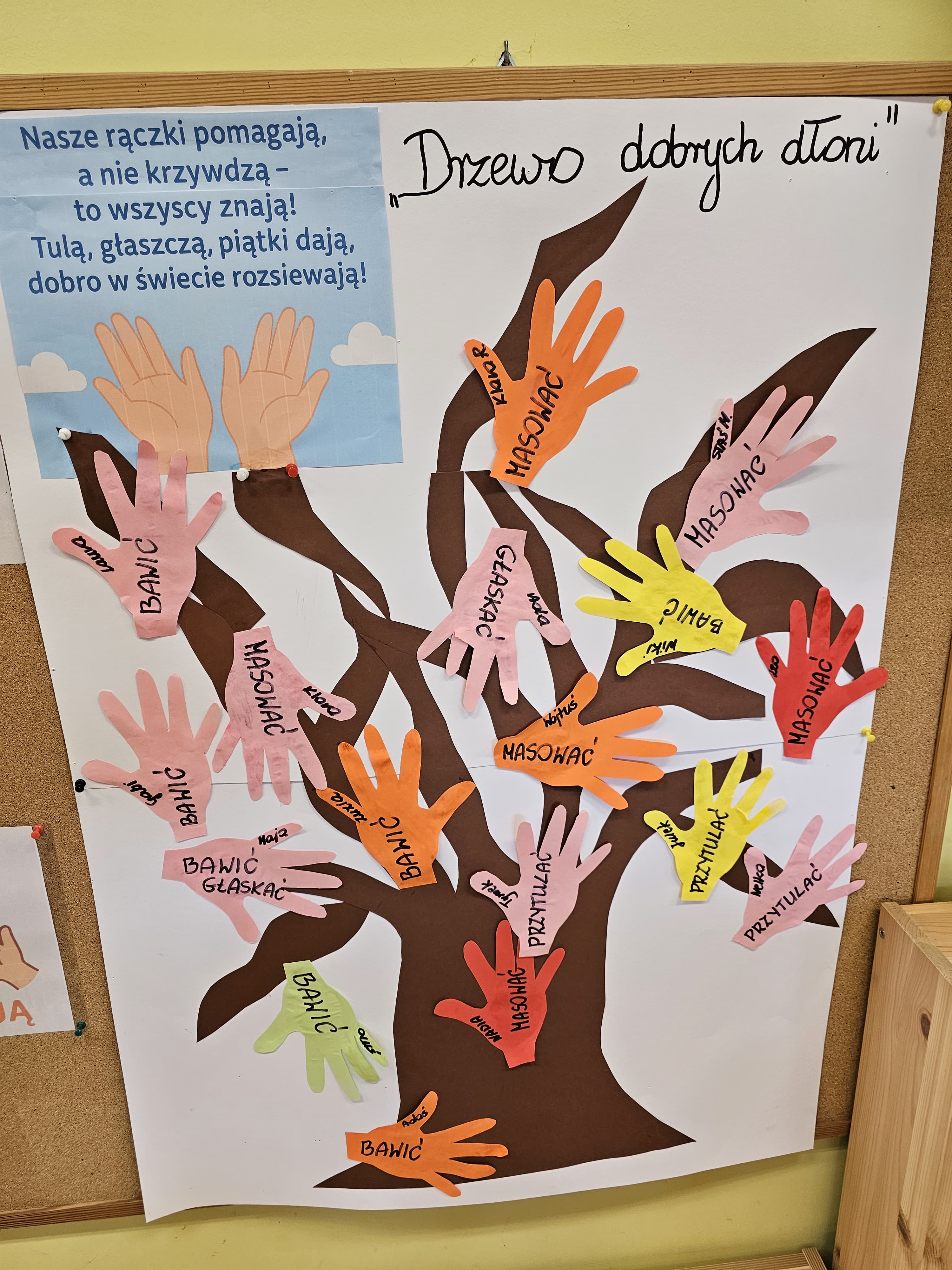 13.10. 2025 r. odbyły się wyjątkowe zajęcia w grupie średniaków, pod hasłem „Rączki, które pomagają”, zorganizowane w ramach ogólnopolskiej akcji „Dzieciństwo bez przemocy”. Celem naszych działań było pokazanie dzieciom, że każdy z nas ma moc czynienia dobra – wystarczy uśmiech, dobre słowo i pomocna dłoń. Podczas zajęć przedszkolaki uczestniczyły w zabawach ruchowych, plastycznych i rozmowach , które uczyły, jak ważna jest życzliwość, empatia i współpraca. Dzieci tworzyły własne „Rączki, które pomagają” – wycięte, kolorowe dłonie z zapisanymi dobrymi uczynkami, takimi jak: pomagam, przytulam, dzielę się, przepraszam, głaszczę, witam. Wspólnie powstało piękne „Drzewo dobrych dłoni”, symbol naszej przedszkolnej wspólnoty i wzajemnego wsparcia. Nie zabrakło także opowiadania o Misiu, który nauczył się przepraszać – dzięki niemu dzieci zrozumiały, że każdy może popełnić błąd, ale najważniejsze to umieć go naprawić i powiedzieć „przepraszam”. Na zakończenie każde dziecko otrzymało dyplom uczestnictwa w akcji i obiecało, że jego rączki będą służyć tylko do dobrych uczynków, zgodnie z przesłaniem : „Nasze rączki mogą tworzyć dobro każdego dnia – pomagając, przytulając i niosąc uśmiech innym.”