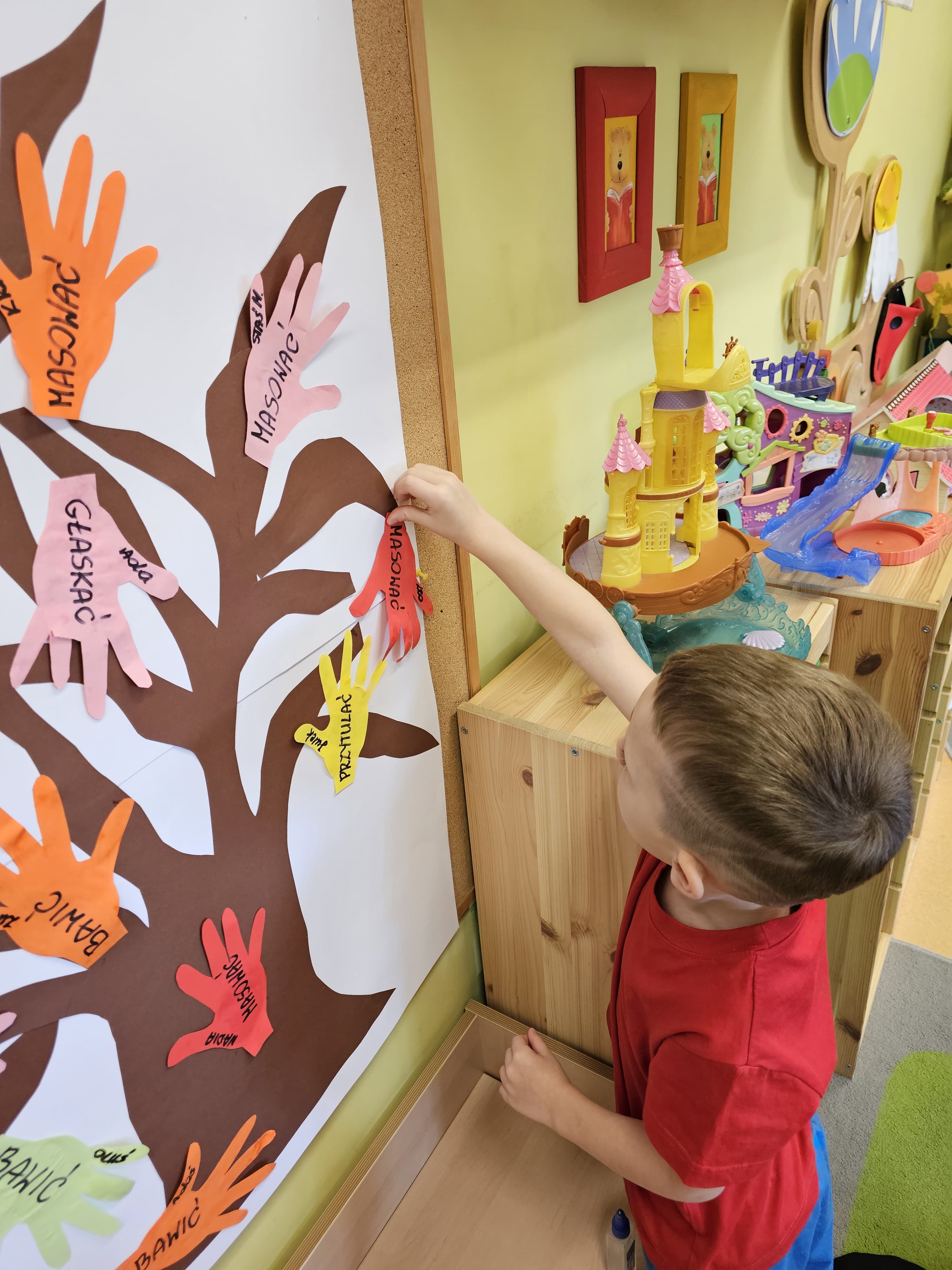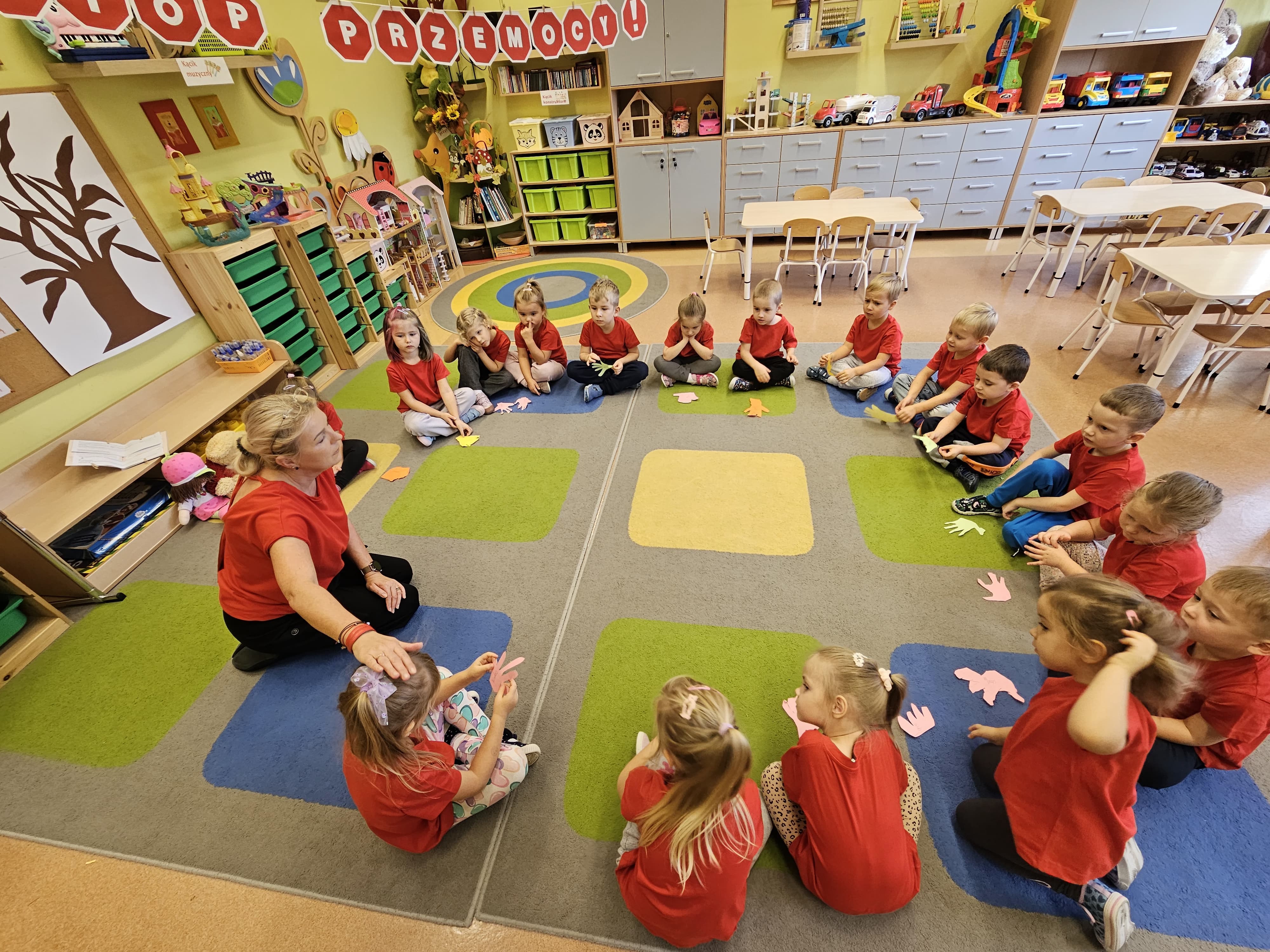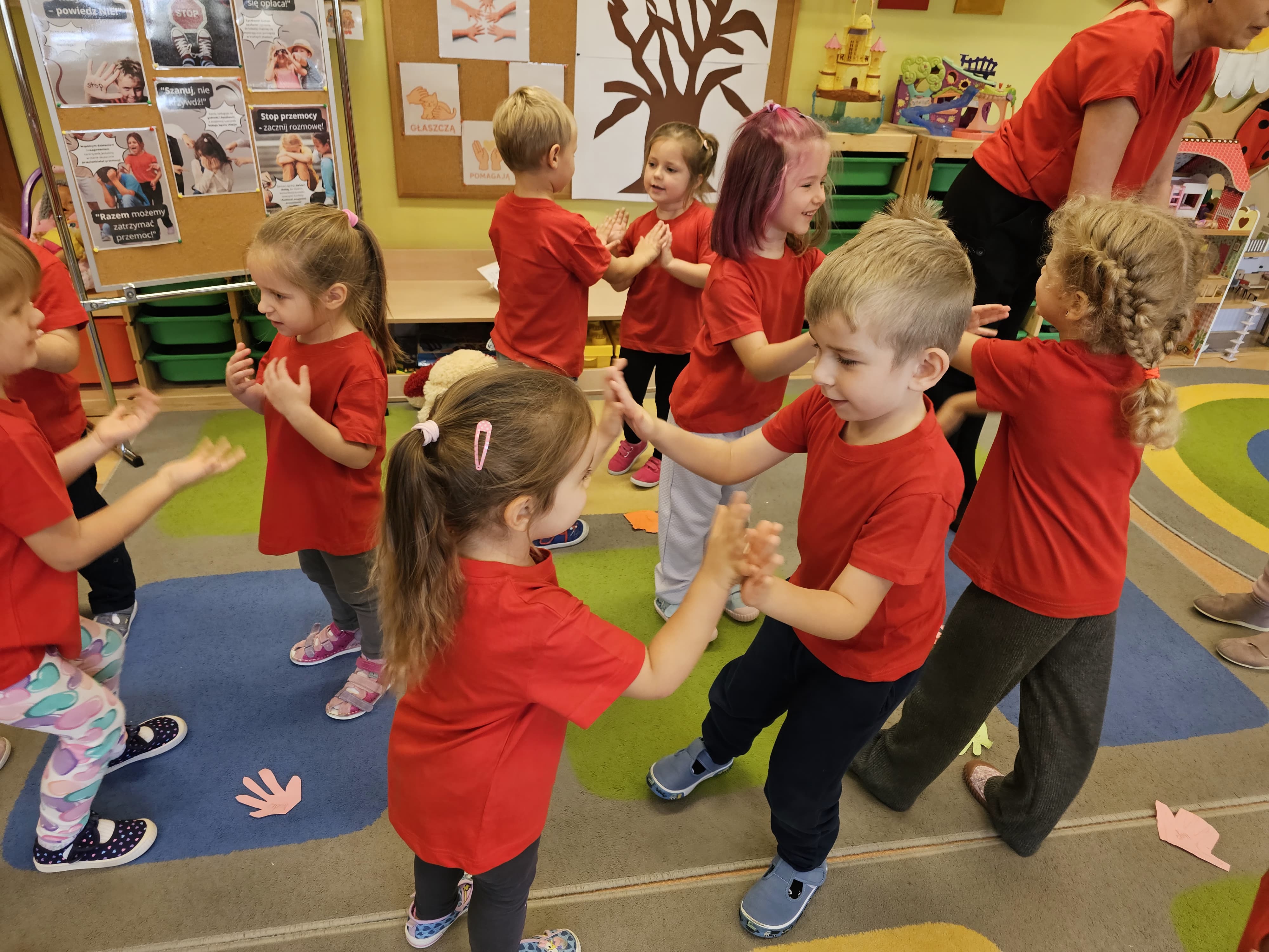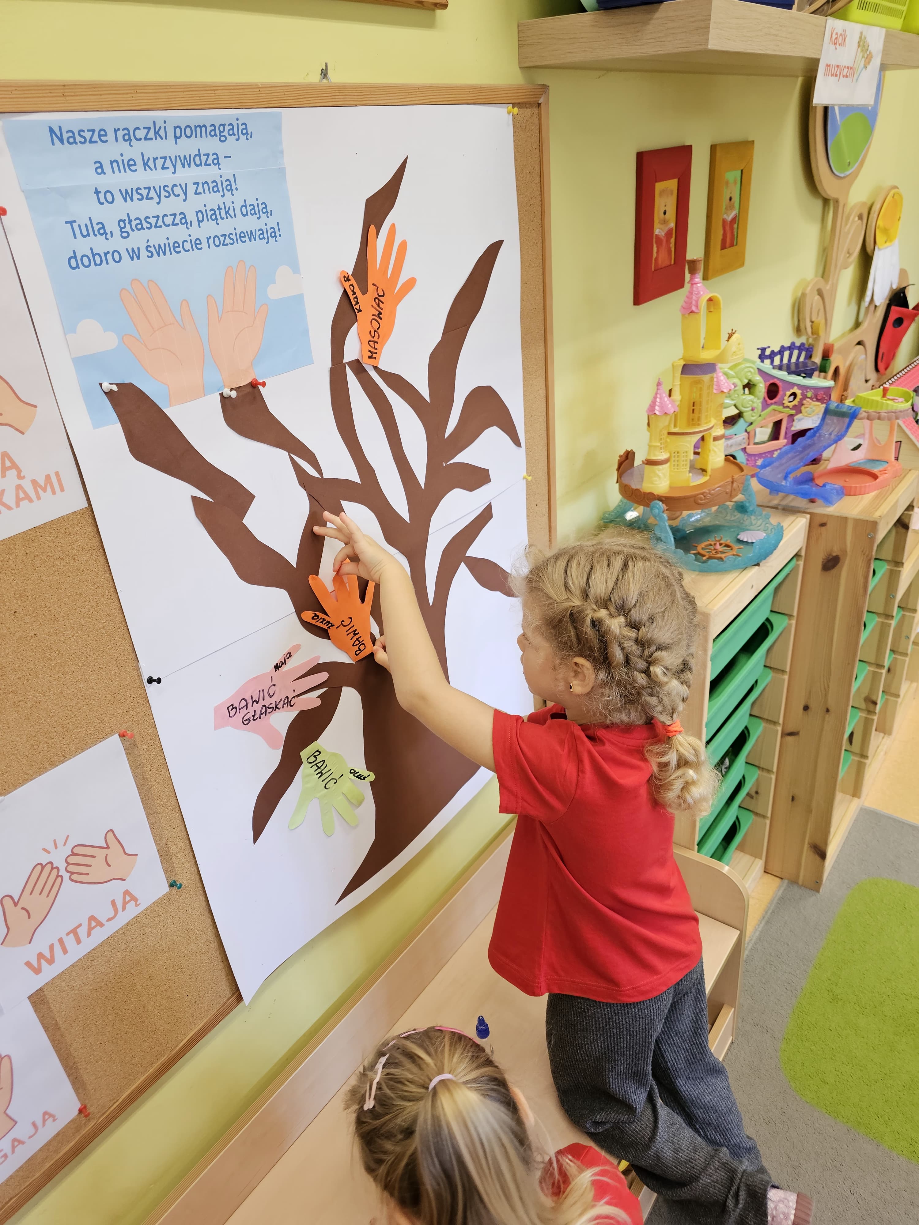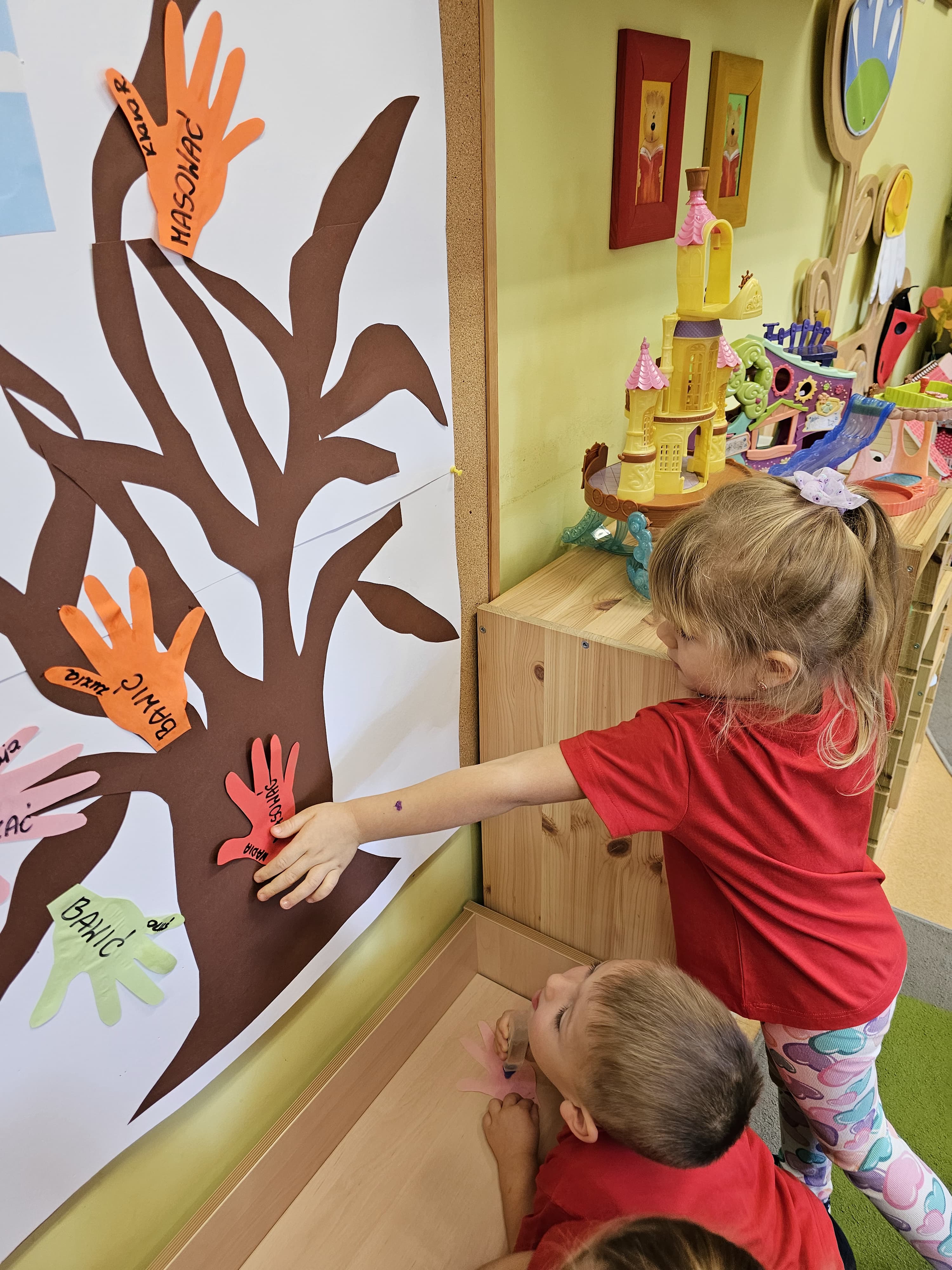 13.10. 2025 r. odbyły się wyjątkowe zajęcia w grupie średniaków, pod hasłem „Rączki, które pomagają”, zorganizowane w ramach ogólnopolskiej akcji „Dzieciństwo bez przemocy”. Celem naszych działań było pokazanie dzieciom, że każdy z nas ma moc czynienia dobra – wystarczy uśmiech, dobre słowo i pomocna dłoń. Podczas zajęć przedszkolaki uczestniczyły w zabawach ruchowych, plastycznych i rozmowach , które uczyły, jak ważna jest życzliwość, empatia i współpraca. Dzieci tworzyły własne „Rączki, które pomagają” – wycięte, kolorowe dłonie z zapisanymi dobrymi uczynkami, takimi jak: pomagam, przytulam, dzielę się, przepraszam, głaszczę, witam. Wspólnie powstało piękne „Drzewo dobrych dłoni”, symbol naszej przedszkolnej wspólnoty i wzajemnego wsparcia. Nie zabrakło także opowiadania o Misiu, który nauczył się przepraszać – dzięki niemu dzieci zrozumiały, że każdy może popełnić błąd, ale najważniejsze to umieć go naprawić i powiedzieć „przepraszam”. Na zakończenie każde dziecko otrzymało dyplom uczestnictwa w akcji i obiecało, że jego rączki będą służyć tylko do dobrych uczynków, zgodnie z przesłaniem : „Nasze rączki mogą tworzyć dobro każdego dnia – pomagając, przytulając i niosąc uśmiech innym.”