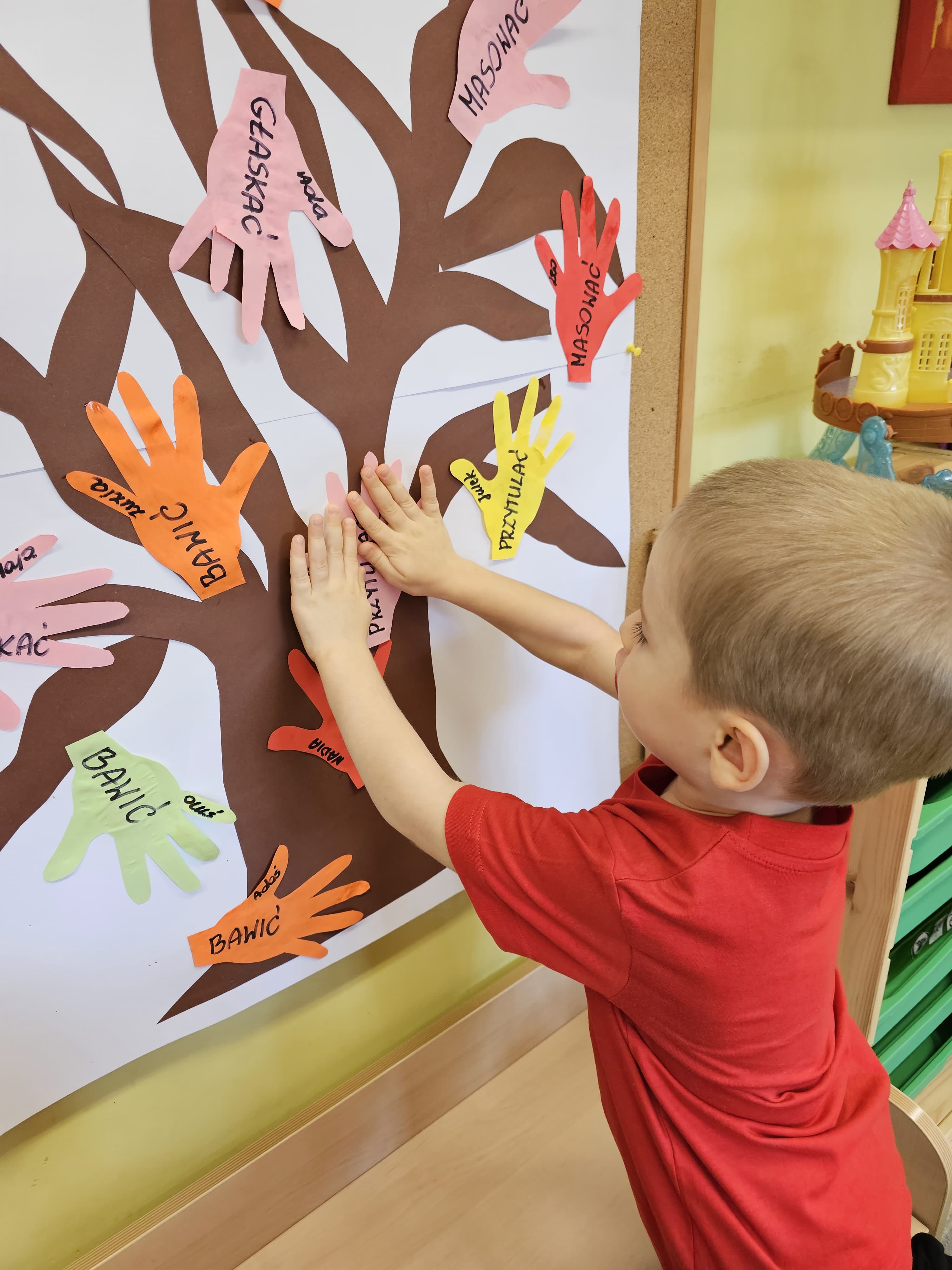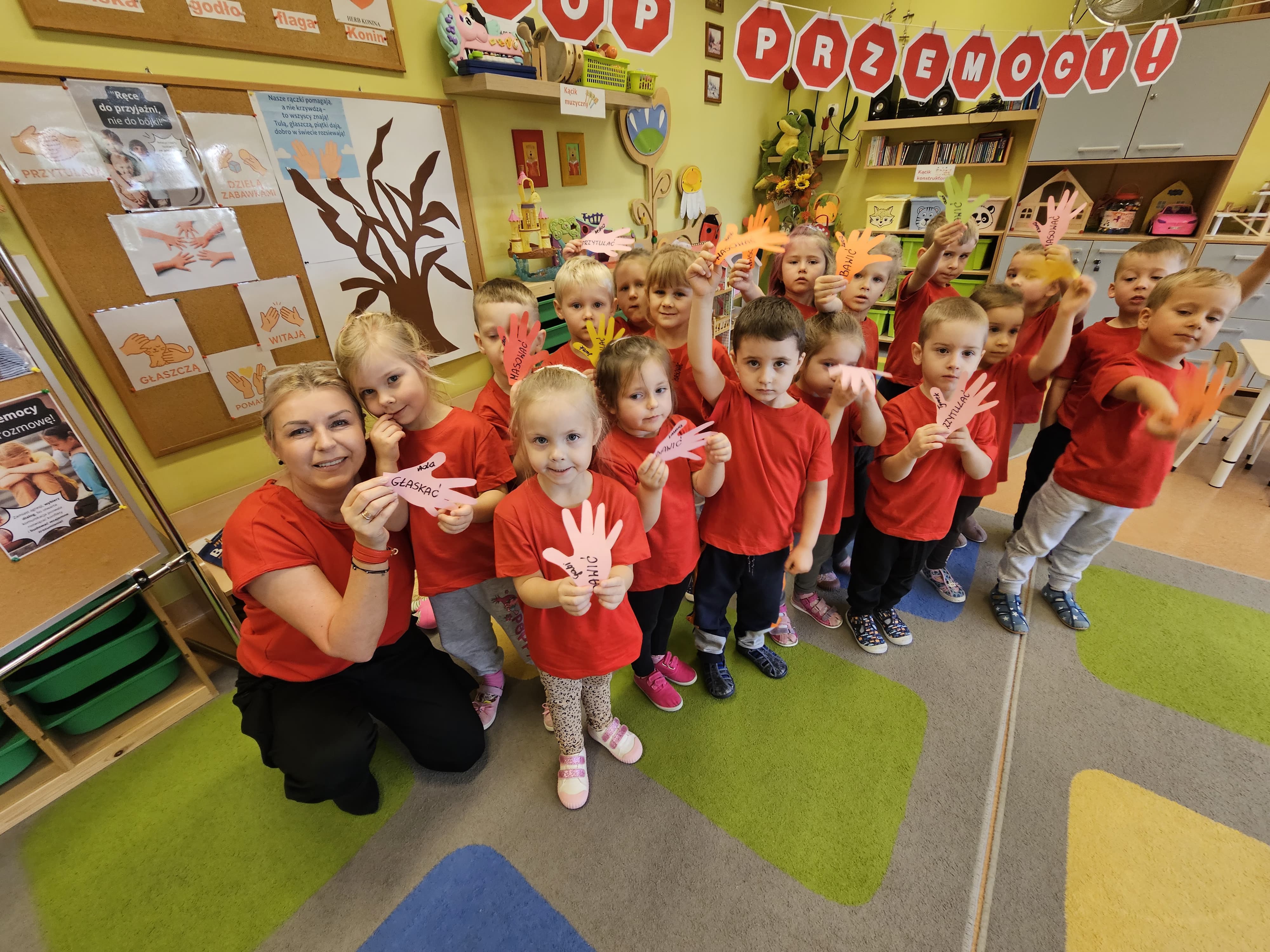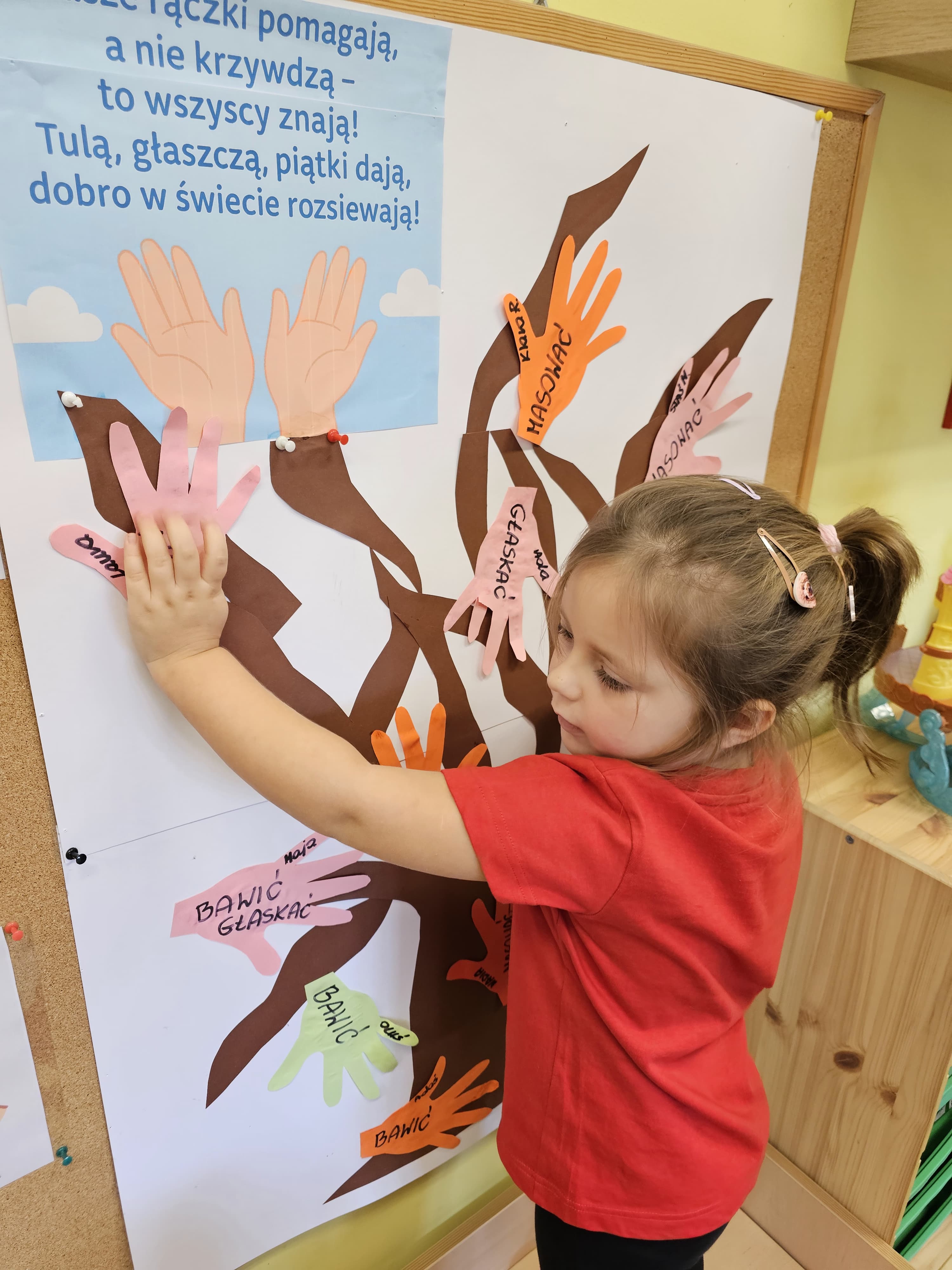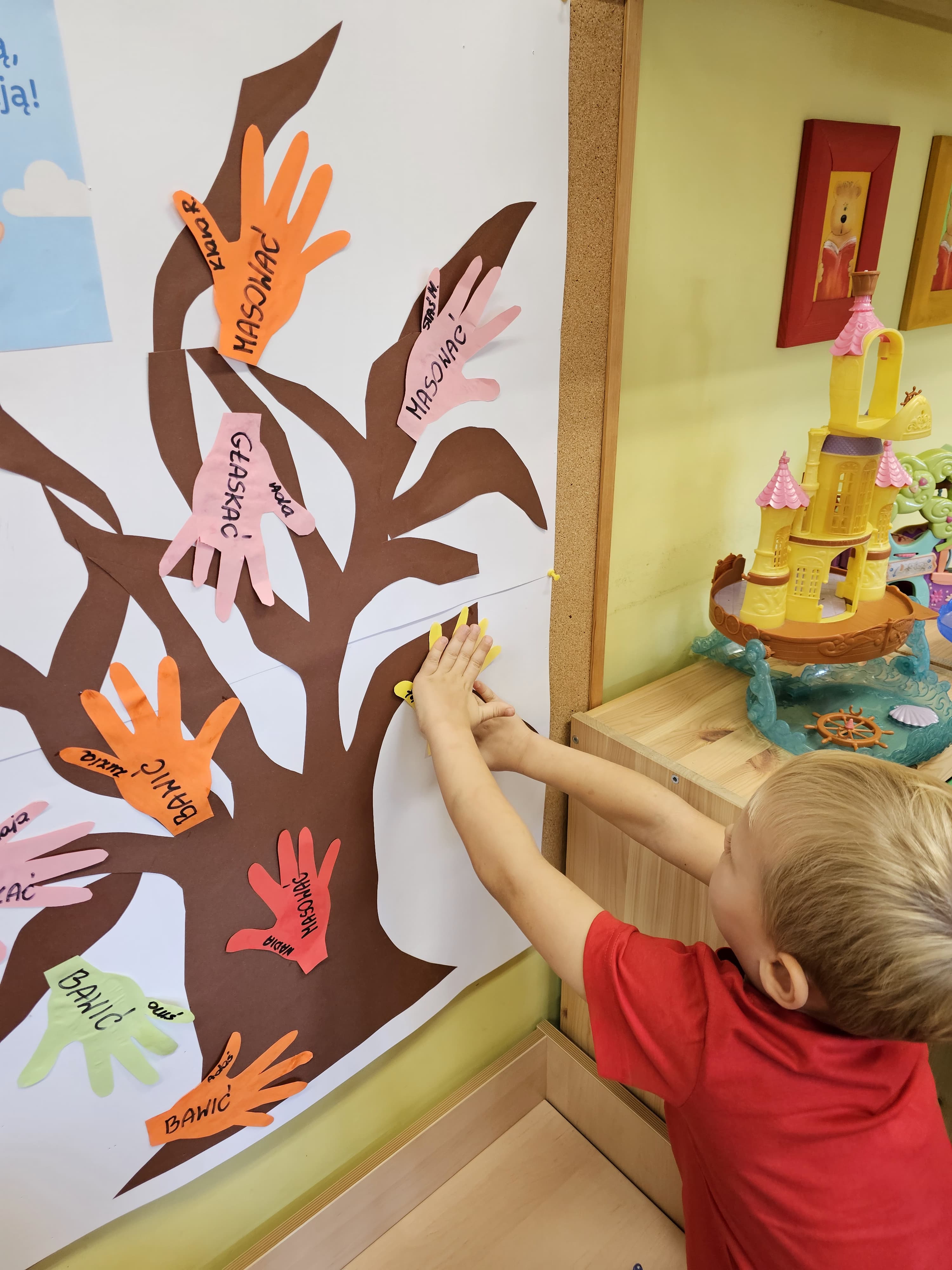 13.10. 2025 r. odbyły się wyjątkowe zajęcia w grupie średniaków, pod hasłem „Rączki, które pomagają”, zorganizowane w ramach ogólnopolskiej akcji „Dzieciństwo bez przemocy”. Celem naszych działań było pokazanie dzieciom, że każdy z nas ma moc czynienia dobra – wystarczy uśmiech, dobre słowo i pomocna dłoń. Podczas zajęć przedszkolaki uczestniczyły w zabawach ruchowych, plastycznych i rozmowach , które uczyły, jak ważna jest życzliwość, empatia i współpraca. Dzieci tworzyły własne „Rączki, które pomagają” – wycięte, kolorowe dłonie z zapisanymi dobrymi uczynkami, takimi jak: pomagam, przytulam, dzielę się, przepraszam, głaszczę, witam. Wspólnie powstało piękne „Drzewo dobrych dłoni”, symbol naszej przedszkolnej wspólnoty i wzajemnego wsparcia. Nie zabrakło także opowiadania o Misiu, który nauczył się przepraszać – dzięki niemu dzieci zrozumiały, że każdy może popełnić błąd, ale najważniejsze to umieć go naprawić i powiedzieć „przepraszam”. Na zakończenie każde dziecko otrzymało dyplom uczestnictwa w akcji i obiecało, że jego rączki będą służyć tylko do dobrych uczynków, zgodnie z przesłaniem : „Nasze rączki mogą tworzyć dobro każdego dnia – pomagając, przytulając i niosąc uśmiech innym.”