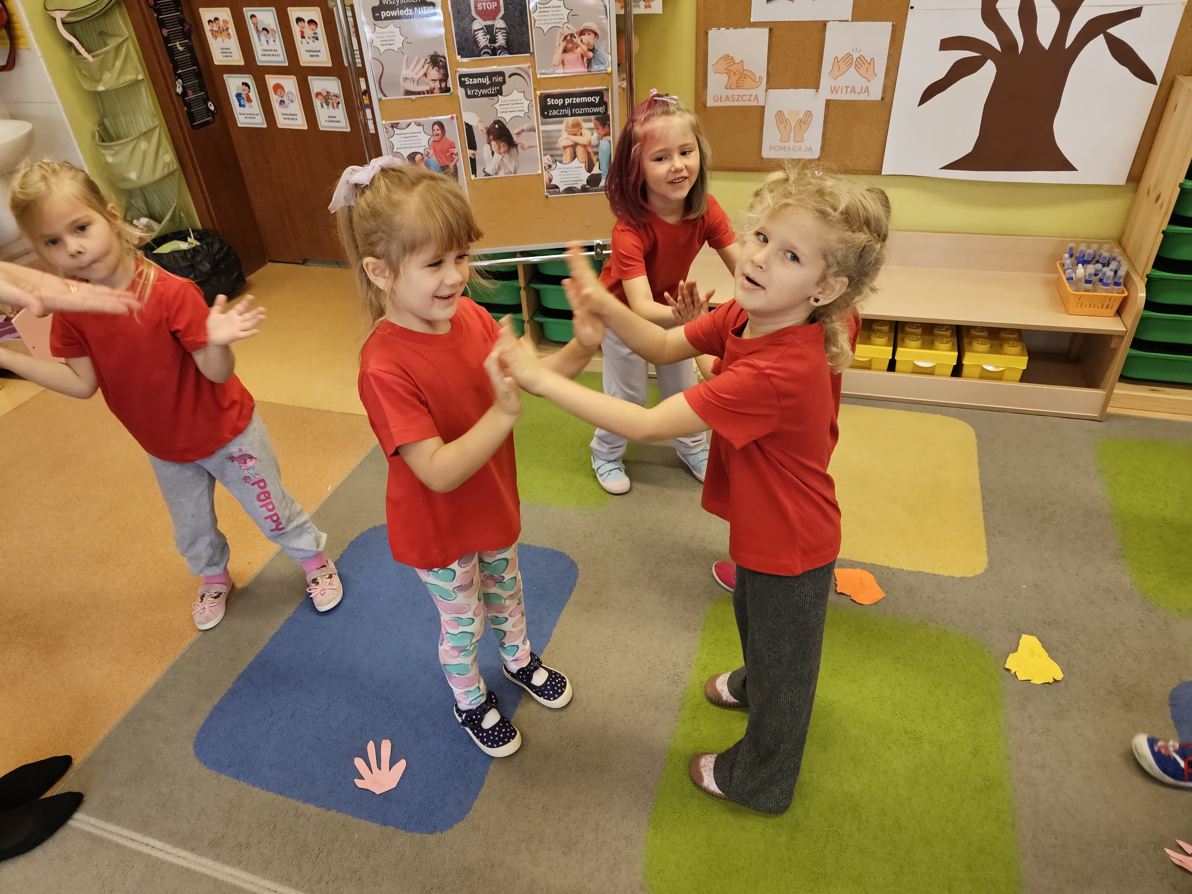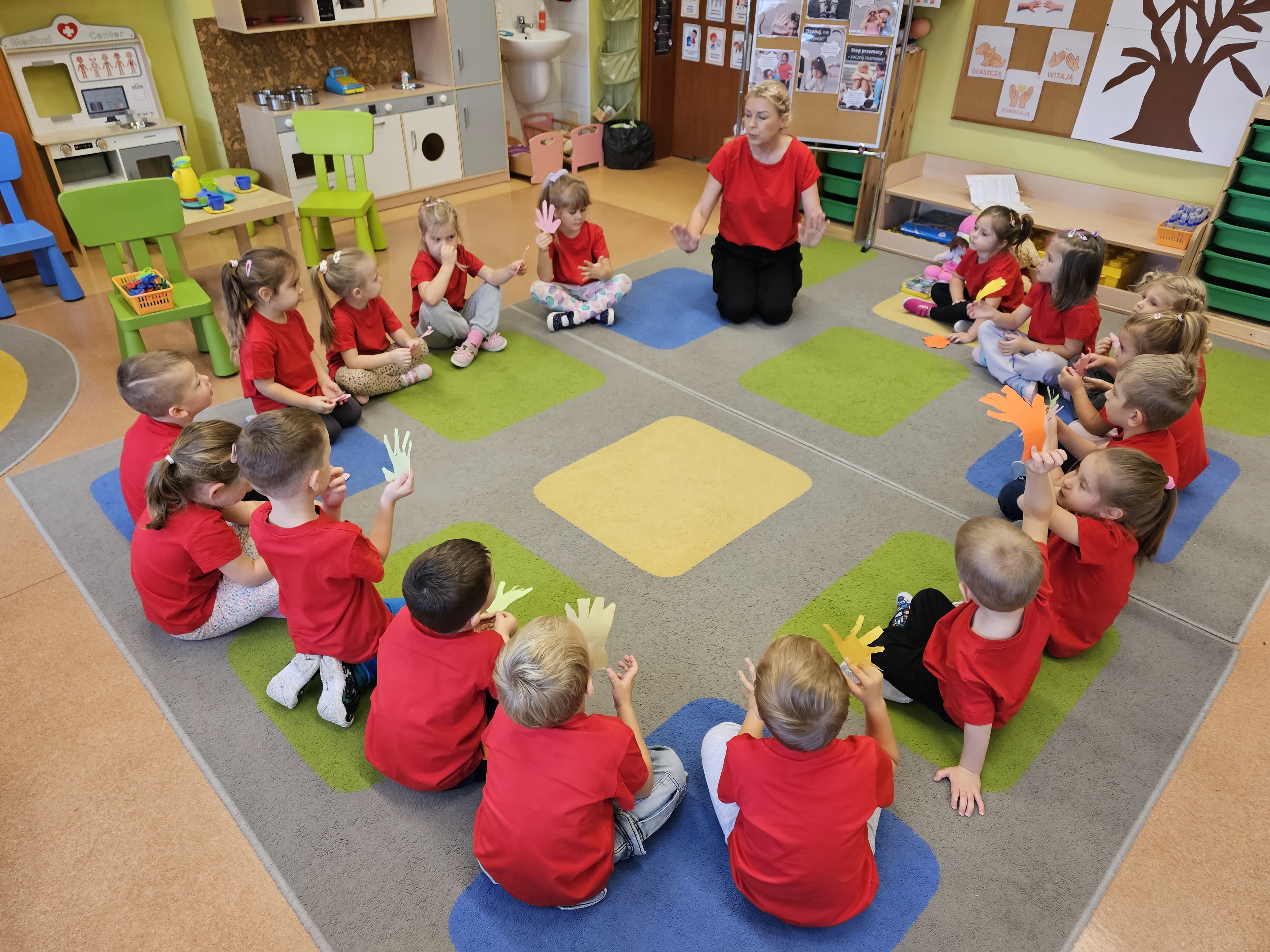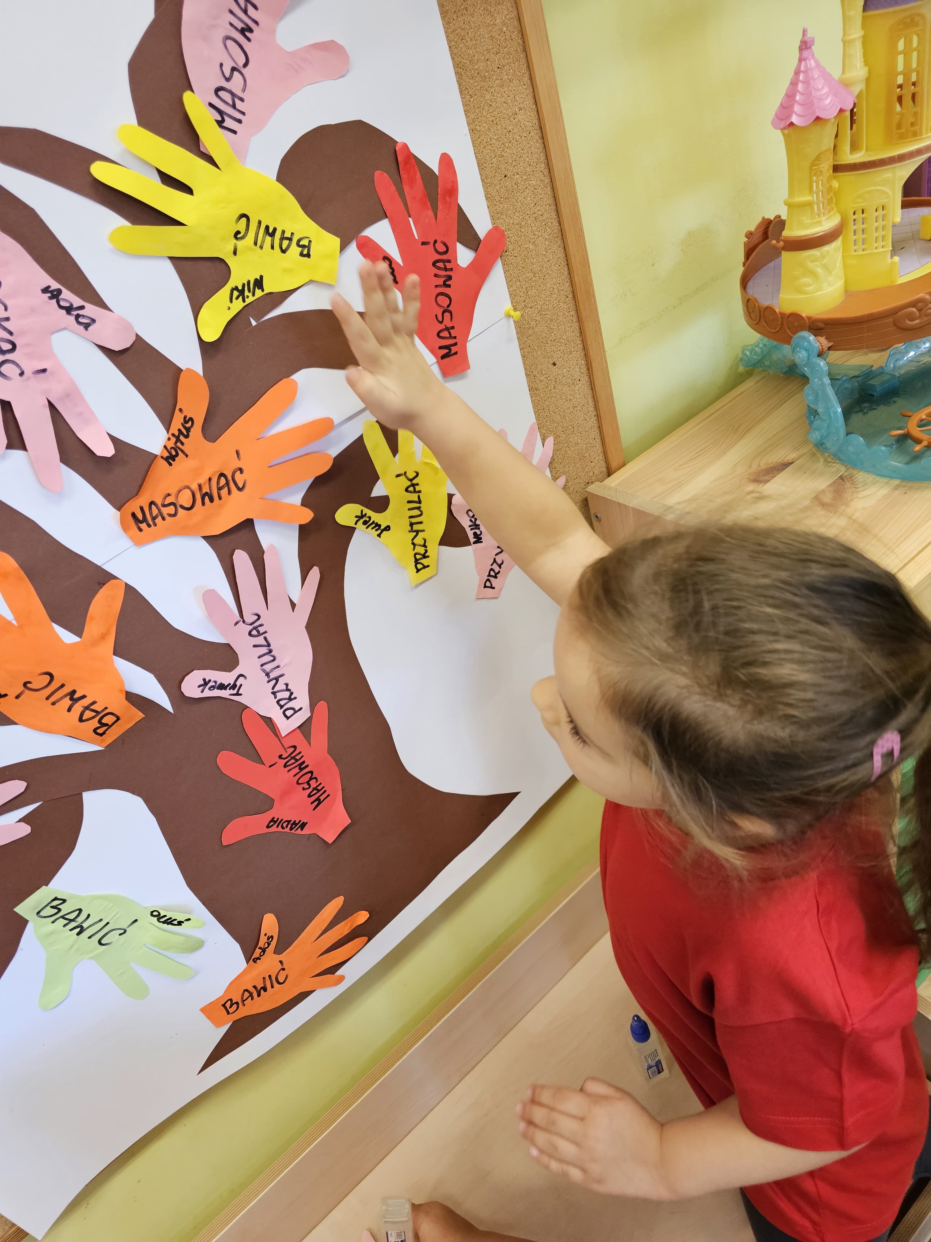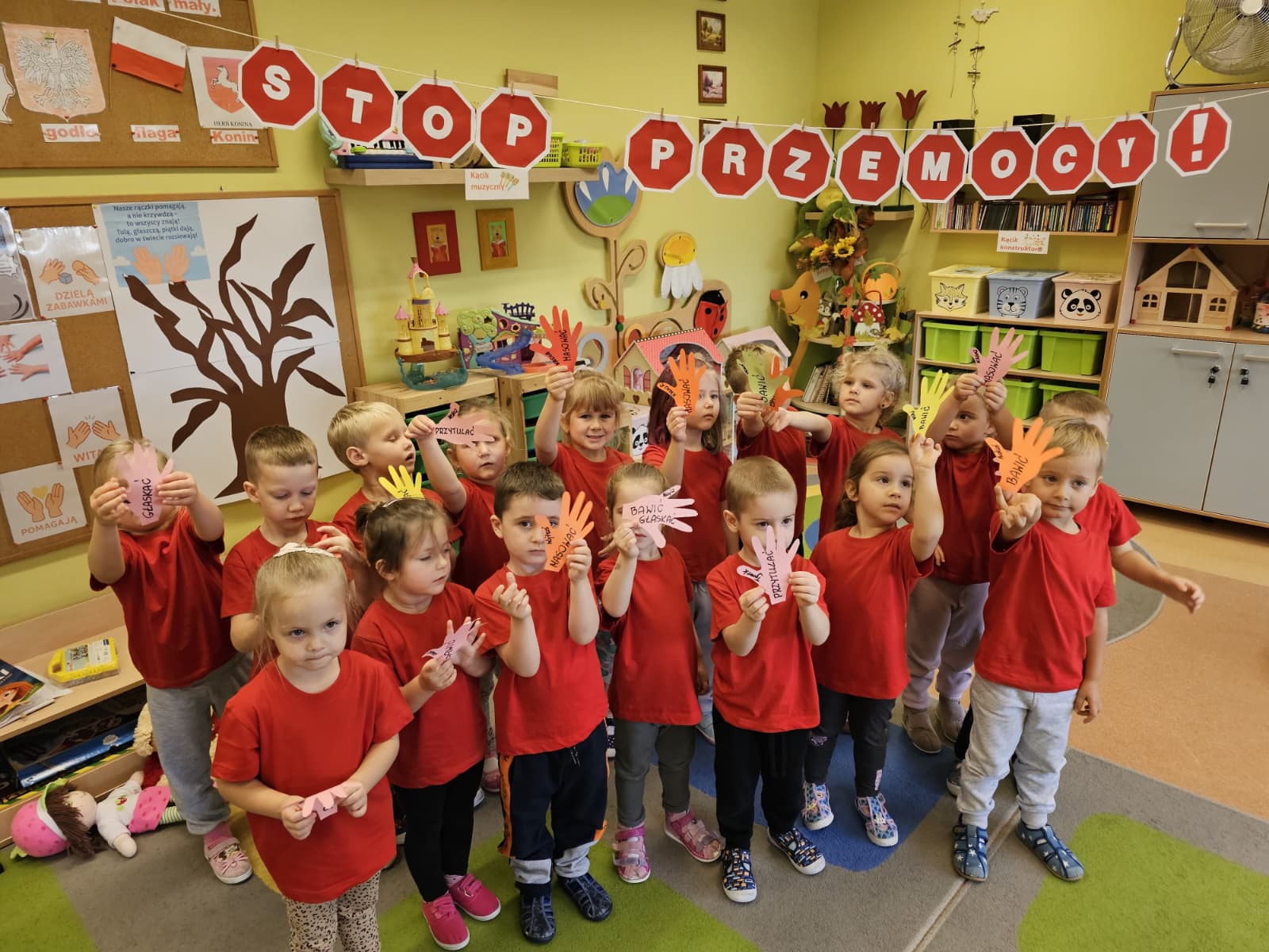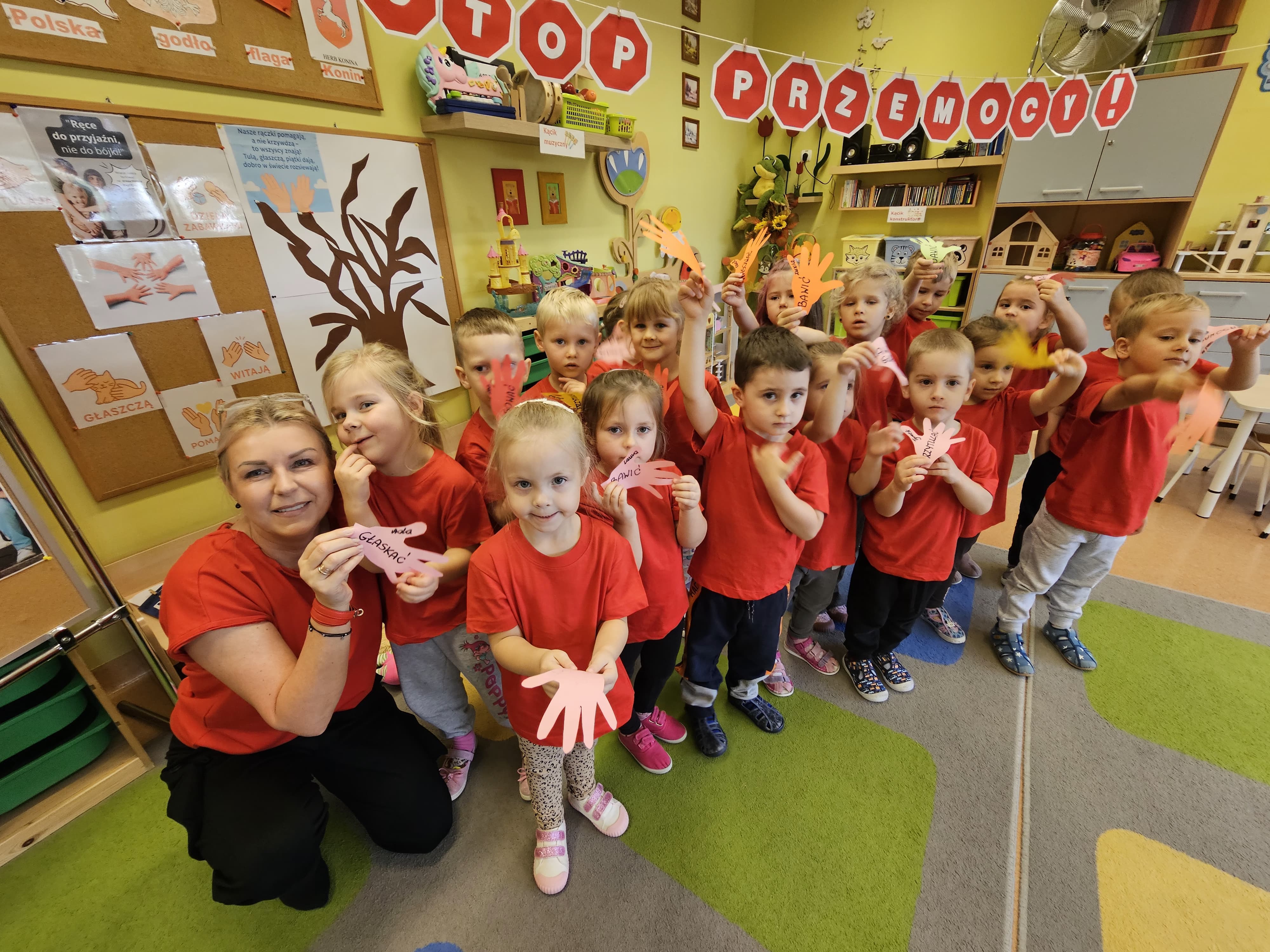 13.10. 2025 r. odbyły się wyjątkowe zajęcia w grupie średniaków, pod hasłem „Rączki, które pomagają”, zorganizowane w ramach ogólnopolskiej akcji „Dzieciństwo bez przemocy”. Celem naszych działań było pokazanie dzieciom, że każdy z nas ma moc czynienia dobra – wystarczy uśmiech, dobre słowo i pomocna dłoń. Podczas zajęć przedszkolaki uczestniczyły w zabawach ruchowych, plastycznych i rozmowach , które uczyły, jak ważna jest życzliwość, empatia i współpraca. Dzieci tworzyły własne „Rączki, które pomagają” – wycięte, kolorowe dłonie z zapisanymi dobrymi uczynkami, takimi jak: pomagam, przytulam, dzielę się, przepraszam, głaszczę, witam. Wspólnie powstało piękne „Drzewo dobrych dłoni”, symbol naszej przedszkolnej wspólnoty i wzajemnego wsparcia. Nie zabrakło także opowiadania o Misiu, który nauczył się przepraszać – dzięki niemu dzieci zrozumiały, że każdy może popełnić błąd, ale najważniejsze to umieć go naprawić i powiedzieć „przepraszam”. Na zakończenie każde dziecko otrzymało dyplom uczestnictwa w akcji i obiecało, że jego rączki będą służyć tylko do dobrych uczynków, zgodnie z przesłaniem : „Nasze rączki mogą tworzyć dobro każdego dnia – pomagając, przytulając i niosąc uśmiech innym.”