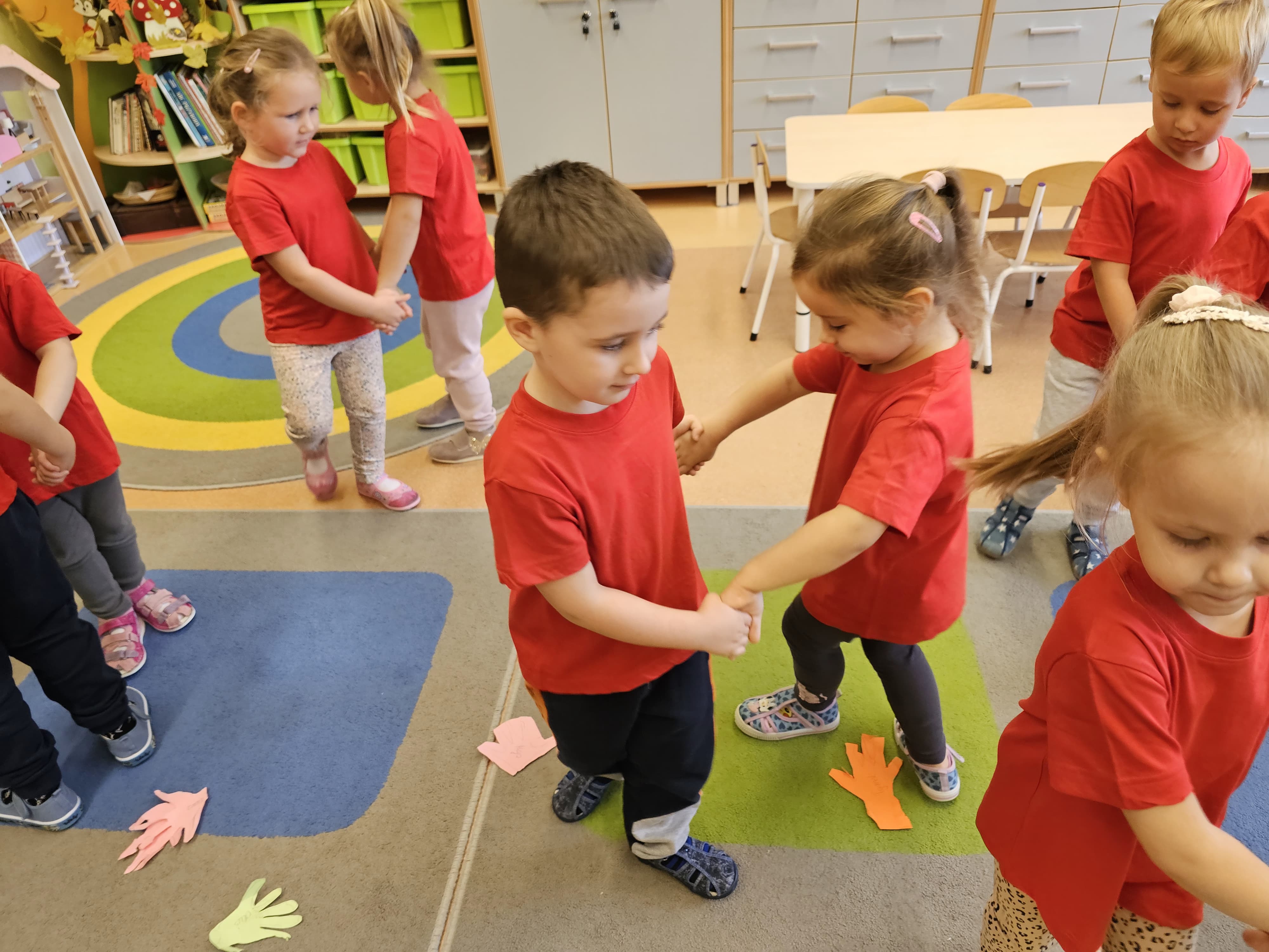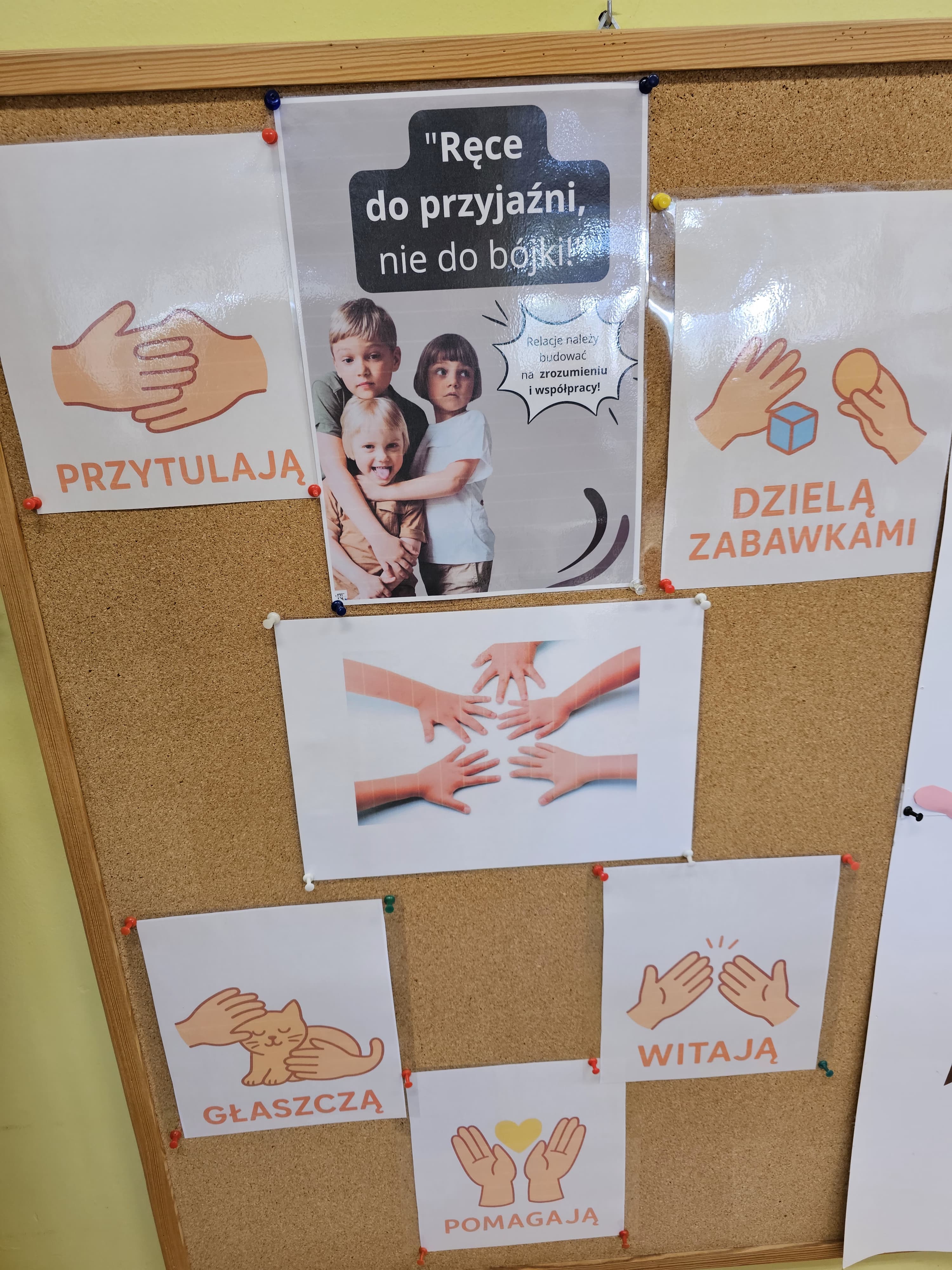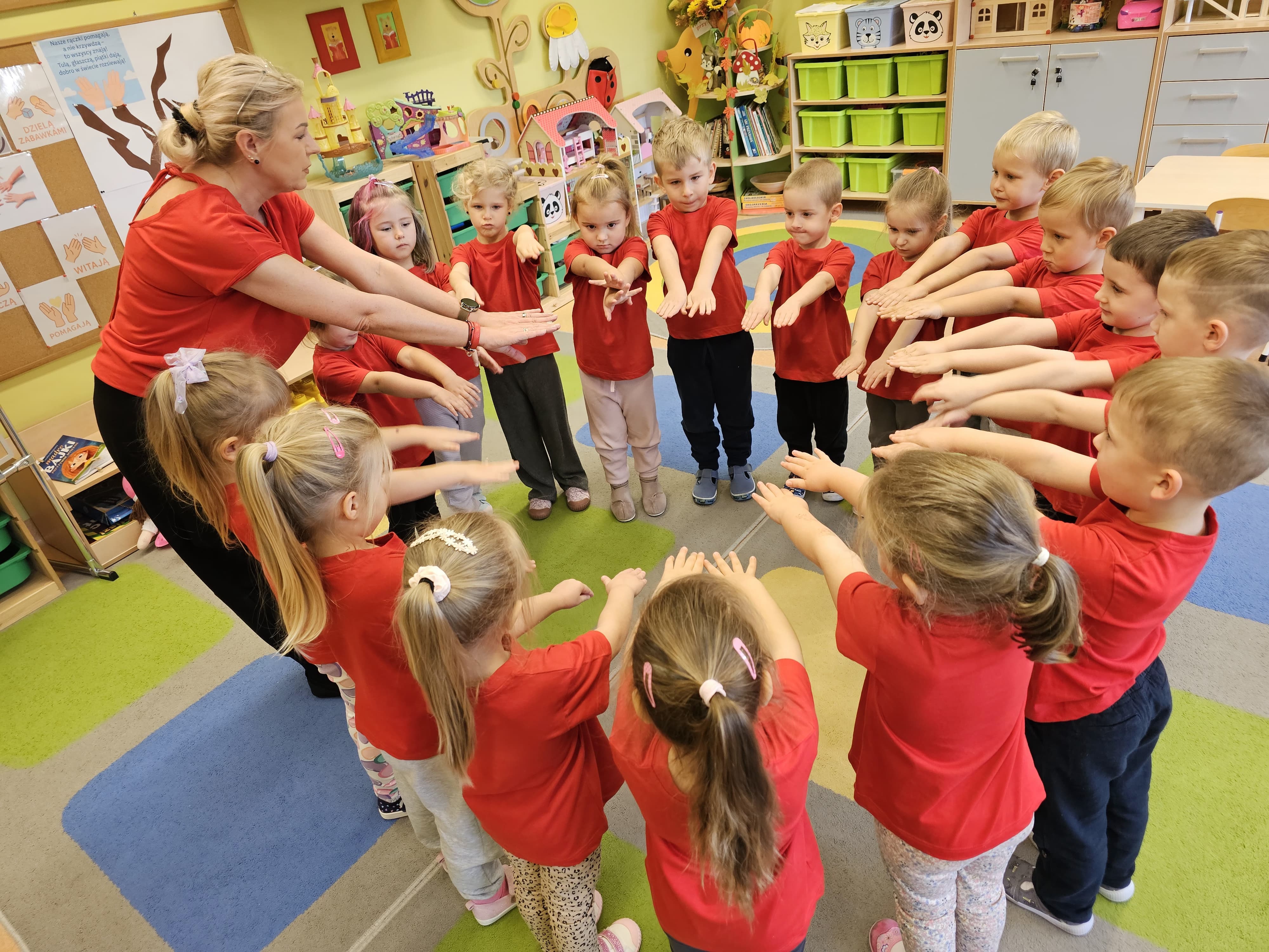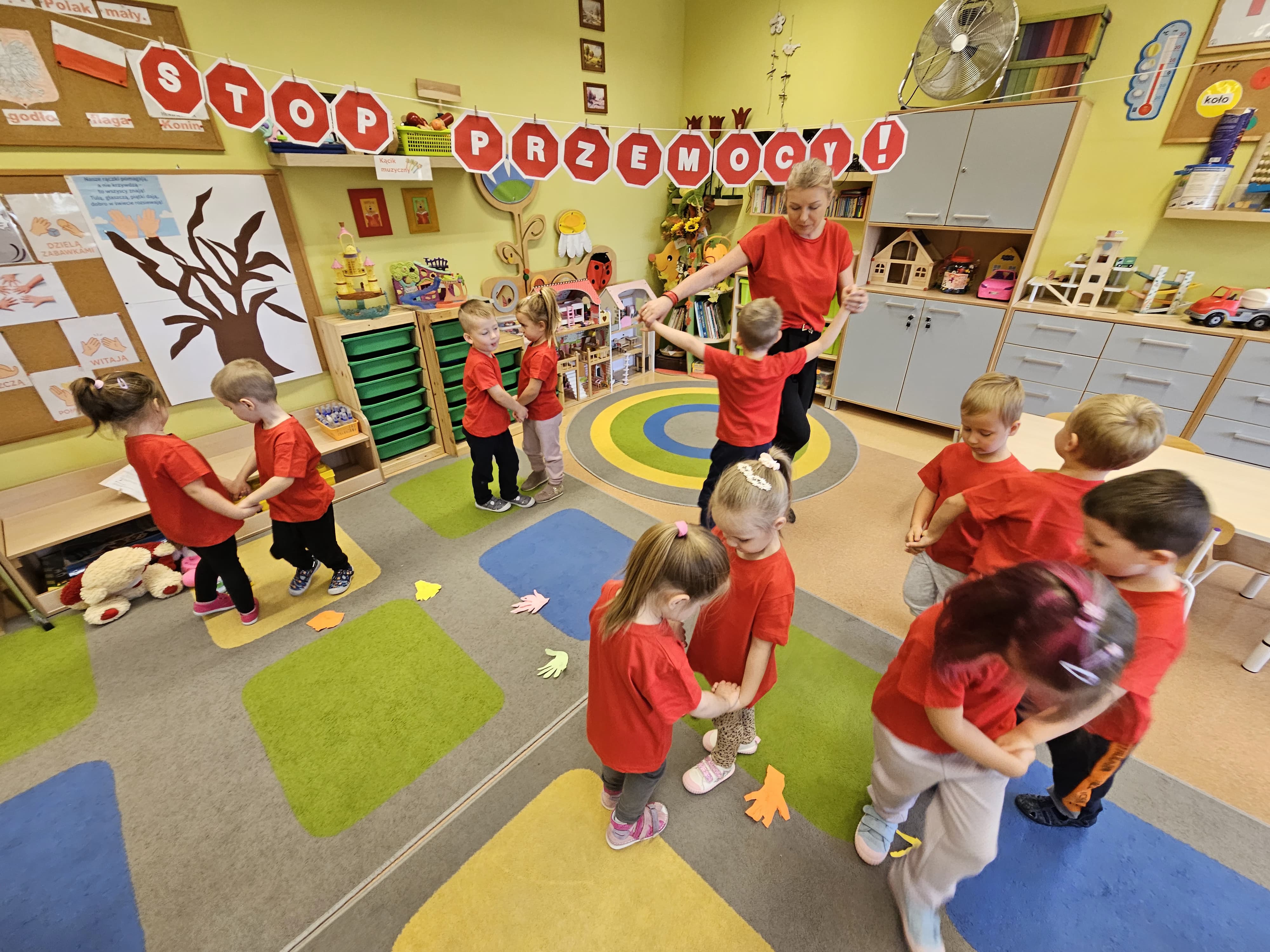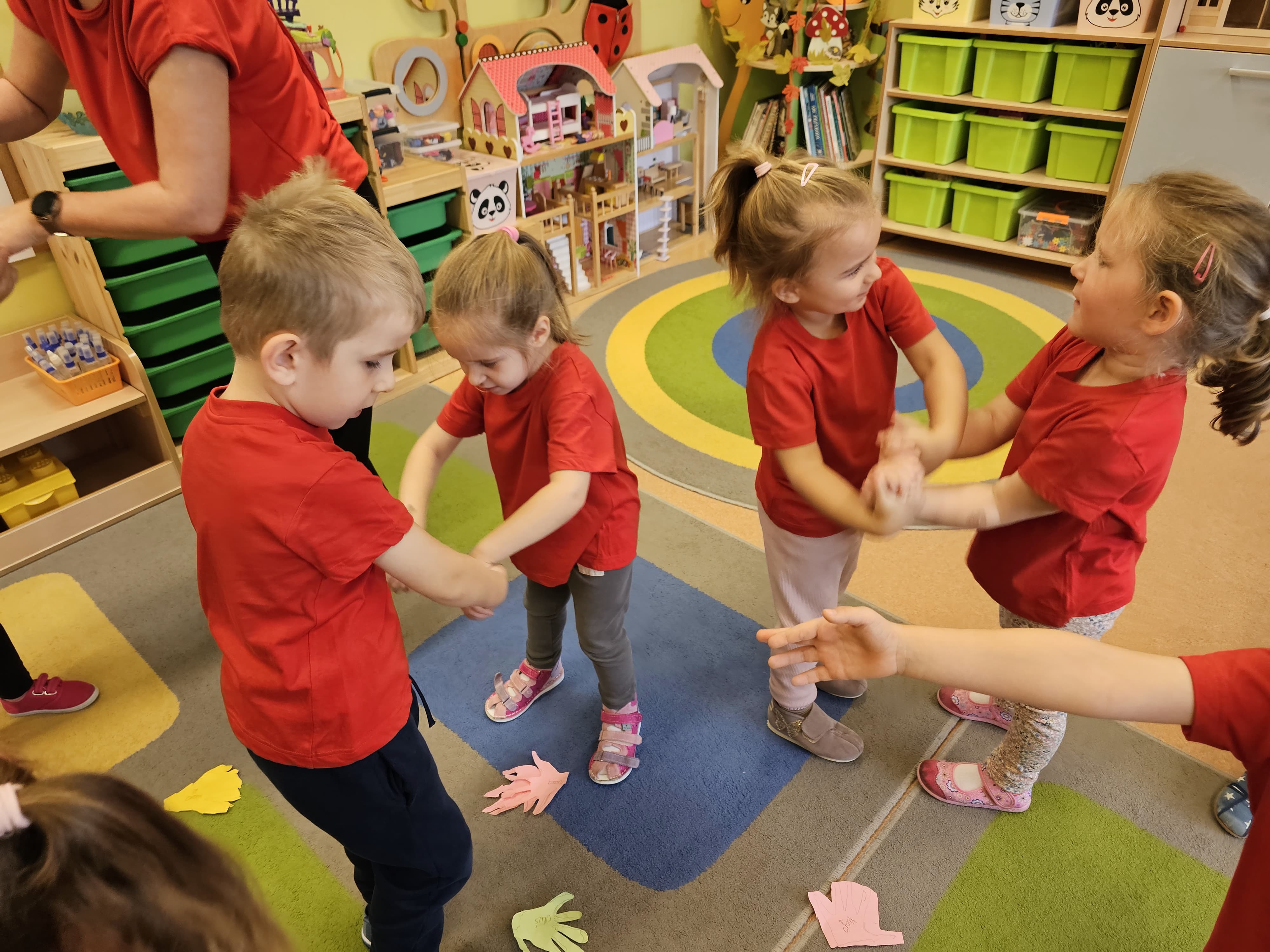 13.10. 2025 r. odbyły się wyjątkowe zajęcia w grupie średniaków, pod hasłem „Rączki, które pomagają”, zorganizowane w ramach ogólnopolskiej akcji „Dzieciństwo bez przemocy”. Celem naszych działań było pokazanie dzieciom, że każdy z nas ma moc czynienia dobra – wystarczy uśmiech, dobre słowo i pomocna dłoń. Podczas zajęć przedszkolaki uczestniczyły w zabawach ruchowych, plastycznych i rozmowach , które uczyły, jak ważna jest życzliwość, empatia i współpraca. Dzieci tworzyły własne „Rączki, które pomagają” – wycięte, kolorowe dłonie z zapisanymi dobrymi uczynkami, takimi jak: pomagam, przytulam, dzielę się, przepraszam, głaszczę, witam. Wspólnie powstało piękne „Drzewo dobrych dłoni”, symbol naszej przedszkolnej wspólnoty i wzajemnego wsparcia. Nie zabrakło także opowiadania o Misiu, który nauczył się przepraszać – dzięki niemu dzieci zrozumiały, że każdy może popełnić błąd, ale najważniejsze to umieć go naprawić i powiedzieć „przepraszam”. Na zakończenie każde dziecko otrzymało dyplom uczestnictwa w akcji i obiecało, że jego rączki będą służyć tylko do dobrych uczynków, zgodnie z przesłaniem : „Nasze rączki mogą tworzyć dobro każdego dnia – pomagając, przytulając i niosąc uśmiech innym.”