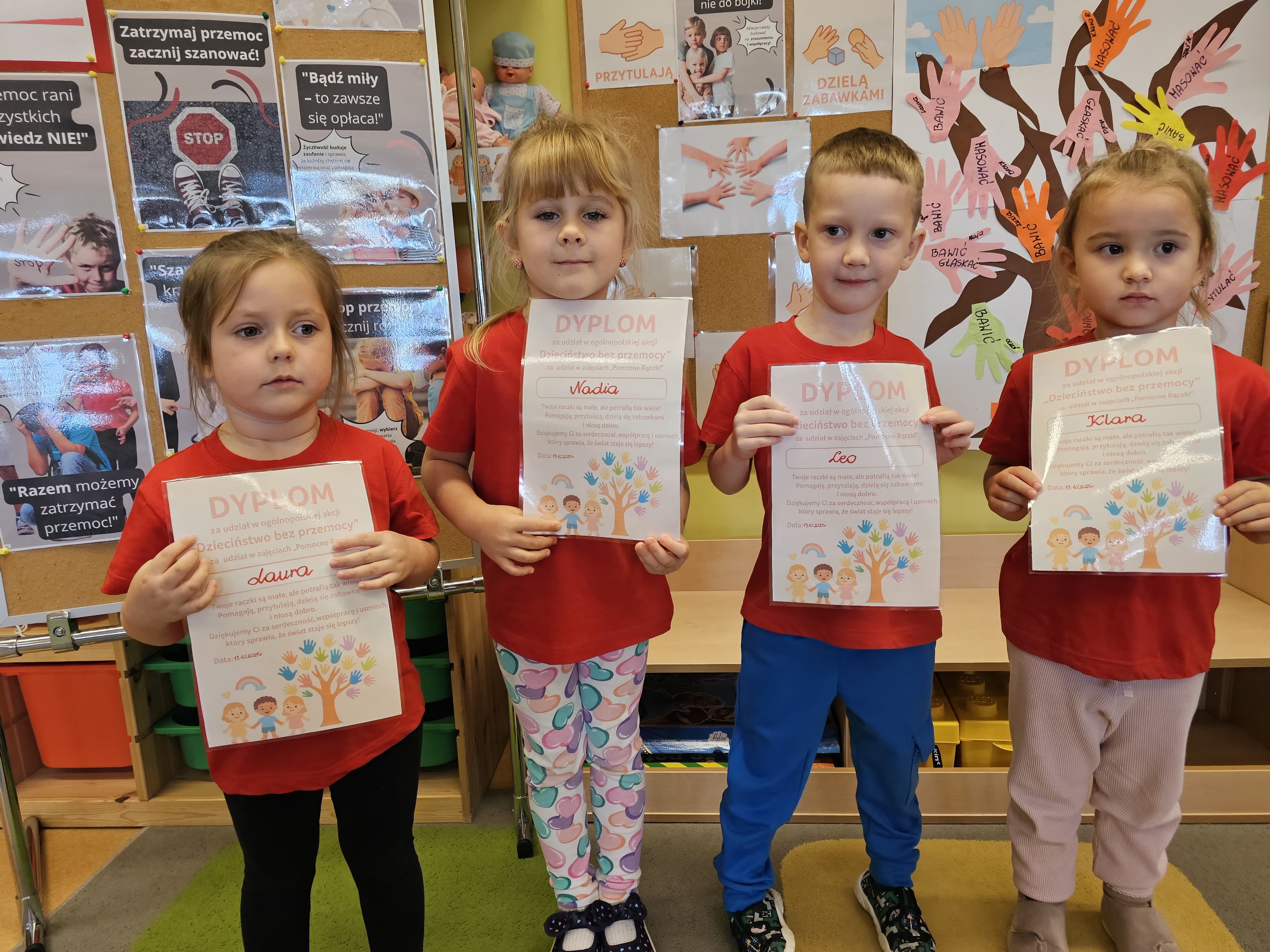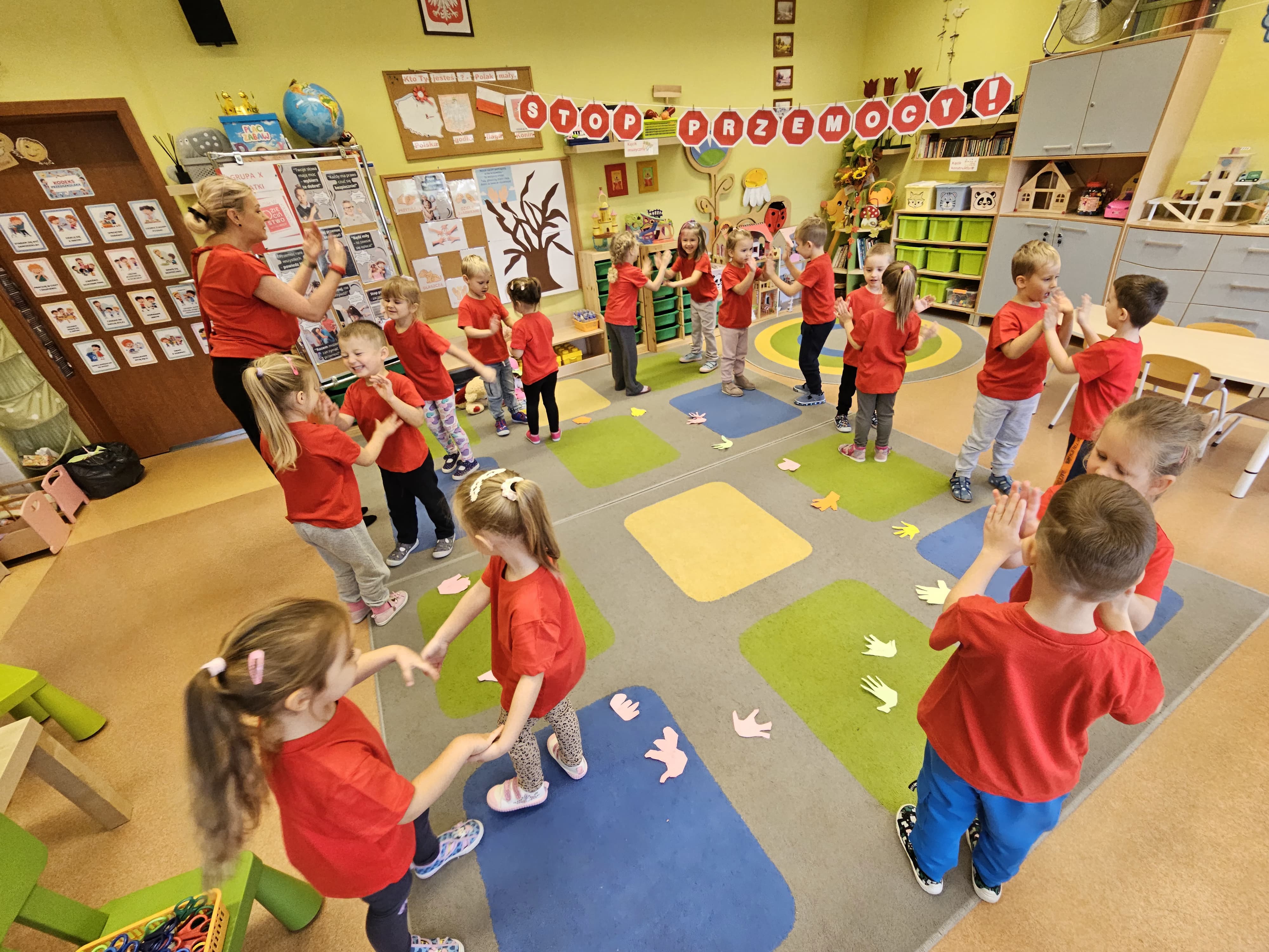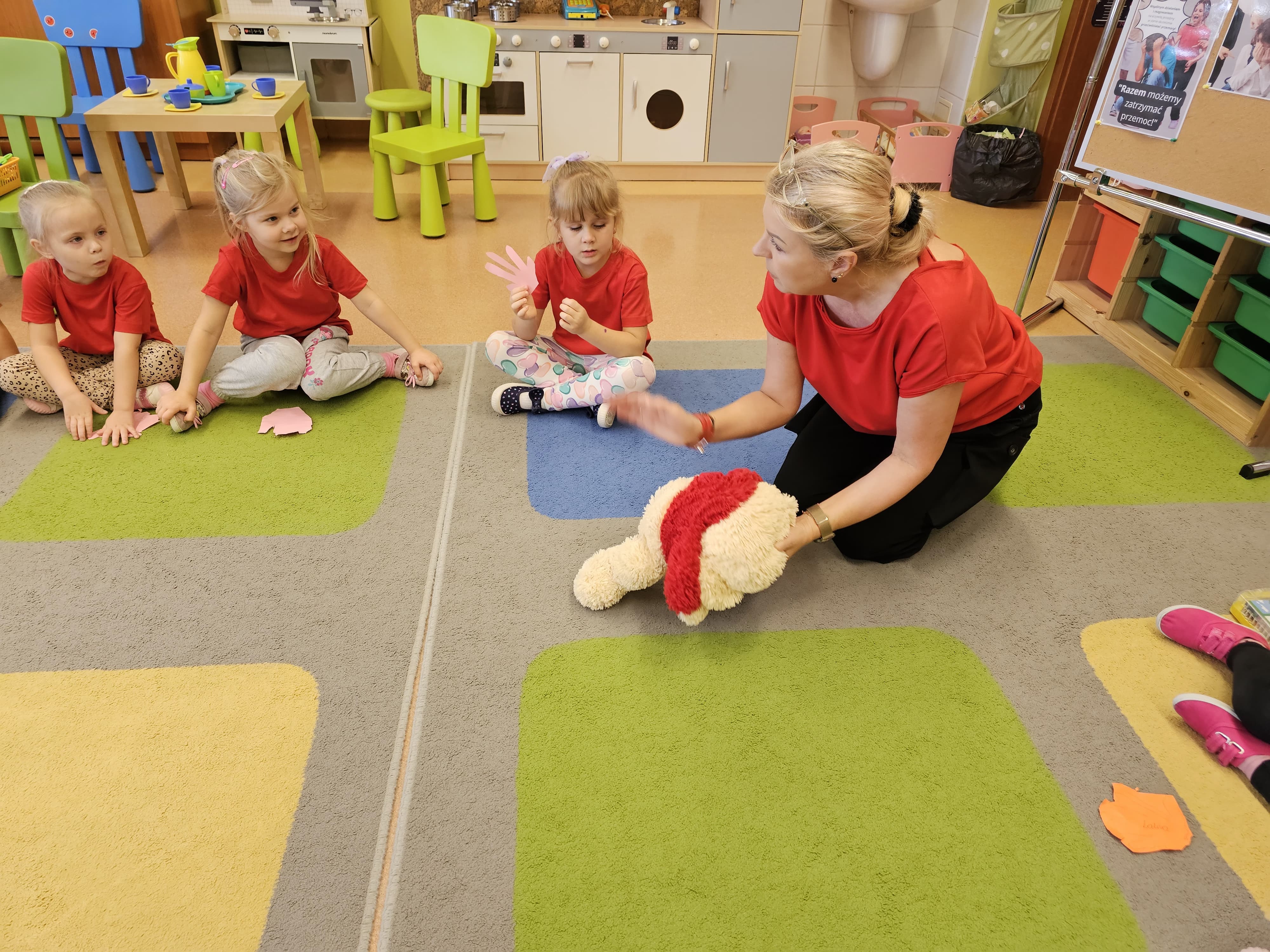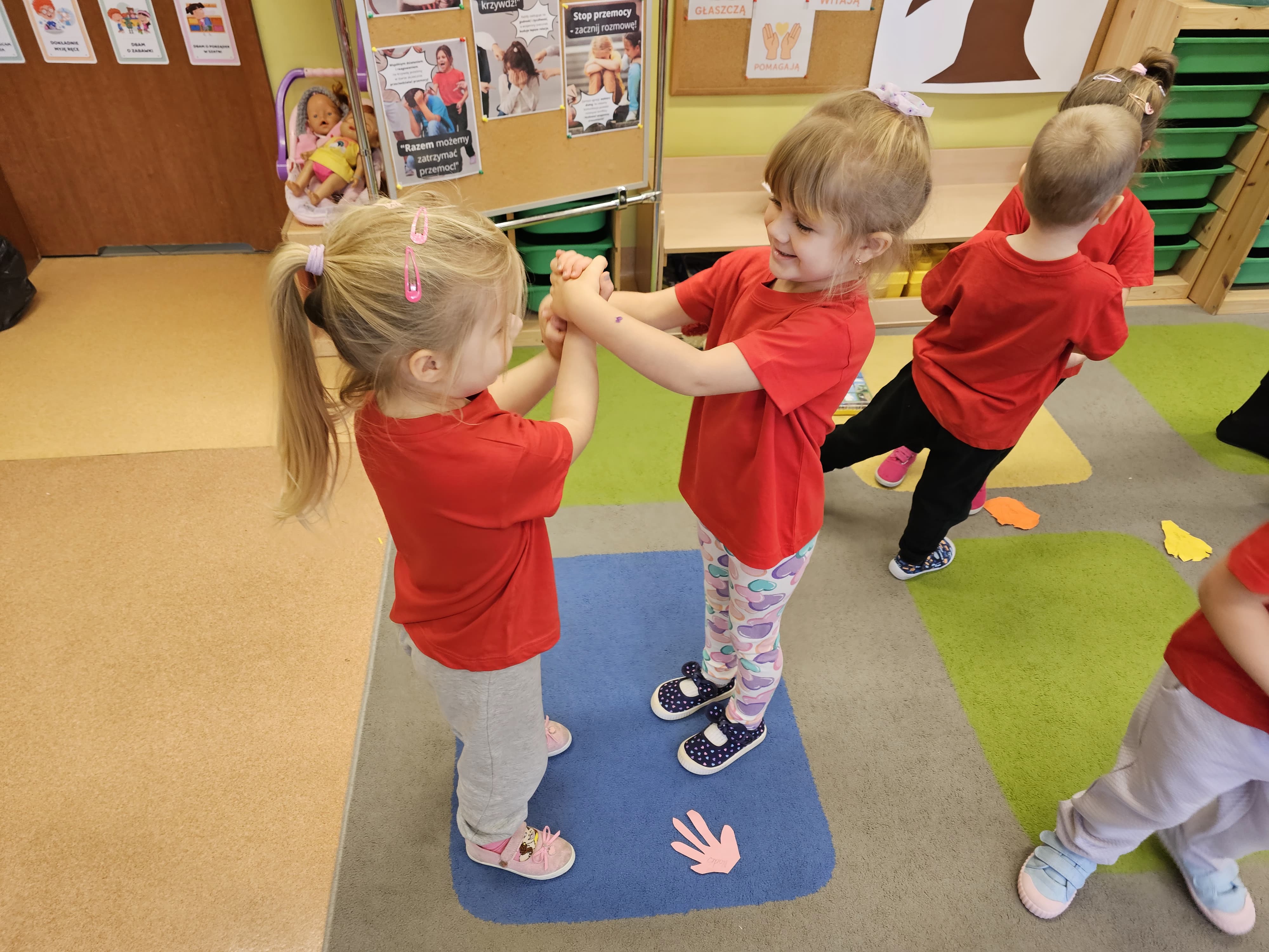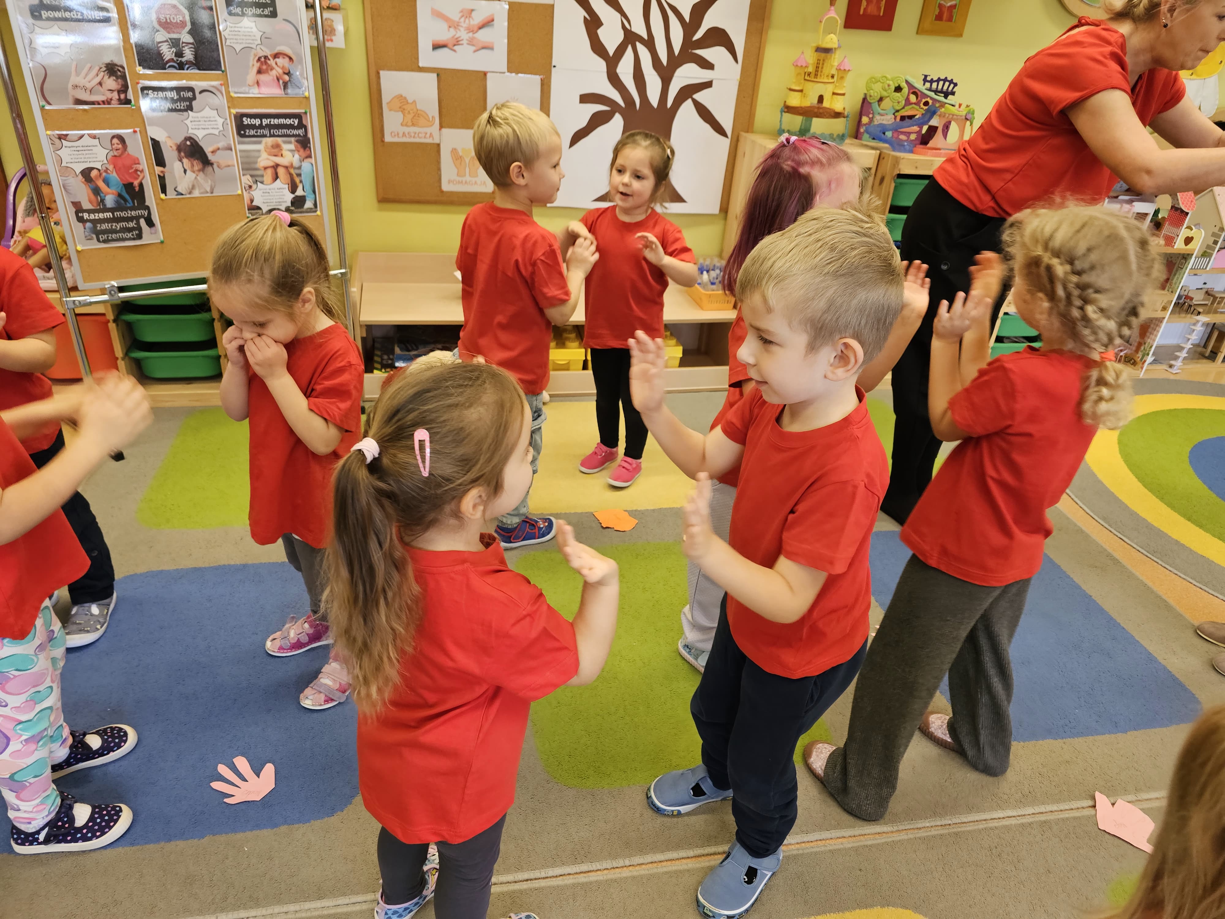 13.10. 2025 r. odbyły się wyjątkowe zajęcia w grupie średniaków, pod hasłem „Rączki, które pomagają”, zorganizowane w ramach ogólnopolskiej akcji „Dzieciństwo bez przemocy”. Celem naszych działań było pokazanie dzieciom, że każdy z nas ma moc czynienia dobra – wystarczy uśmiech, dobre słowo i pomocna dłoń. Podczas zajęć przedszkolaki uczestniczyły w zabawach ruchowych, plastycznych i rozmowach , które uczyły, jak ważna jest życzliwość, empatia i współpraca. Dzieci tworzyły własne „Rączki, które pomagają” – wycięte, kolorowe dłonie z zapisanymi dobrymi uczynkami, takimi jak: pomagam, przytulam, dzielę się, przepraszam, głaszczę, witam. Wspólnie powstało piękne „Drzewo dobrych dłoni”, symbol naszej przedszkolnej wspólnoty i wzajemnego wsparcia. Nie zabrakło także opowiadania o Misiu, który nauczył się przepraszać – dzięki niemu dzieci zrozumiały, że każdy może popełnić błąd, ale najważniejsze to umieć go naprawić i powiedzieć „przepraszam”. Na zakończenie każde dziecko otrzymało dyplom uczestnictwa w akcji i obiecało, że jego rączki będą służyć tylko do dobrych uczynków, zgodnie z przesłaniem : „Nasze rączki mogą tworzyć dobro każdego dnia – pomagając, przytulając i niosąc uśmiech innym.”