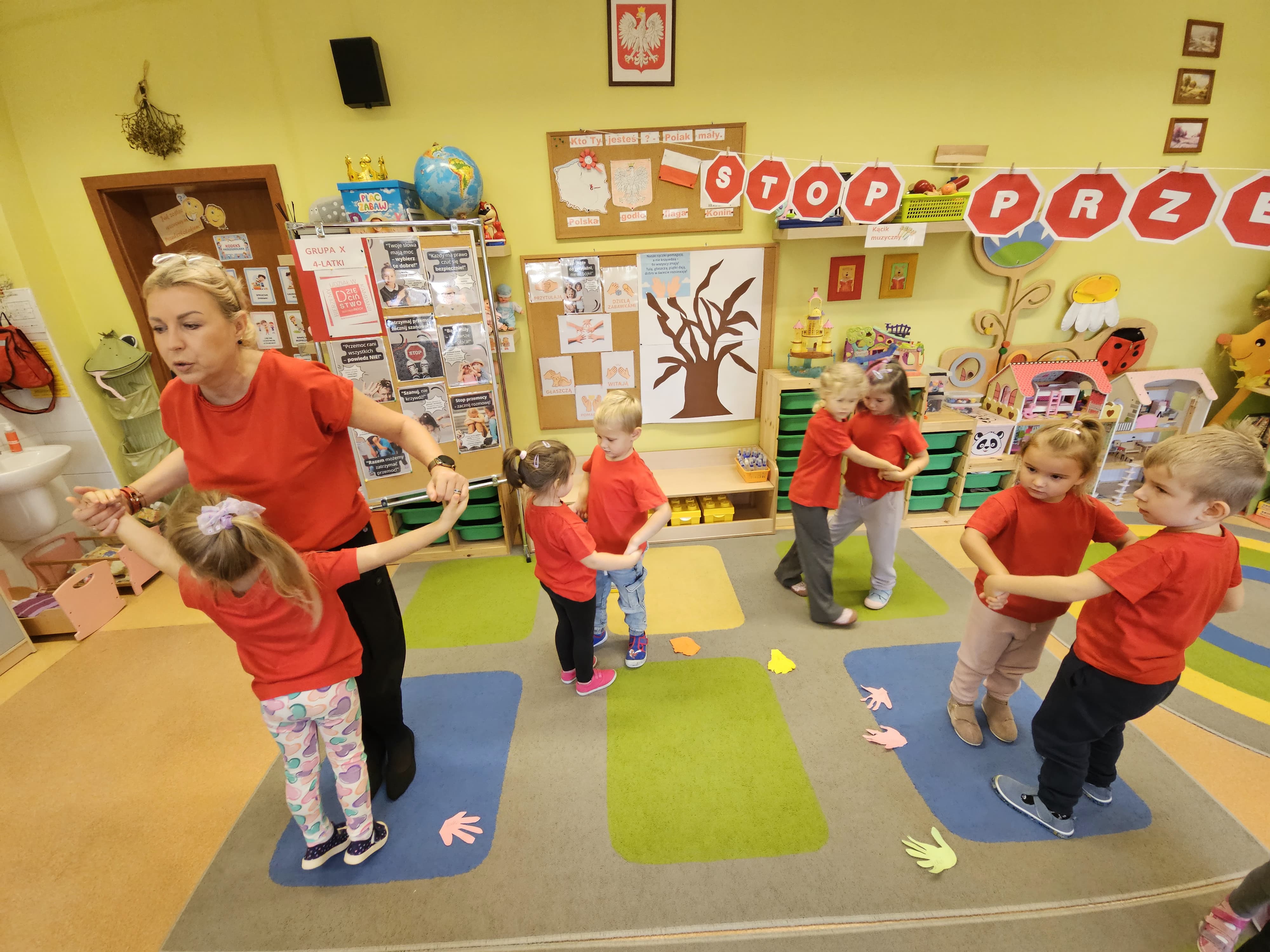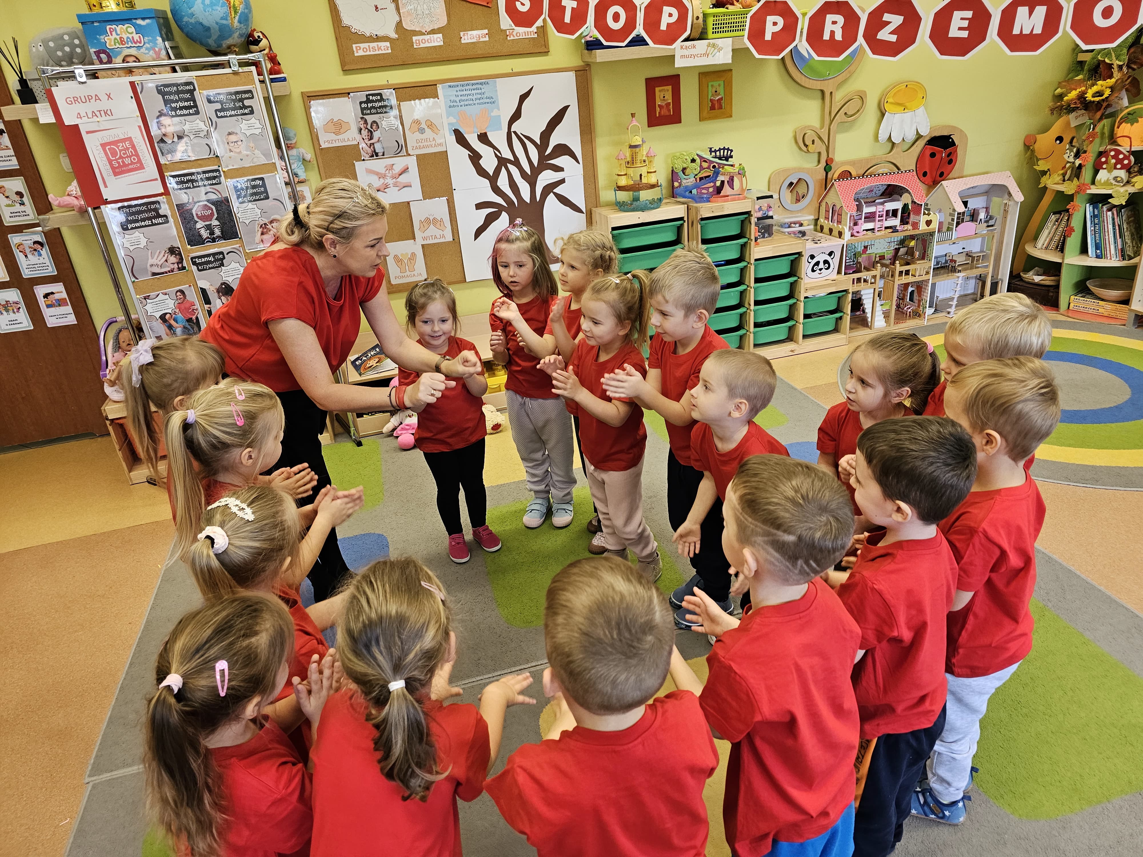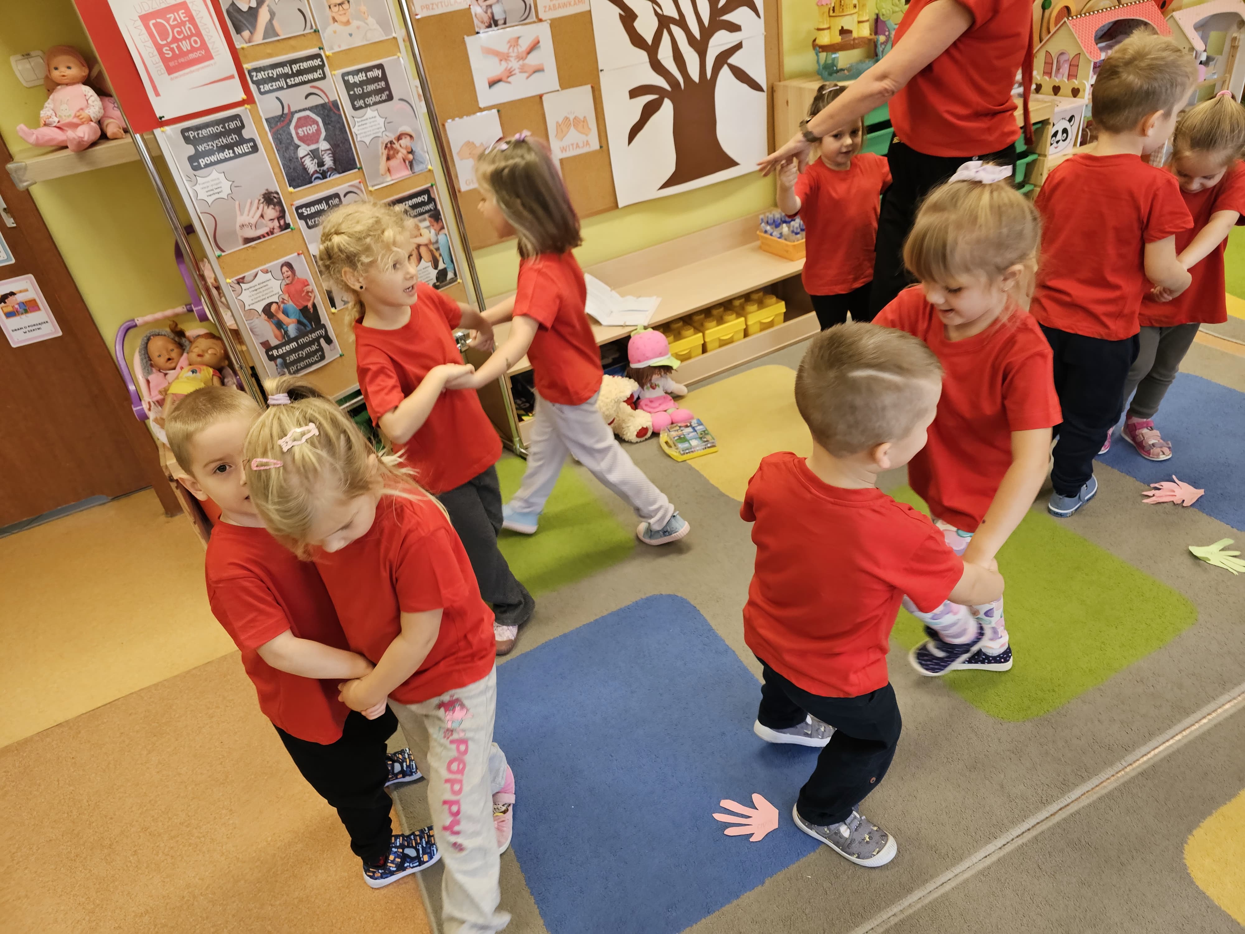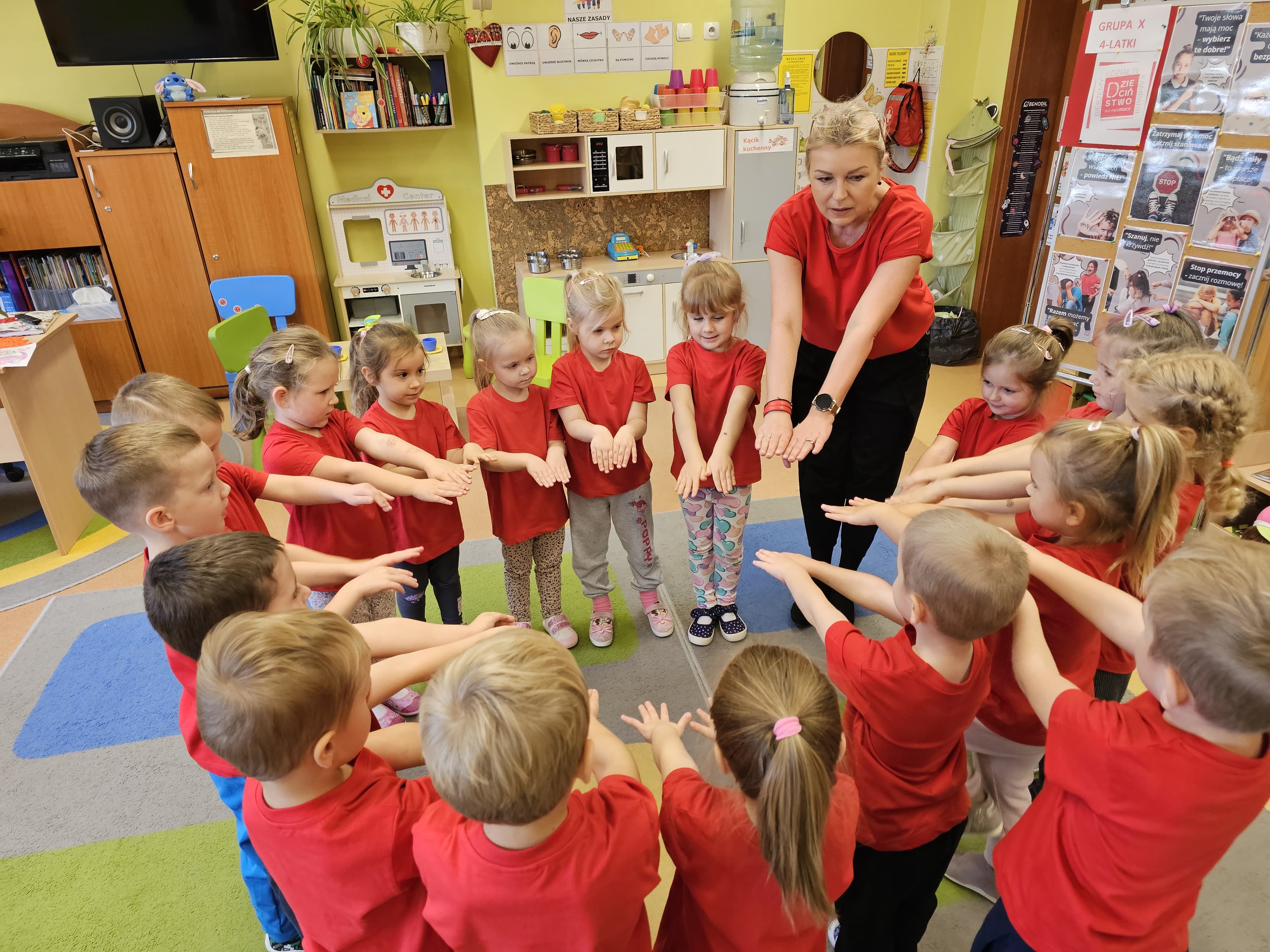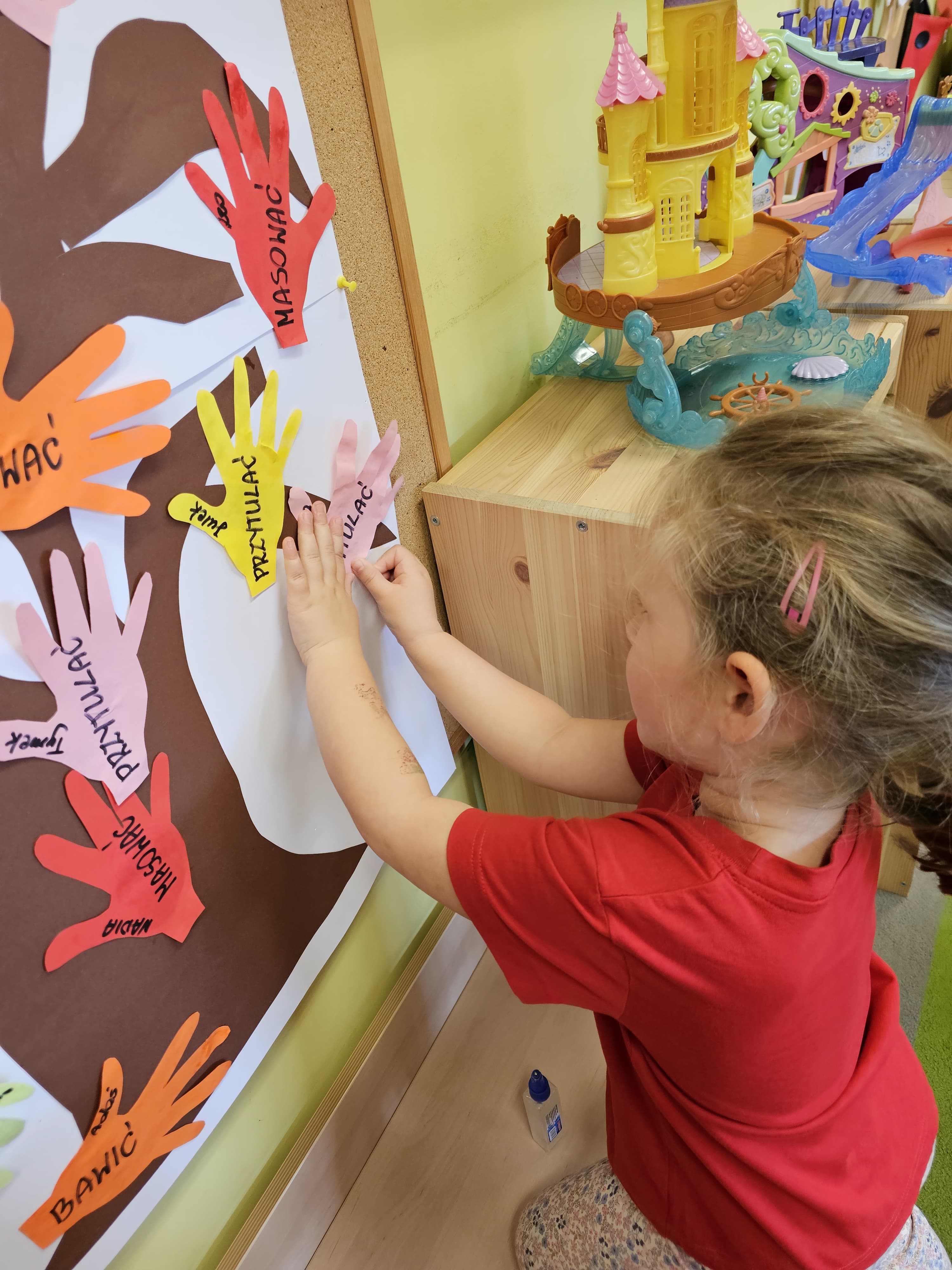 13.10. 2025 r. odbyły się wyjątkowe zajęcia w grupie średniaków, pod hasłem „Rączki, które pomagają”, zorganizowane w ramach ogólnopolskiej akcji „Dzieciństwo bez przemocy”. Celem naszych działań było pokazanie dzieciom, że każdy z nas ma moc czynienia dobra – wystarczy uśmiech, dobre słowo i pomocna dłoń. Podczas zajęć przedszkolaki uczestniczyły w zabawach ruchowych, plastycznych i rozmowach , które uczyły, jak ważna jest życzliwość, empatia i współpraca. Dzieci tworzyły własne „Rączki, które pomagają” – wycięte, kolorowe dłonie z zapisanymi dobrymi uczynkami, takimi jak: pomagam, przytulam, dzielę się, przepraszam, głaszczę, witam. Wspólnie powstało piękne „Drzewo dobrych dłoni”, symbol naszej przedszkolnej wspólnoty i wzajemnego wsparcia. Nie zabrakło także opowiadania o Misiu, który nauczył się przepraszać – dzięki niemu dzieci zrozumiały, że każdy może popełnić błąd, ale najważniejsze to umieć go naprawić i powiedzieć „przepraszam”. Na zakończenie każde dziecko otrzymało dyplom uczestnictwa w akcji i obiecało, że jego rączki będą służyć tylko do dobrych uczynków, zgodnie z przesłaniem : „Nasze rączki mogą tworzyć dobro każdego dnia – pomagając, przytulając i niosąc uśmiech innym.”